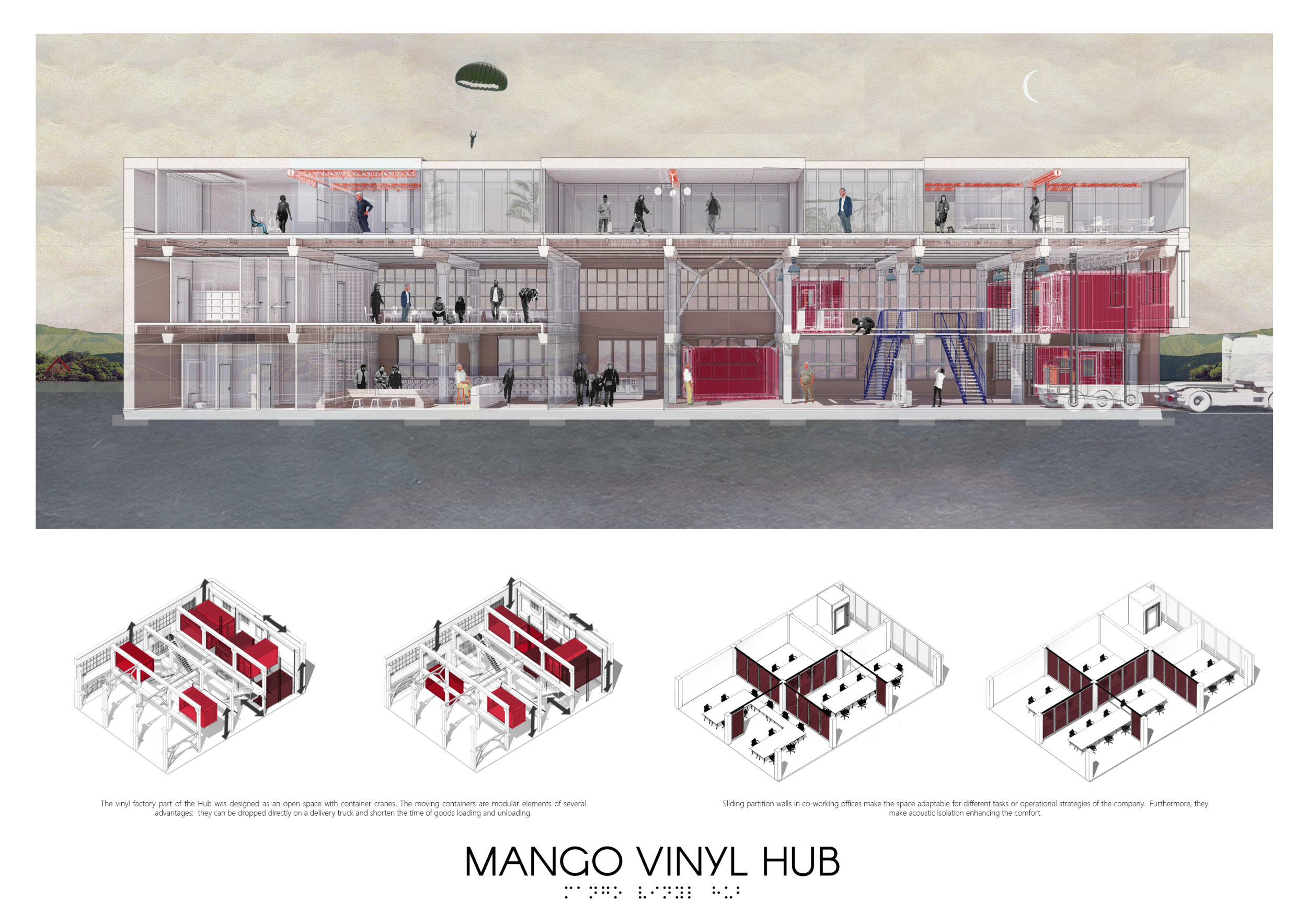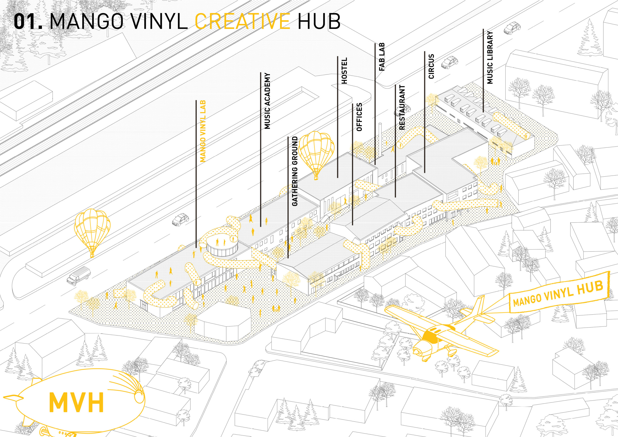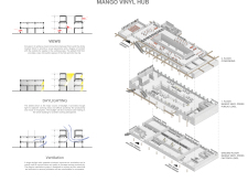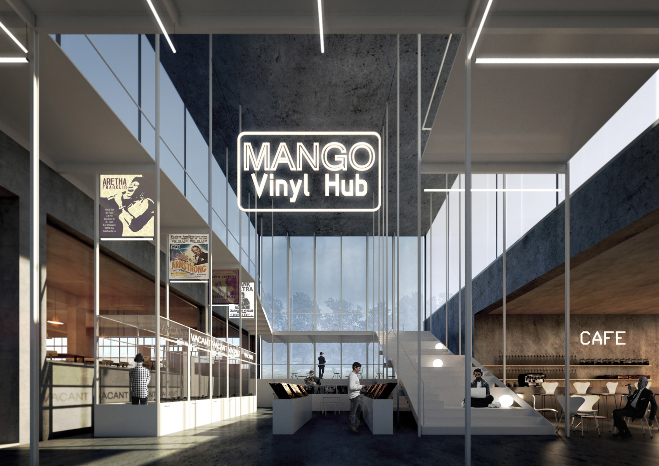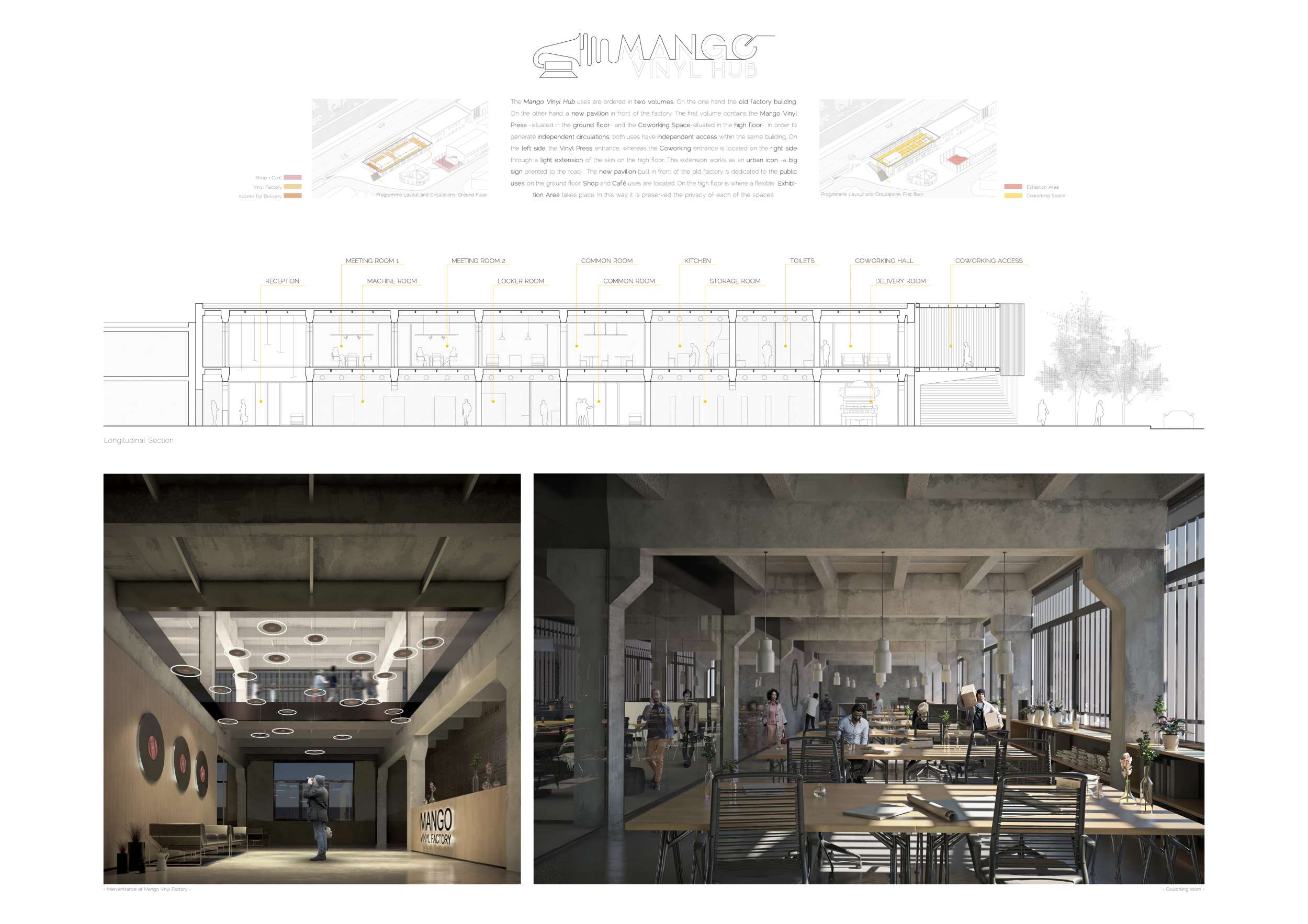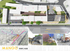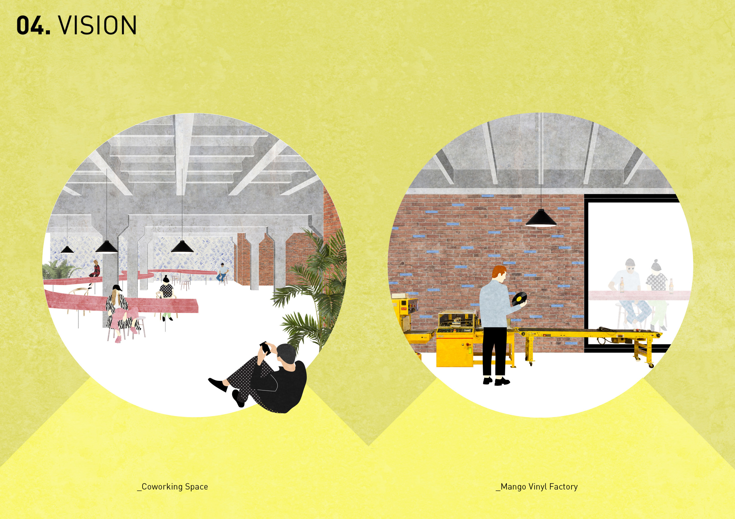 The third place entry for the Mango Vinyl Hub competition takes on the project of exposition and production to radically transform an abandoned tin foil factory into a new co-working hub, both celebrating and displaying the emergent creative industries of the area. In a spatial diagram juxtaposing the market and the processes of making, the project makes explicit the tensions and collaborations between production and commerce.
