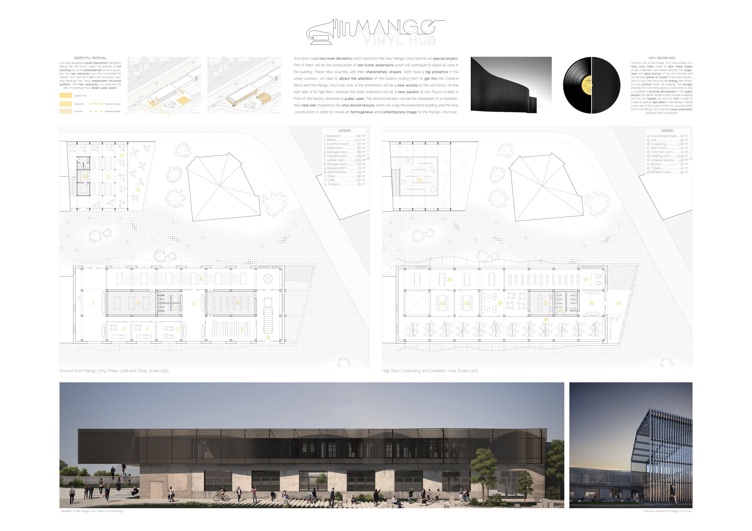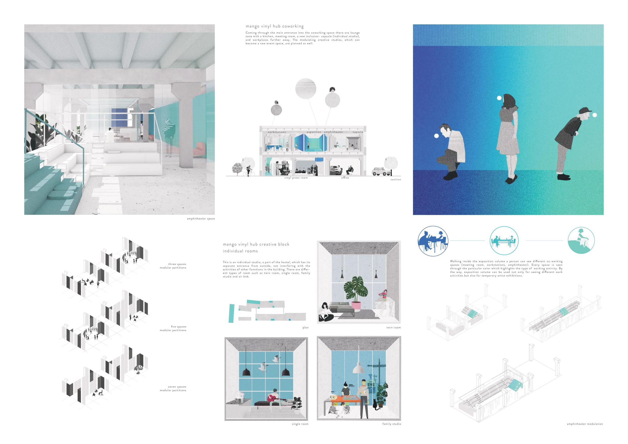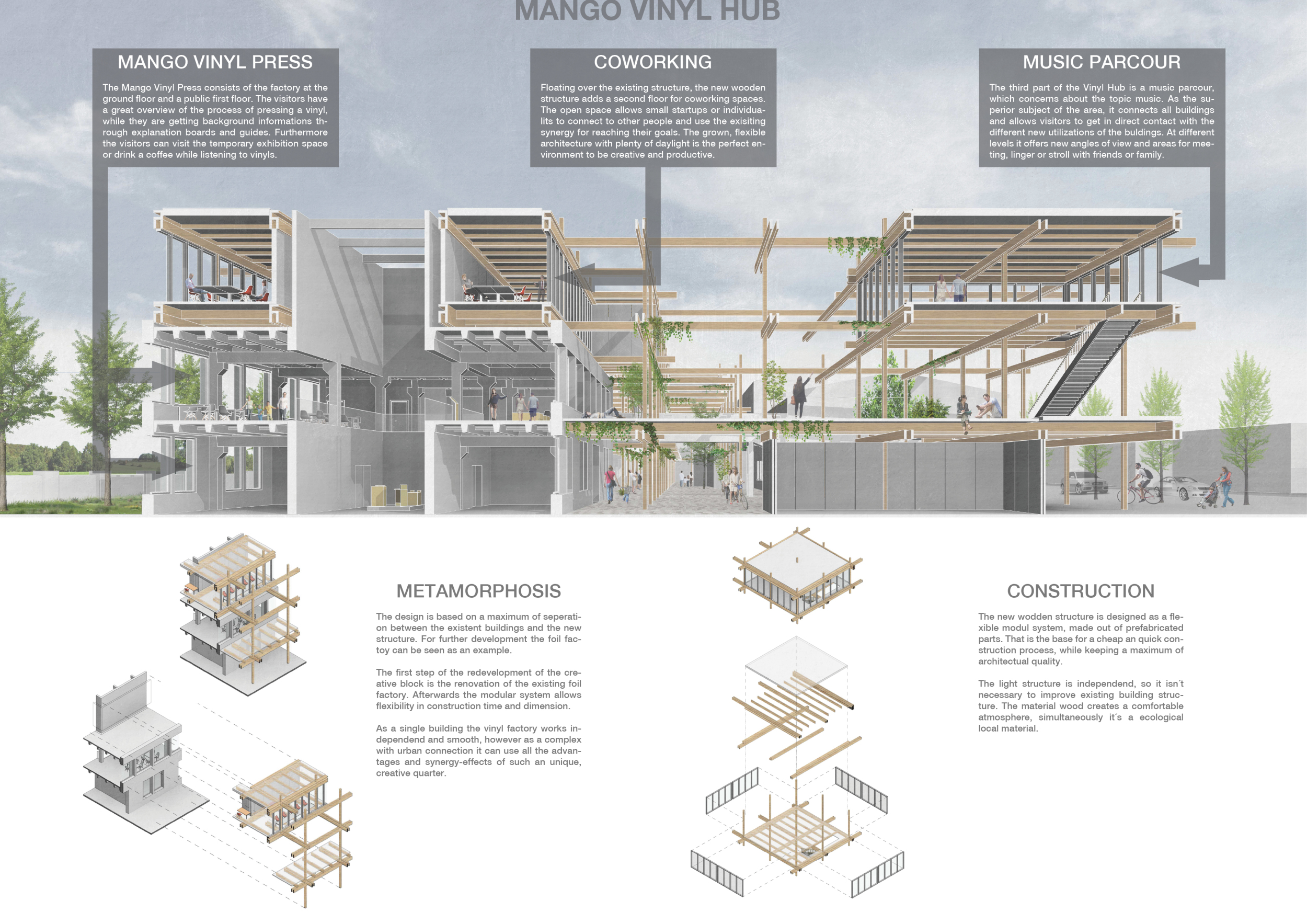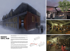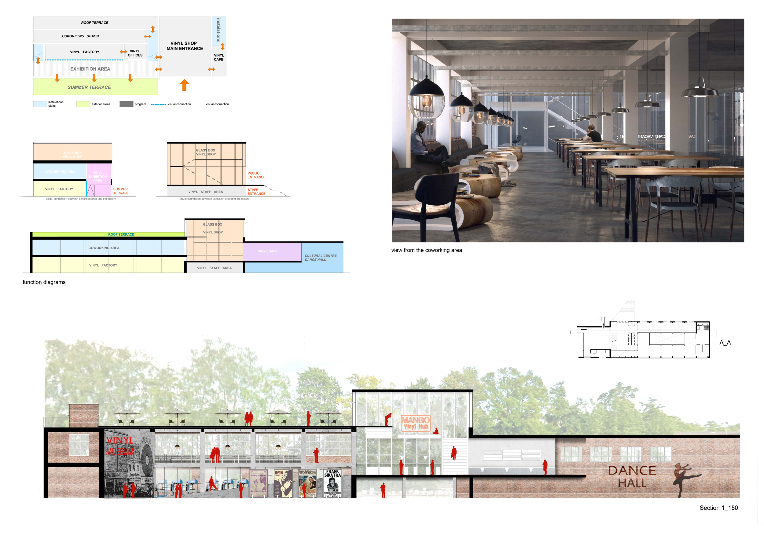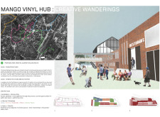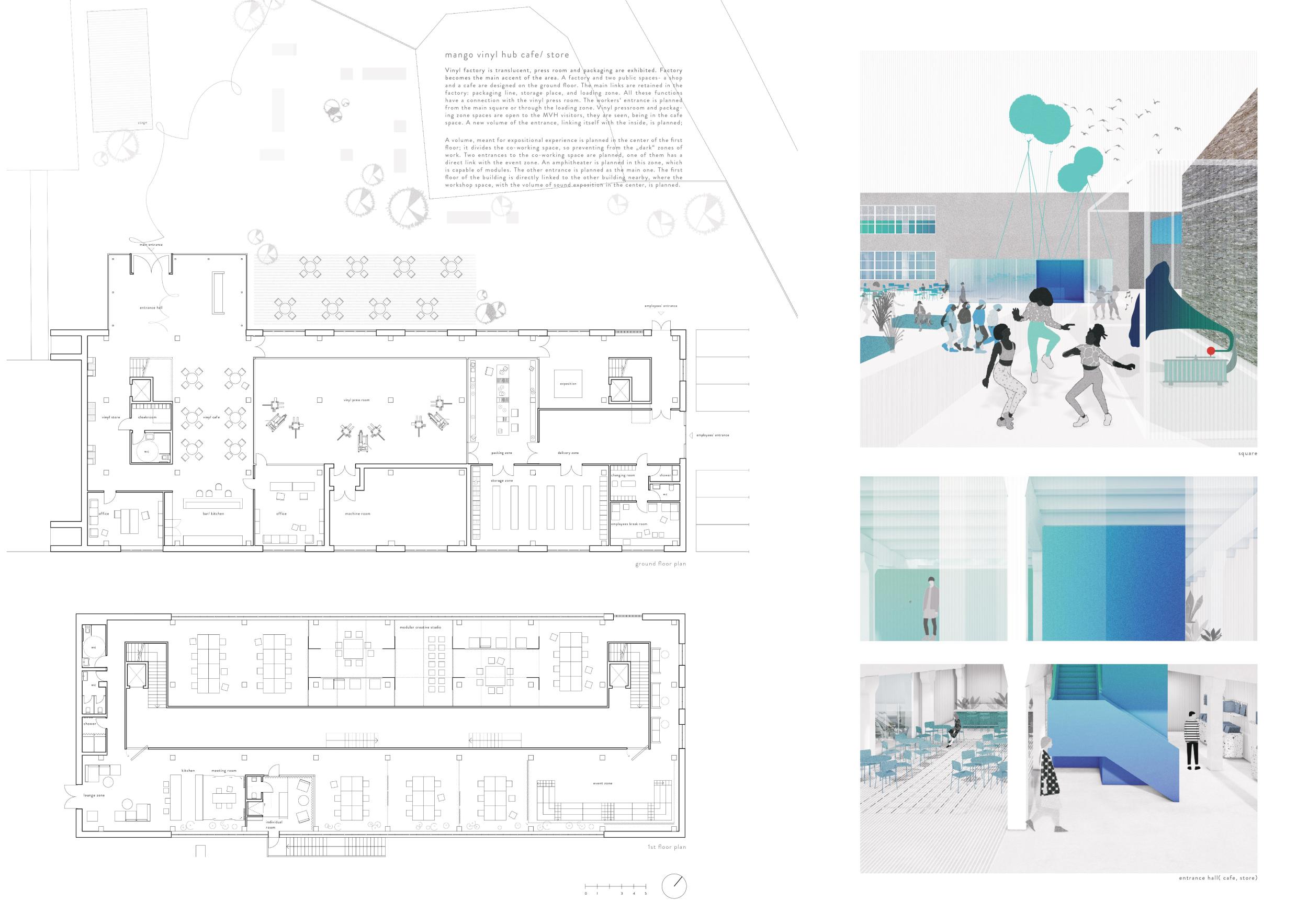 The third place entry for the Mango Vinyl Hub competition takes on the project of exposition and production to radically transform an abandoned tin foil factory into a new co-working hub, both celebrating and displaying the emergent creative industries of the area. In a spatial diagram juxtaposing the market and the processes of making, the project makes explicit the tensions and collaborations between production and commerce.