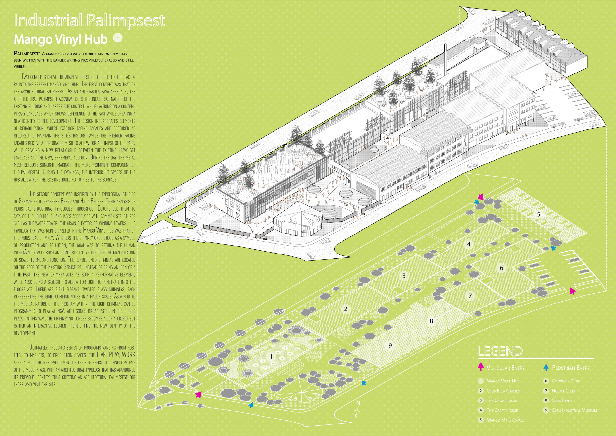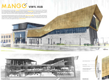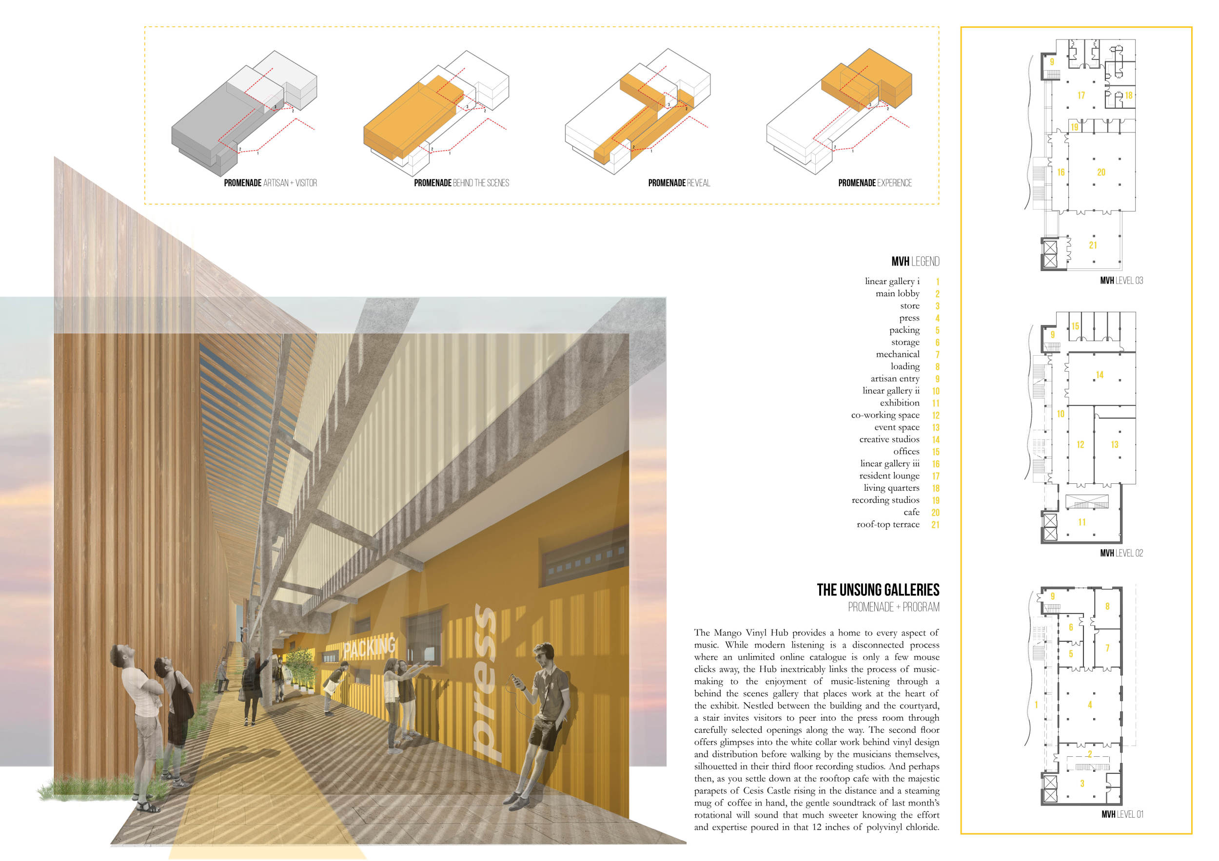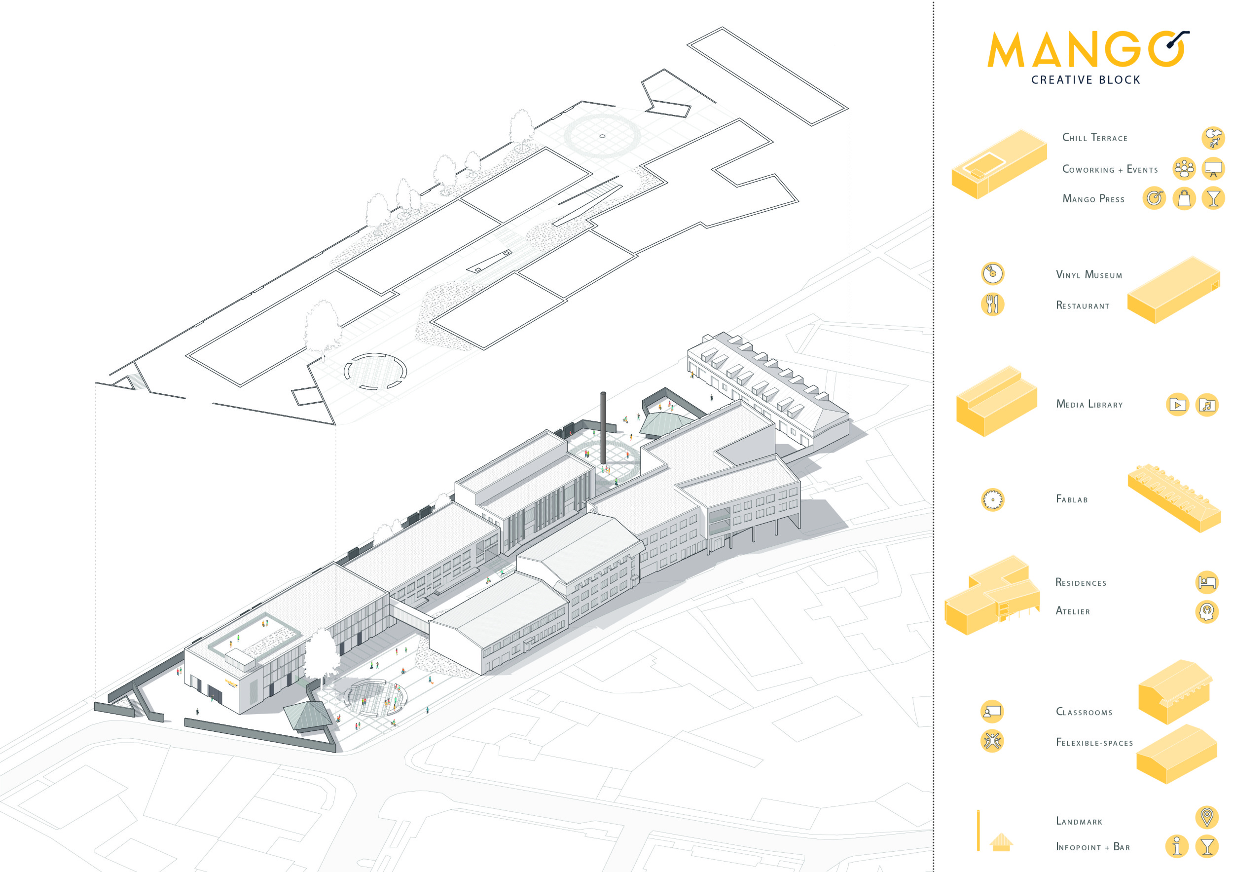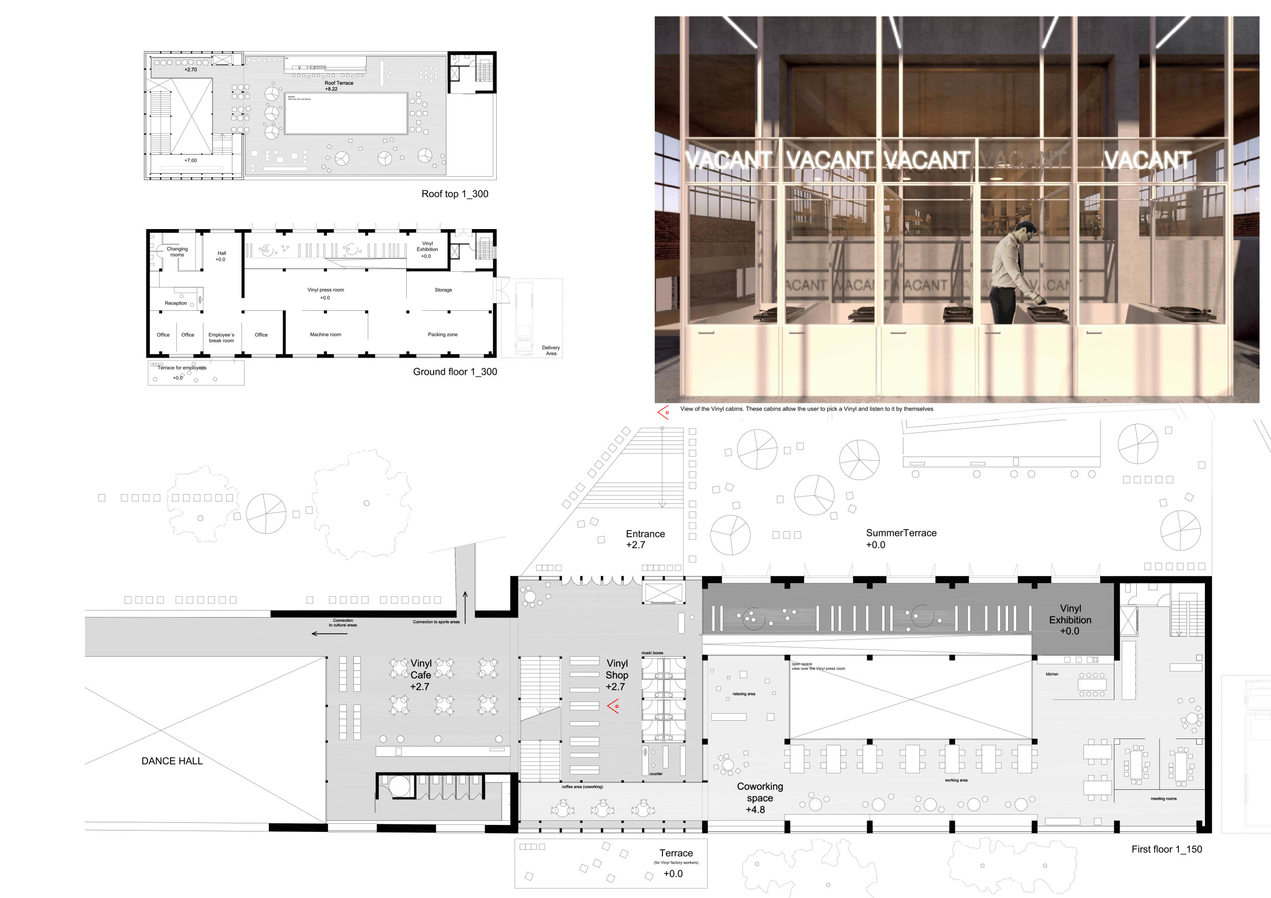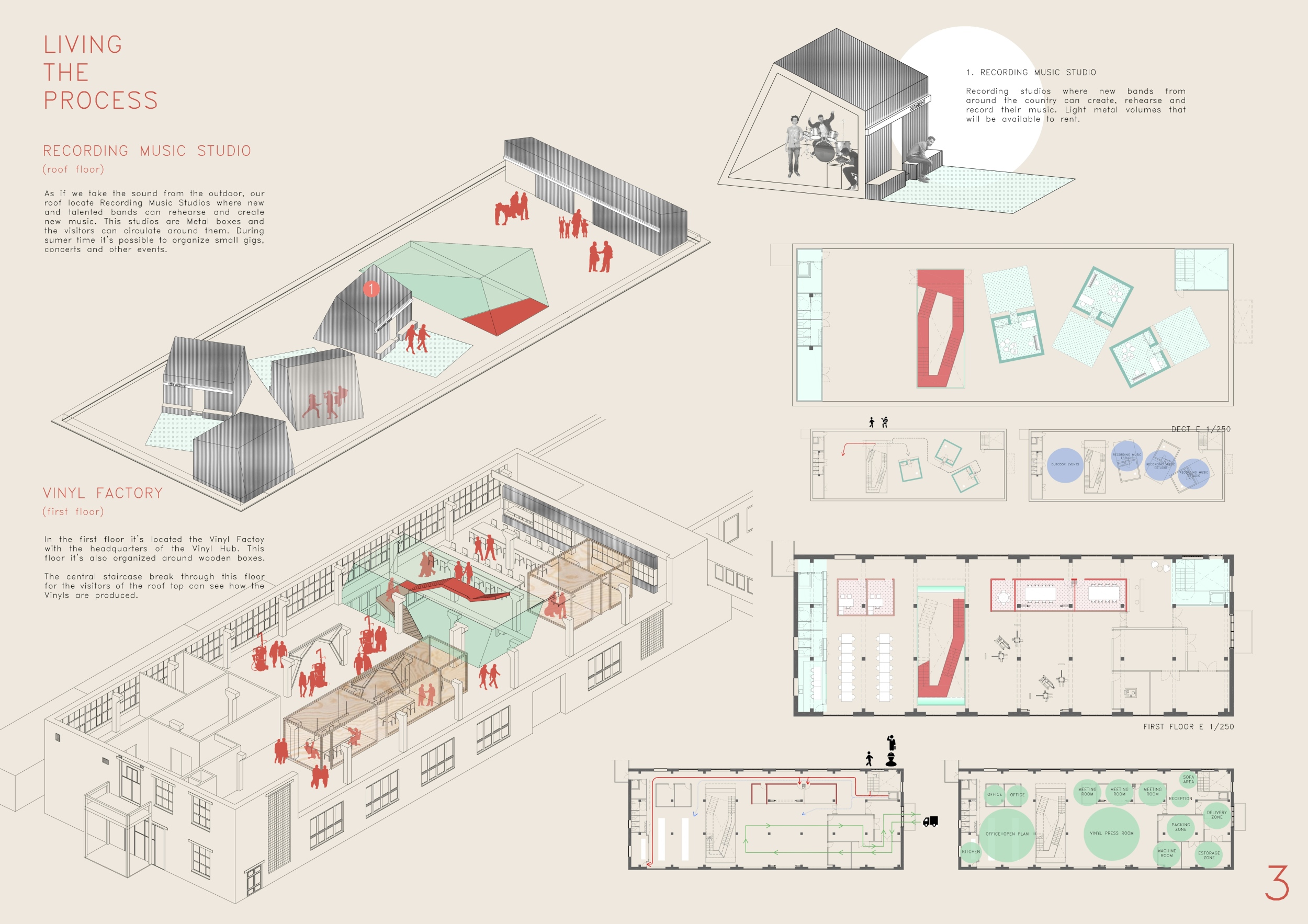 The third place entry for the Mango Vinyl Hub competition takes on the project of exposition and production to radically transform an abandoned tin foil factory into a new co-working hub, both celebrating and displaying the emergent creative industries of the area. In a spatial diagram juxtaposing the market and the processes of making, the project makes explicit the tensions and collaborations between production and commerce.