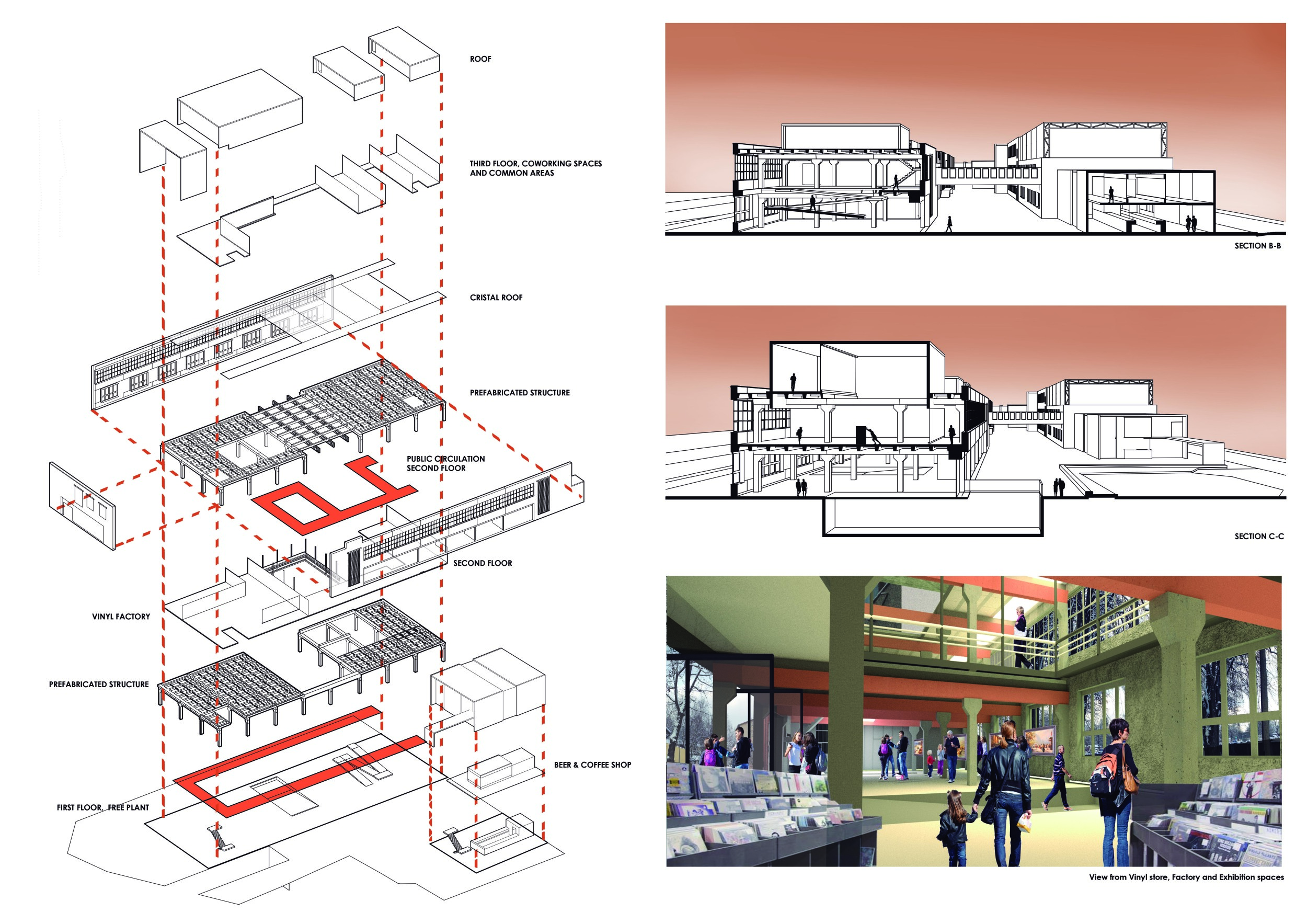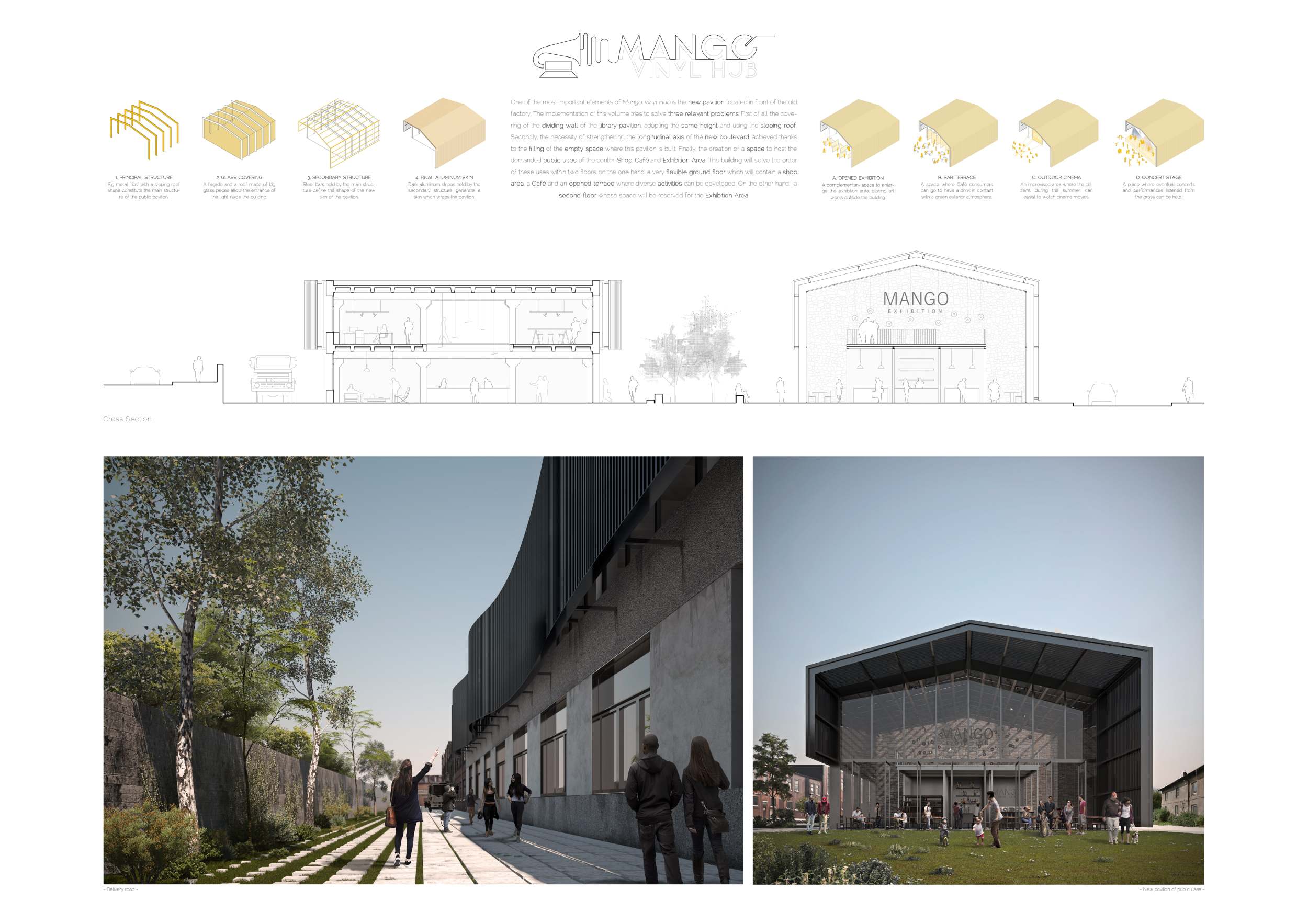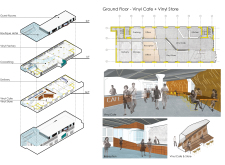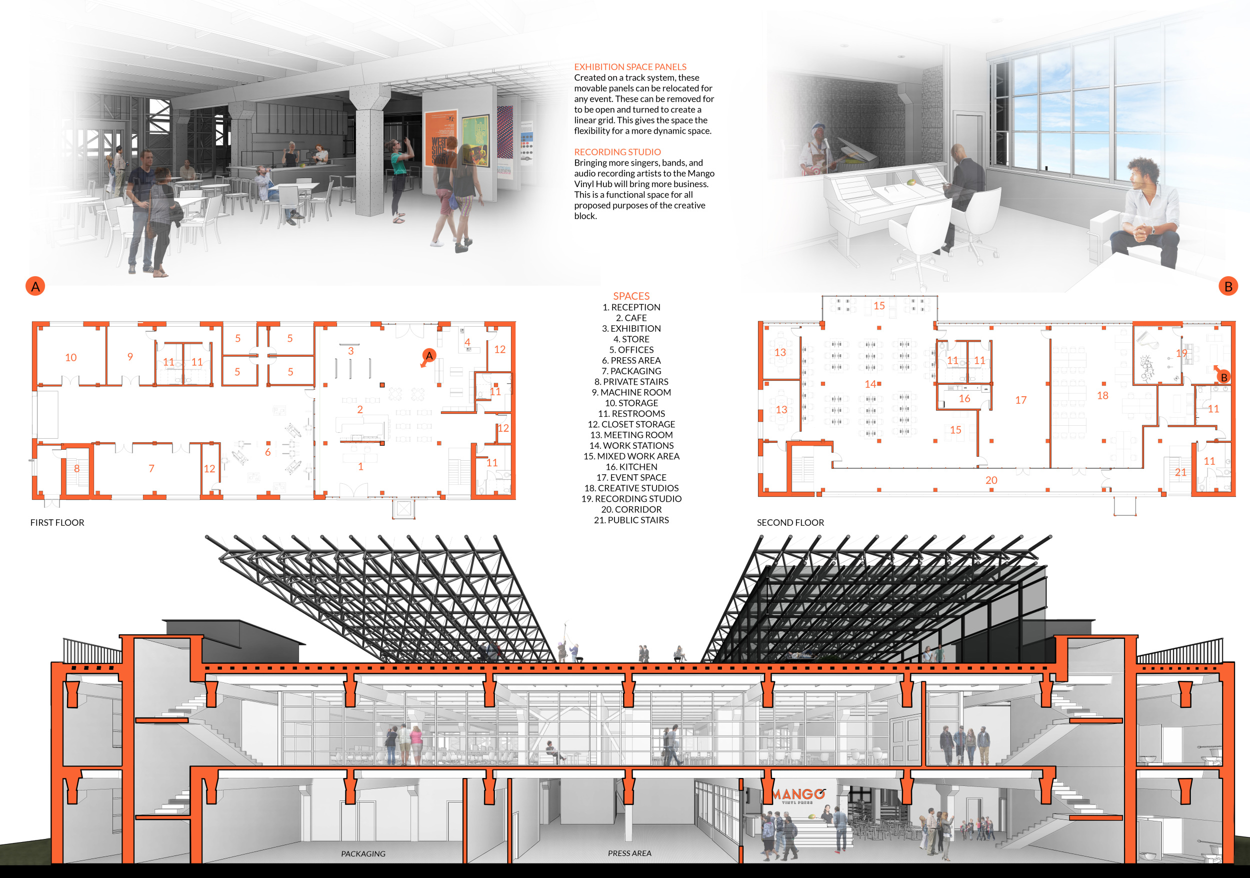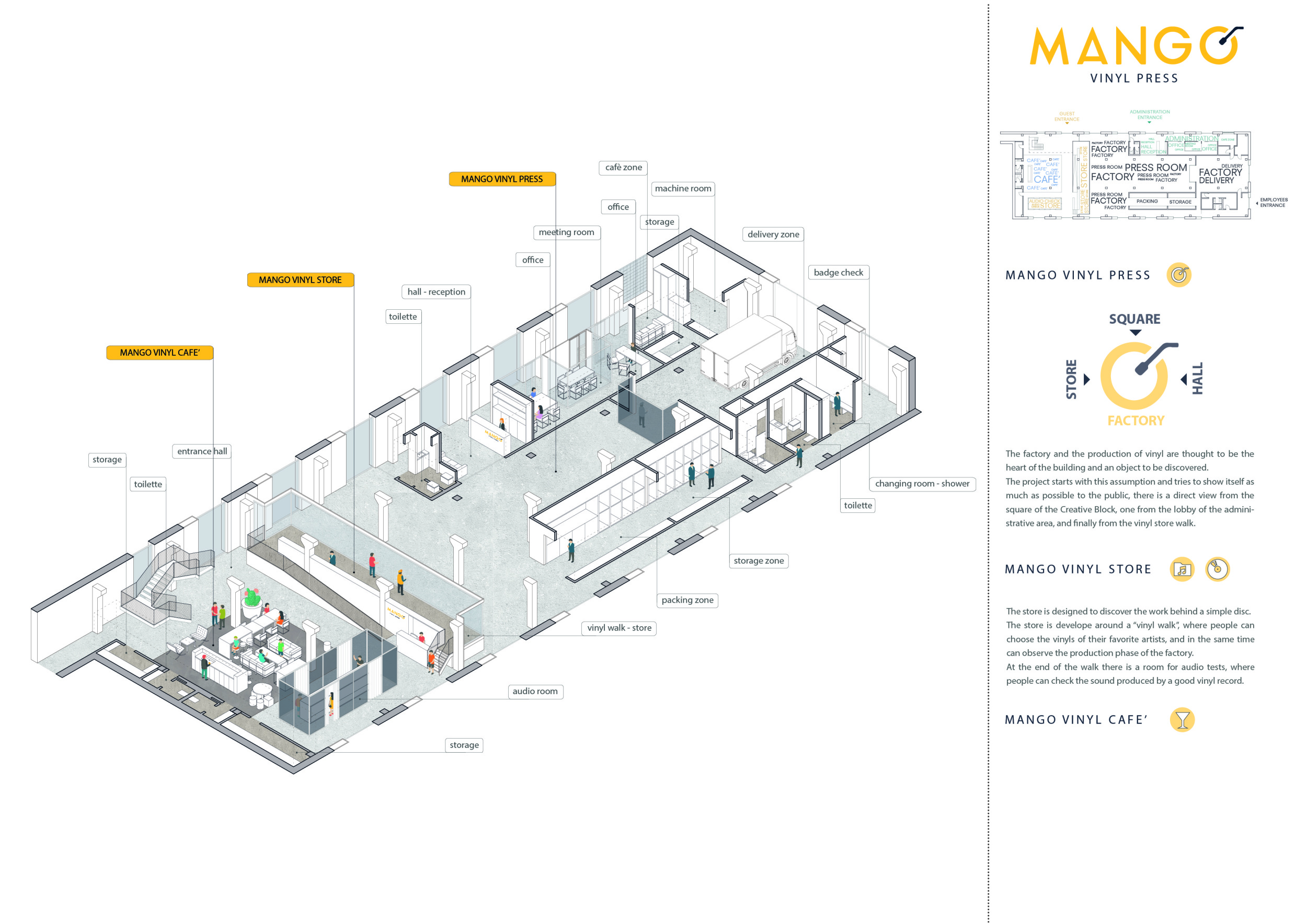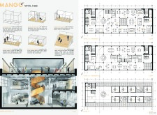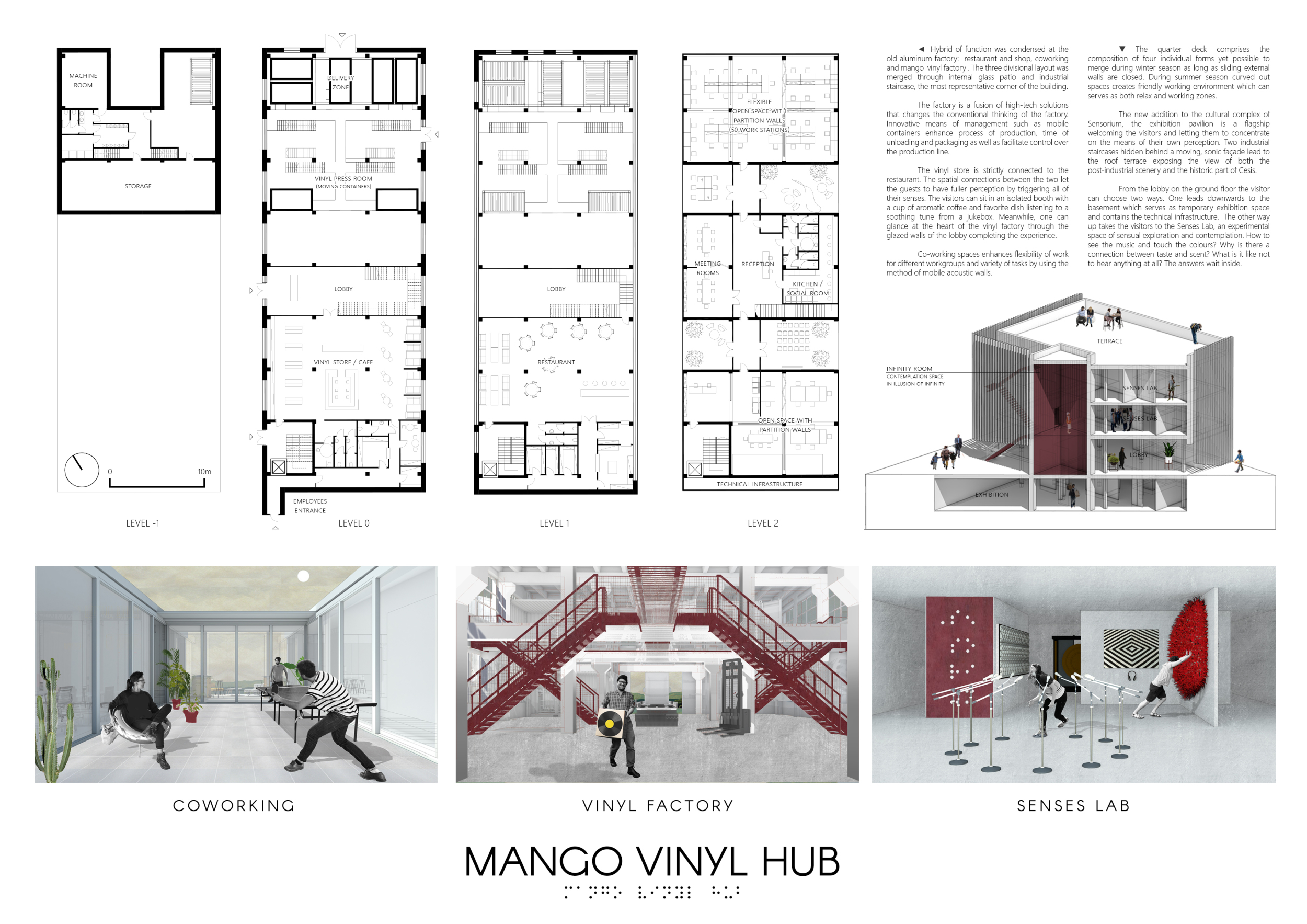 The third place entry for the Mango Vinyl Hub competition takes on the project of exposition and production to radically transform an abandoned tin foil factory into a new co-working hub, both celebrating and displaying the emergent creative industries of the area. In a spatial diagram juxtaposing the market and the processes of making, the project makes explicit the tensions and collaborations between production and commerce.