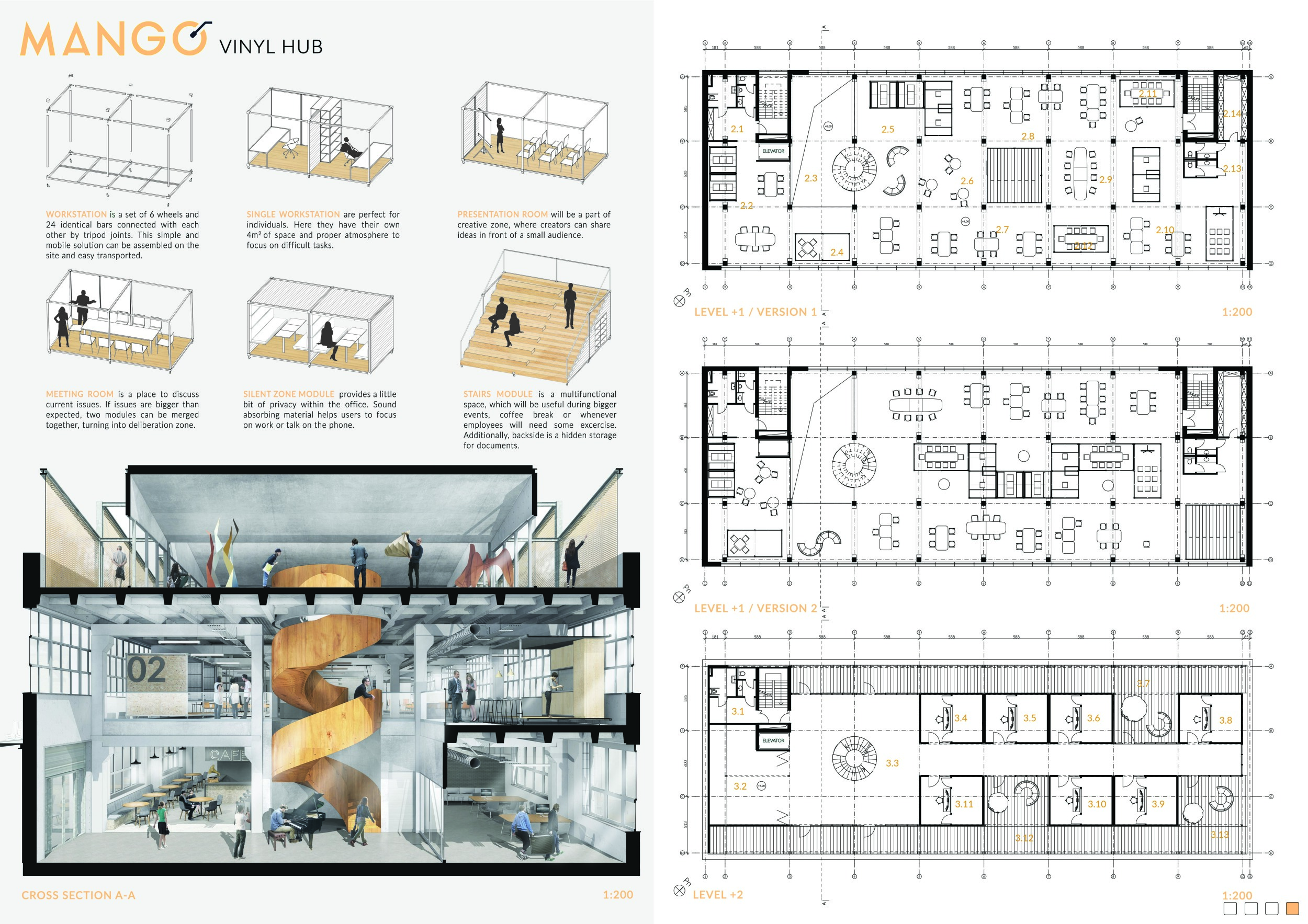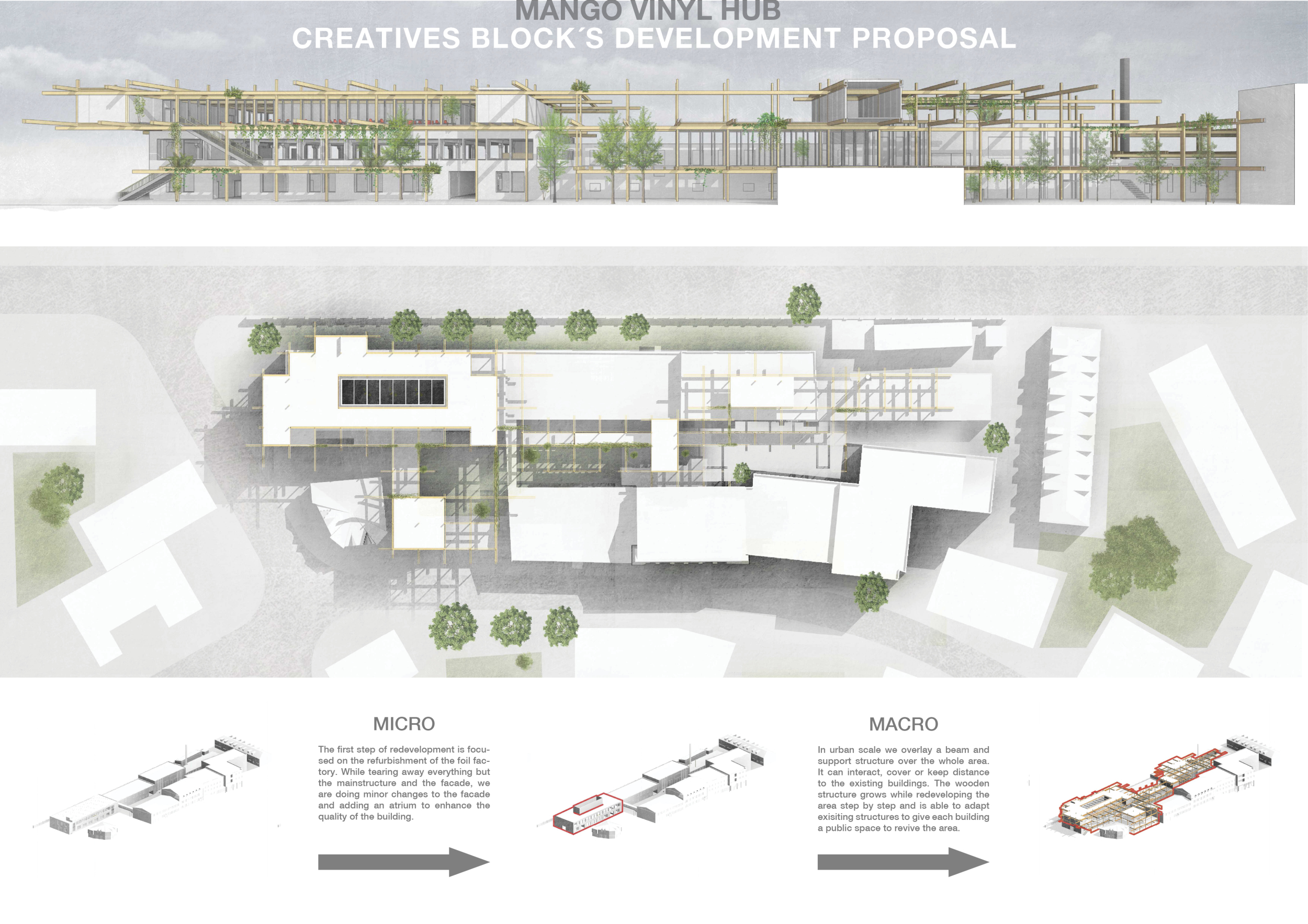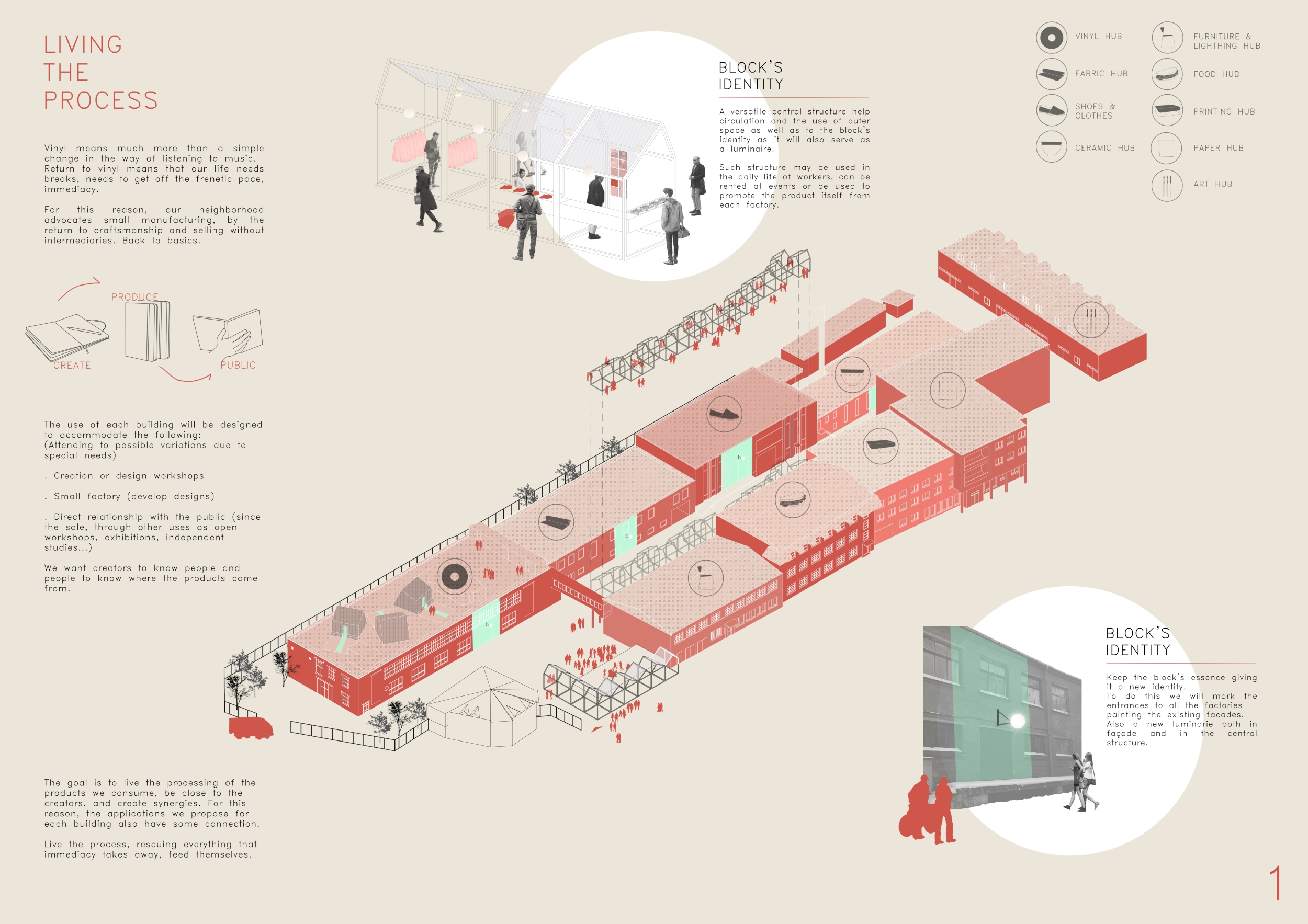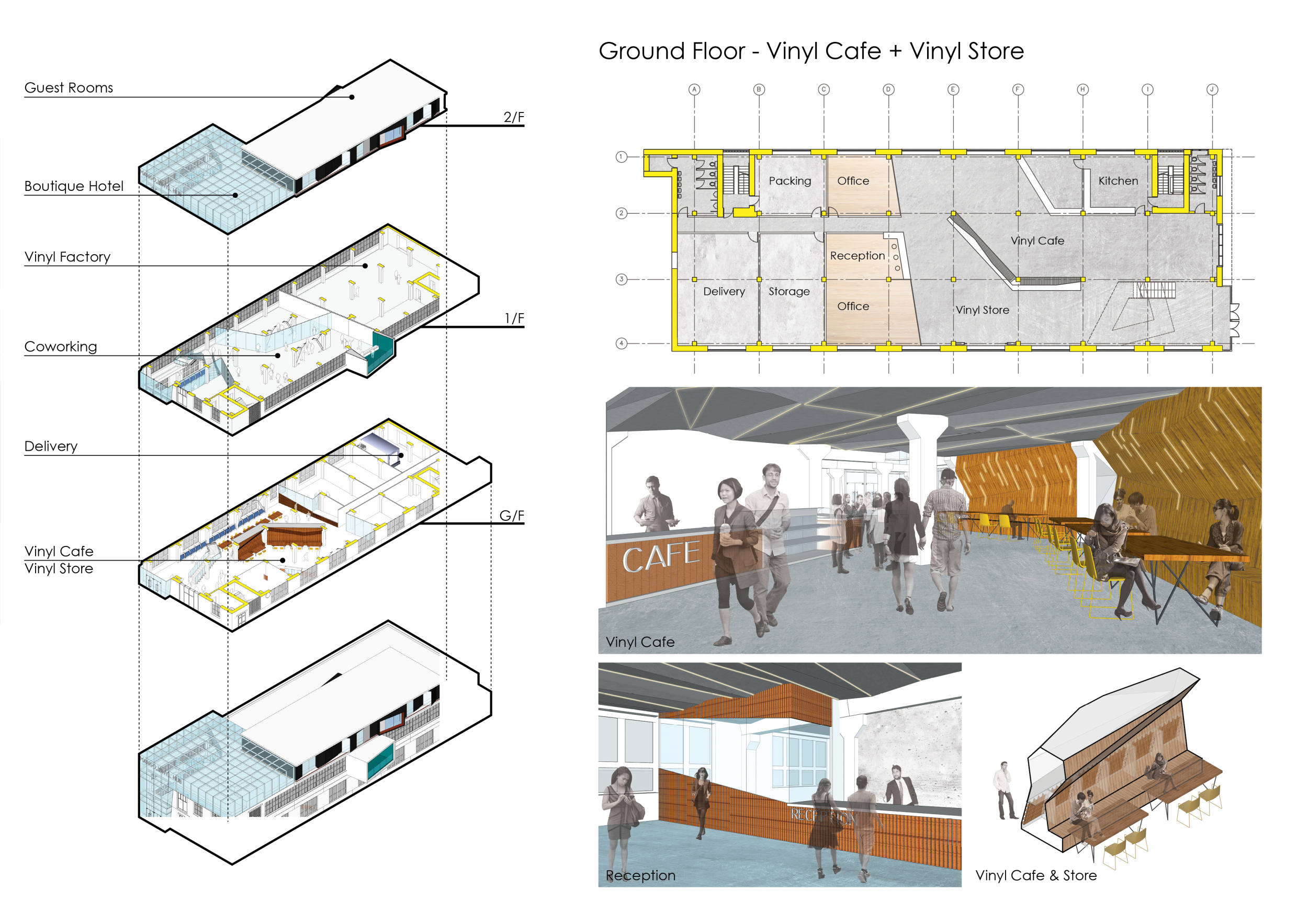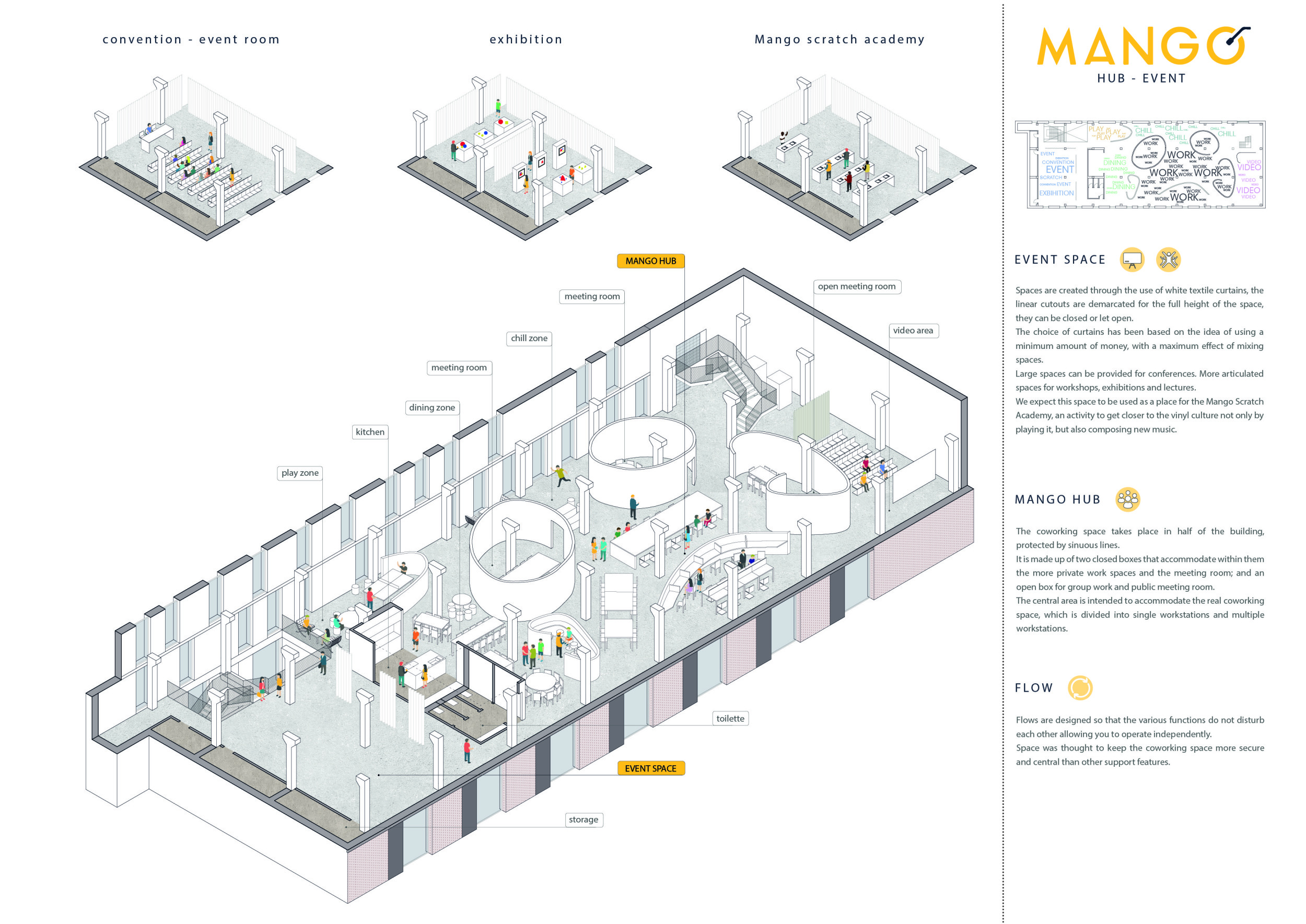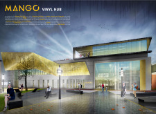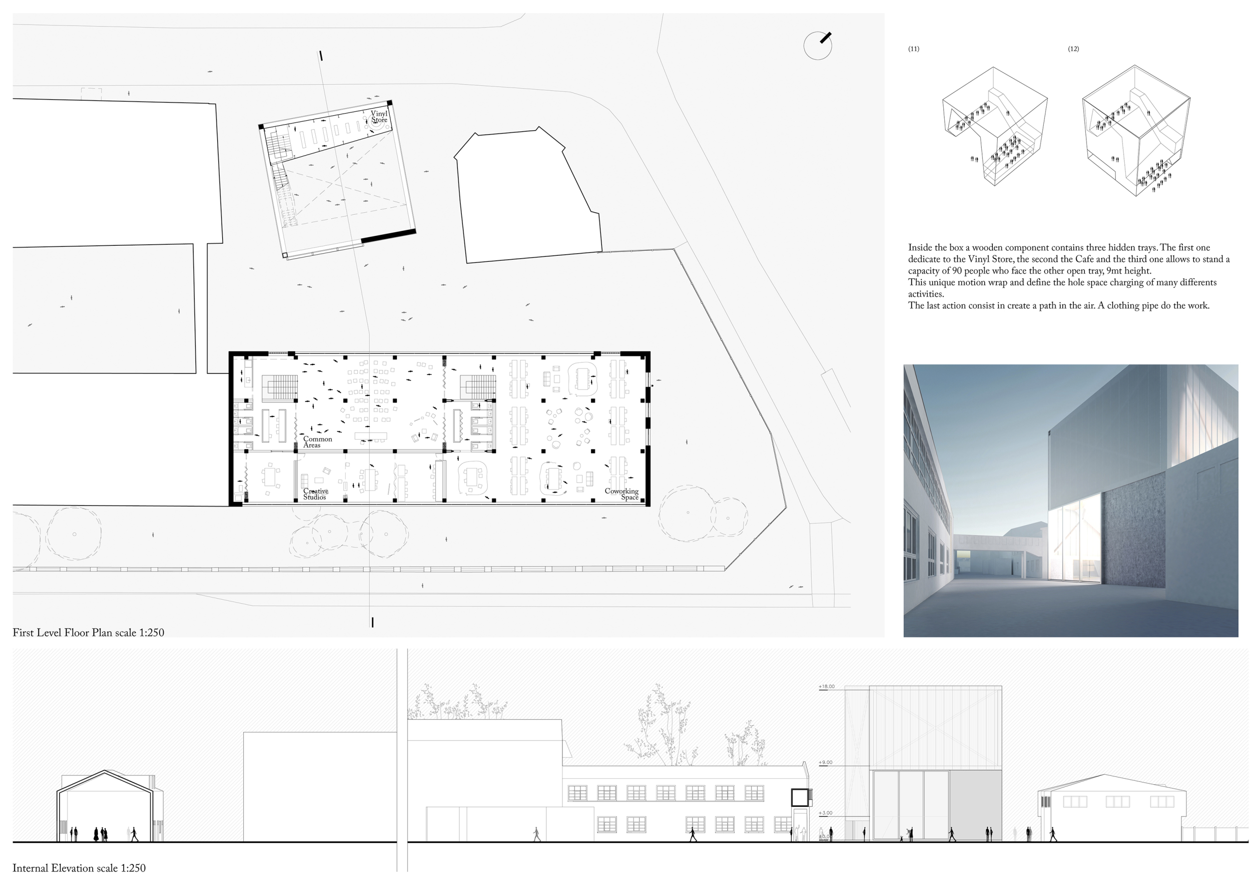 The third place entry for the Mango Vinyl Hub competition takes on the project of exposition and production to radically transform an abandoned tin foil factory into a new co-working hub, both celebrating and displaying the emergent creative industries of the area. In a spatial diagram juxtaposing the market and the processes of making, the project makes explicit the tensions and collaborations between production and commerce.