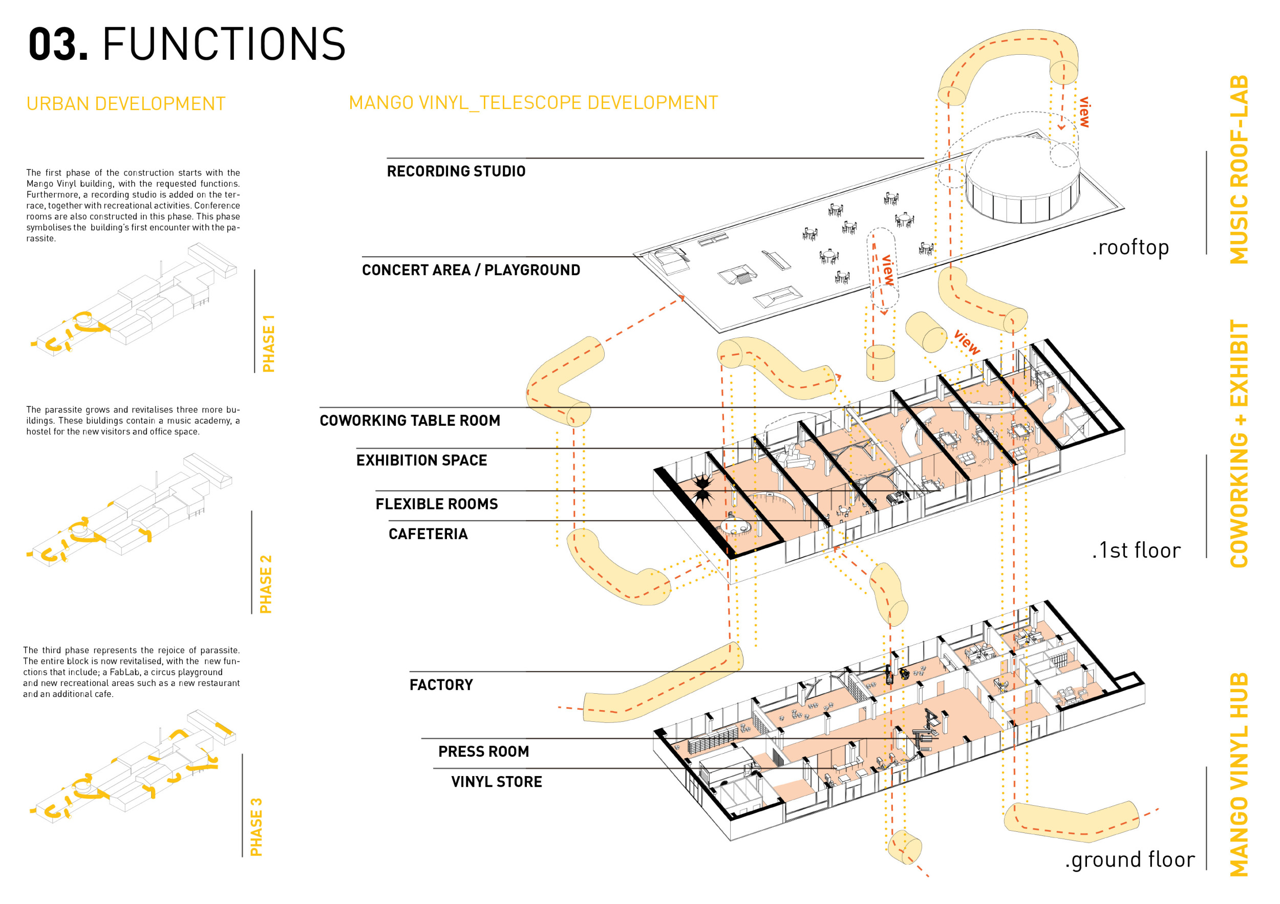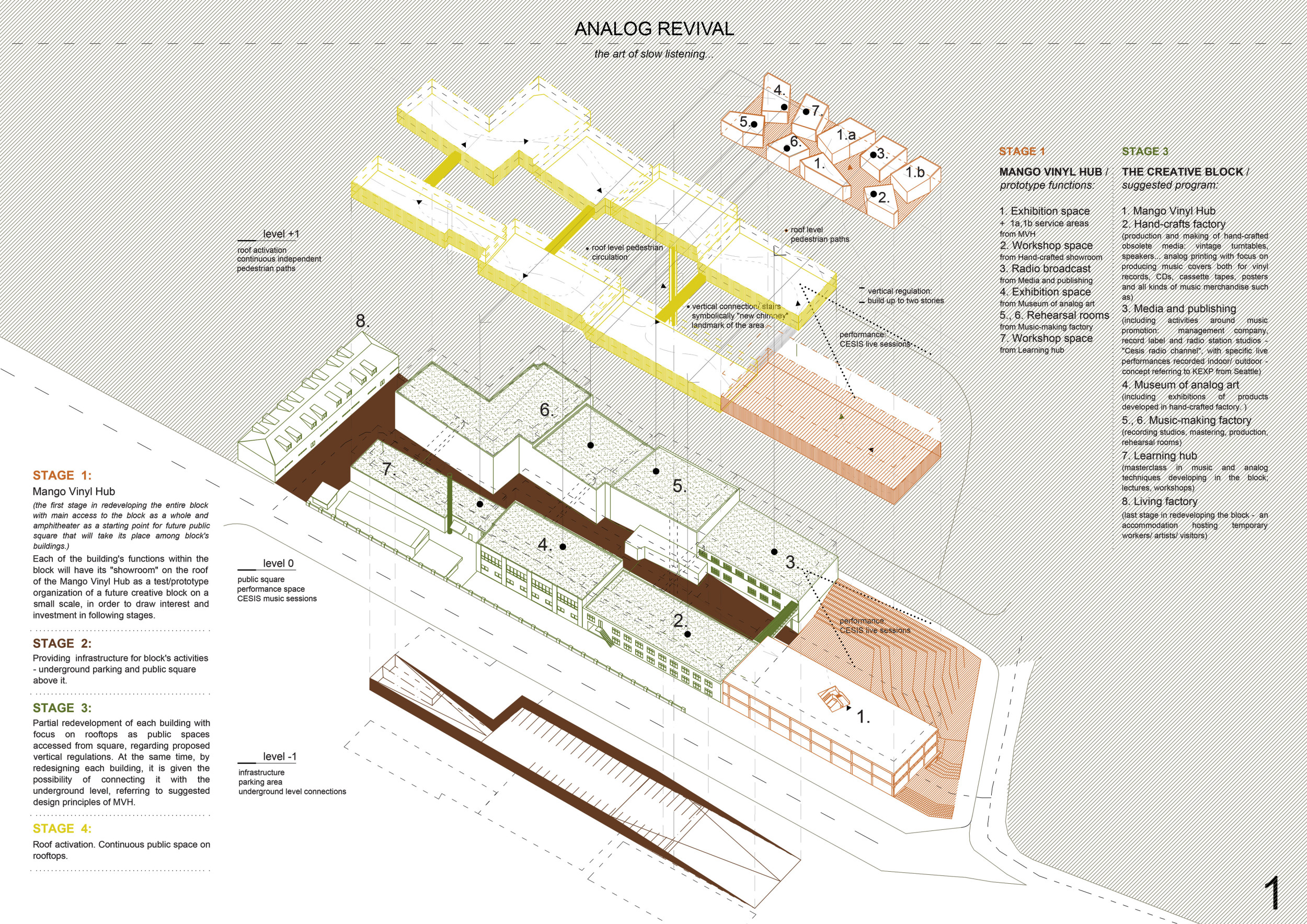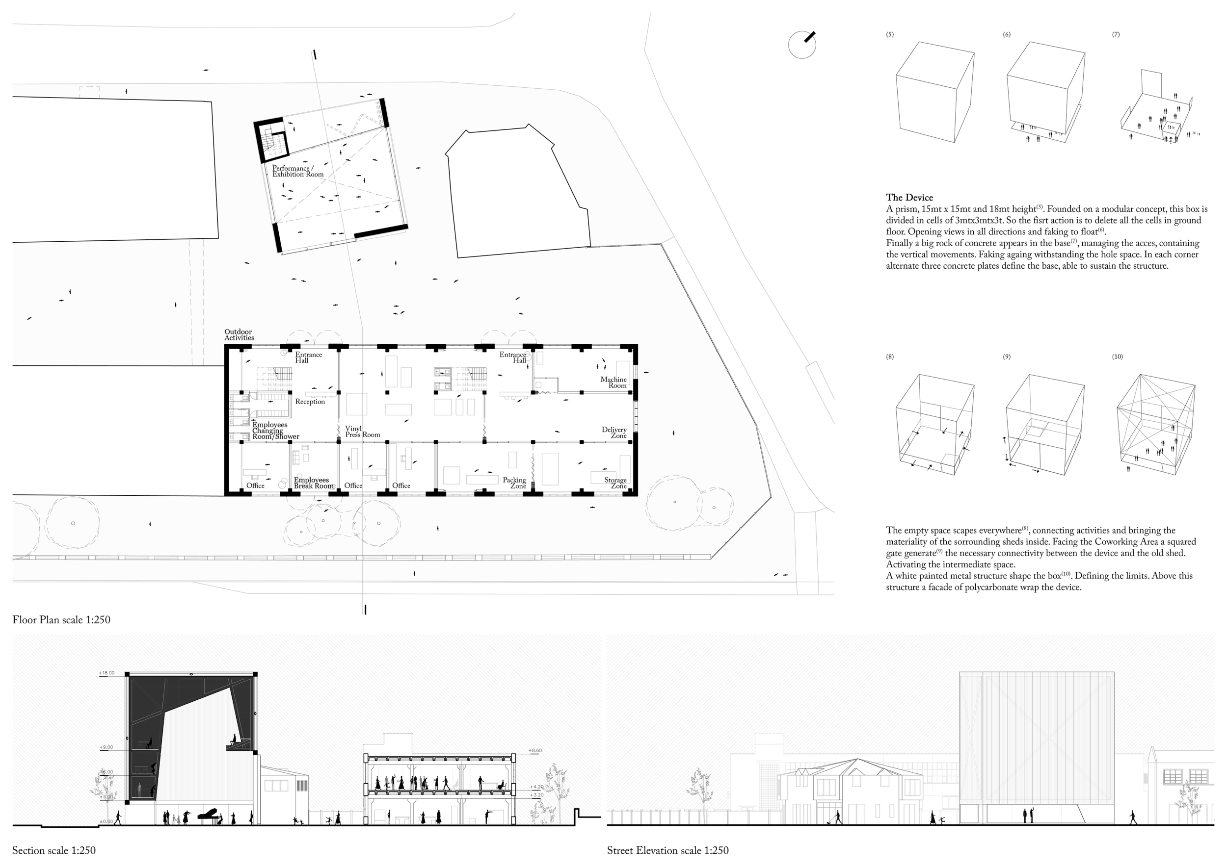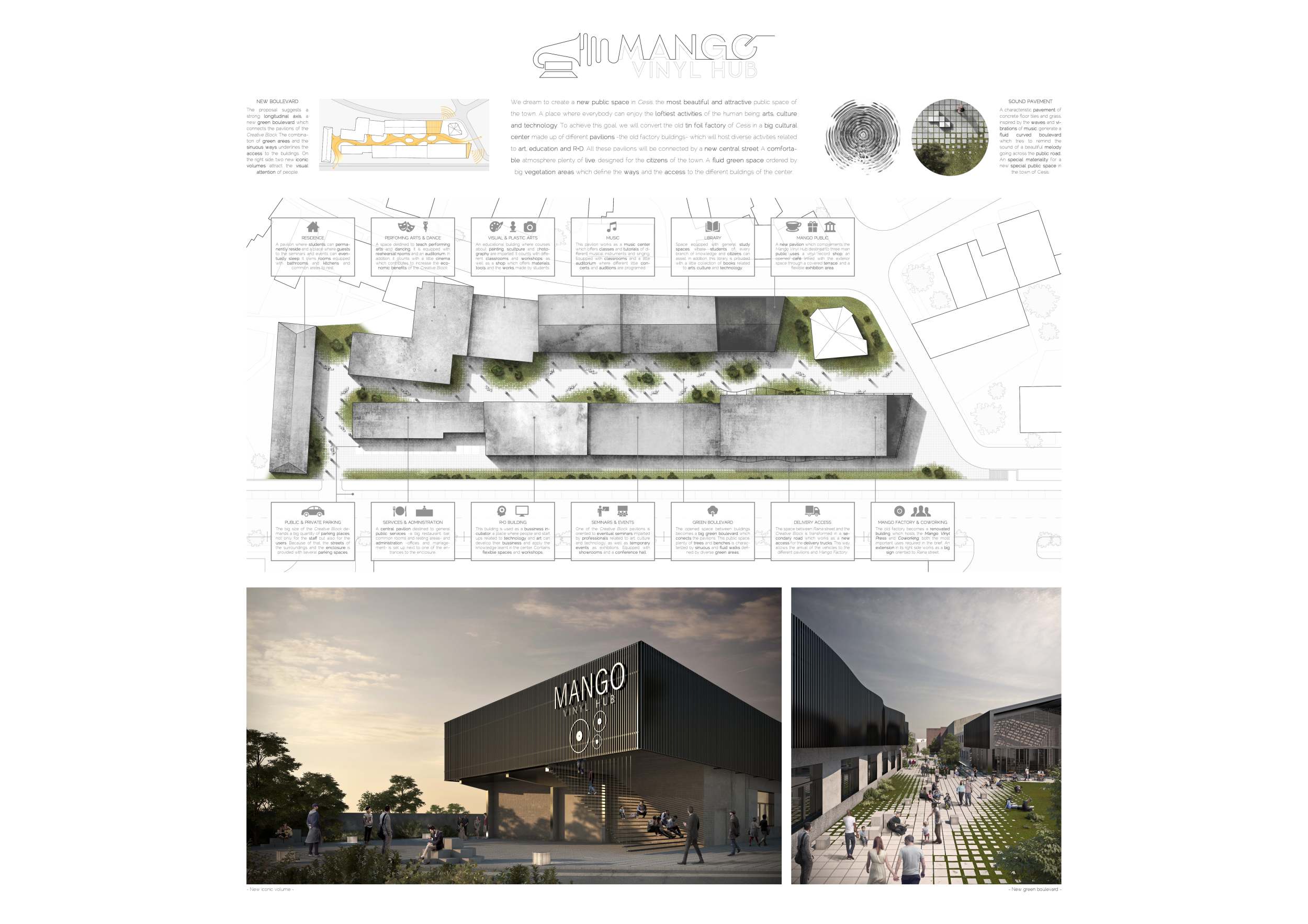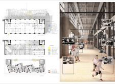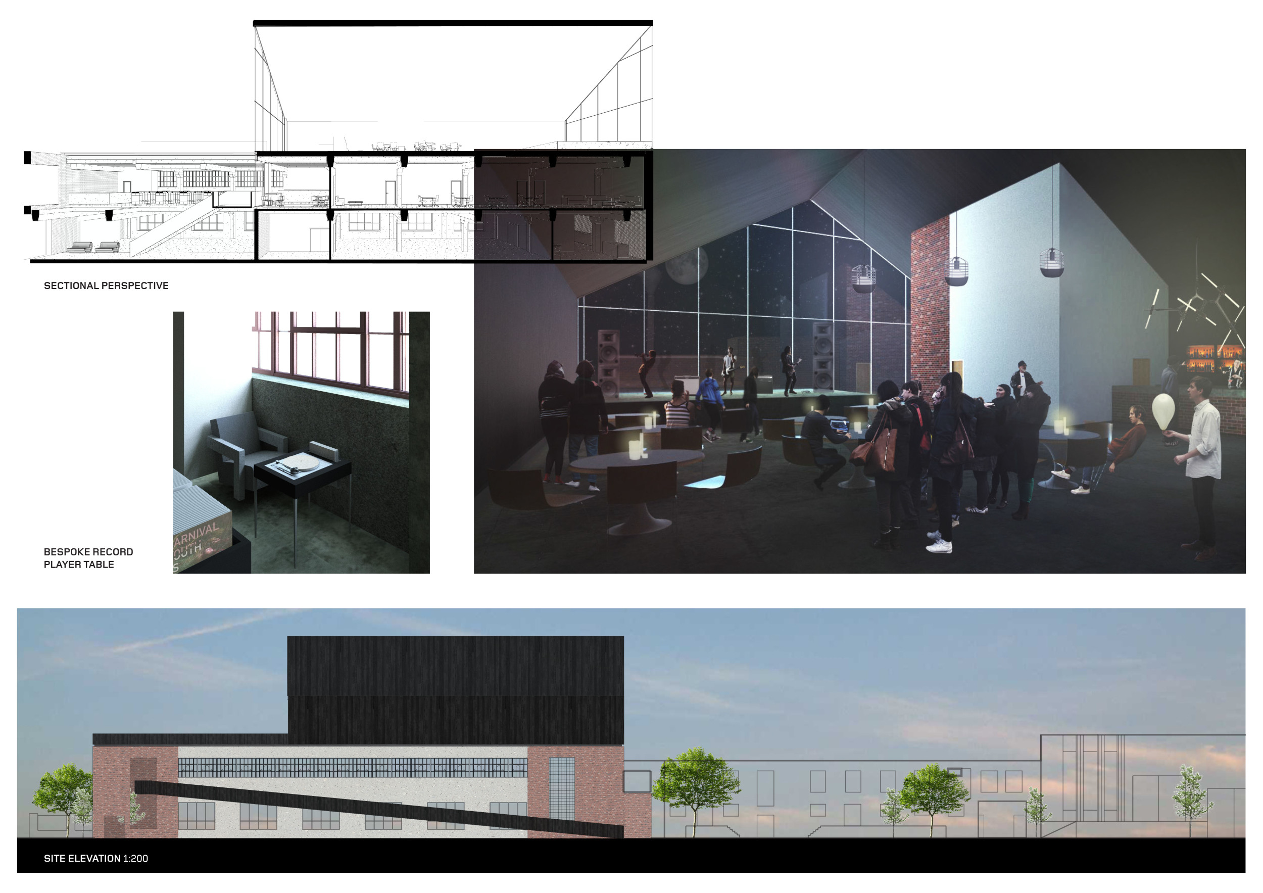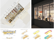 The third place entry for the Mango Vinyl Hub competition takes on the project of exposition and production to radically transform an abandoned tin foil factory into a new co-working hub, both celebrating and displaying the emergent creative industries of the area. In a spatial diagram juxtaposing the market and the processes of making, the project makes explicit the tensions and collaborations between production and commerce.