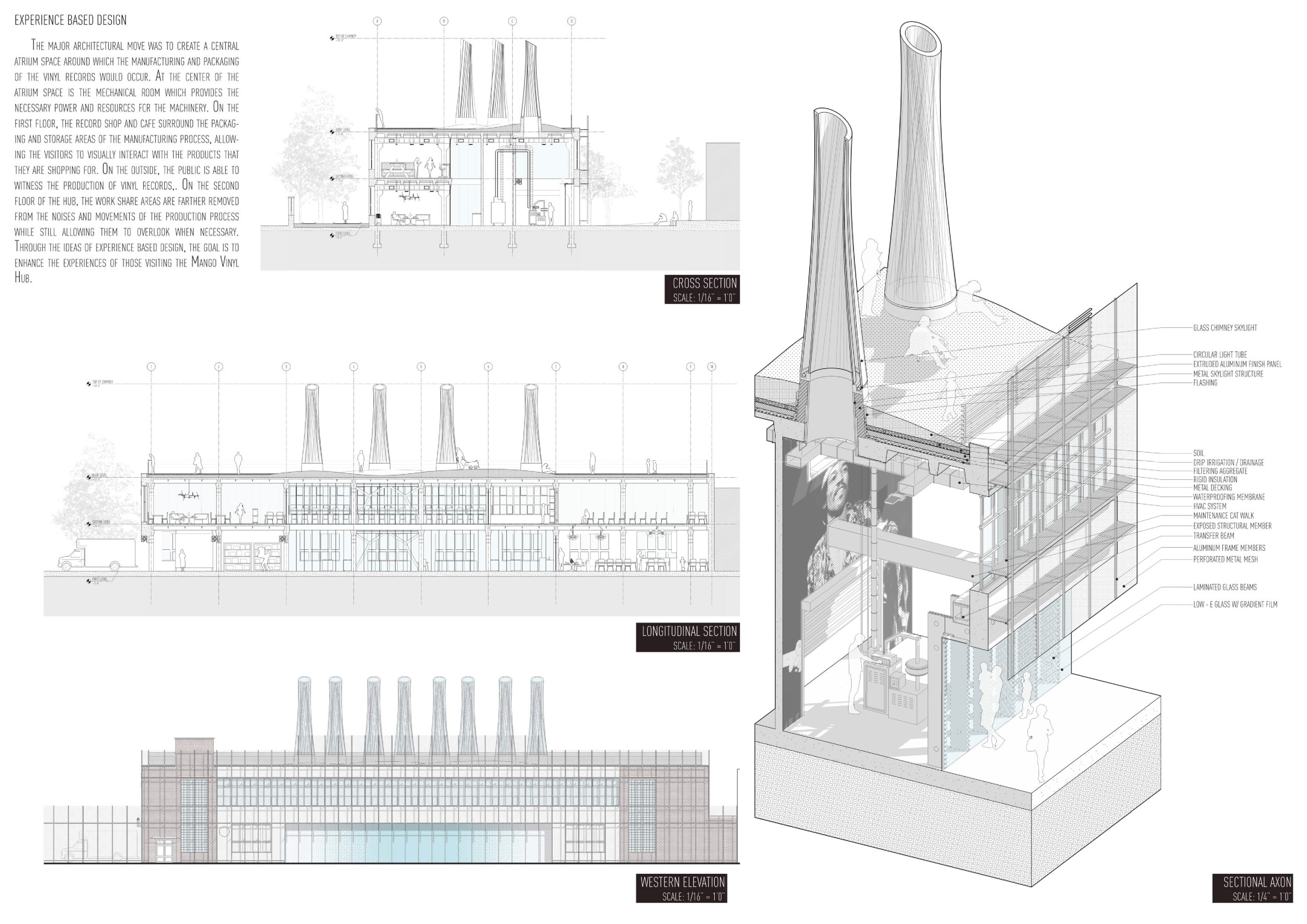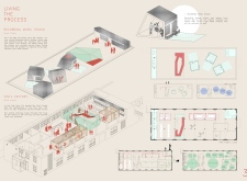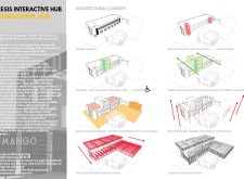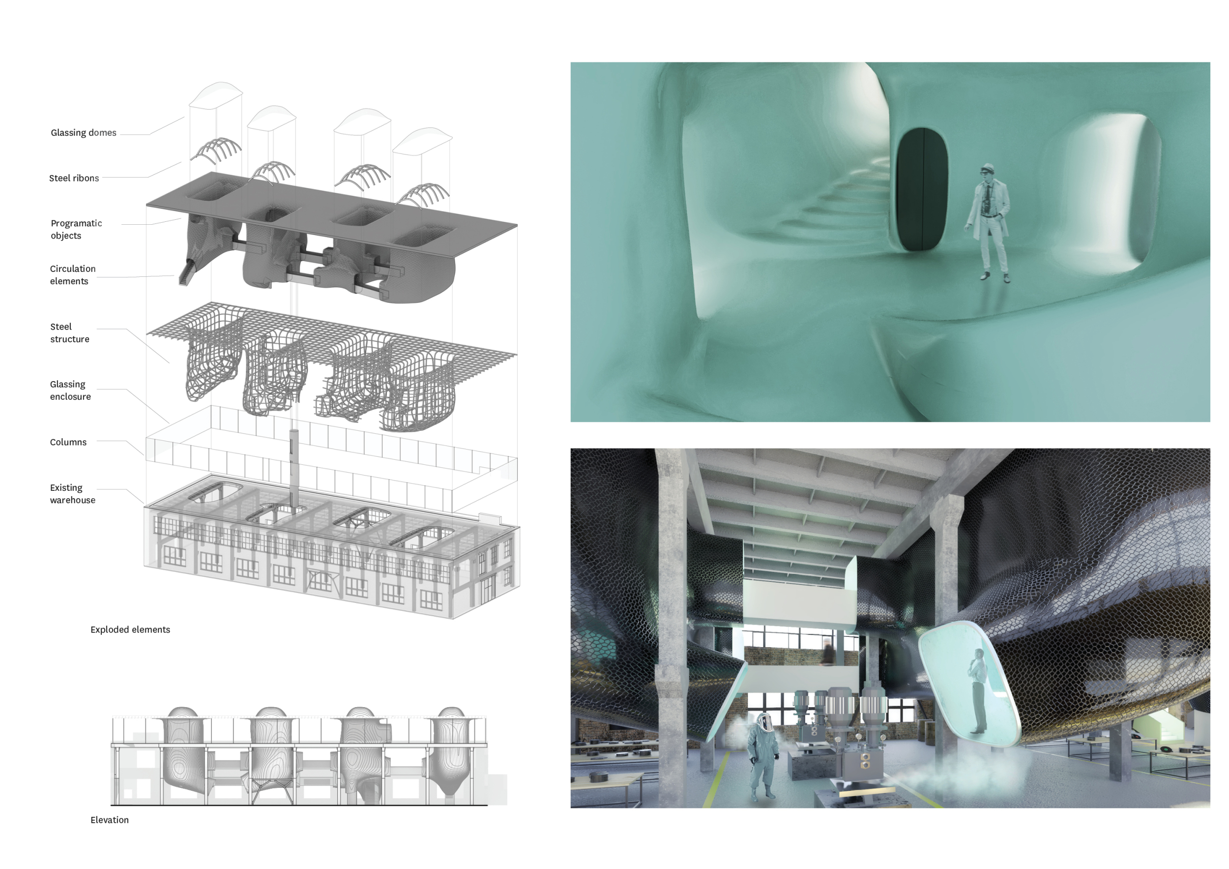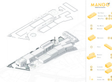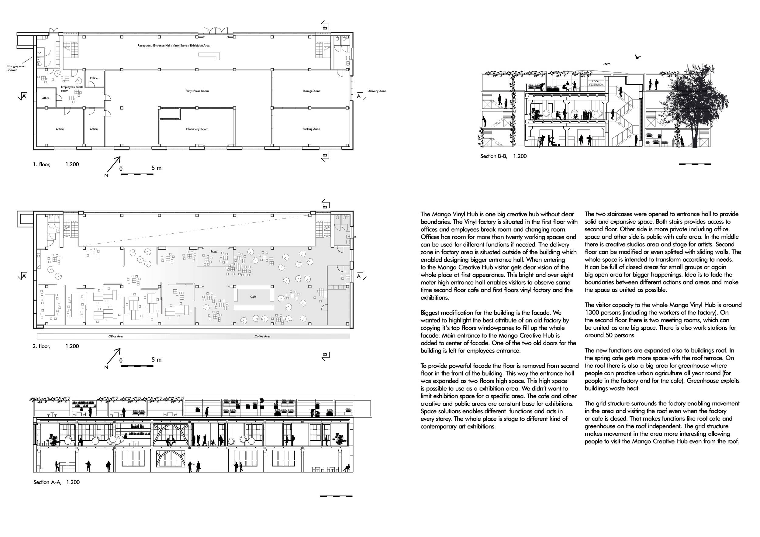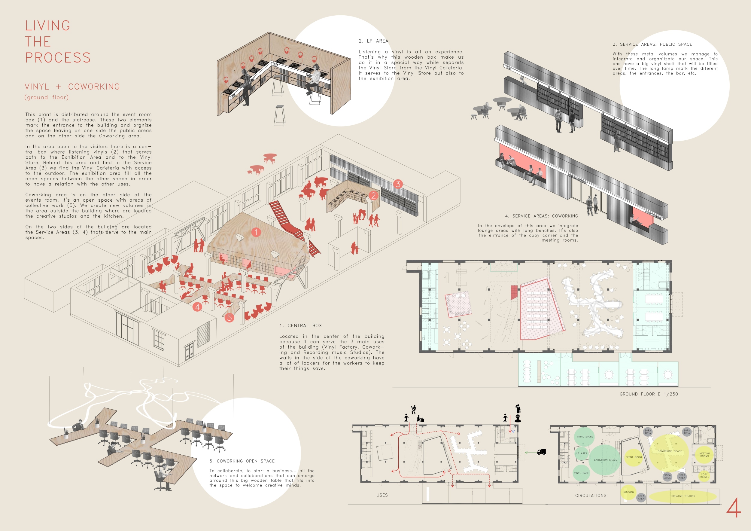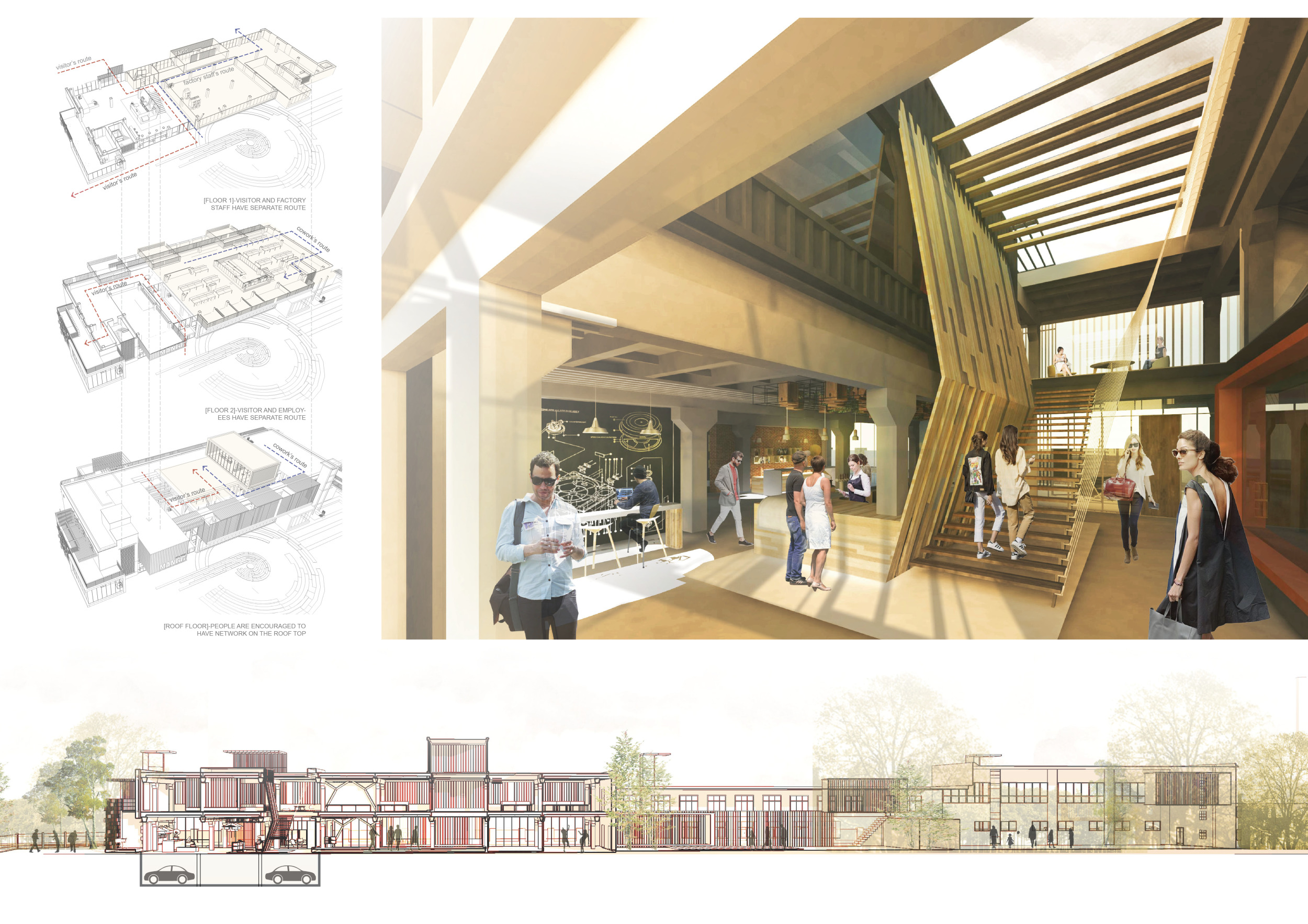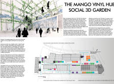 The third place entry for the Mango Vinyl Hub competition takes on the project of exposition and production to radically transform an abandoned tin foil factory into a new co-working hub, both celebrating and displaying the emergent creative industries of the area. In a spatial diagram juxtaposing the market and the processes of making, the project makes explicit the tensions and collaborations between production and commerce.