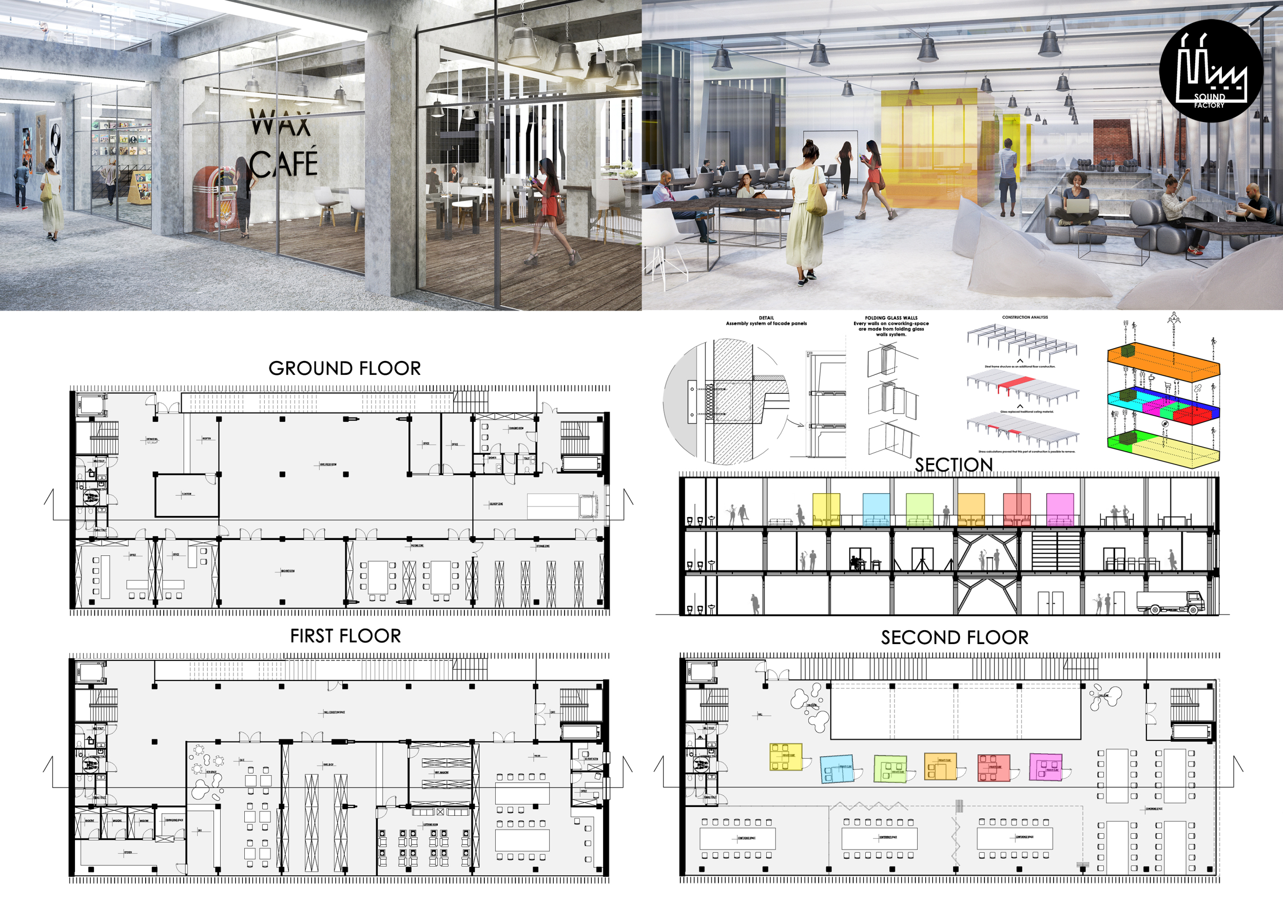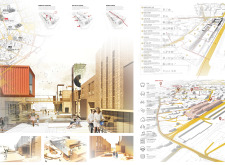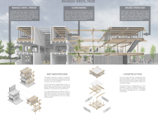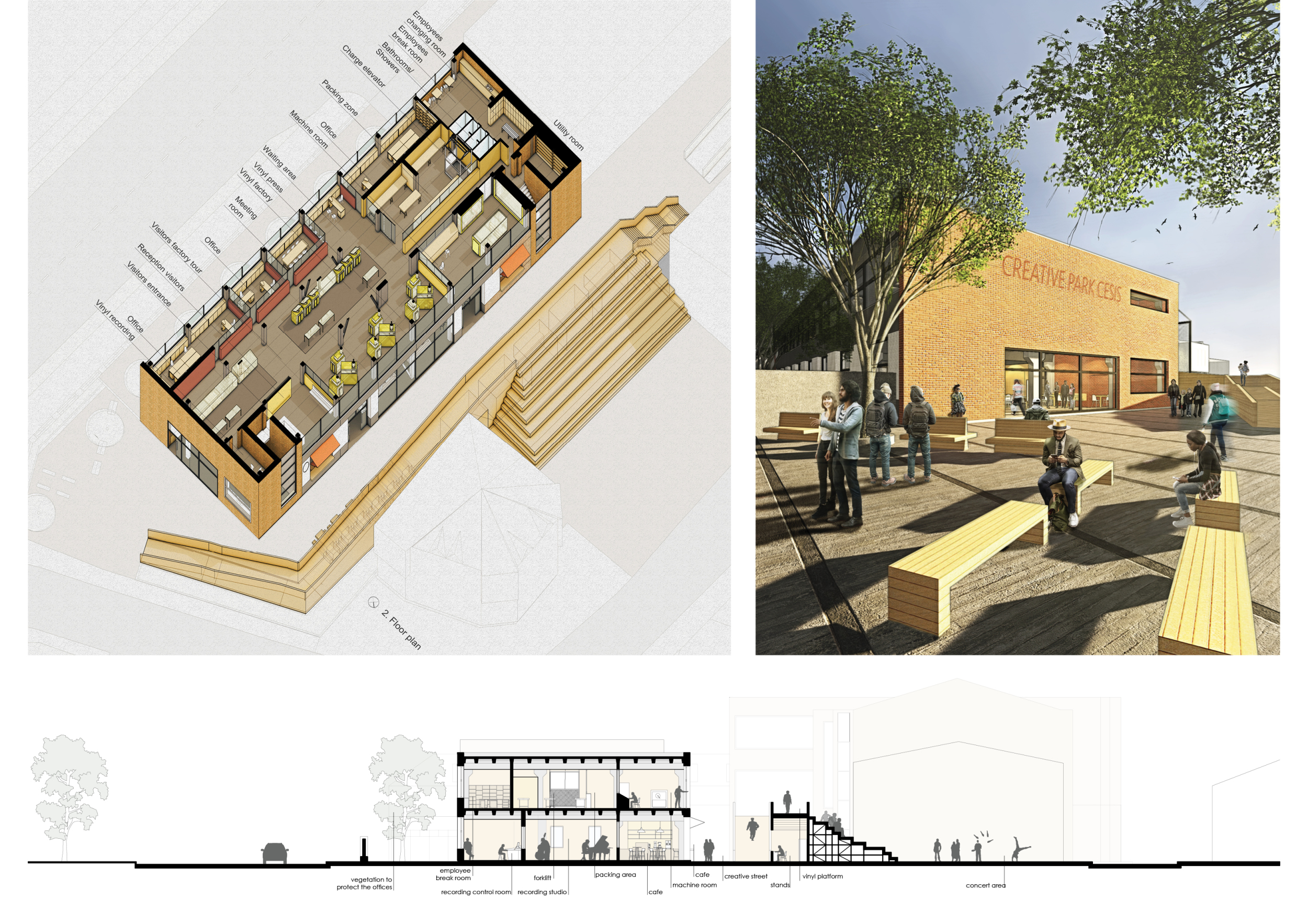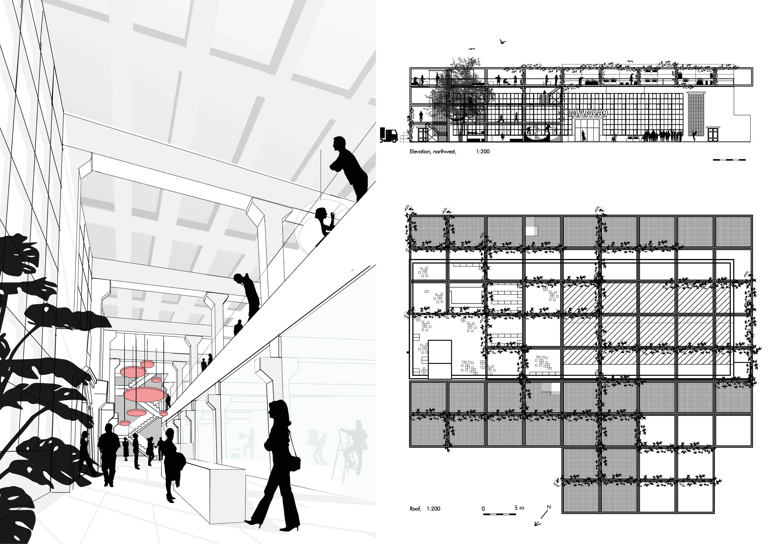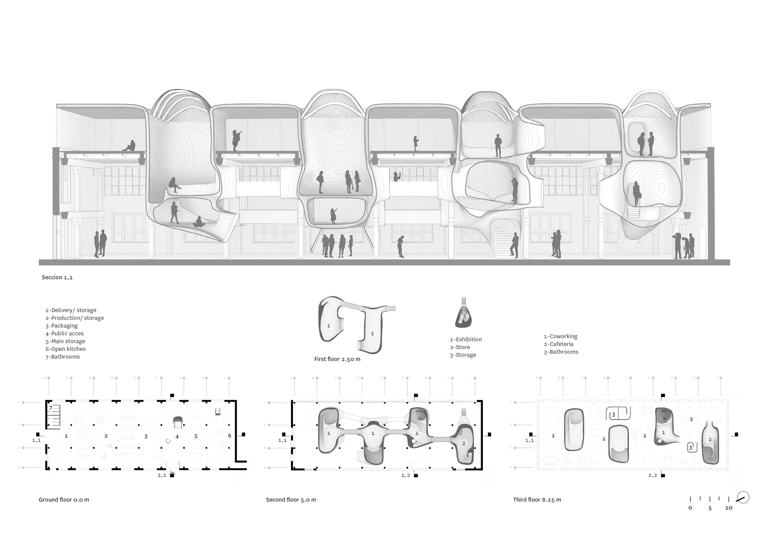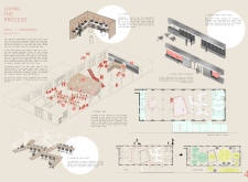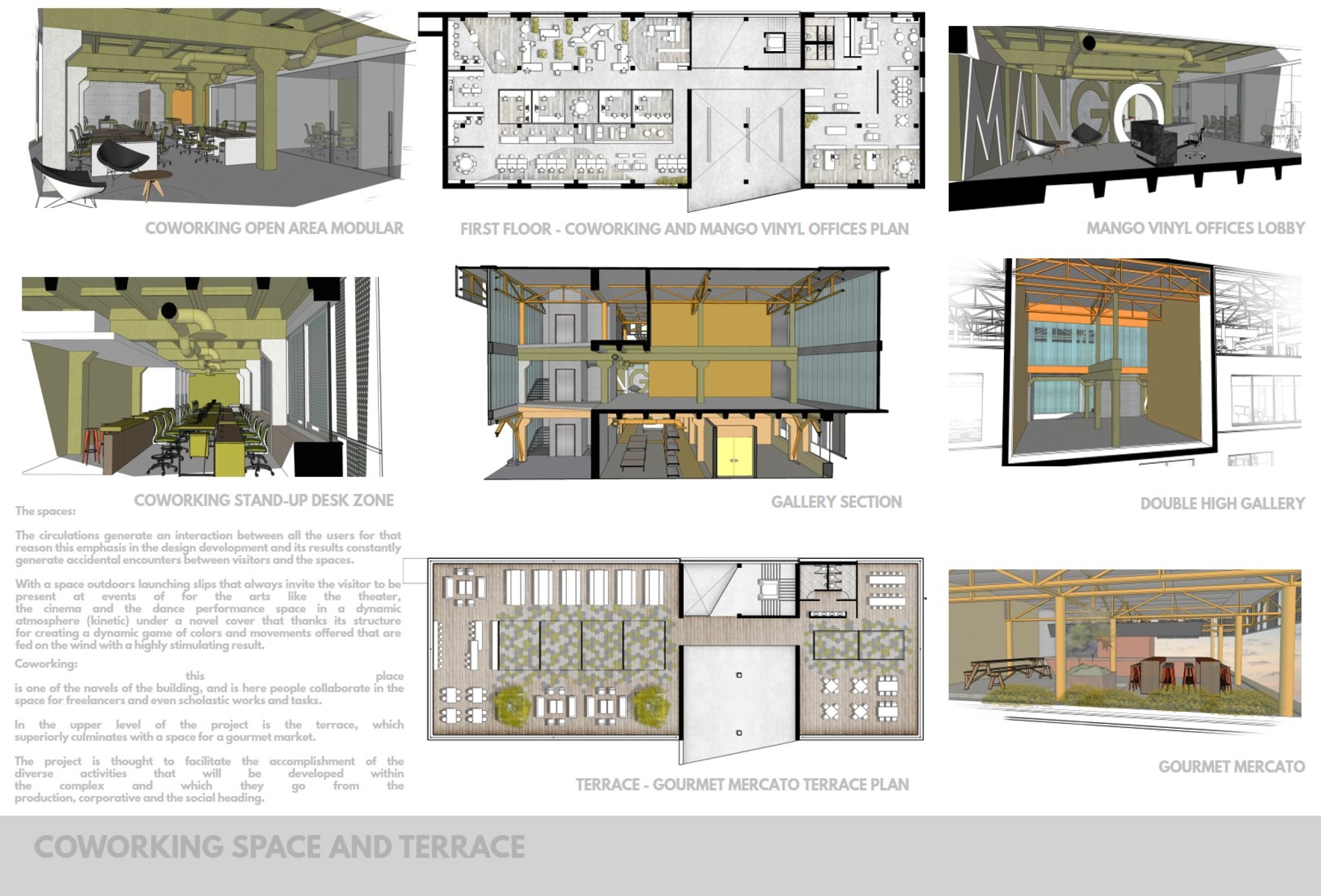 The third place entry for the Mango Vinyl Hub competition takes on the project of exposition and production to radically transform an abandoned tin foil factory into a new co-working hub, both celebrating and displaying the emergent creative industries of the area. In a spatial diagram juxtaposing the market and the processes of making, the project makes explicit the tensions and collaborations between production and commerce.