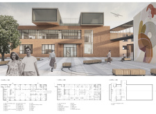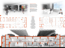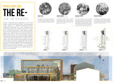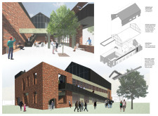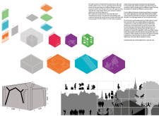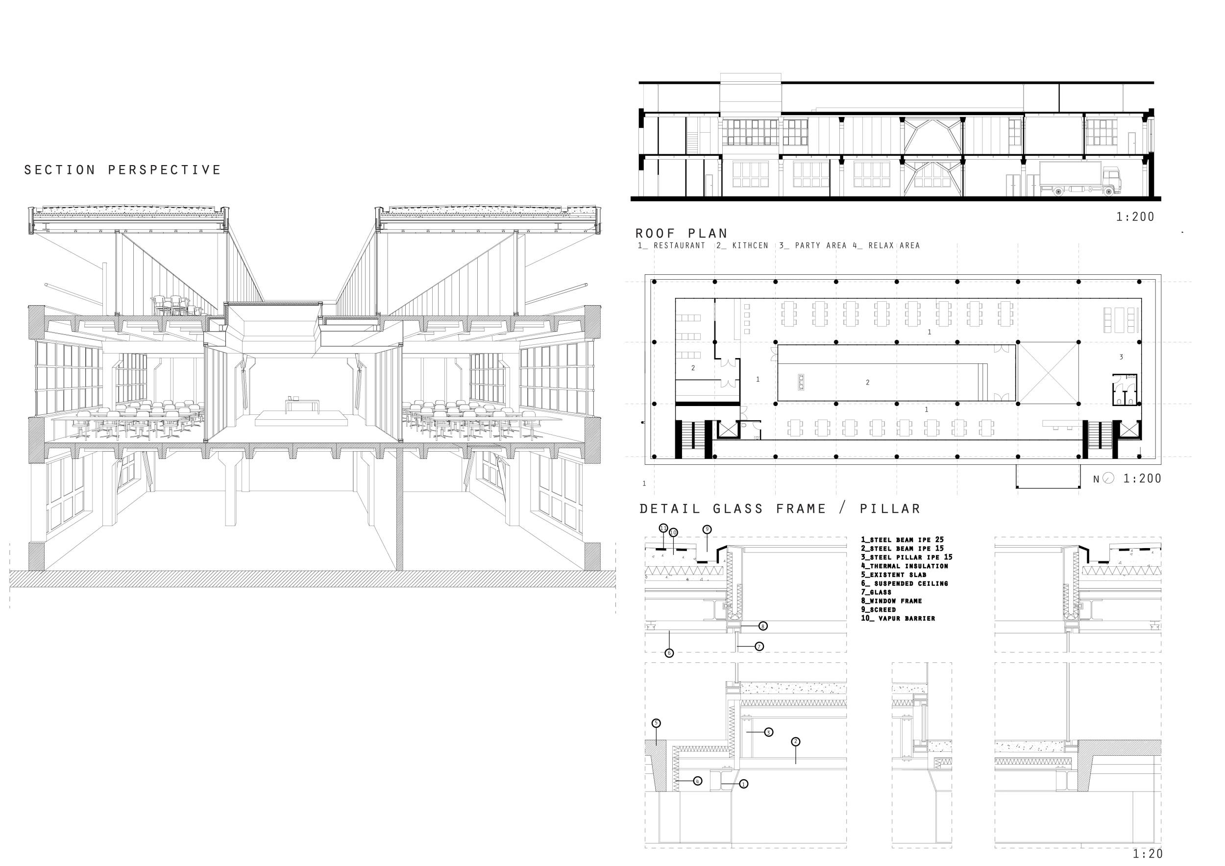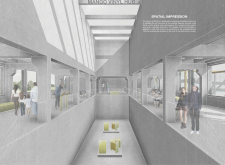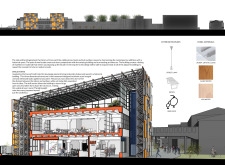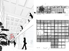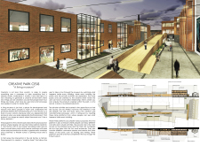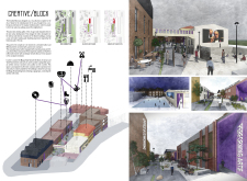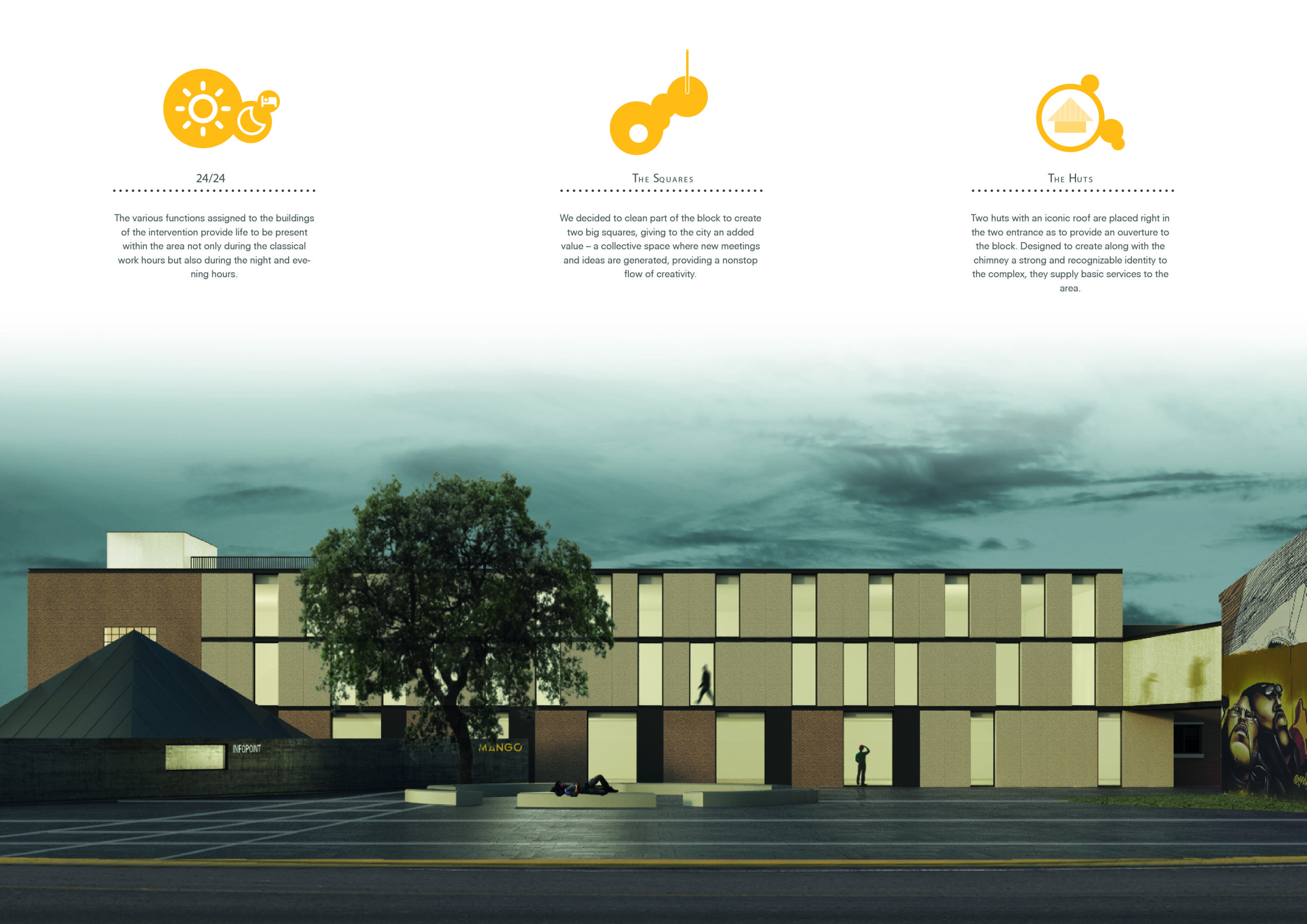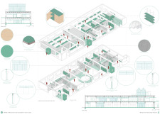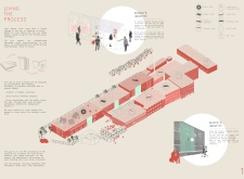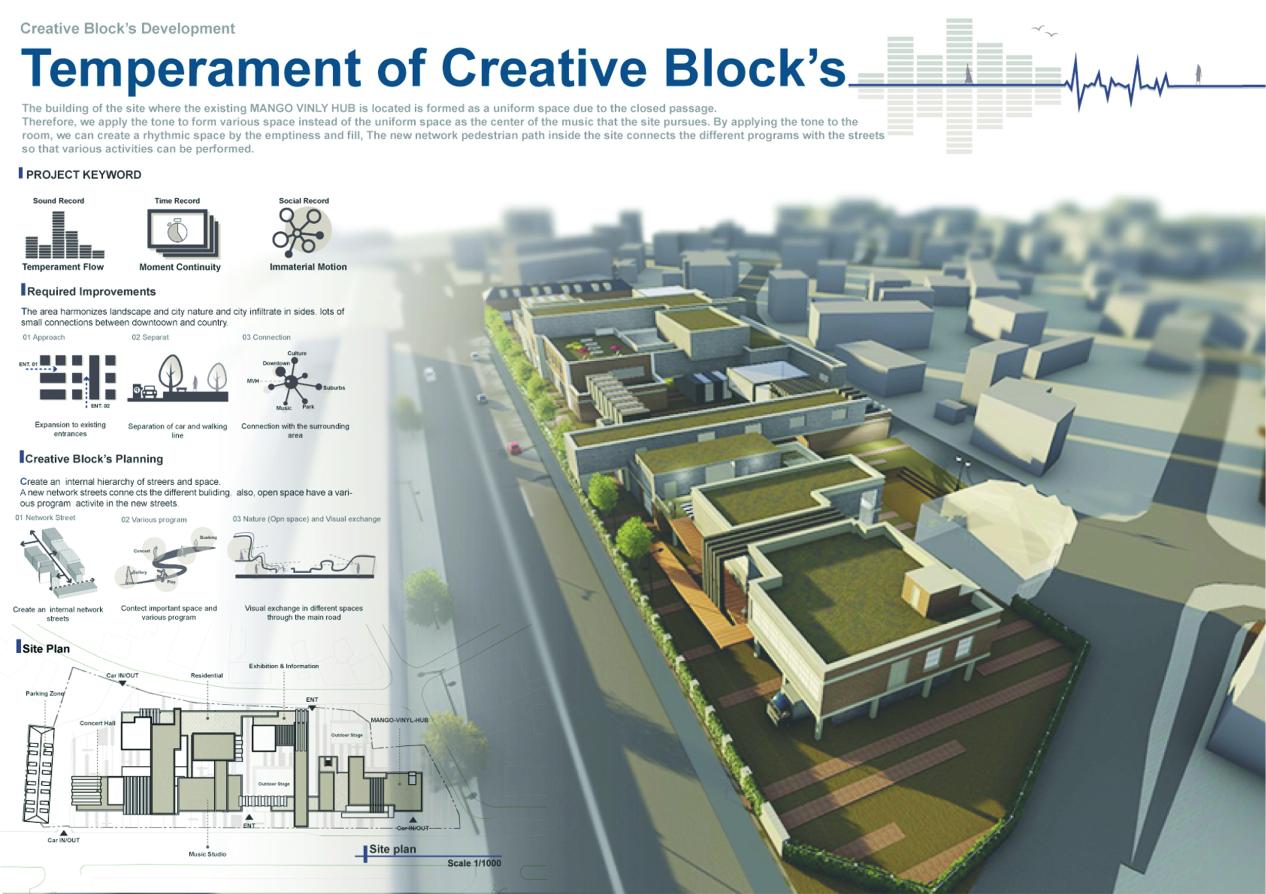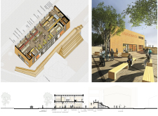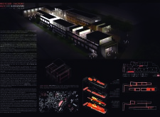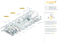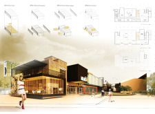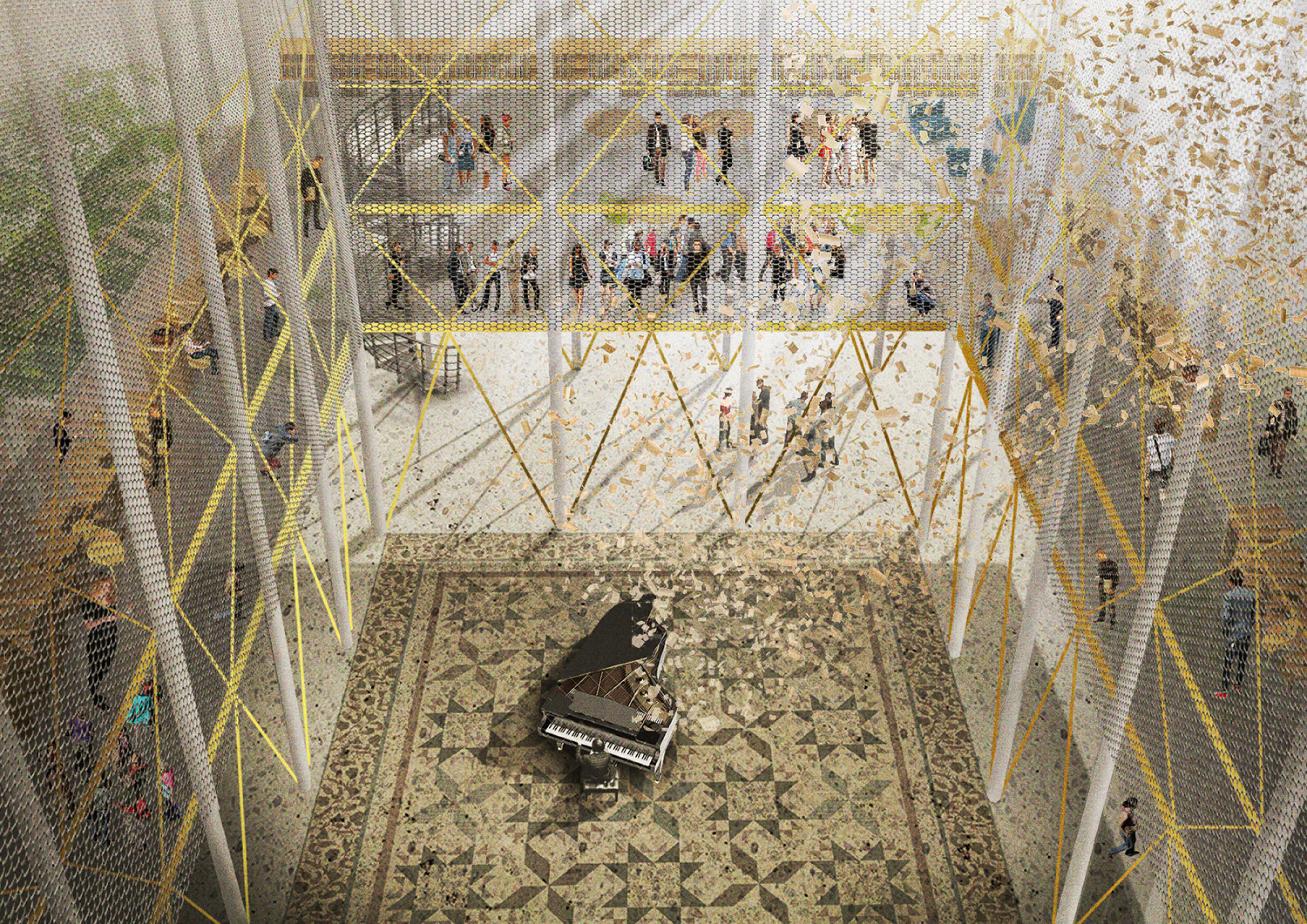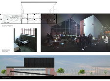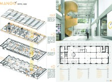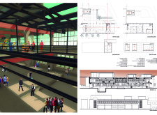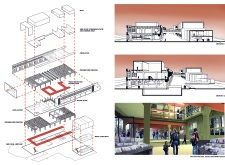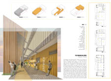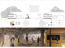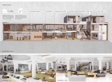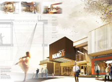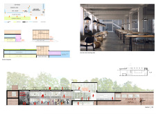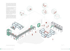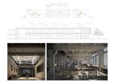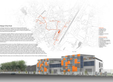 The third place entry for the Mango Vinyl Hub competition takes on the project of exposition and production to radically transform an abandoned tin foil factory into a new co-working hub, both celebrating and displaying the emergent creative industries of the area. In a spatial diagram juxtaposing the market and the processes of making, the project makes explicit the tensions and collaborations between production and commerce.
