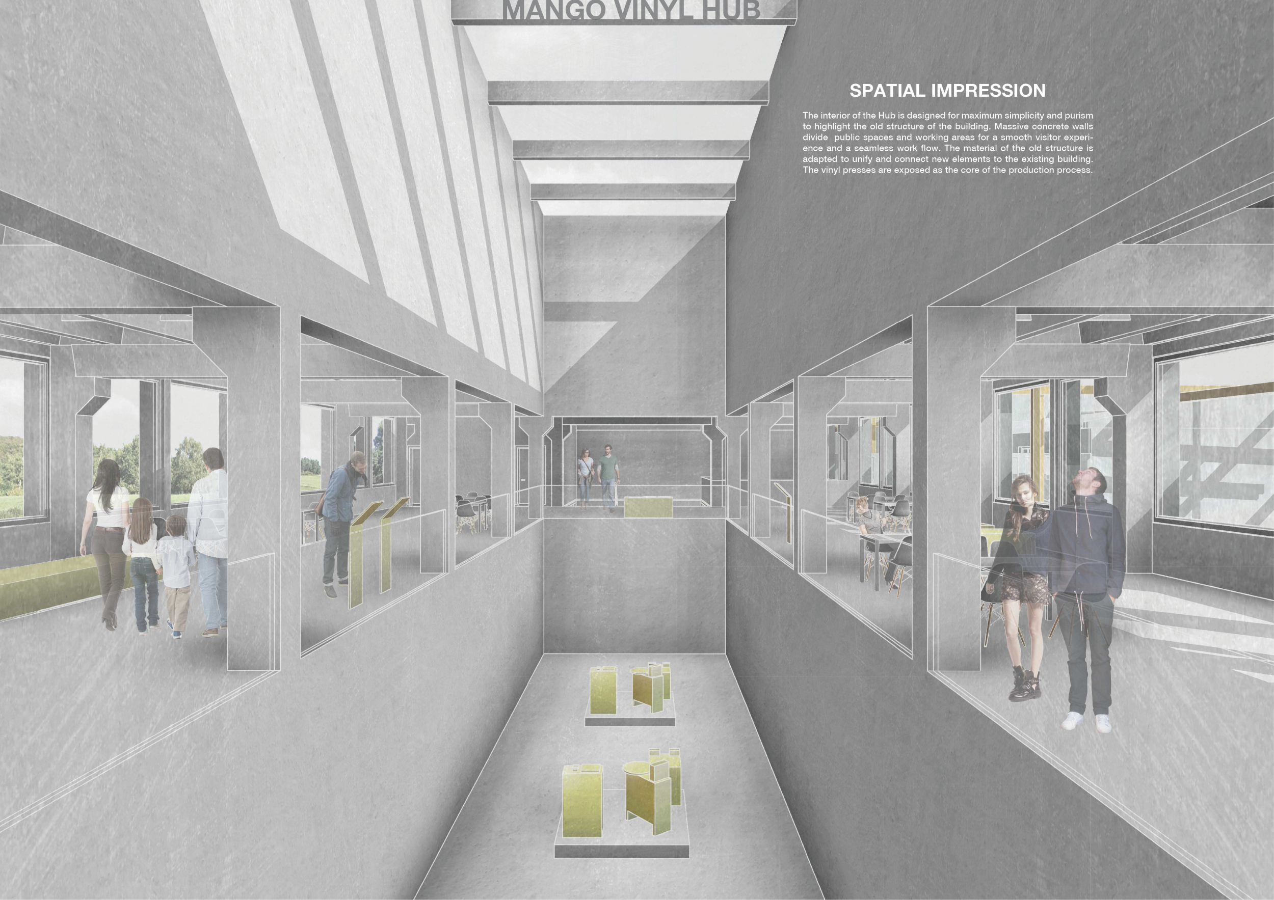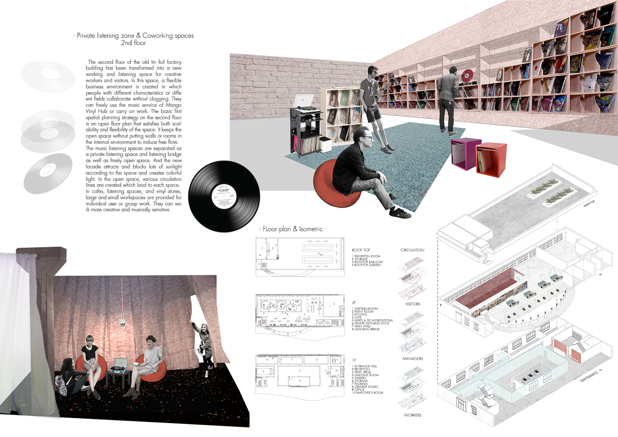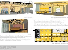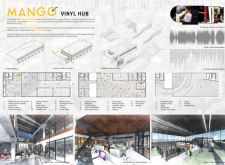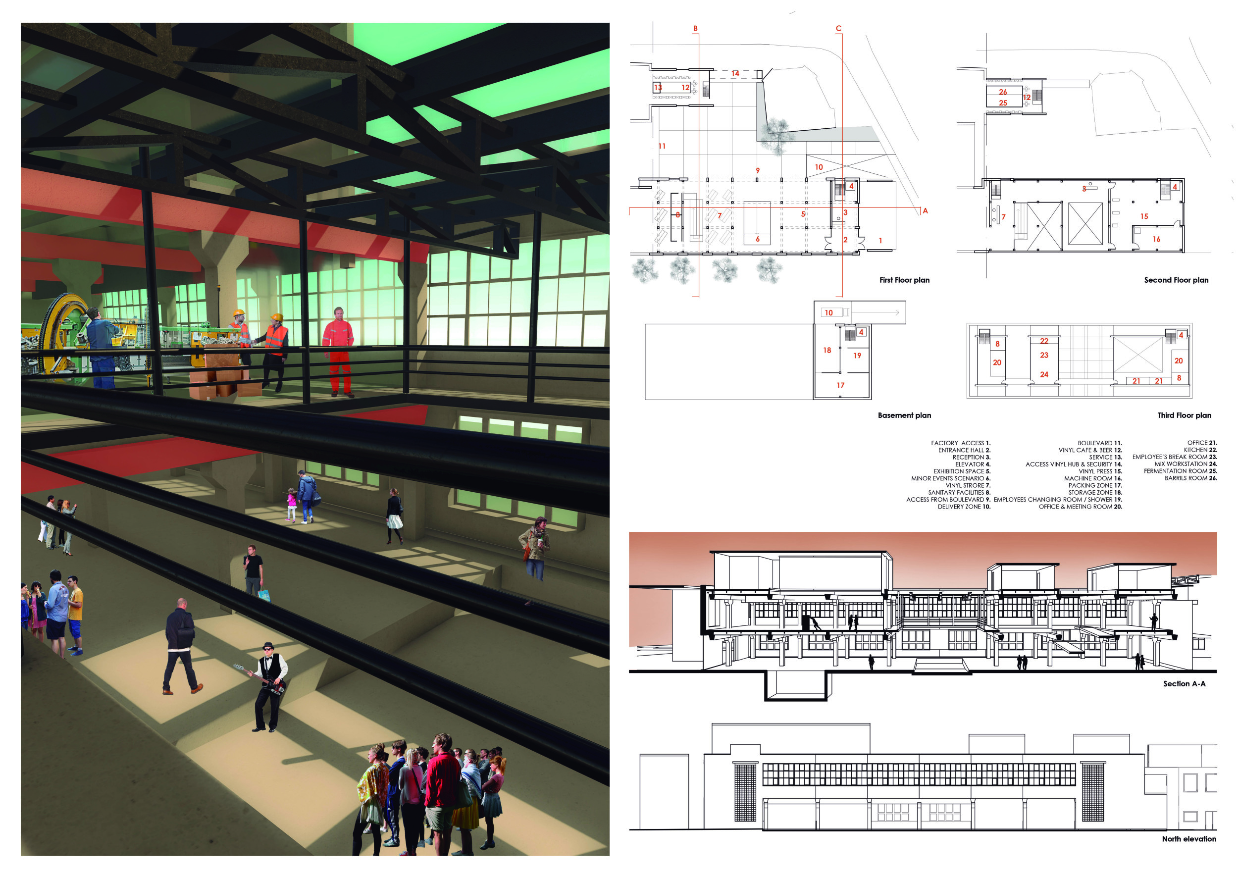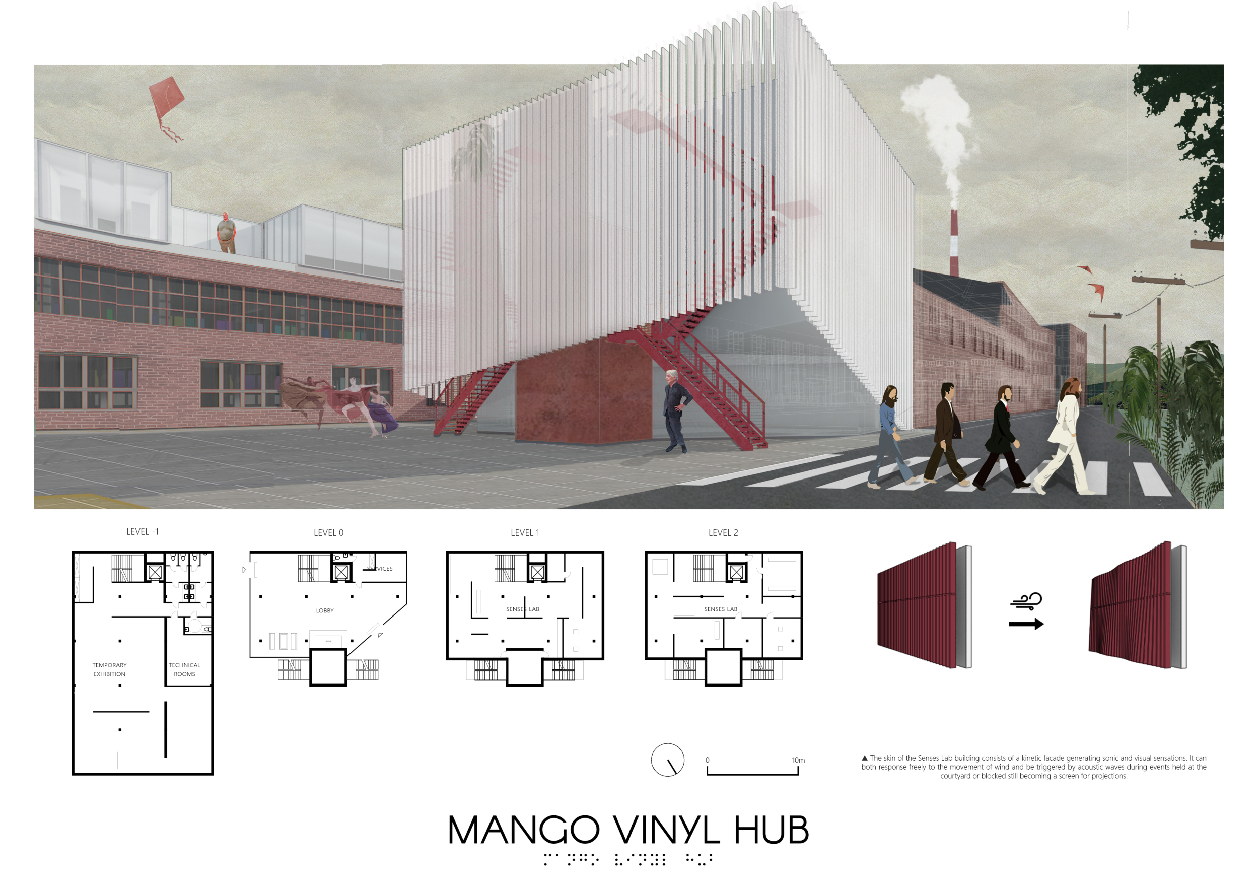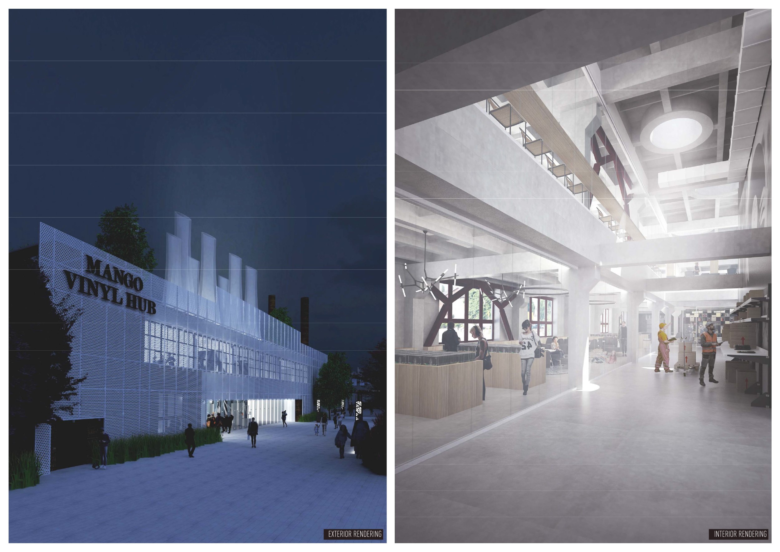 The success of the second place proposal for the Mango Vinyl Hub lies in its delineation and layering of new borders and boundaries within the structure of the existing tin foil factory to radically expose the extant industrial fabric while reviving its spaces and textures for the creative production of the emerging vinyl industry.