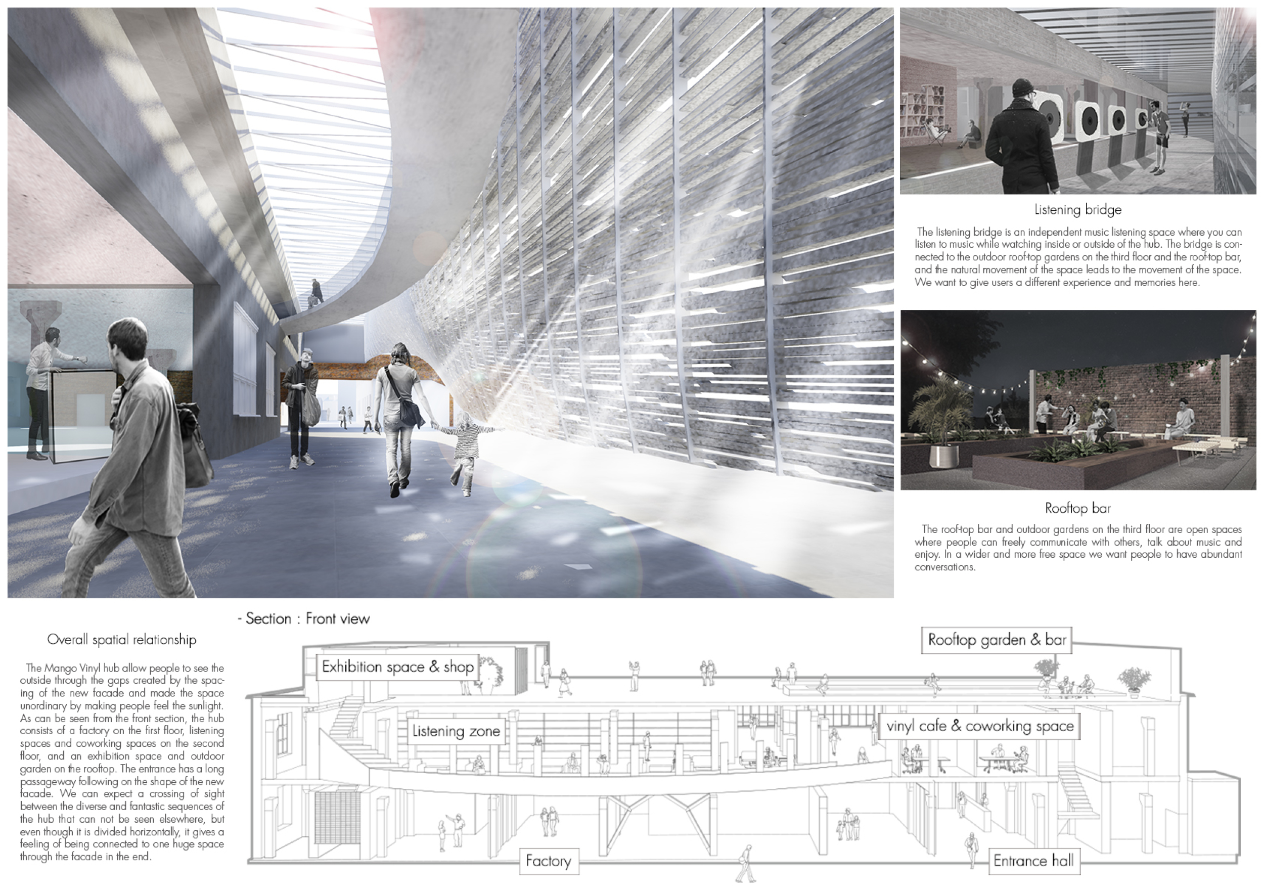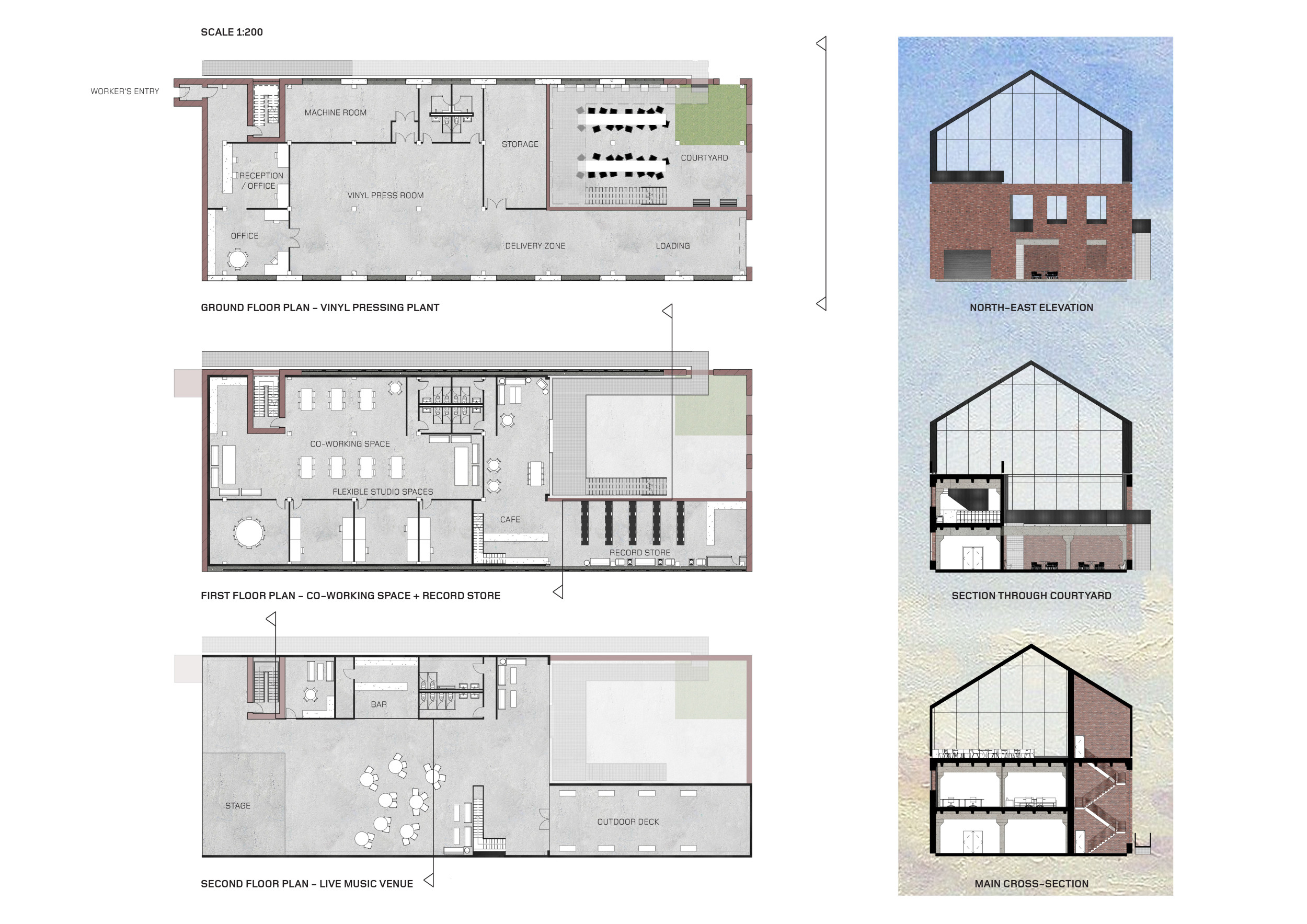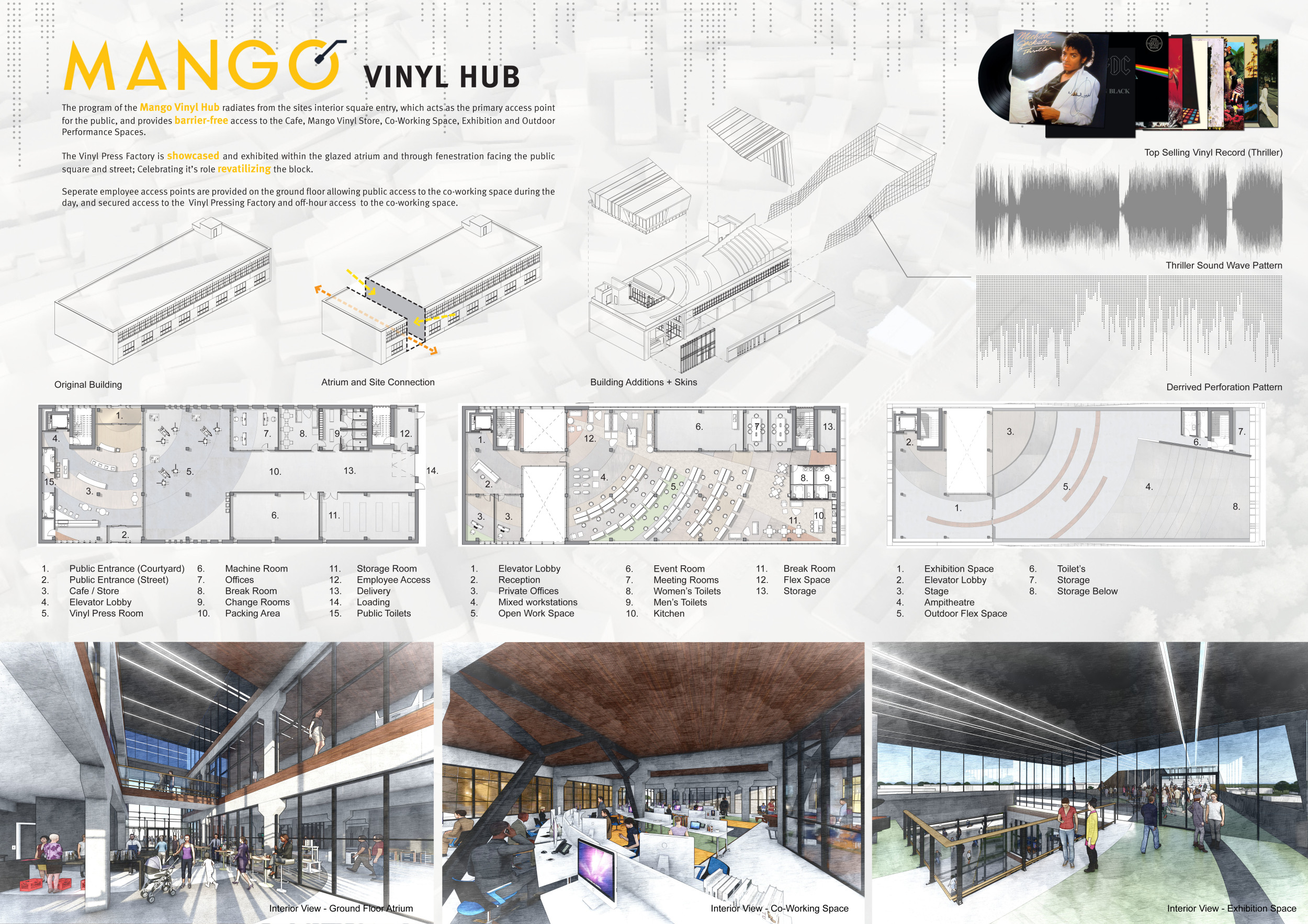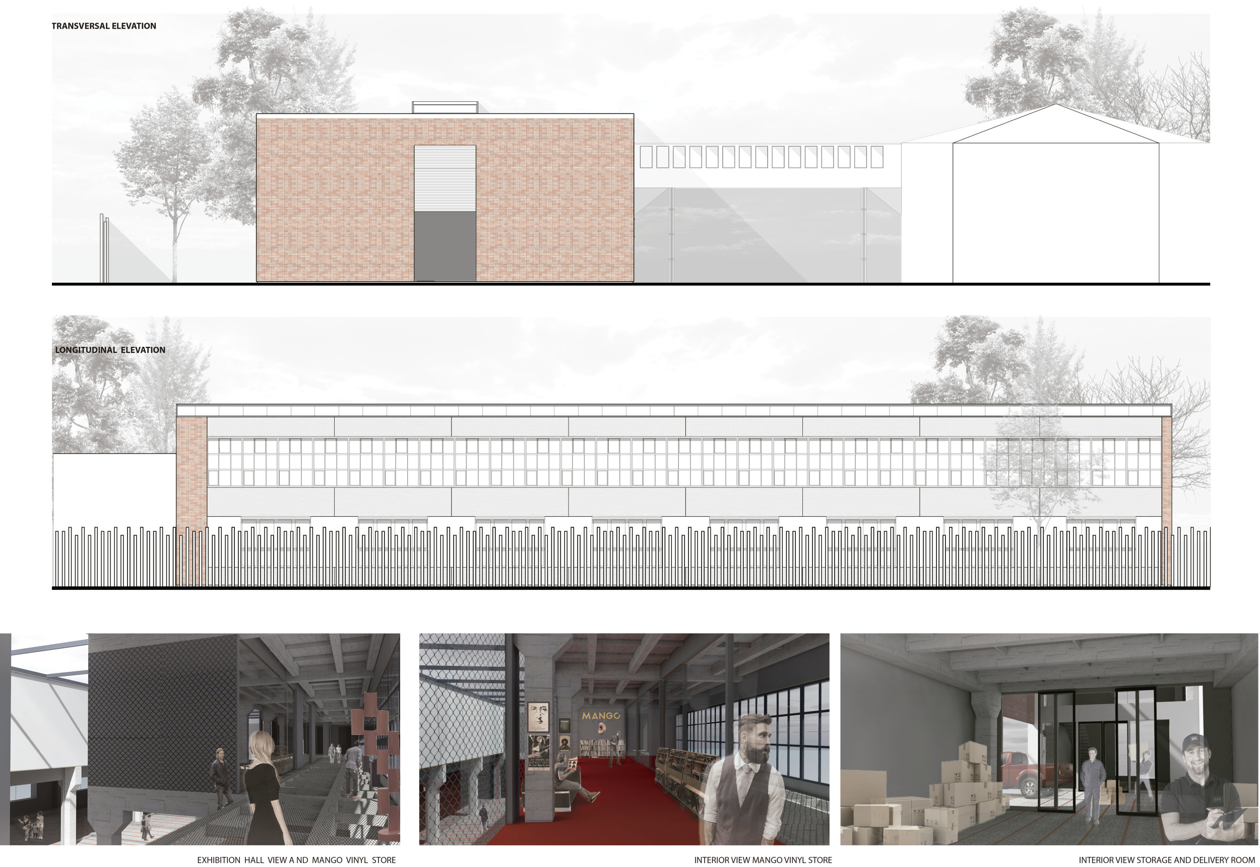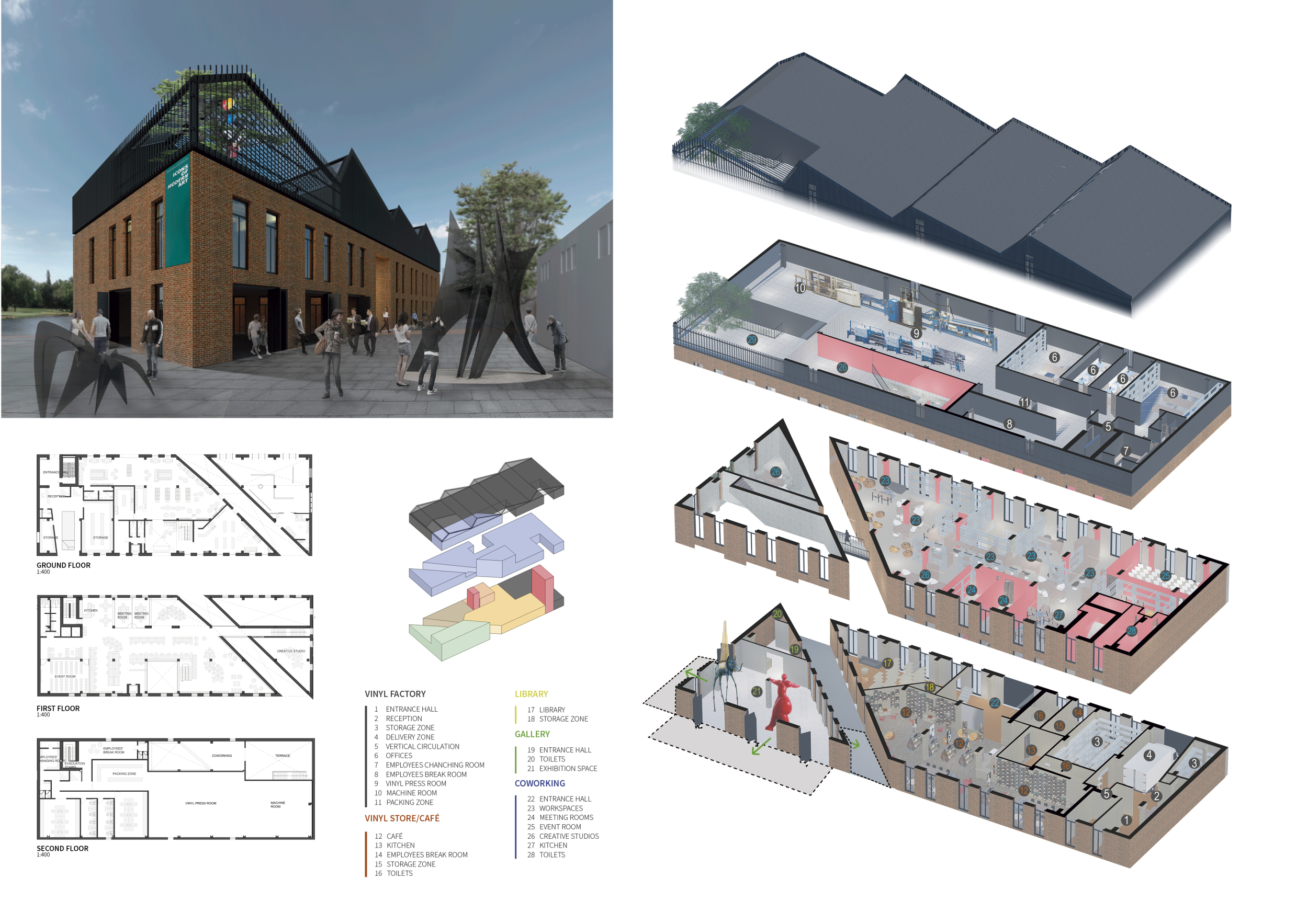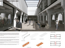 The success of the second place proposal for the Mango Vinyl Hub lies in its delineation and layering of new borders and boundaries within the structure of the existing tin foil factory to radically expose the extant industrial fabric while reviving its spaces and textures for the creative production of the emerging vinyl industry.