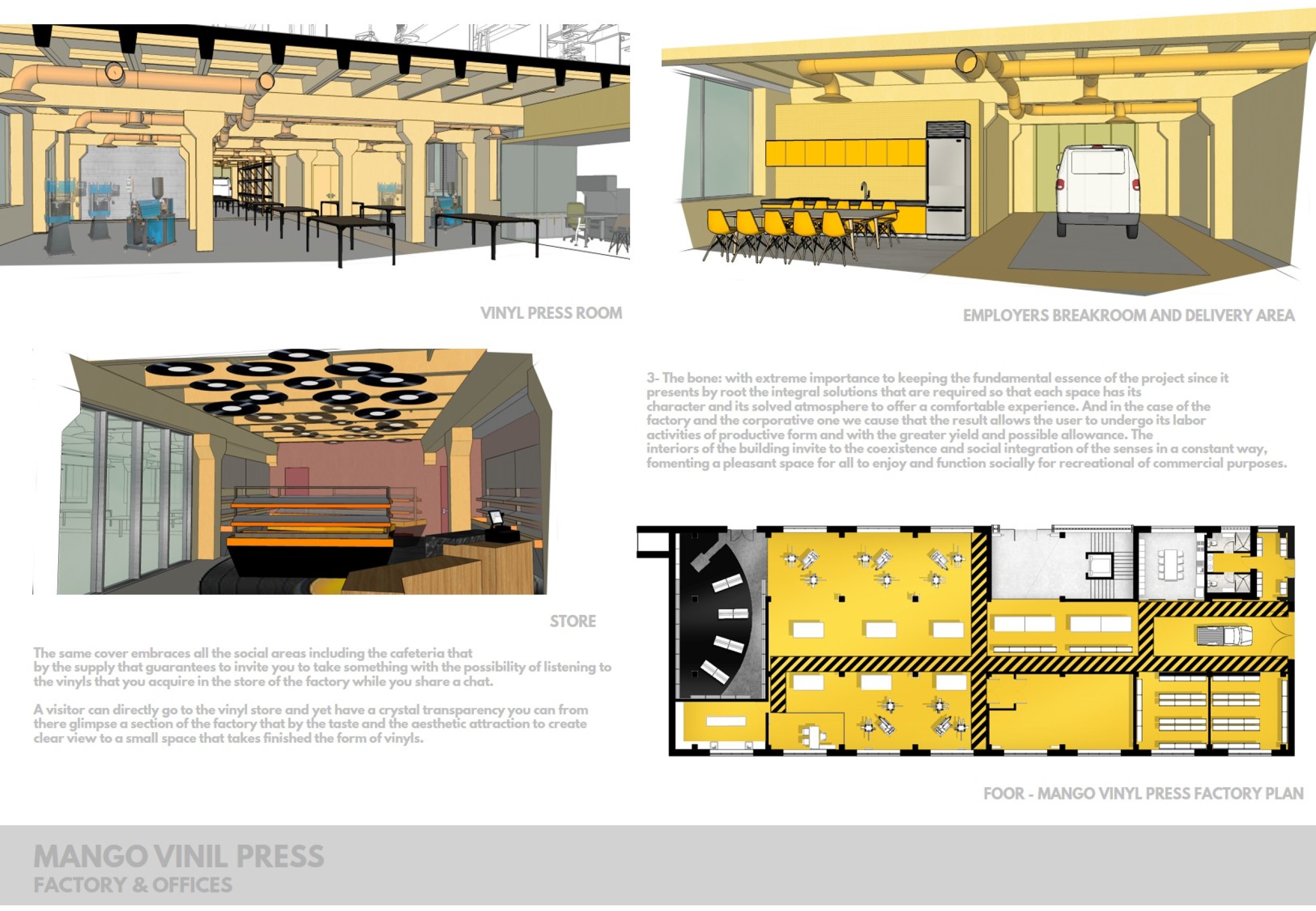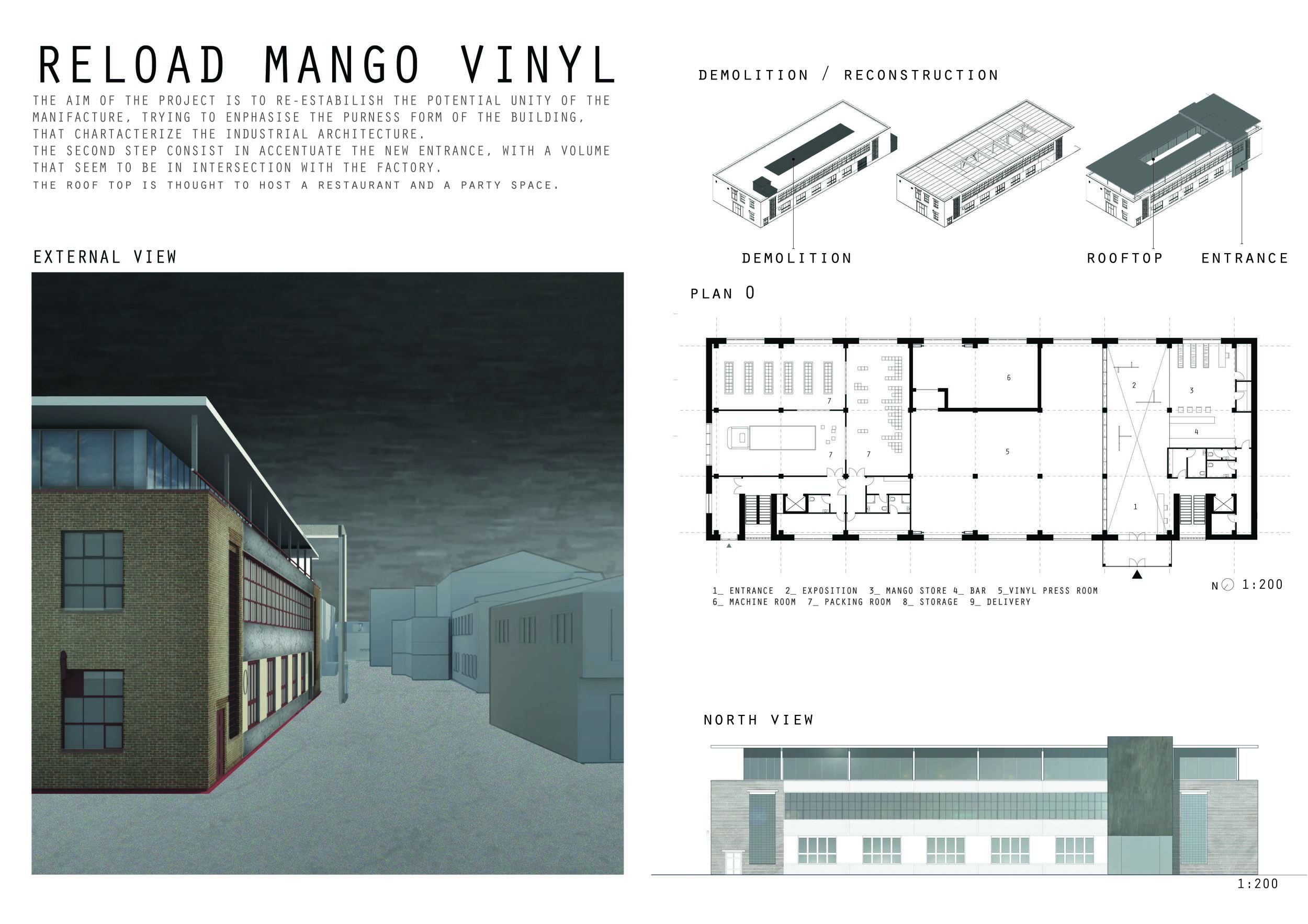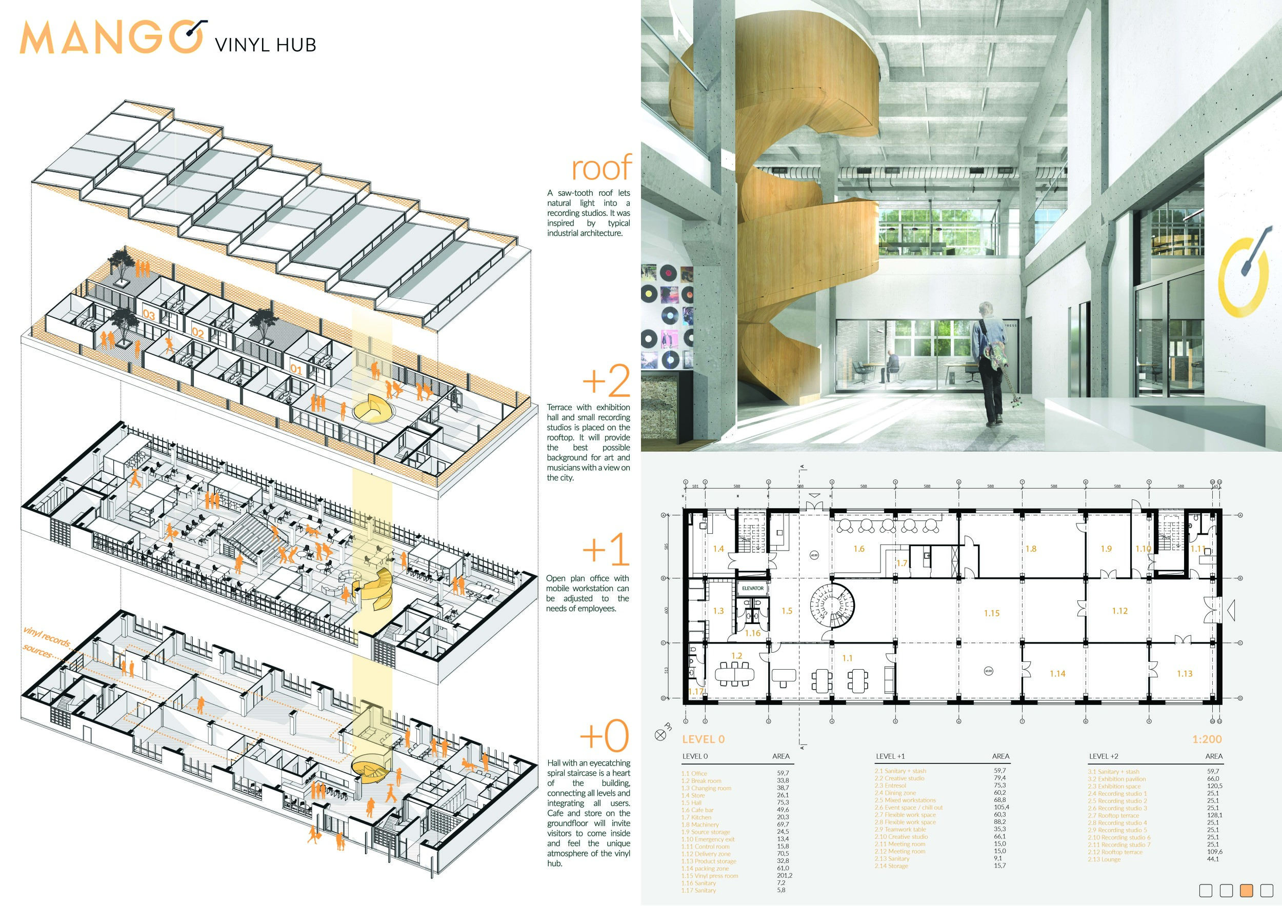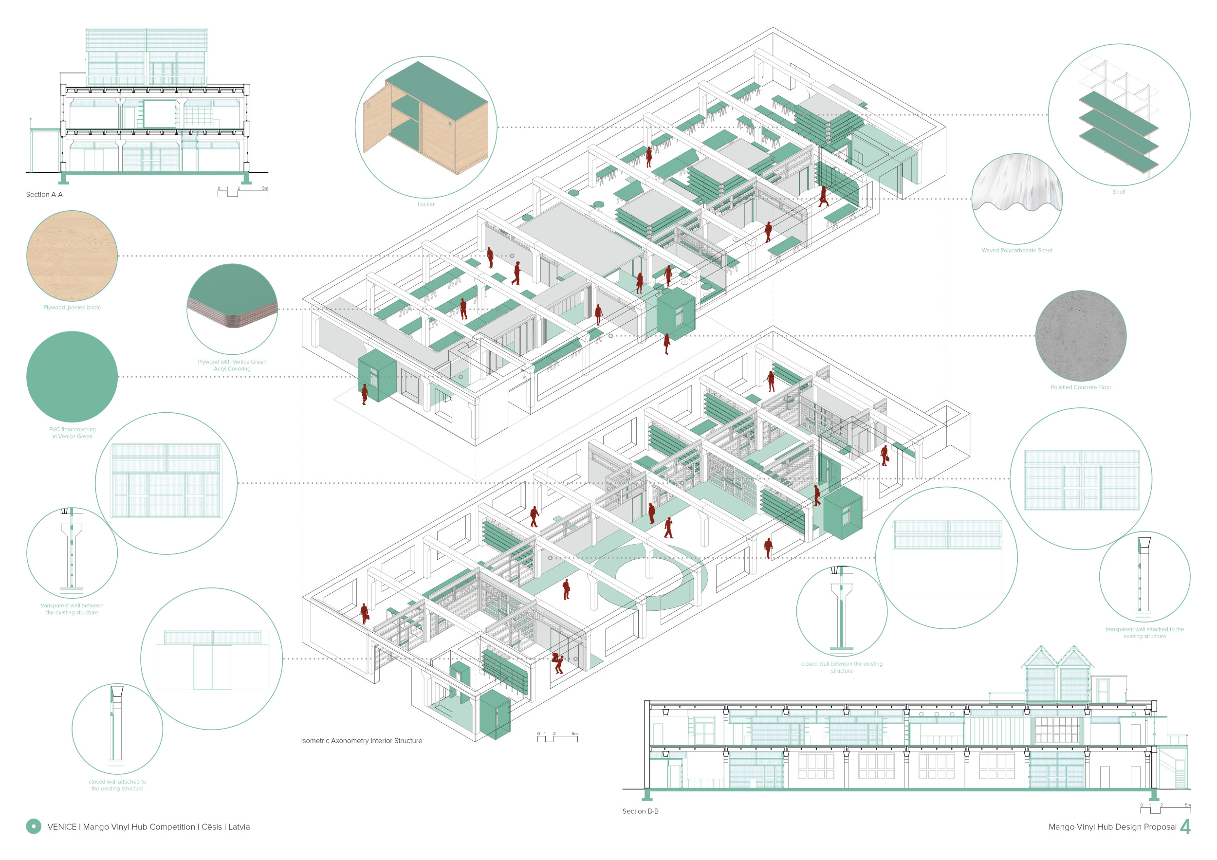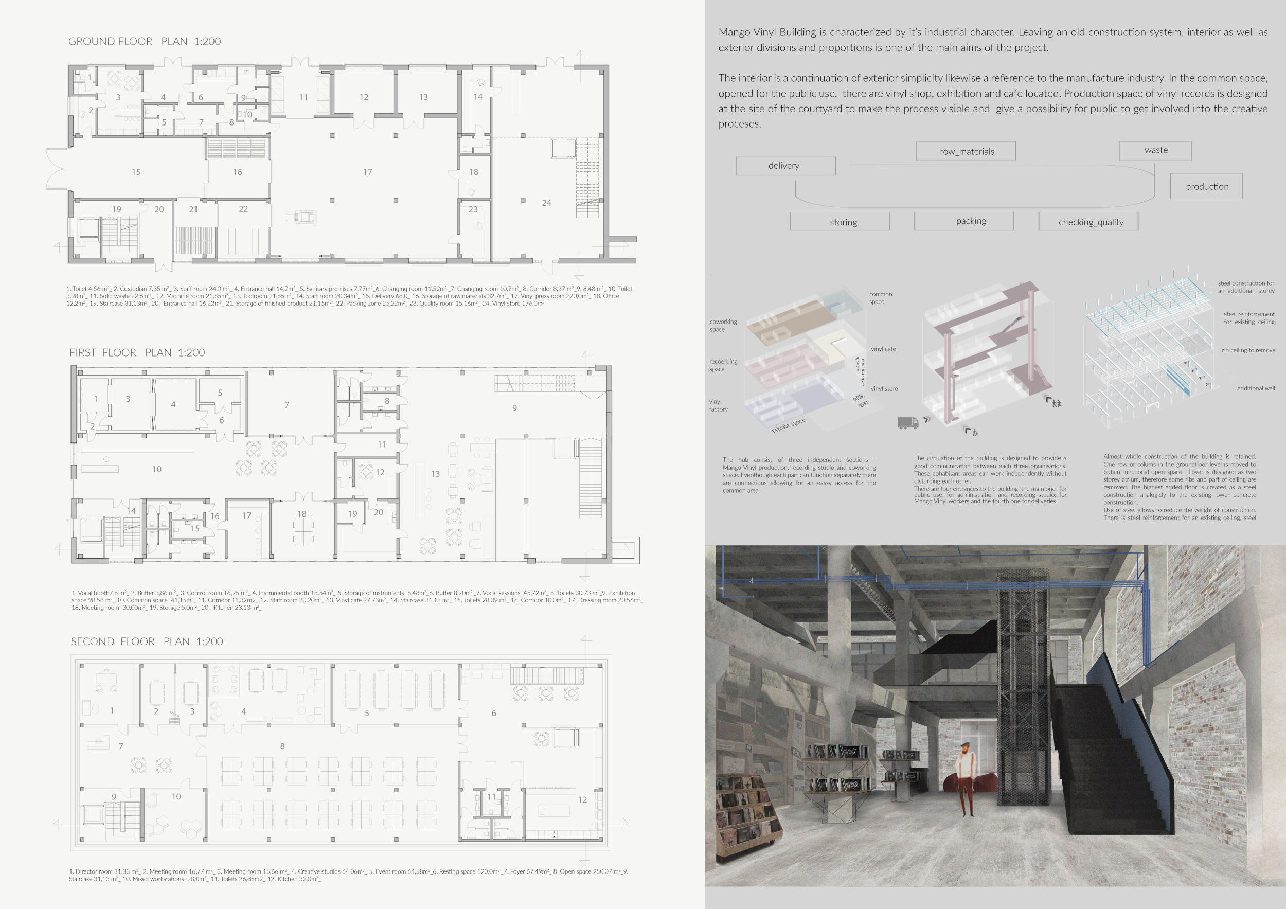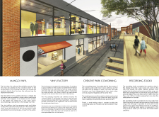 The success of the second place proposal for the Mango Vinyl Hub lies in its delineation and layering of new borders and boundaries within the structure of the existing tin foil factory to radically expose the extant industrial fabric while reviving its spaces and textures for the creative production of the emerging vinyl industry.