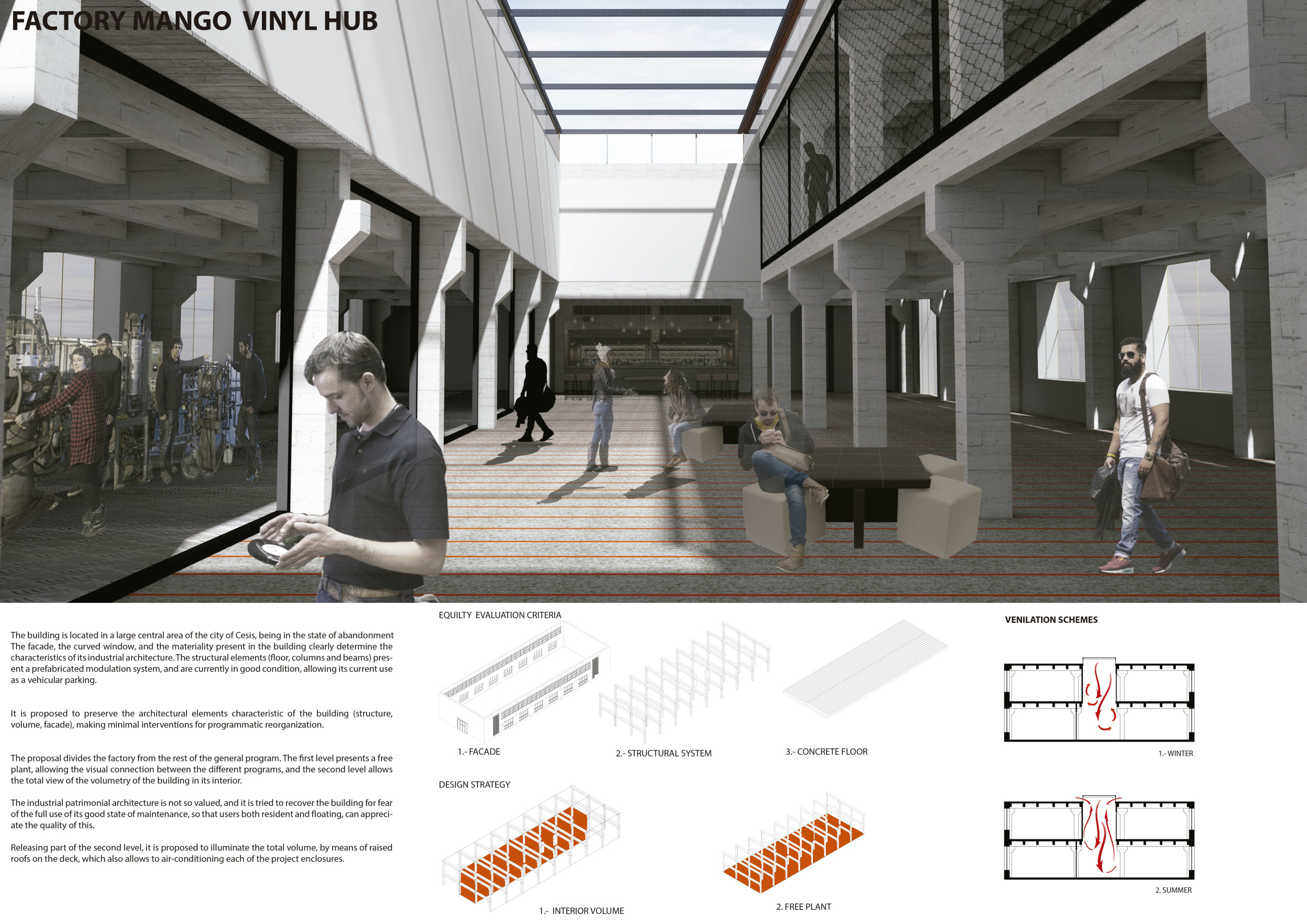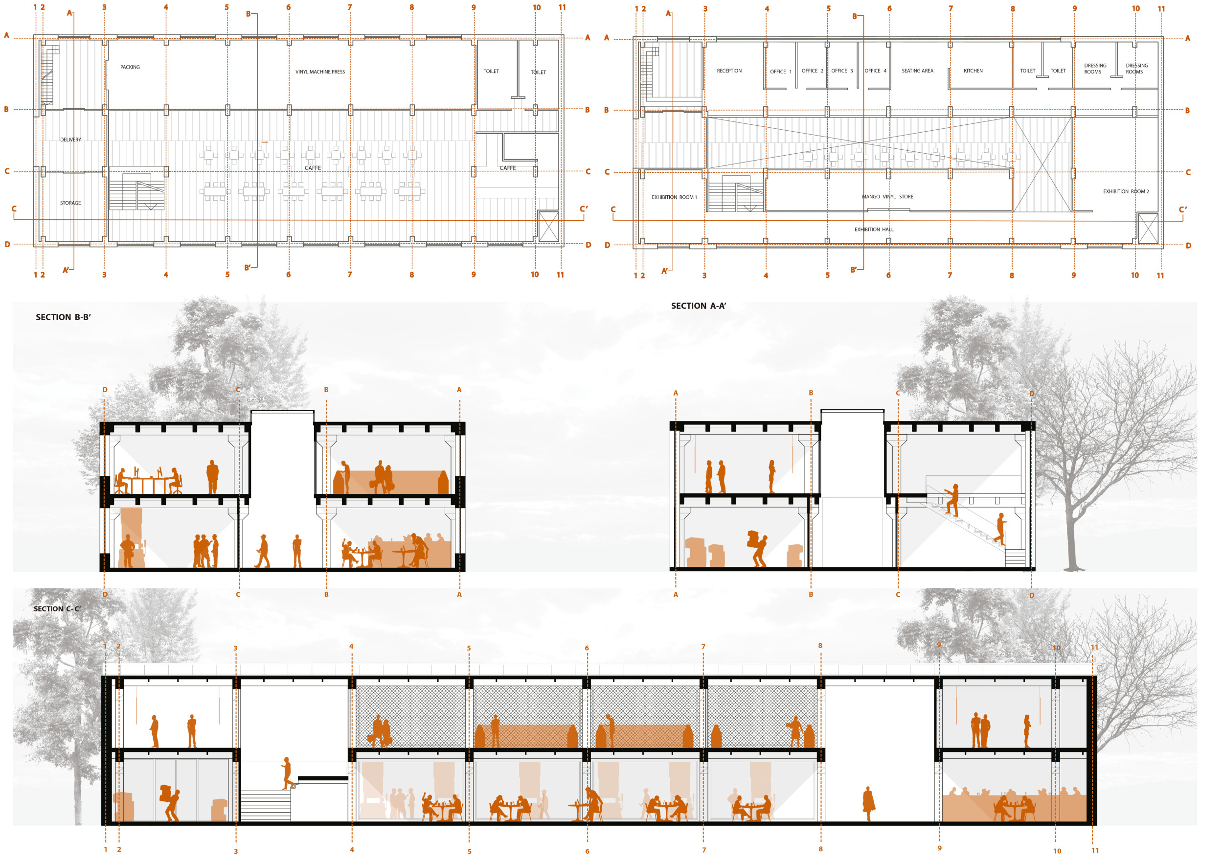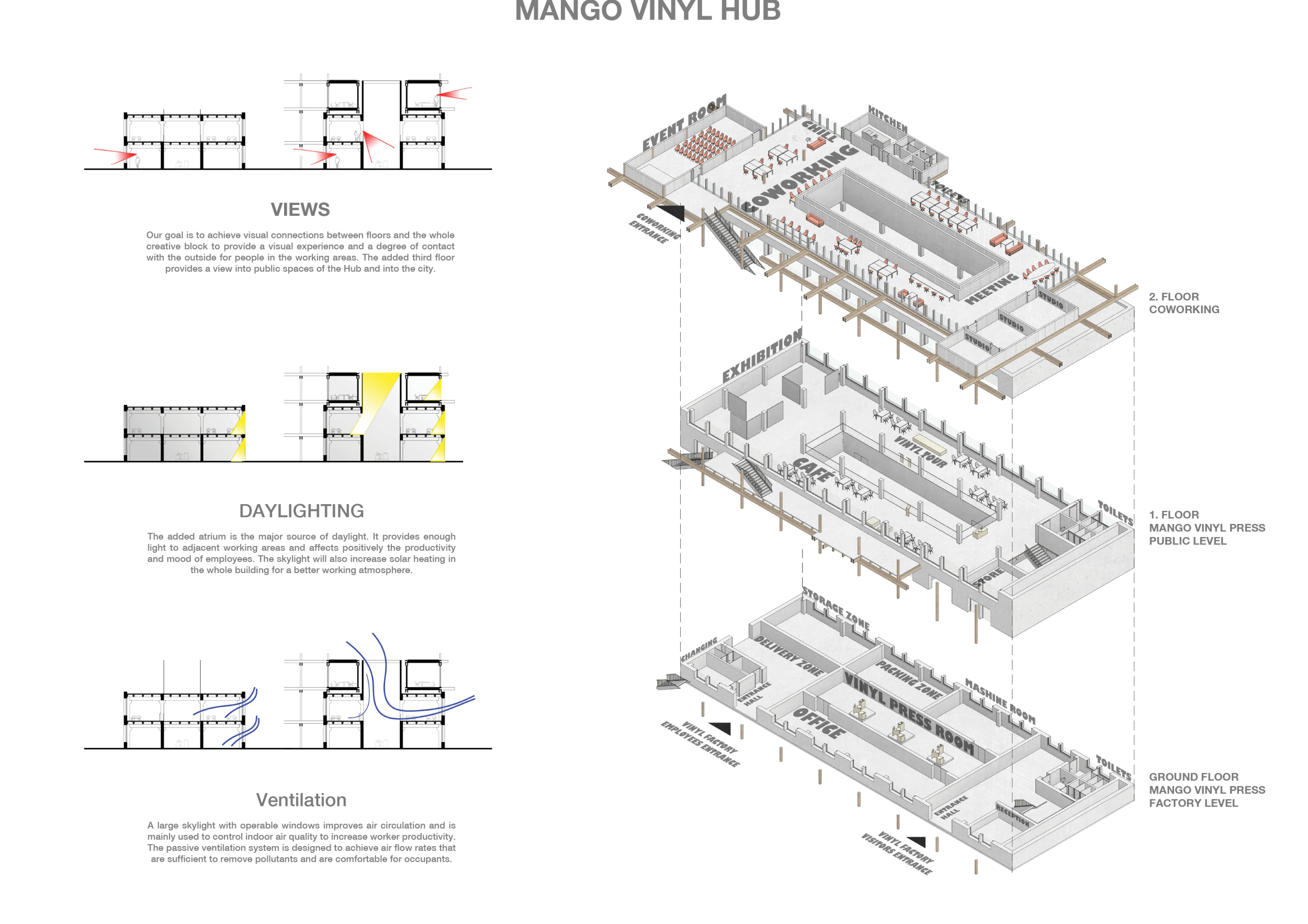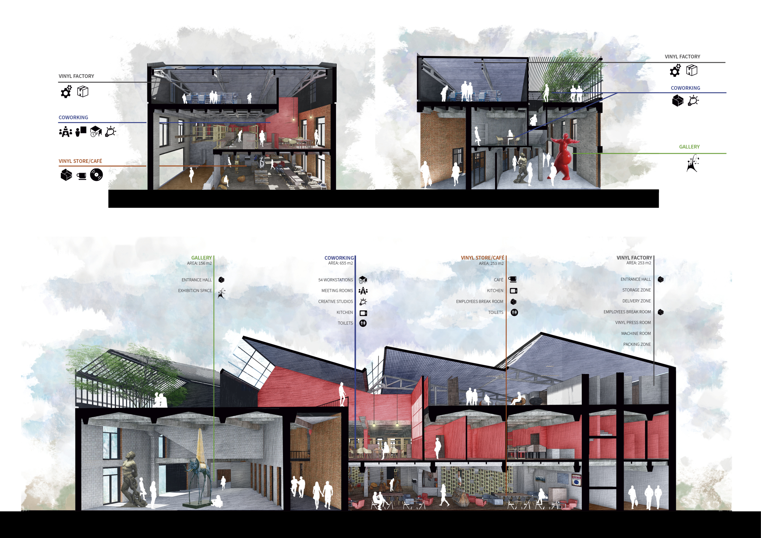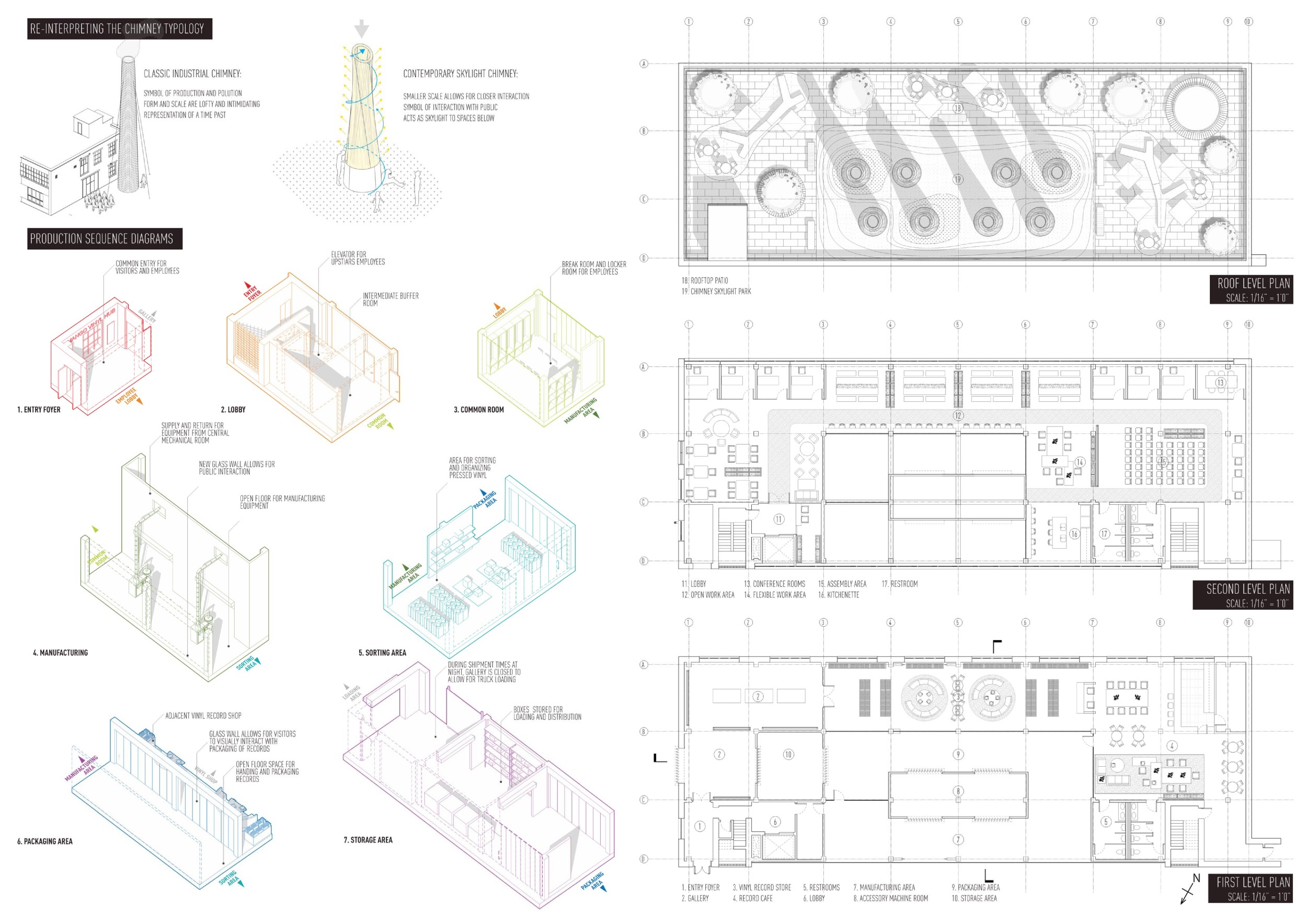 The success of the second place proposal for the Mango Vinyl Hub lies in its delineation and layering of new borders and boundaries within the structure of the existing tin foil factory to radically expose the extant industrial fabric while reviving its spaces and textures for the creative production of the emerging vinyl industry.
