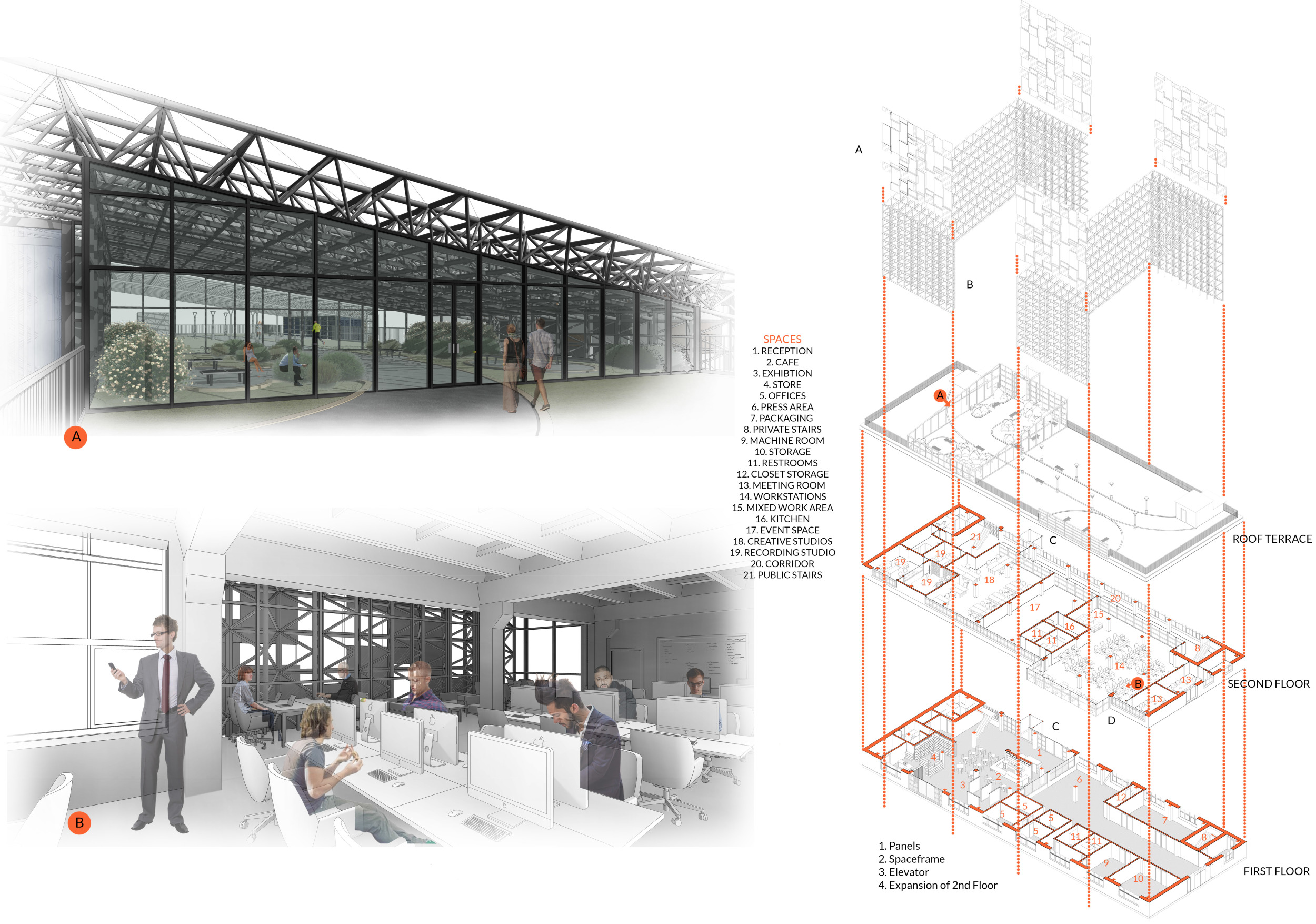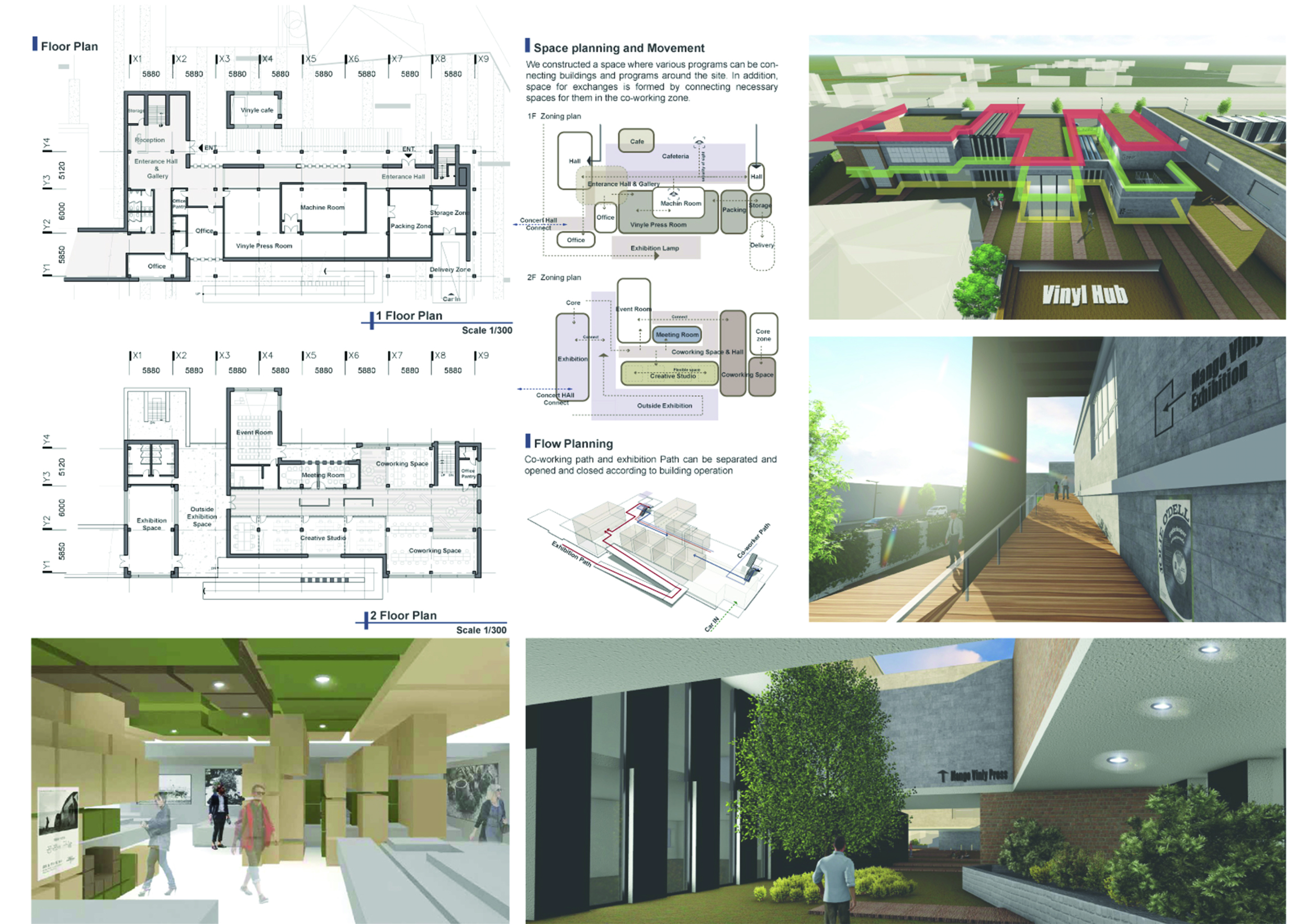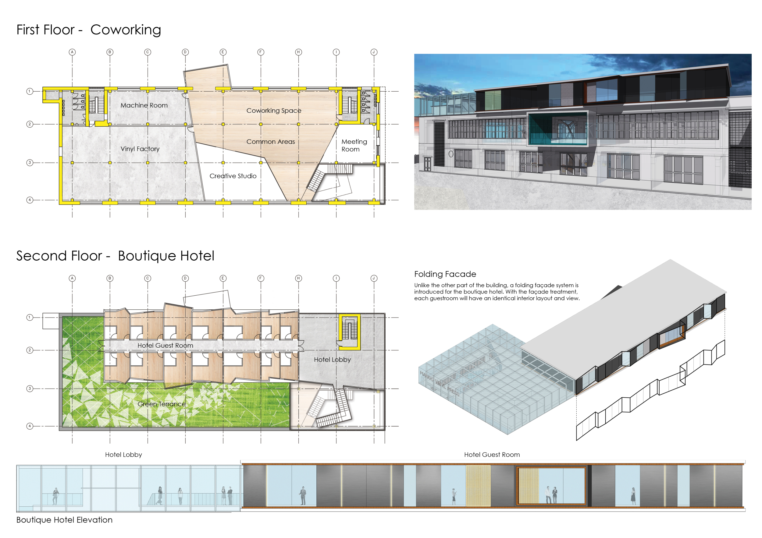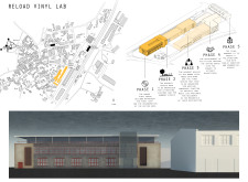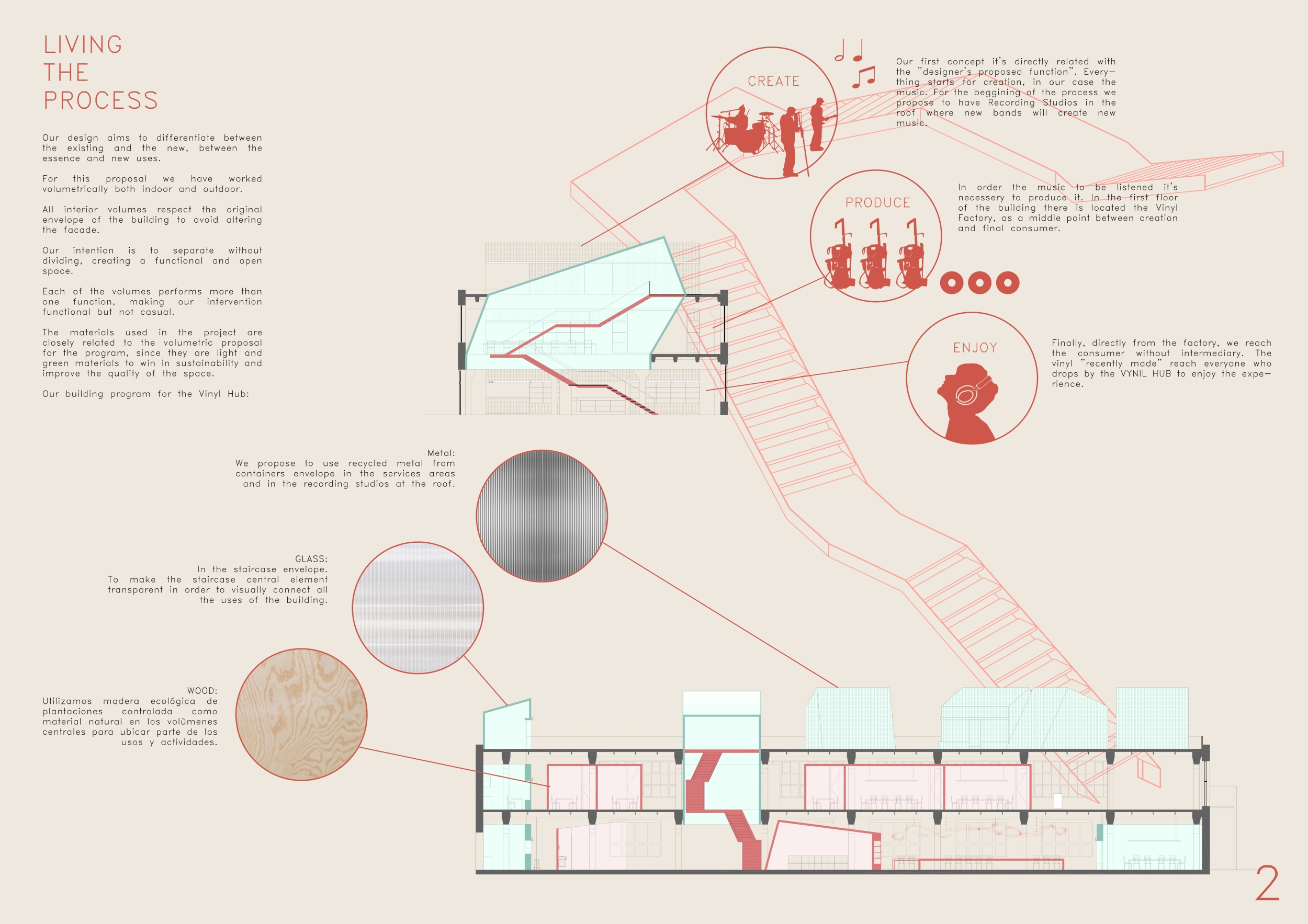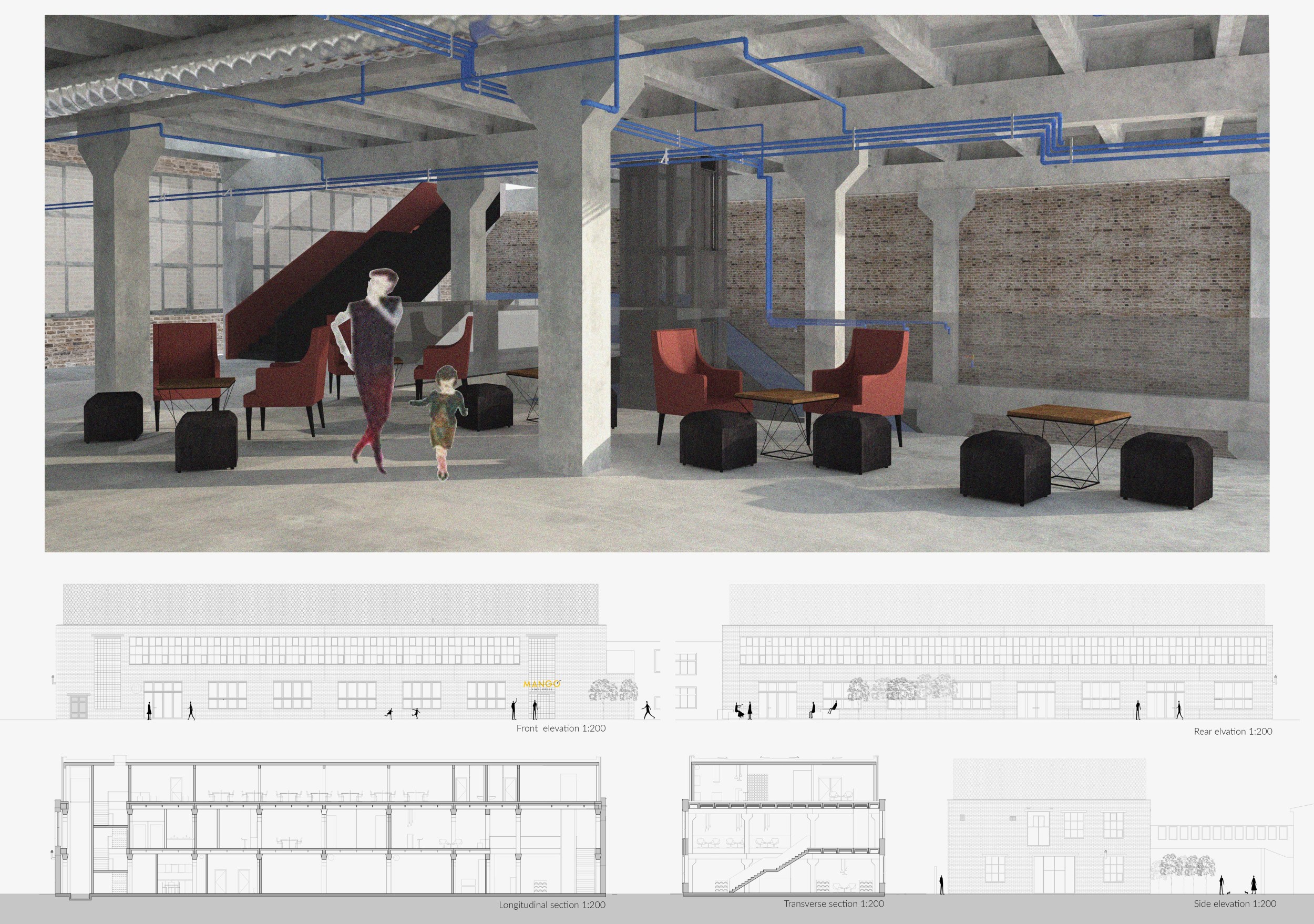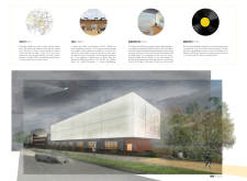 The success of the second place proposal for the Mango Vinyl Hub lies in its delineation and layering of new borders and boundaries within the structure of the existing tin foil factory to radically expose the extant industrial fabric while reviving its spaces and textures for the creative production of the emerging vinyl industry.