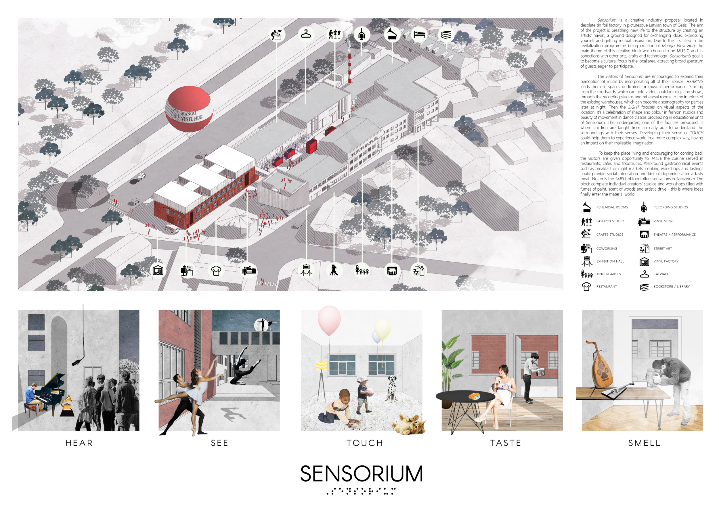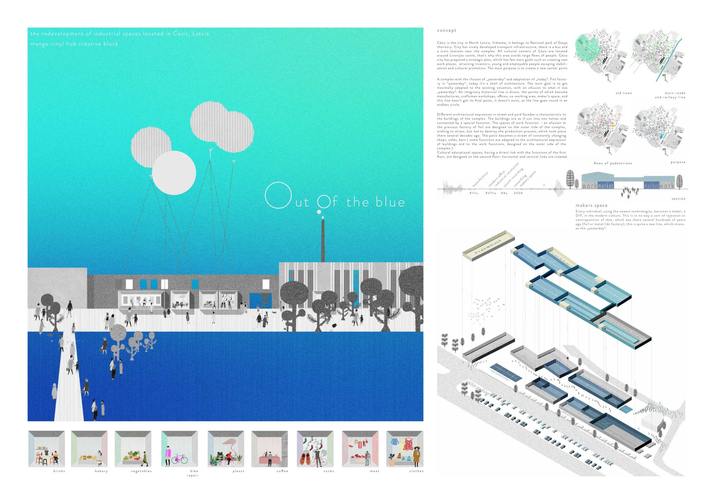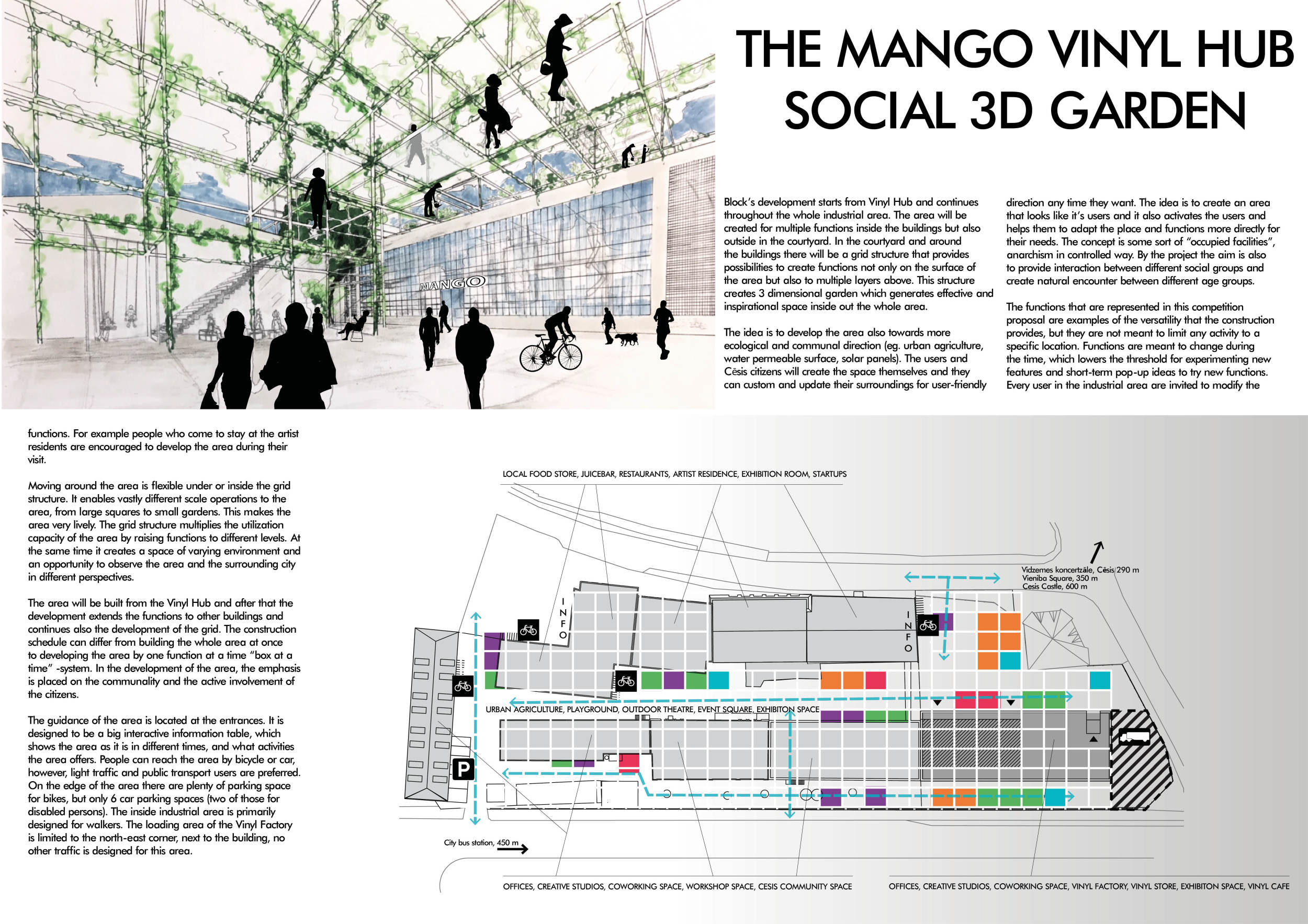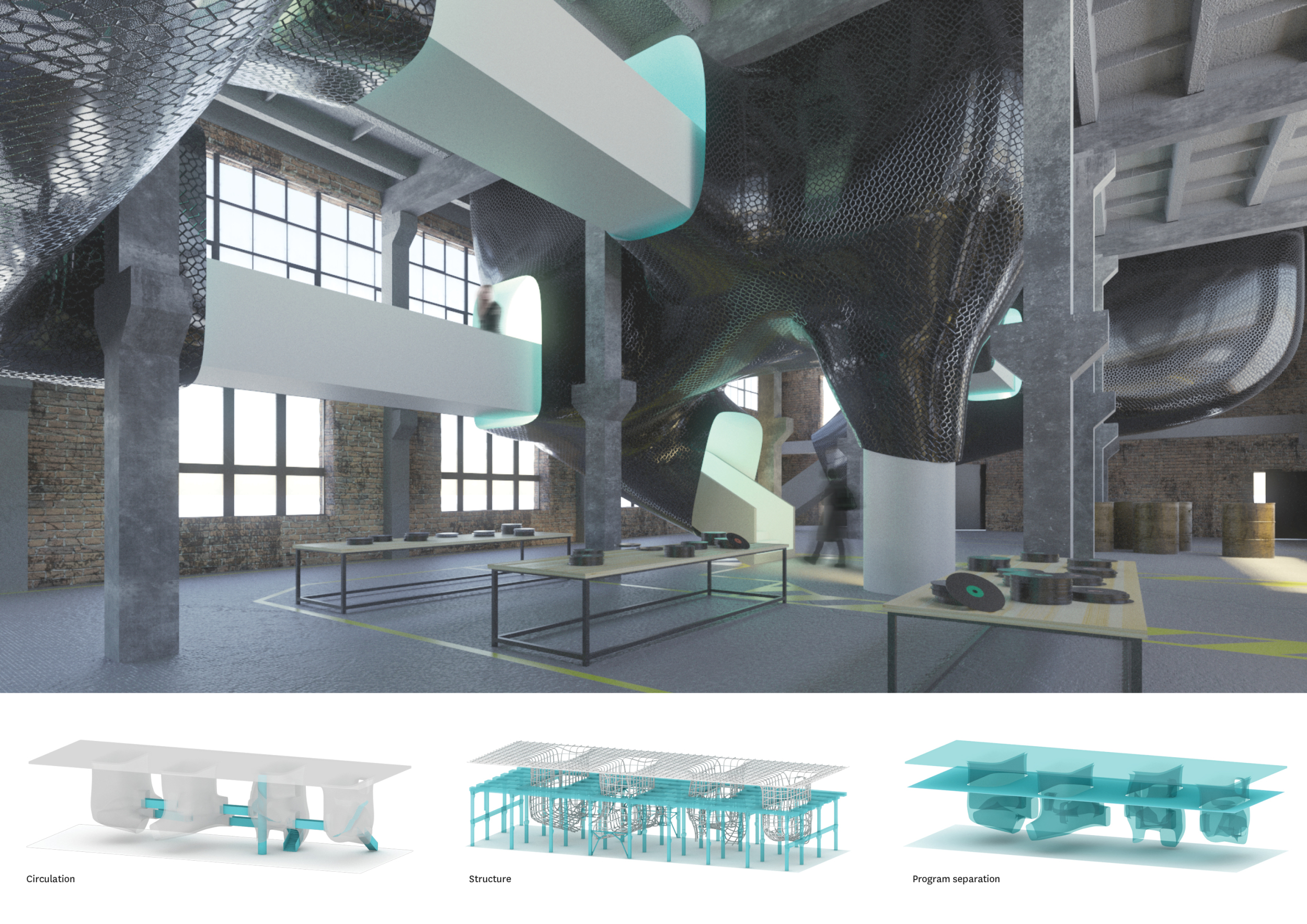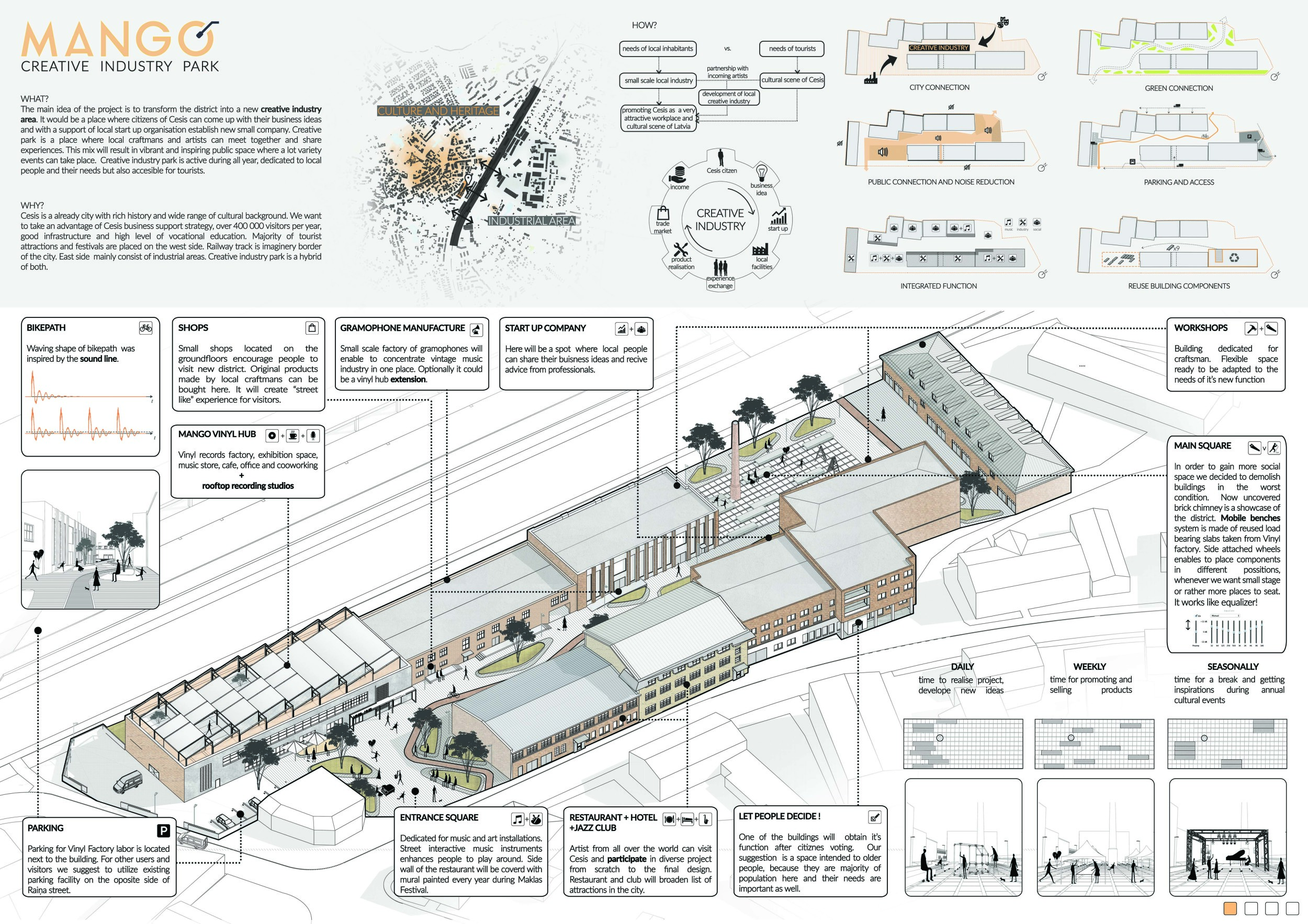 The first place proposal for the Mango Vinyl Hub sets itself apart by developing a restoratively sensitive architectural critique of the industrial work culture, transforming the abandoned tin foil factory buildings of Cesis into a new co-working campus. The project deploys a system of colorful, almost cartoonish, transit tubes to facilitate visual and physical connection, as well as communication, amongst the disparate programmatic components of the site.