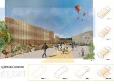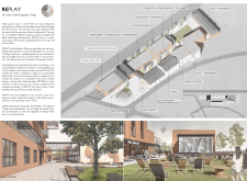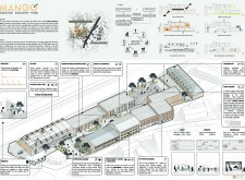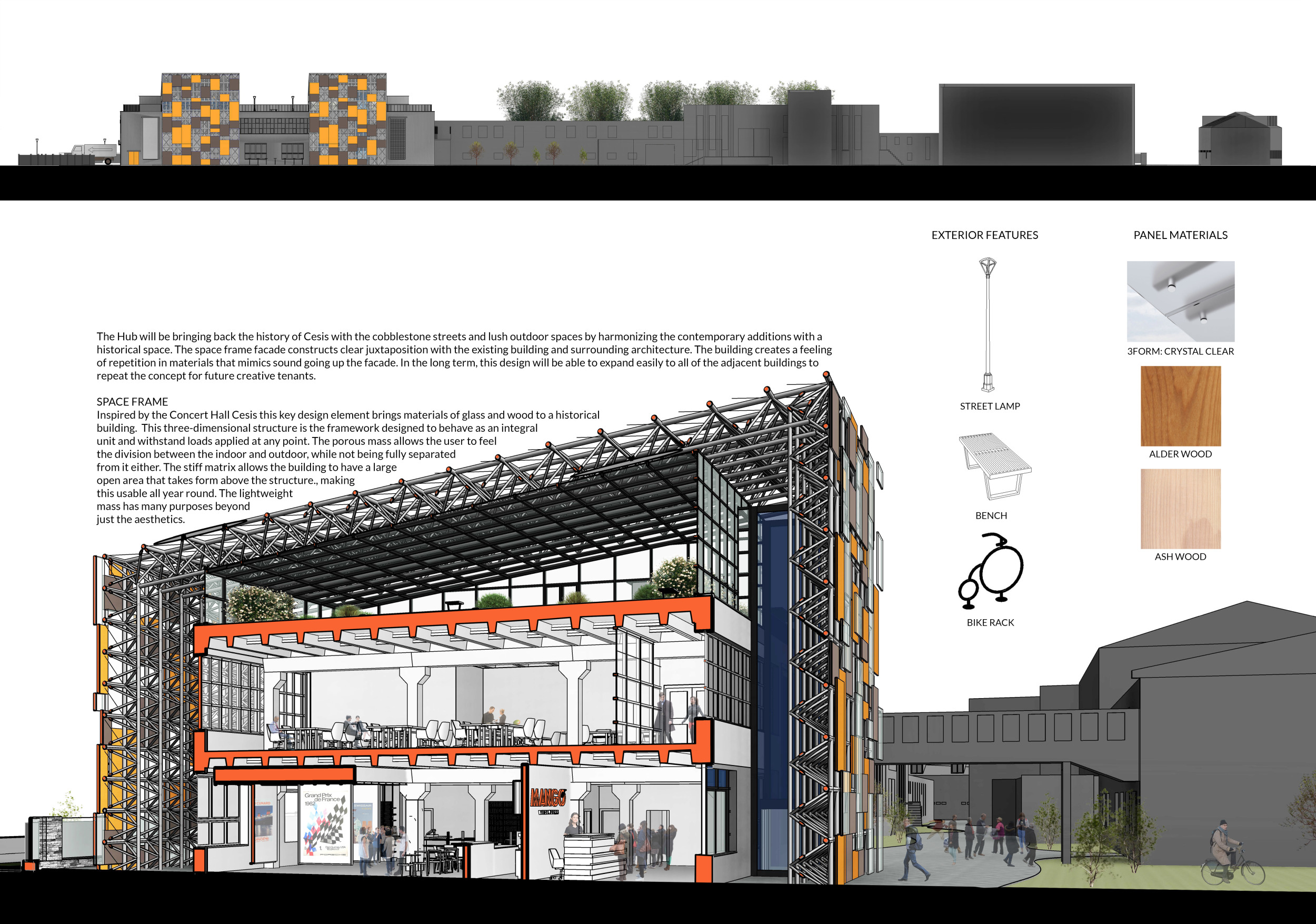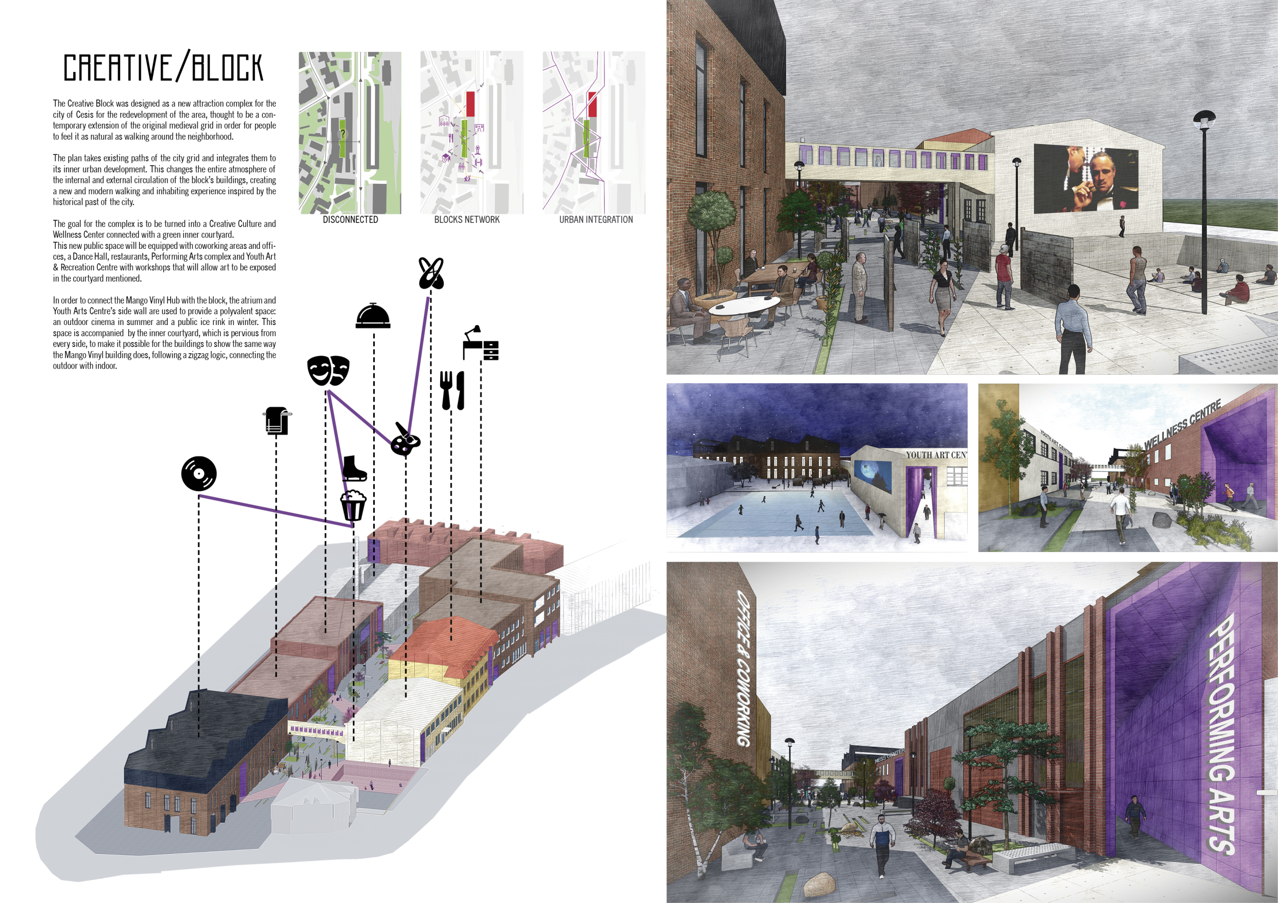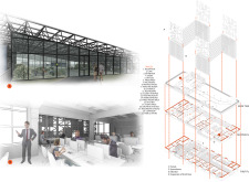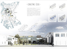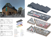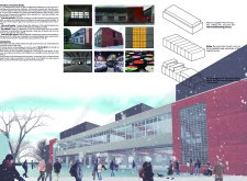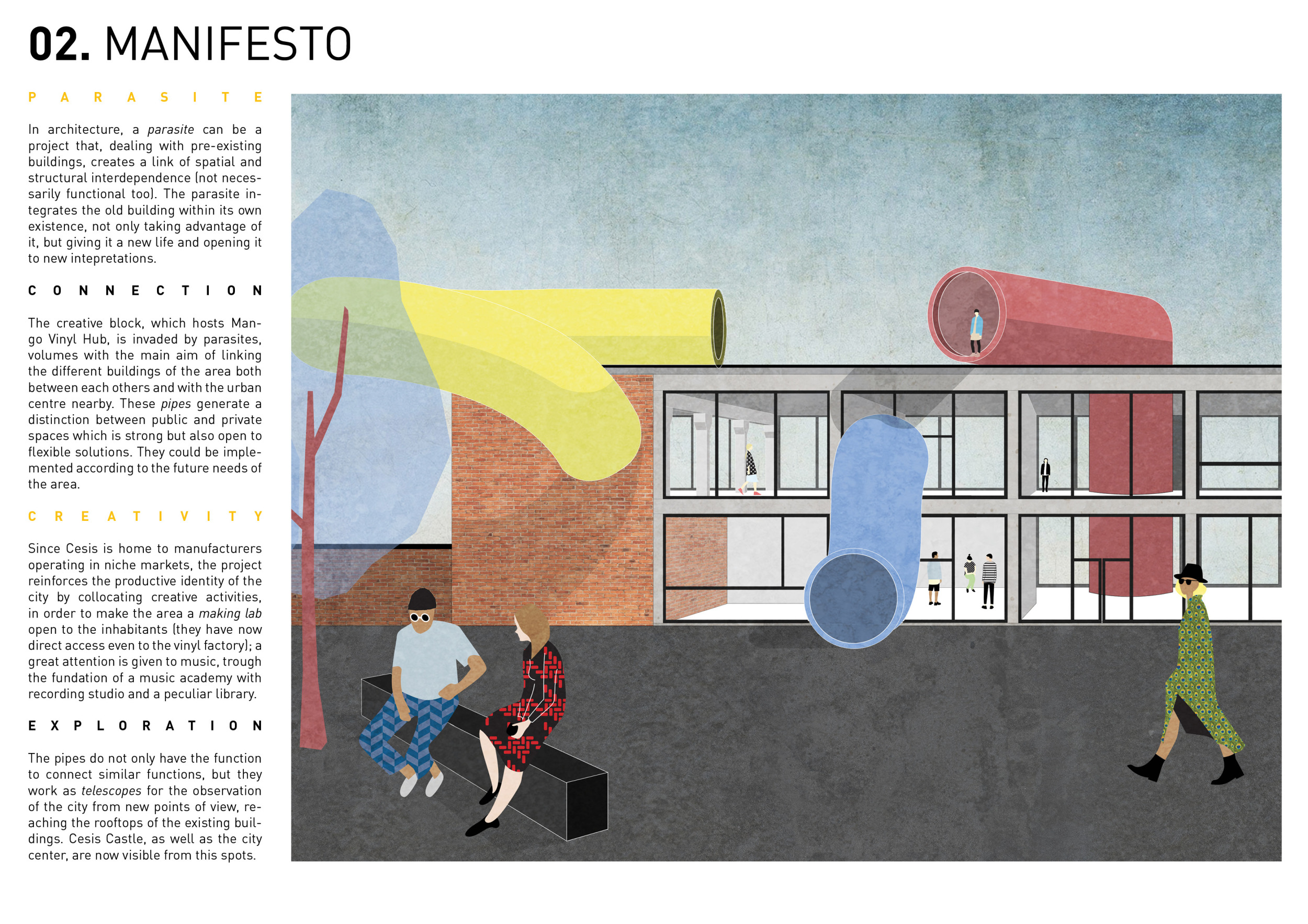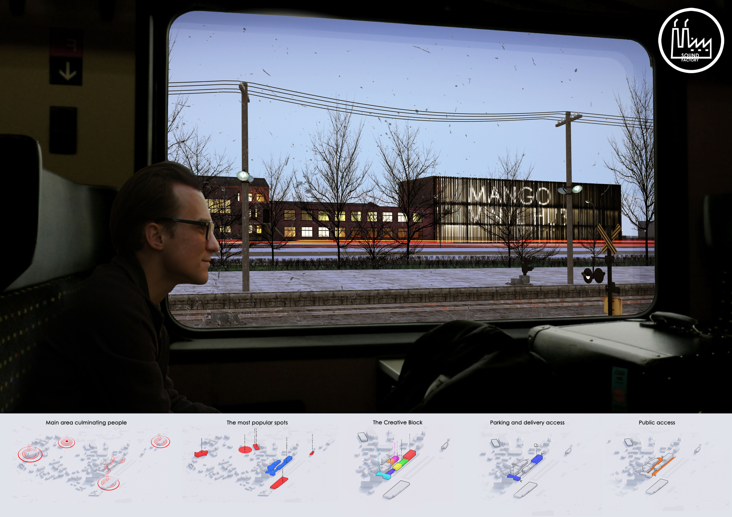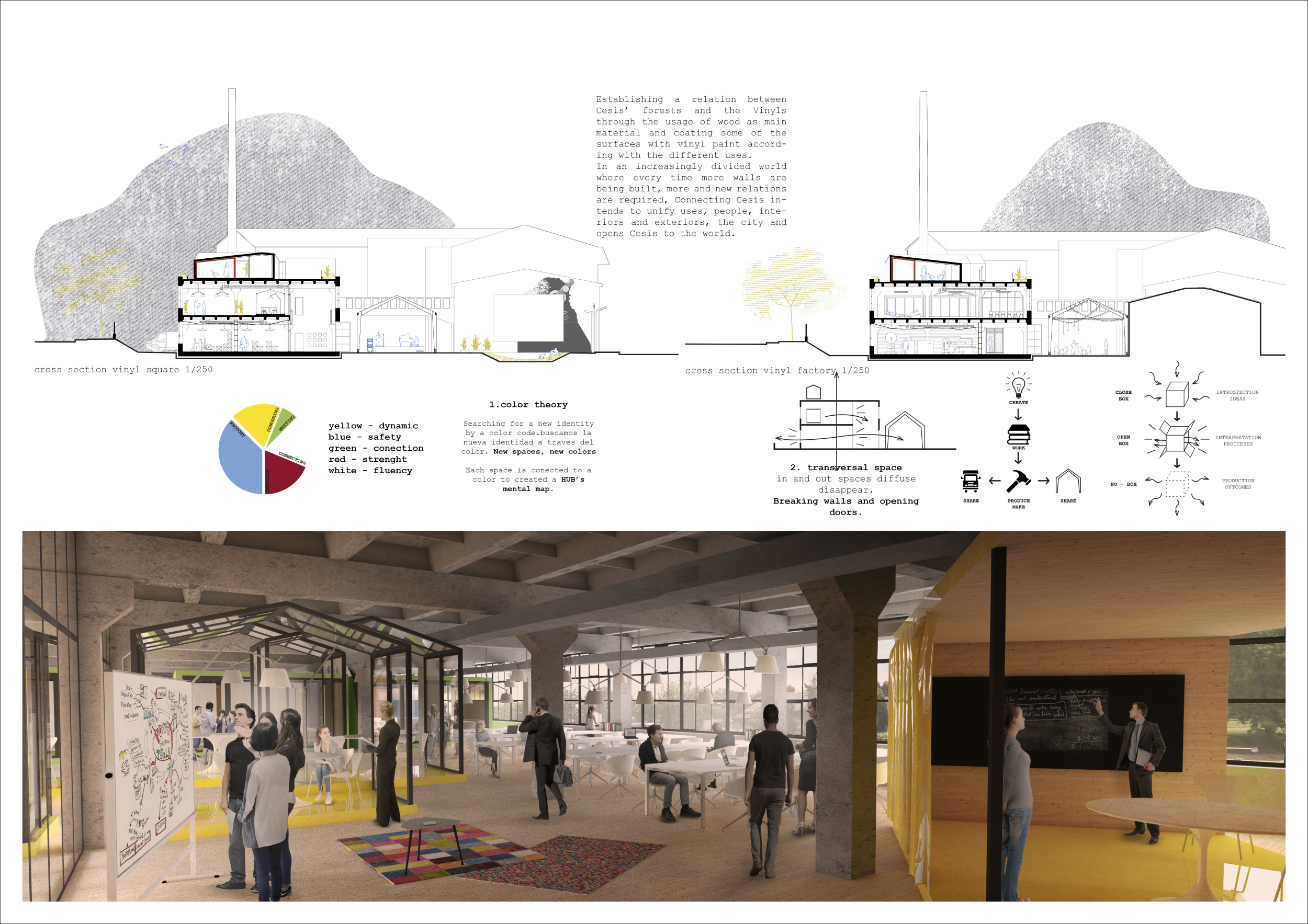 The first place proposal for the Mango Vinyl Hub sets itself apart by developing a restoratively sensitive architectural critique of the industrial work culture, transforming the abandoned tin foil factory buildings of Cesis into a new co-working campus. The project deploys a system of colorful, almost cartoonish, transit tubes to facilitate visual and physical connection, as well as communication, amongst the disparate programmatic components of the site.