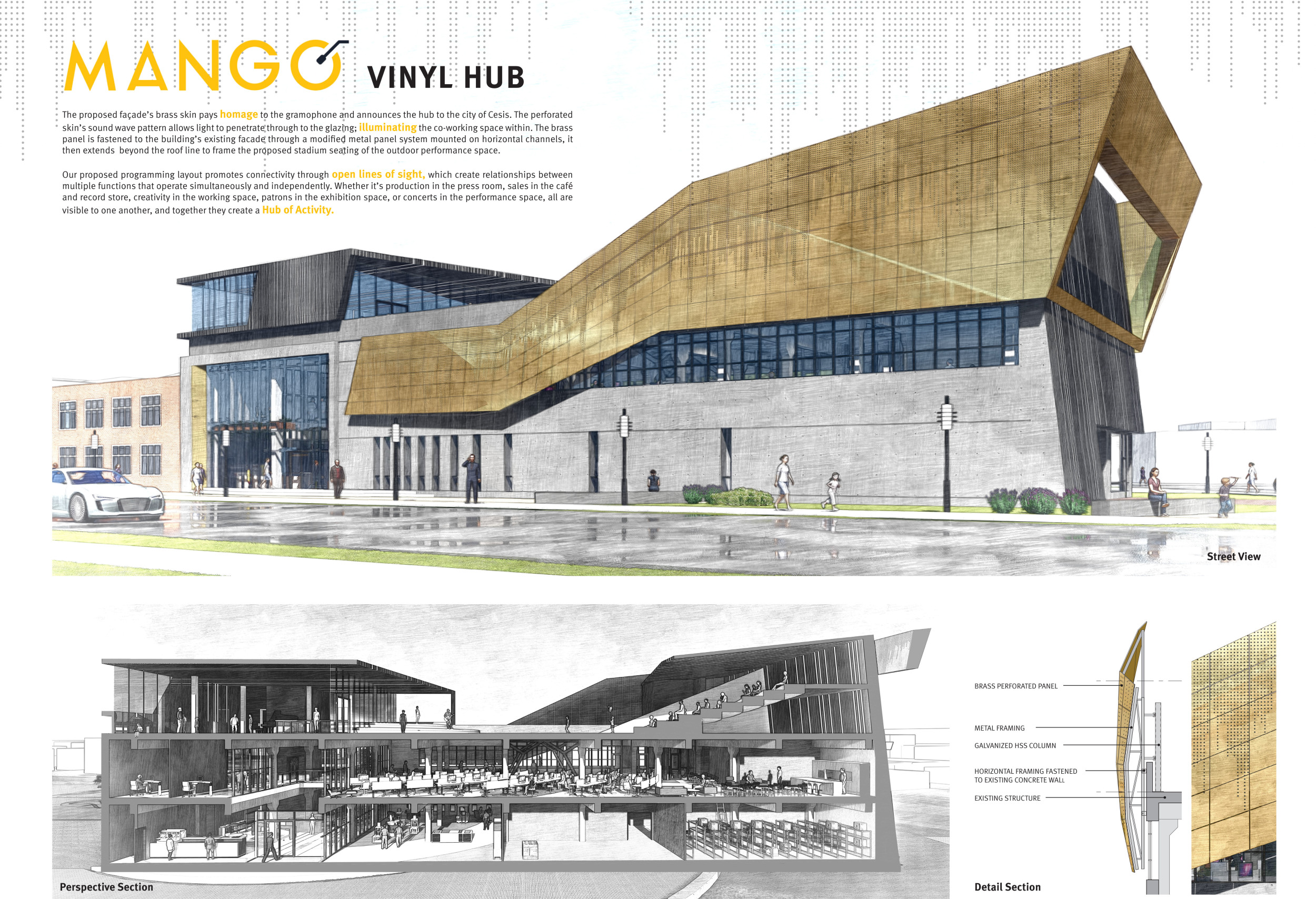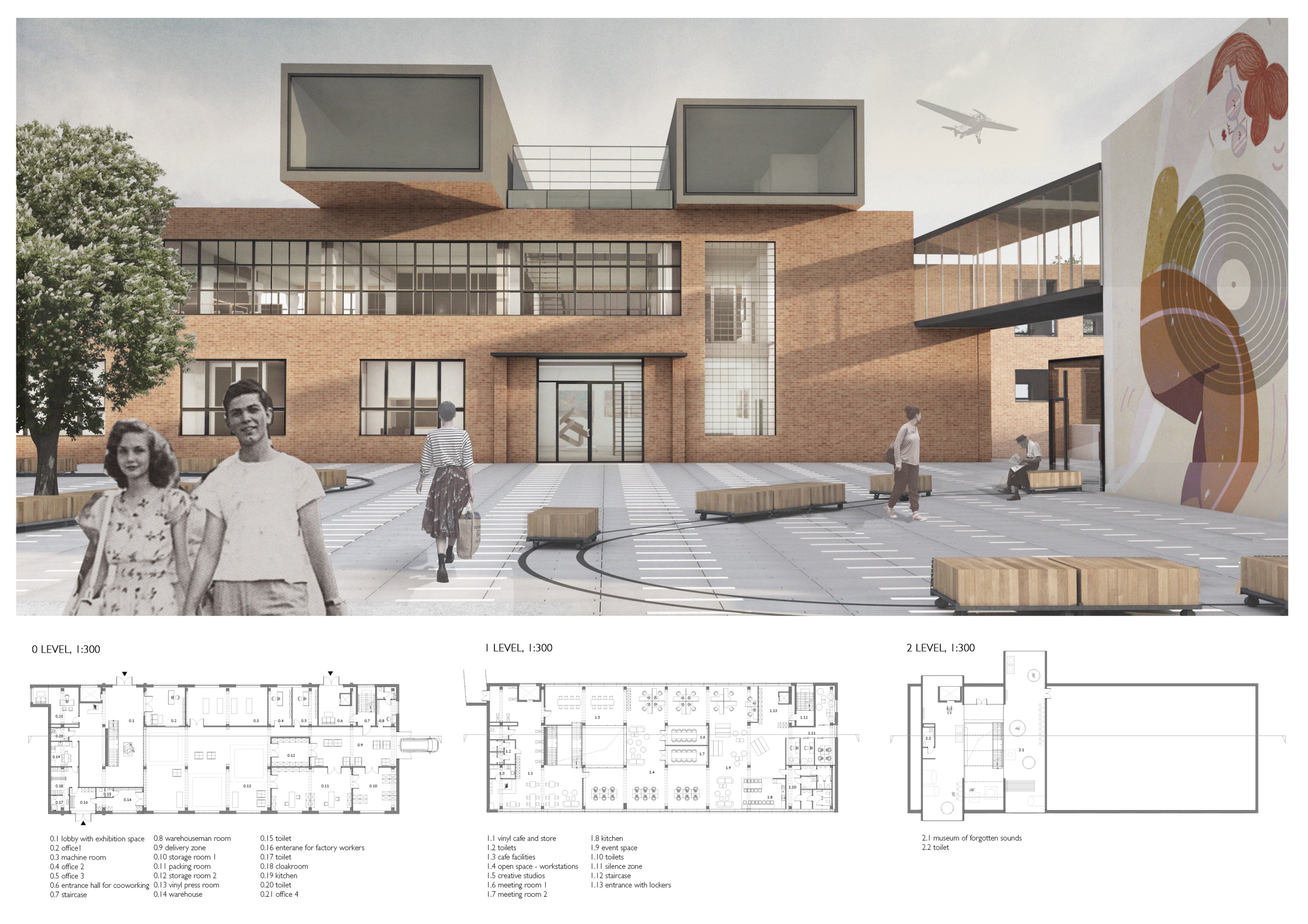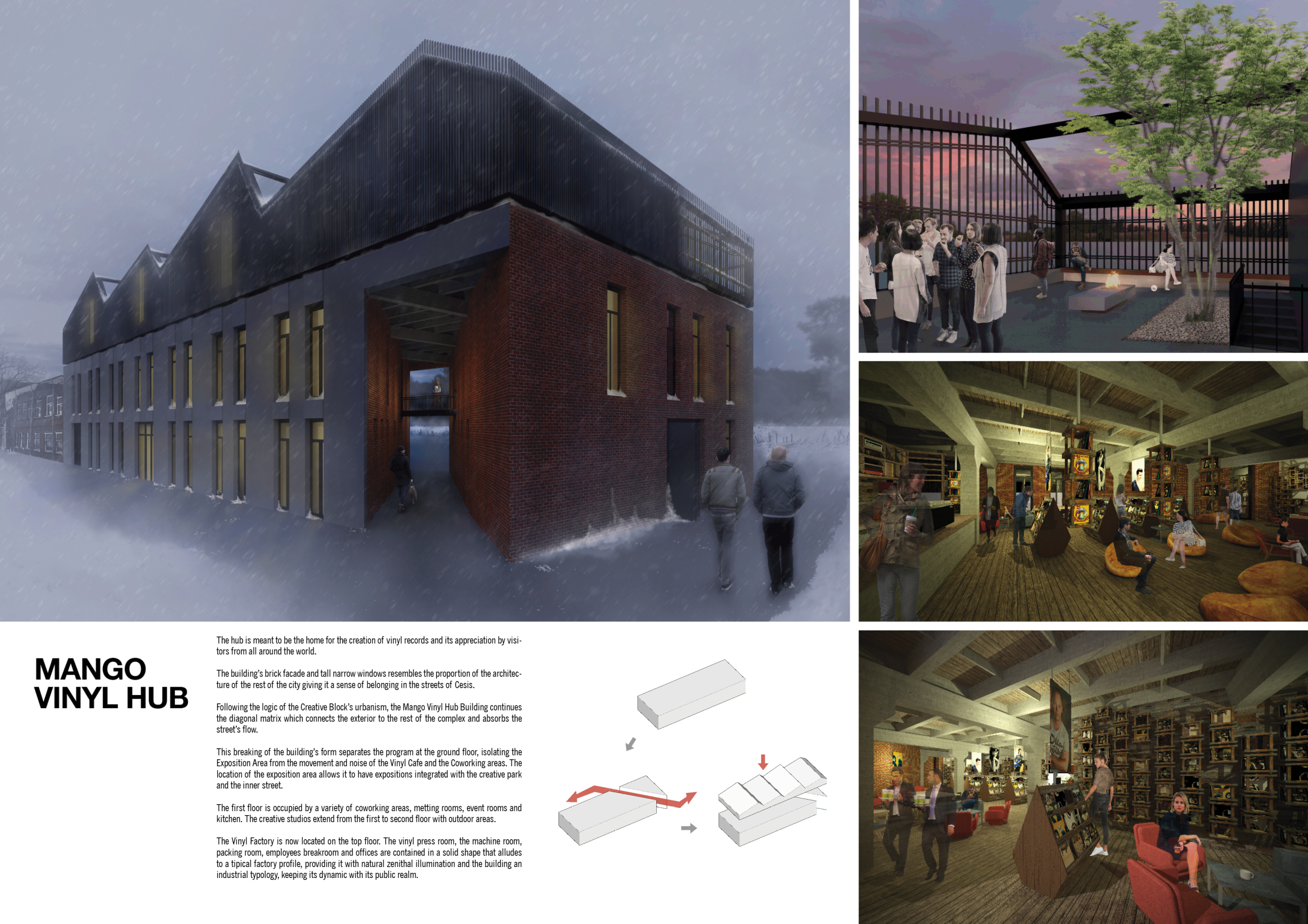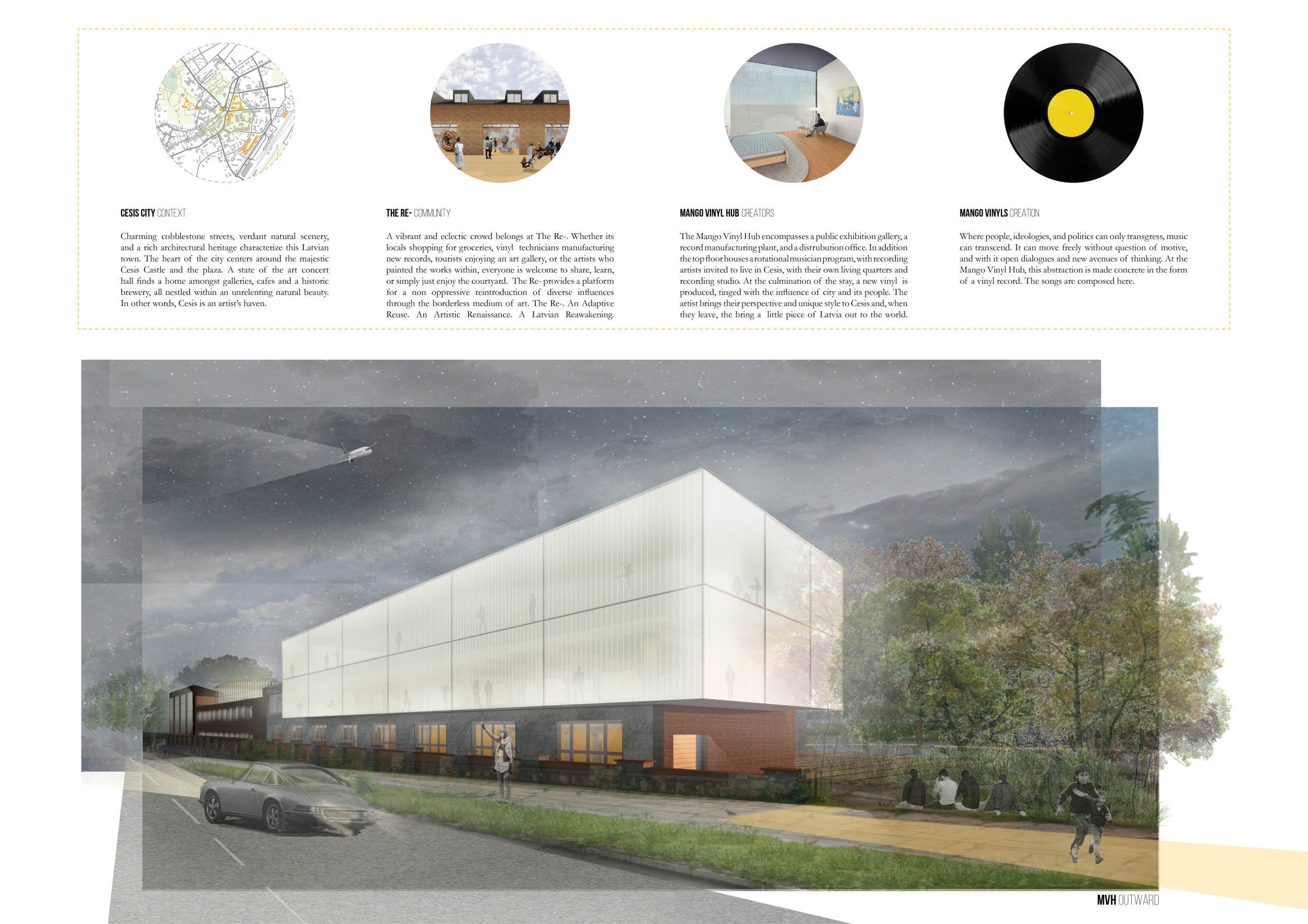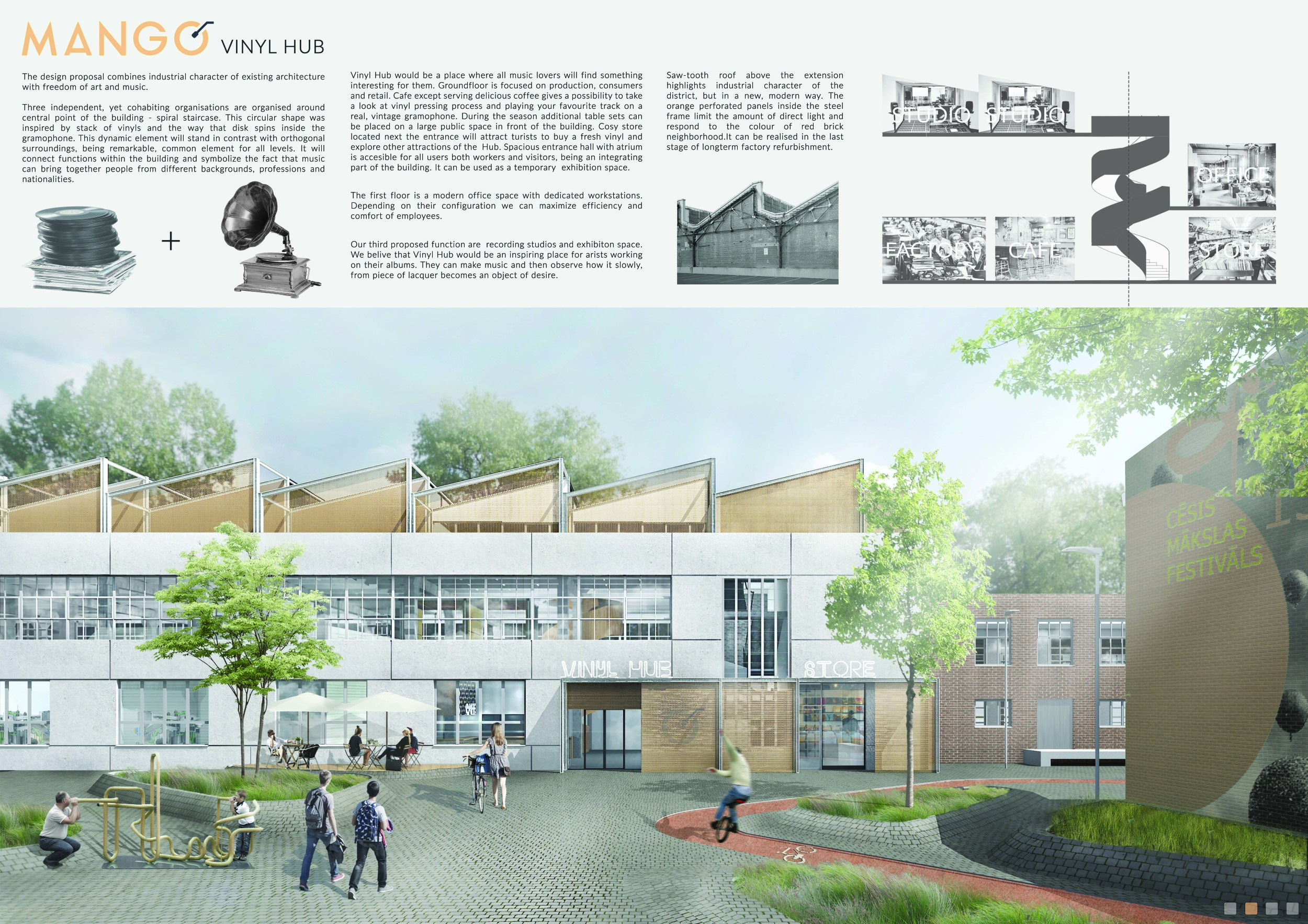 The Mango Vinyl Hub competition solicits consideration of a familiar circumstance characteristic of the contemporary regional condition. Located in Cesis, a historic and provincial city in the Vidzeme region of Latvia, the project calls into question possible and imagined futures of recent historic and artifactual culture — of architecture, music, industry, and design. Participating in the materializing creative industry of Cesis, the project invites designers to consider the adaptive reuse of an abandoned tin foil factory in promotion of a resurgent interest in the vinyl record industry. The project aptly repurposes an architecture arising from the exigency of early industrial production in support of a programmatic celebration of contemporaneous technology. In so doing, the context provokes reflection on the value of cultural patrimony and artifact, particularly the tenuousness of obsolescence and the concurrent squander or flotsam of technological disruption. As a re-appropriation of a previous structure, the competition requires attention to programming and circulation, as well as concerns of spatiality, interiority, and public-private relation. Successful projects temper the impulse of retrojecting nostalgic hallmark or tradition, through revitalization of purpose of an artifact and history of a bygone era.