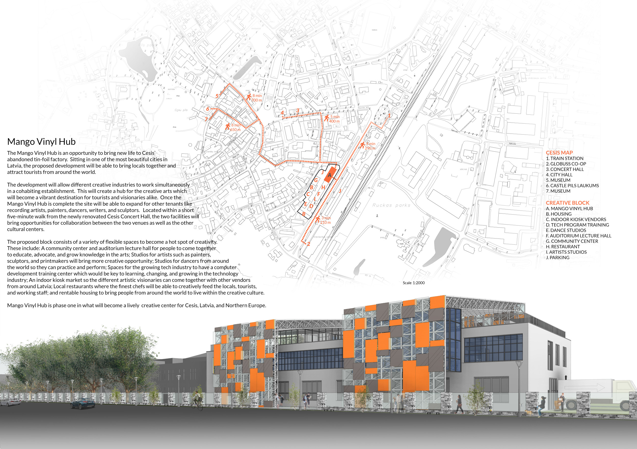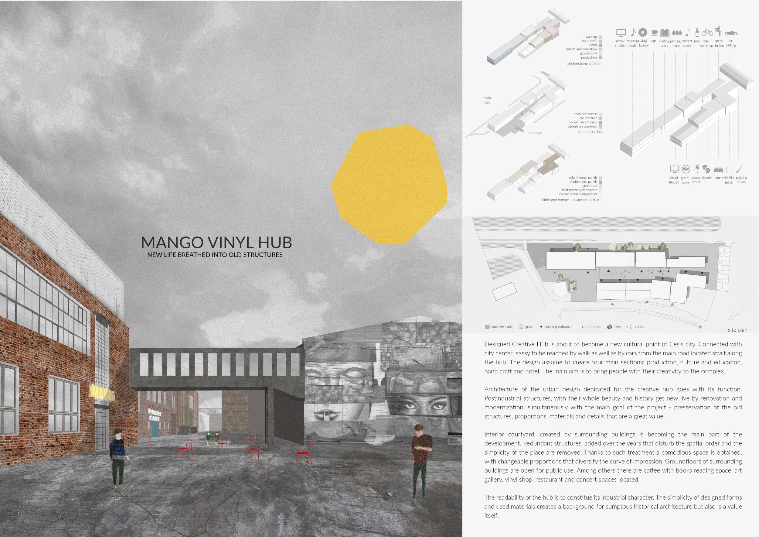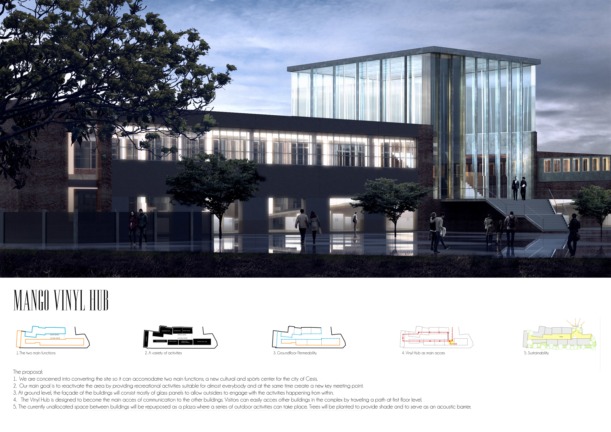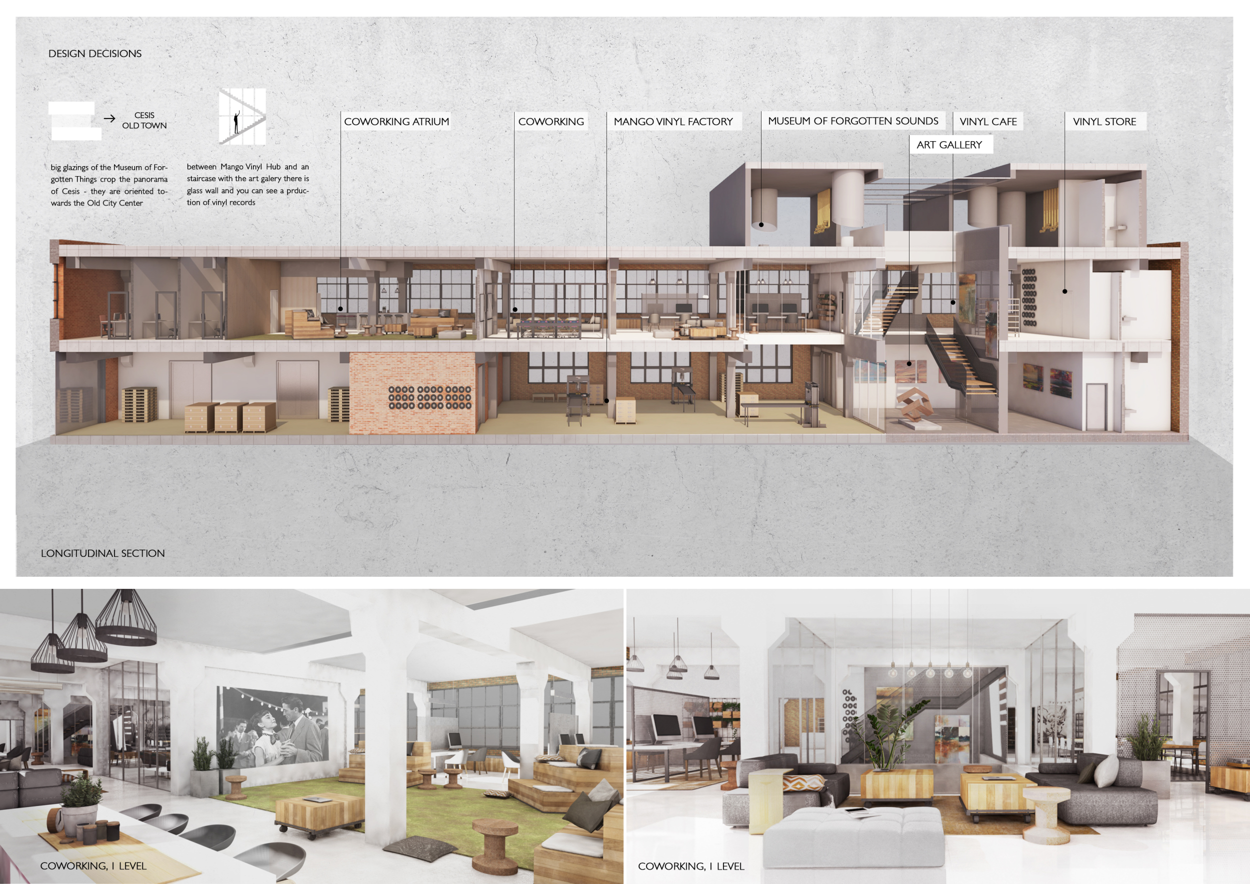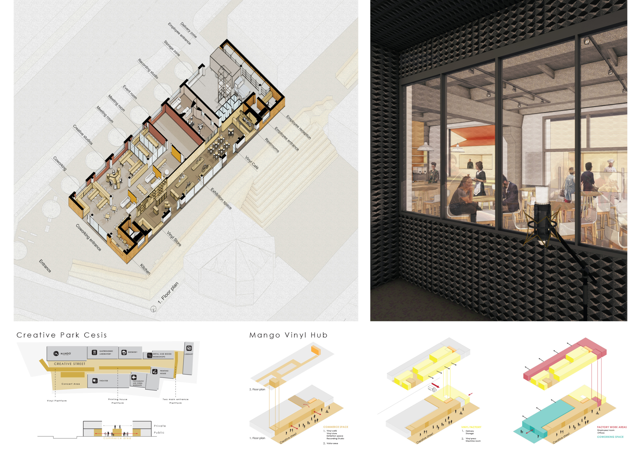 The Mango Vinyl Hub competition solicits consideration of a familiar circumstance characteristic of the contemporary regional condition. Located in Cesis, a historic and provincial city in the Vidzeme region of Latvia, the project calls into question possible and imagined futures of recent historic and artifactual culture — of architecture, music, industry, and design. Participating in the materializing creative industry of Cesis, the project invites designers to consider the adaptive reuse of an abandoned tin foil factory in promotion of a resurgent interest in the vinyl record industry. The project aptly repurposes an architecture arising from the exigency of early industrial production in support of a programmatic celebration of contemporaneous technology. In so doing, the context provokes reflection on the value of cultural patrimony and artifact, particularly the tenuousness of obsolescence and the concurrent squander or flotsam of technological disruption. As a re-appropriation of a previous structure, the competition requires attention to programming and circulation, as well as concerns of spatiality, interiority, and public-private relation. Successful projects temper the impulse of retrojecting nostalgic hallmark or tradition, through revitalization of purpose of an artifact and history of a bygone era.