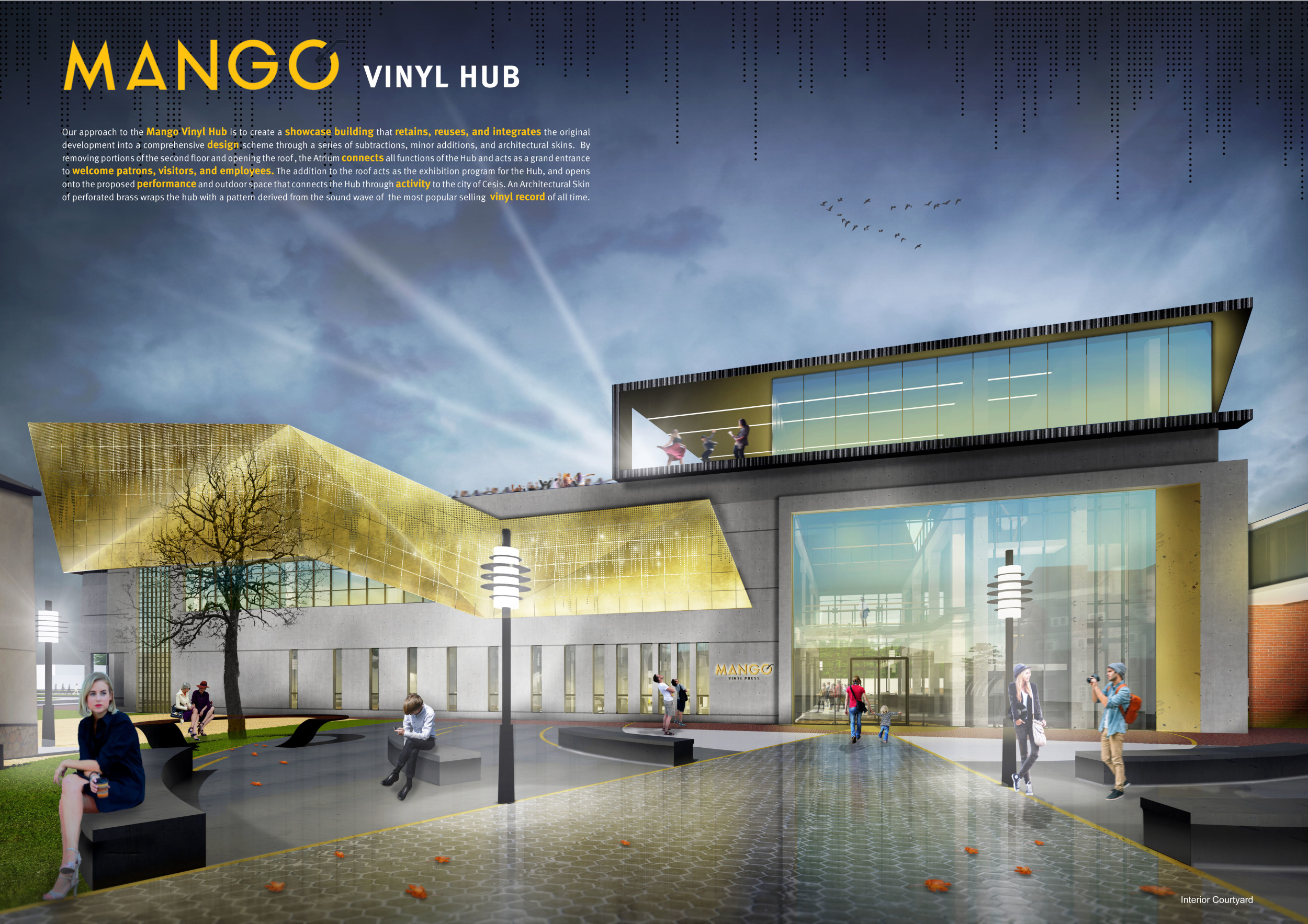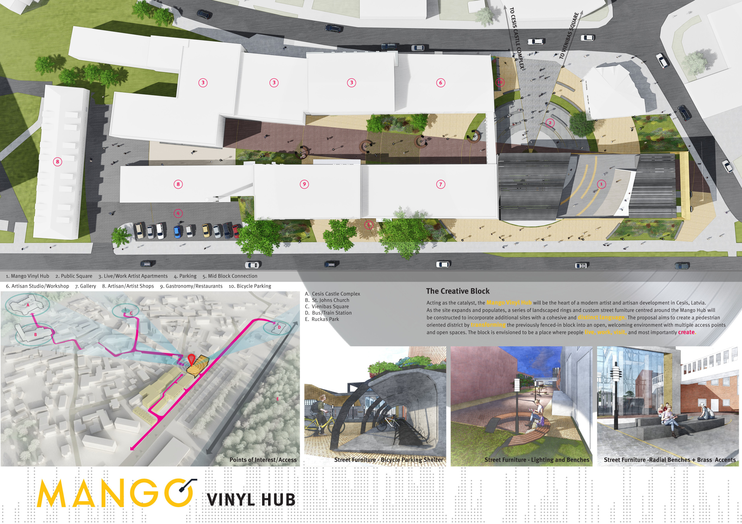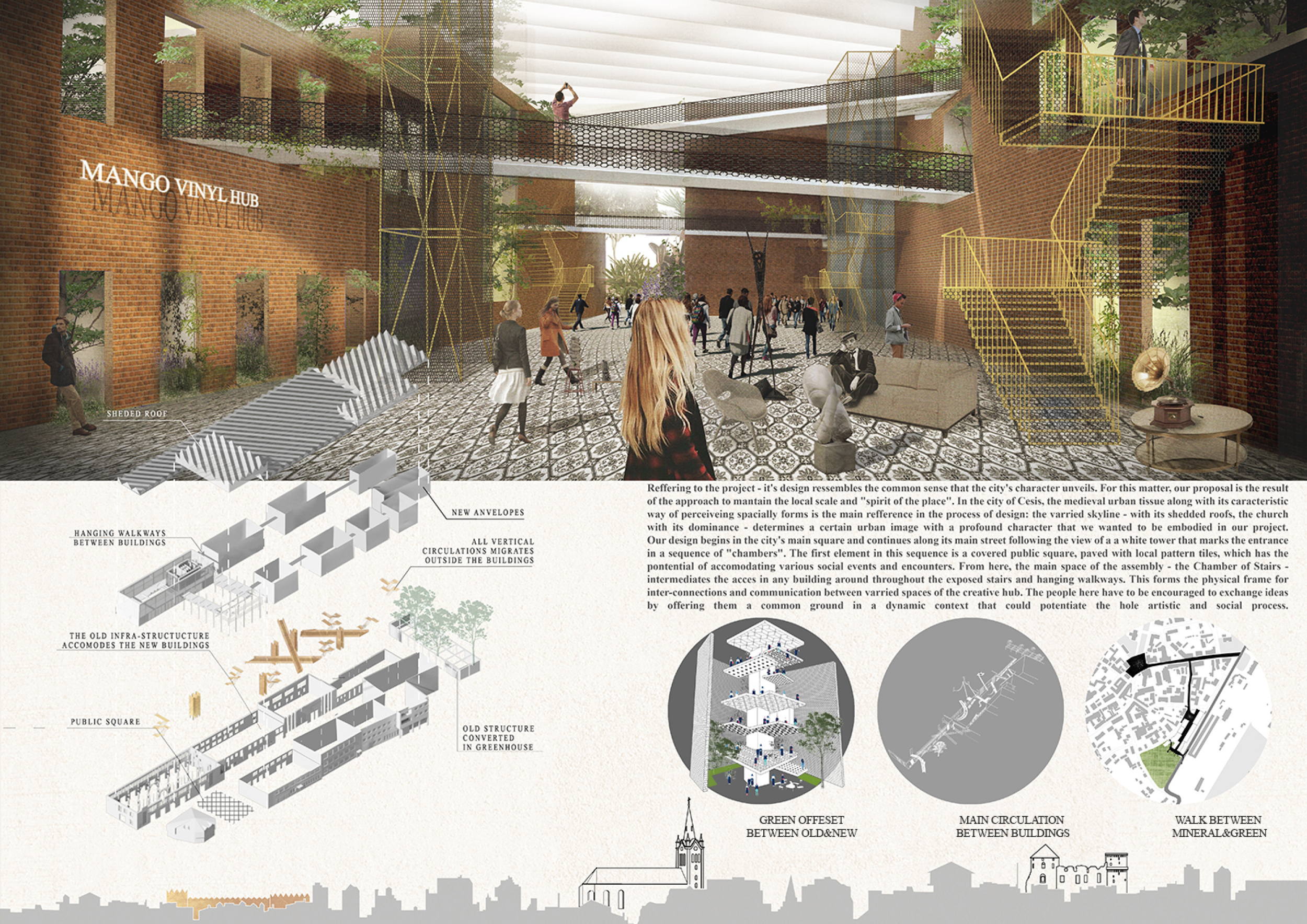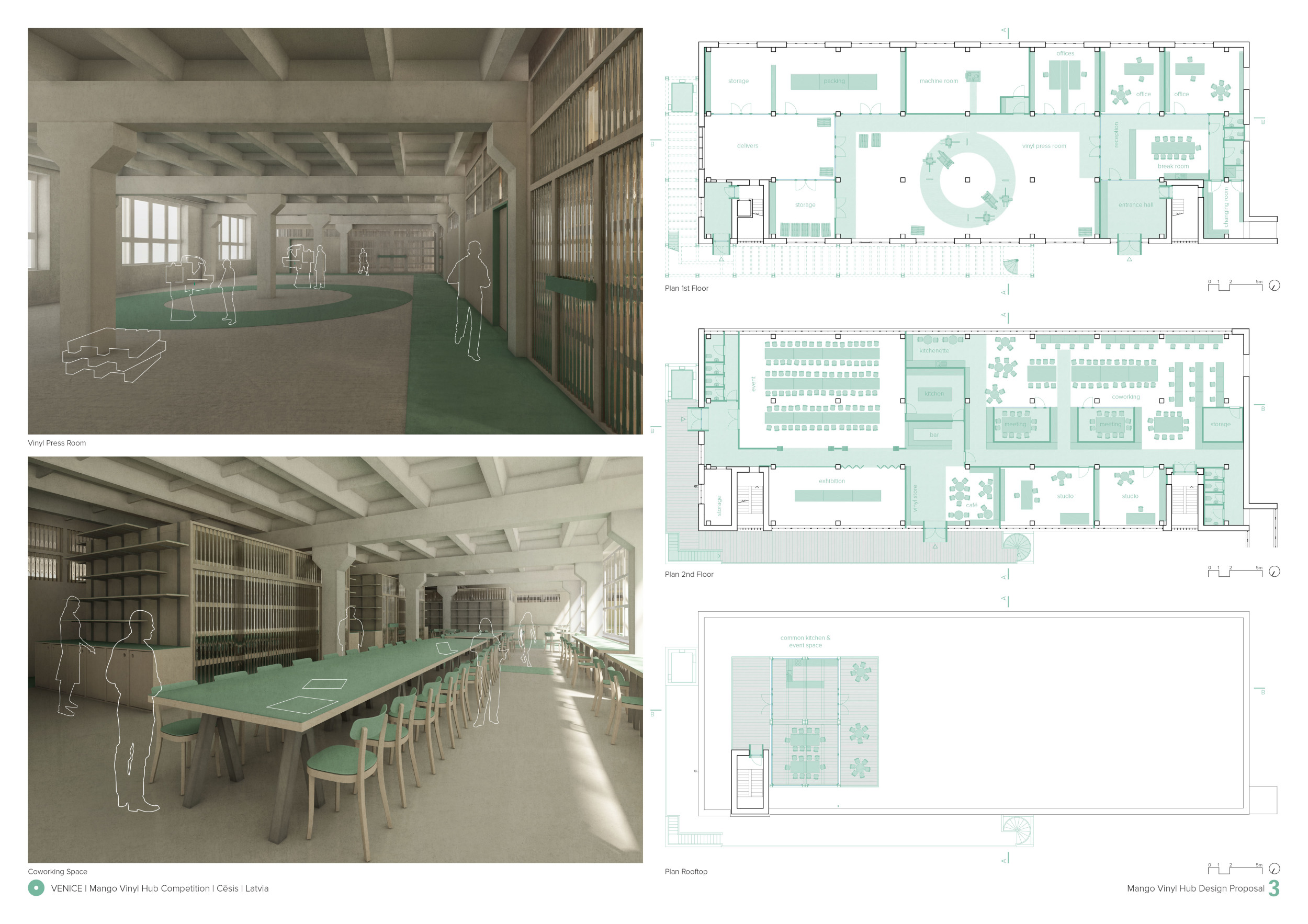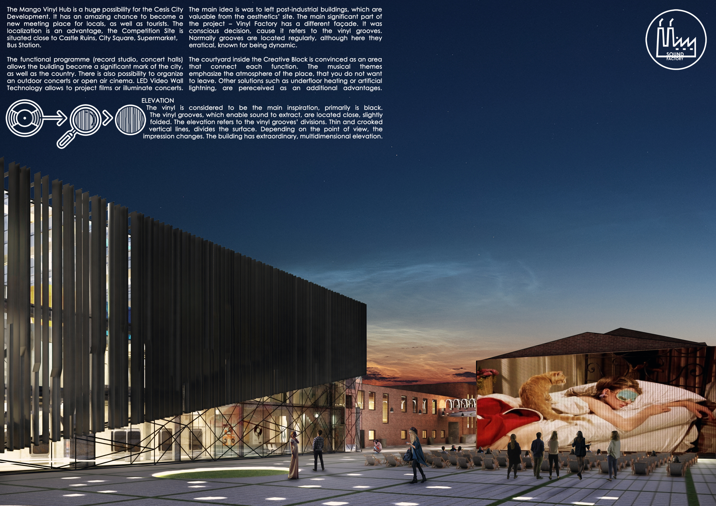 The Mango Vinyl Hub competition solicits consideration of a familiar circumstance characteristic of the contemporary regional condition. Located in Cesis, a historic and provincial city in the Vidzeme region of Latvia, the project calls into question possible and imagined futures of recent historic and artifactual culture — of architecture, music, industry, and design. Participating in the materializing creative industry of Cesis, the project invites designers to consider the adaptive reuse of an abandoned tin foil factory in promotion of a resurgent interest in the vinyl record industry. The project aptly repurposes an architecture arising from the exigency of early industrial production in support of a programmatic celebration of contemporaneous technology. In so doing, the context provokes reflection on the value of cultural patrimony and artifact, particularly the tenuousness of obsolescence and the concurrent squander or flotsam of technological disruption. As a re-appropriation of a previous structure, the competition requires attention to programming and circulation, as well as concerns of spatiality, interiority, and public-private relation. Successful projects temper the impulse of retrojecting nostalgic hallmark or tradition, through revitalization of purpose of an artifact and history of a bygone era.