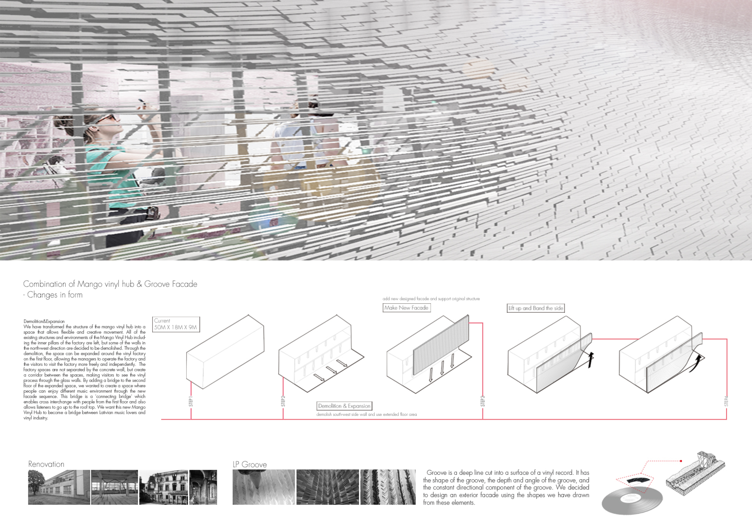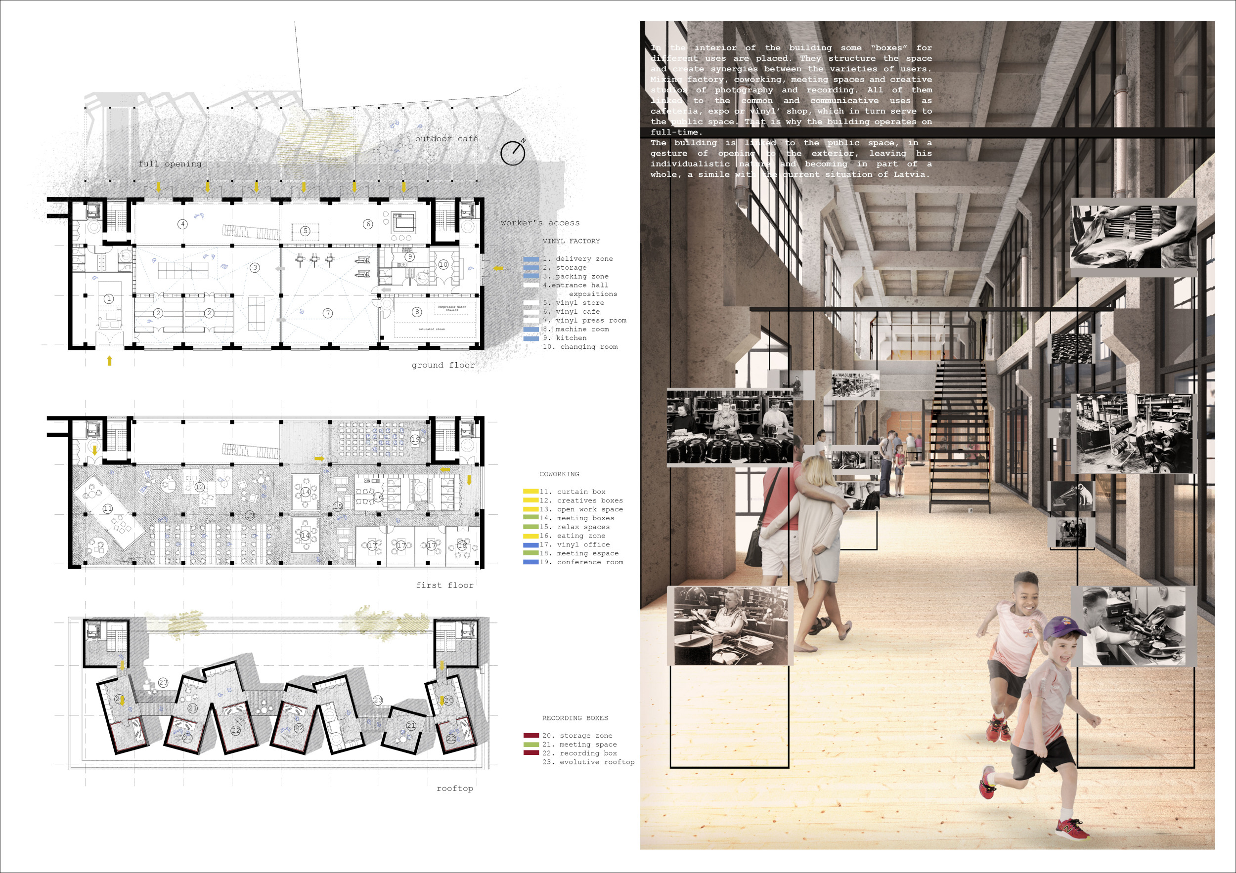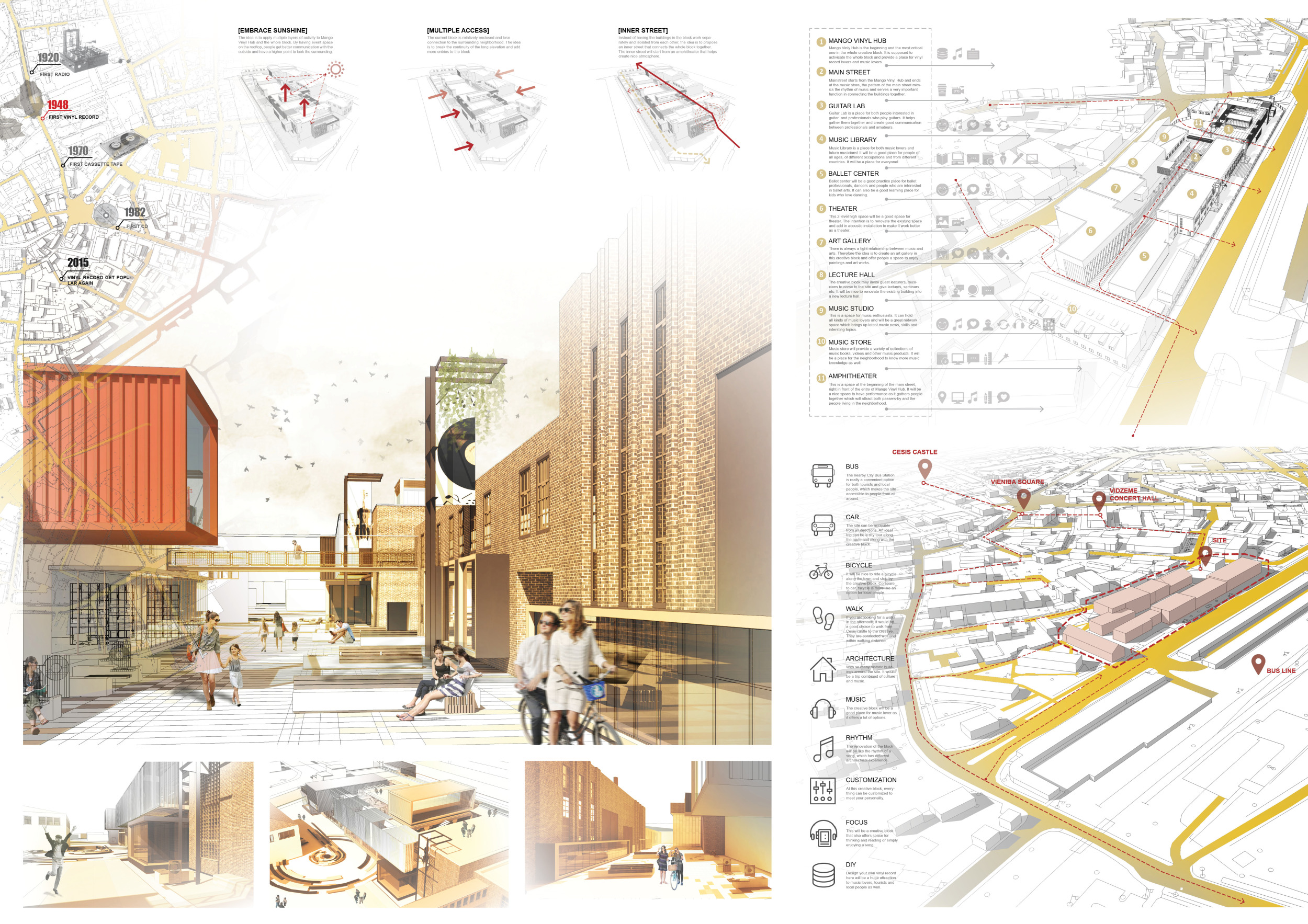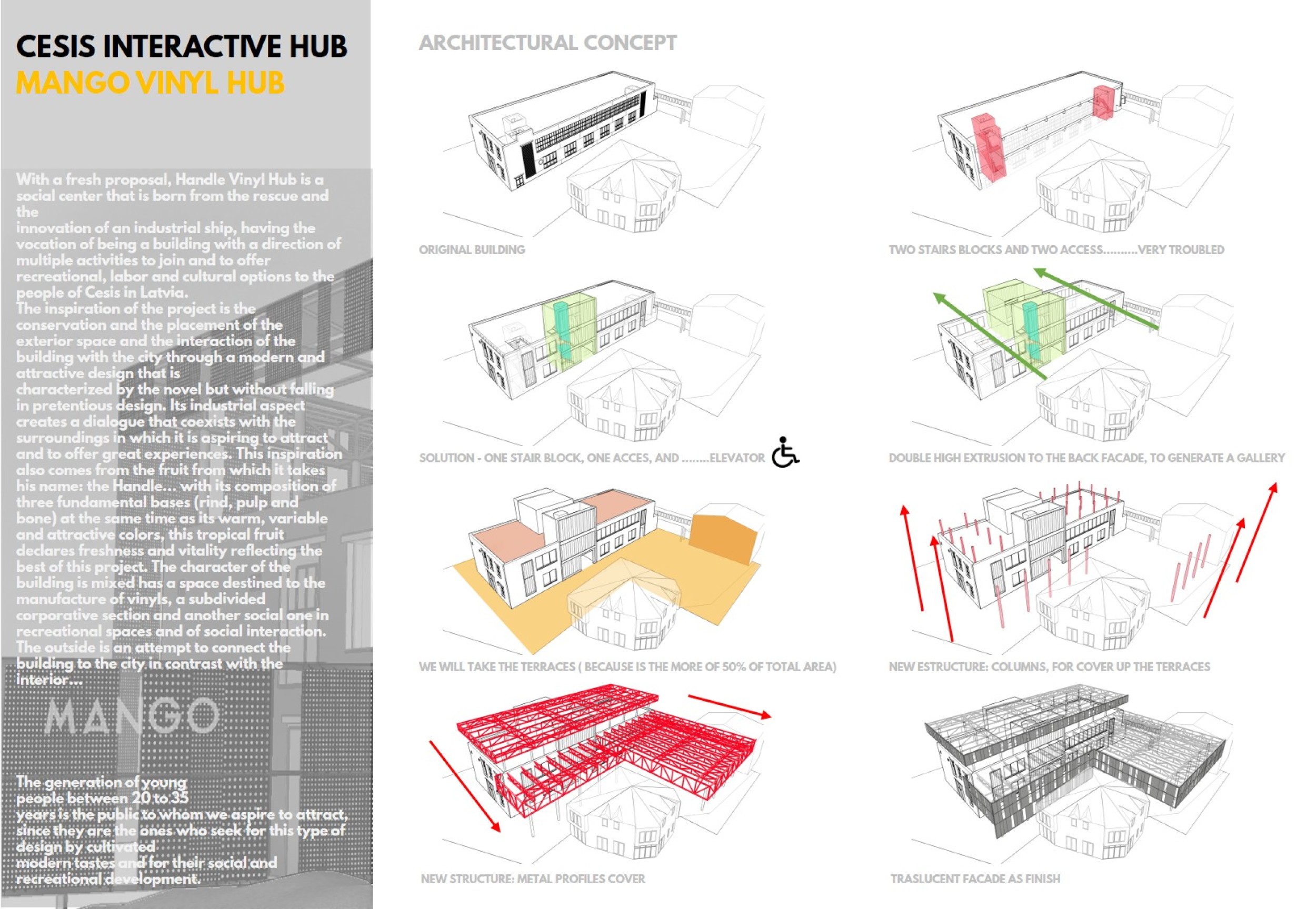 The Mango Vinyl Hub competition solicits consideration of a familiar circumstance characteristic of the contemporary regional condition. Located in Cesis, a historic and provincial city in the Vidzeme region of Latvia, the project calls into question possible and imagined futures of recent historic and artifactual culture — of architecture, music, industry, and design. Participating in the materializing creative industry of Cesis, the project invites designers to consider the adaptive reuse of an abandoned tin foil factory in promotion of a resurgent interest in the vinyl record industry. The project aptly repurposes an architecture arising from the exigency of early industrial production in support of a programmatic celebration of contemporaneous technology. In so doing, the context provokes reflection on the value of cultural patrimony and artifact, particularly the tenuousness of obsolescence and the concurrent squander or flotsam of technological disruption. As a re-appropriation of a previous structure, the competition requires attention to programming and circulation, as well as concerns of spatiality, interiority, and public-private relation. Successful projects temper the impulse of retrojecting nostalgic hallmark or tradition, through revitalization of purpose of an artifact and history of a bygone era.