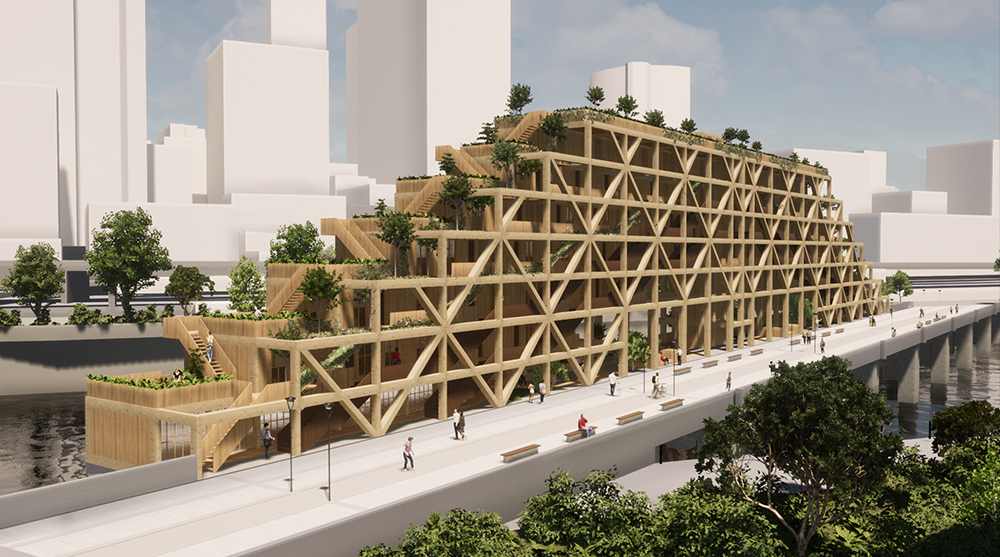 Second prize went to Sandra Estrada Rosas and Maria Gabriela Vaca from the Netherlands. Their Bleacher Housing project proposed a prefabricated timber modular system of housing units of various typologies, which amass and link to existing forms of Melbourne’s transit infrastructure.