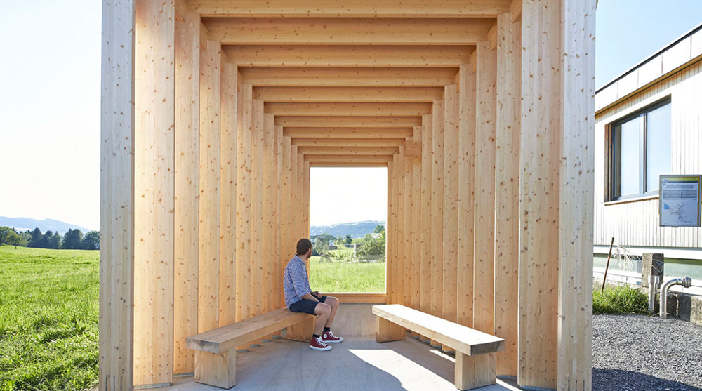 Built using local wood and craft, the Glatzegg bus stop by Wang Shu and Lu Wenyu of Amateur Architecture Studio was inspired by the 120 SLR folding camera. Acting as a lens that people can sit it, it focuses their view on the surrounding landscape.