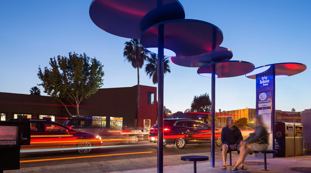 Los Angeles-based firm Lorcan O'Herlihy Architects were commissioned by the city council to “revamp” the image of public transport in Santa Monica. Given the bus network’s reputation as one of the least popular methods of transport, LOHA were brought on board to alter the public transport image. They developed a modular kit of parts that could be used to build an array of round blue canopies that were supported on slender poles, and could be easily adapted to suit every stop.