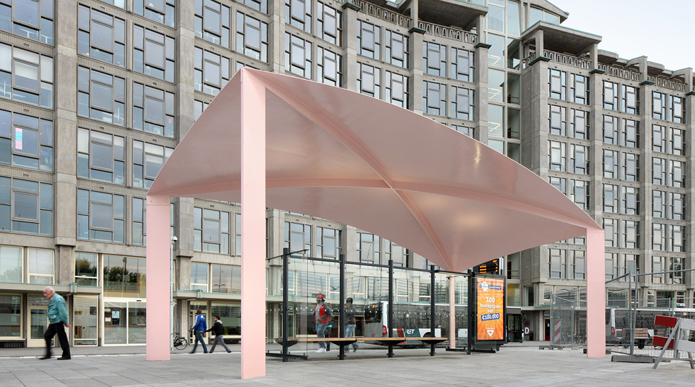 Located on a patch of tarmac outside a new bus terminus in Rotterdam Central District, the pastel-pink canopies are raised up on four flat-steel columns. One arches upwards in the centre, while another bows downward, creating the look of fabric moving in the wind.