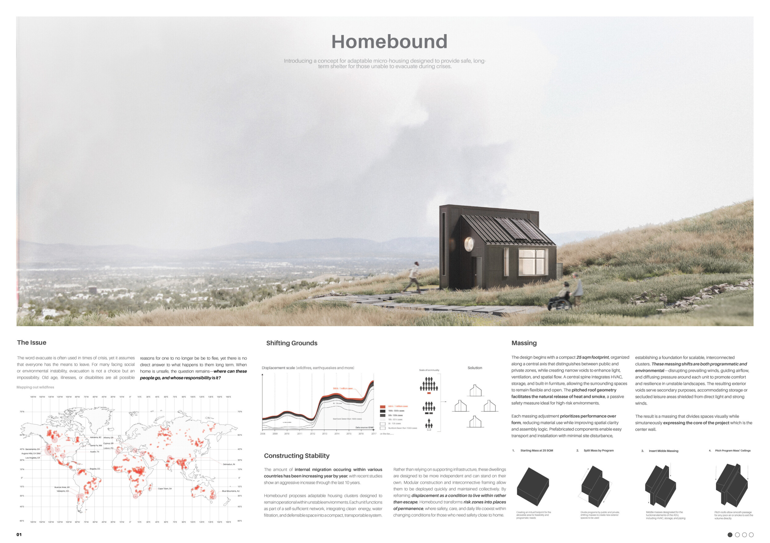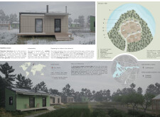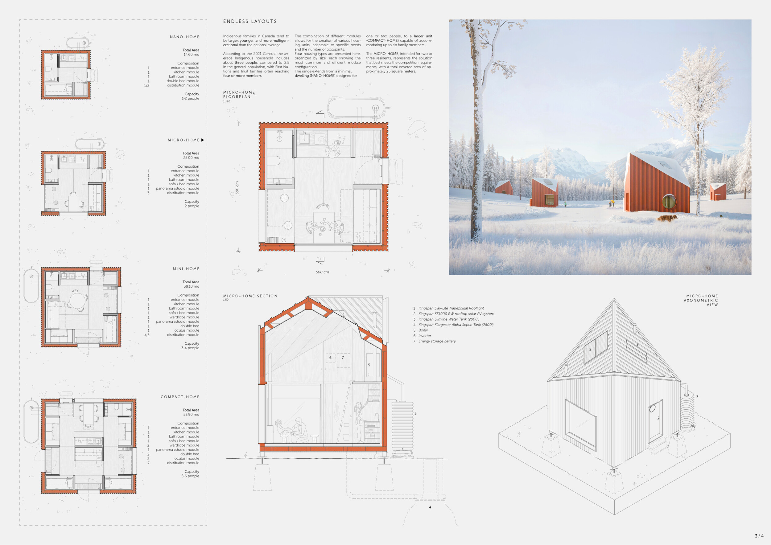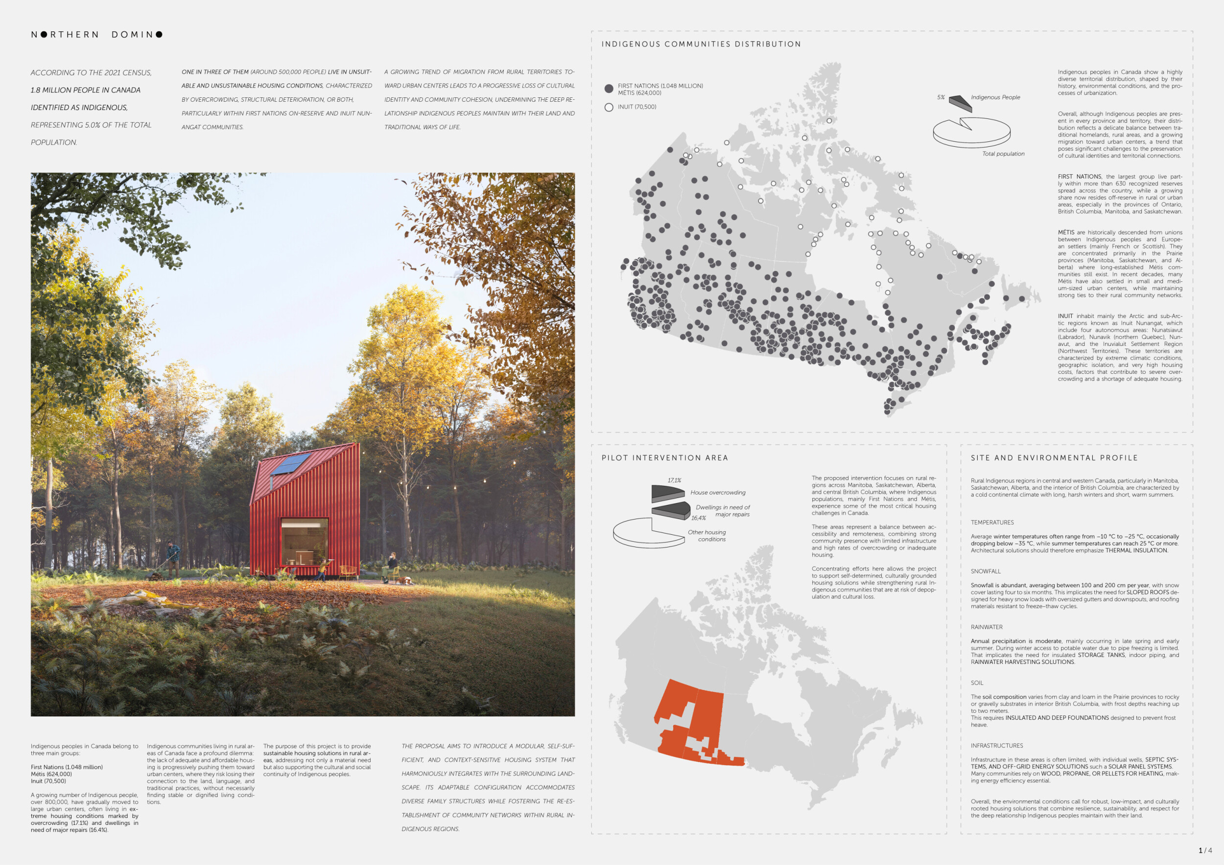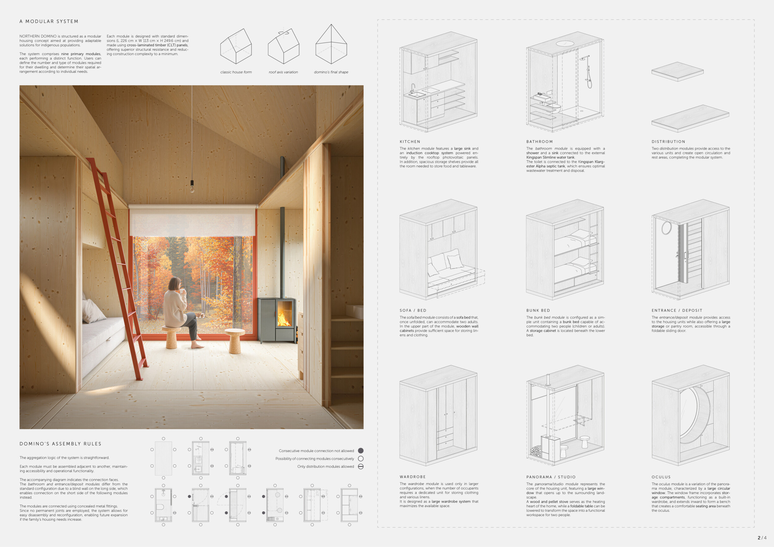 Northern Domino proposes a modular, context-sensitive microhome system designed for Indigenous communities across rural Canada. The project responds to severe housing deficits by creating a flexible family-oriented model that adapts to varied climates and social structures while respecting traditional land relationships. Its unit is built from a clear kit of nine modules that combine into multiple configurations, allowing families to expand or reconfigure their homes as needs evolve.