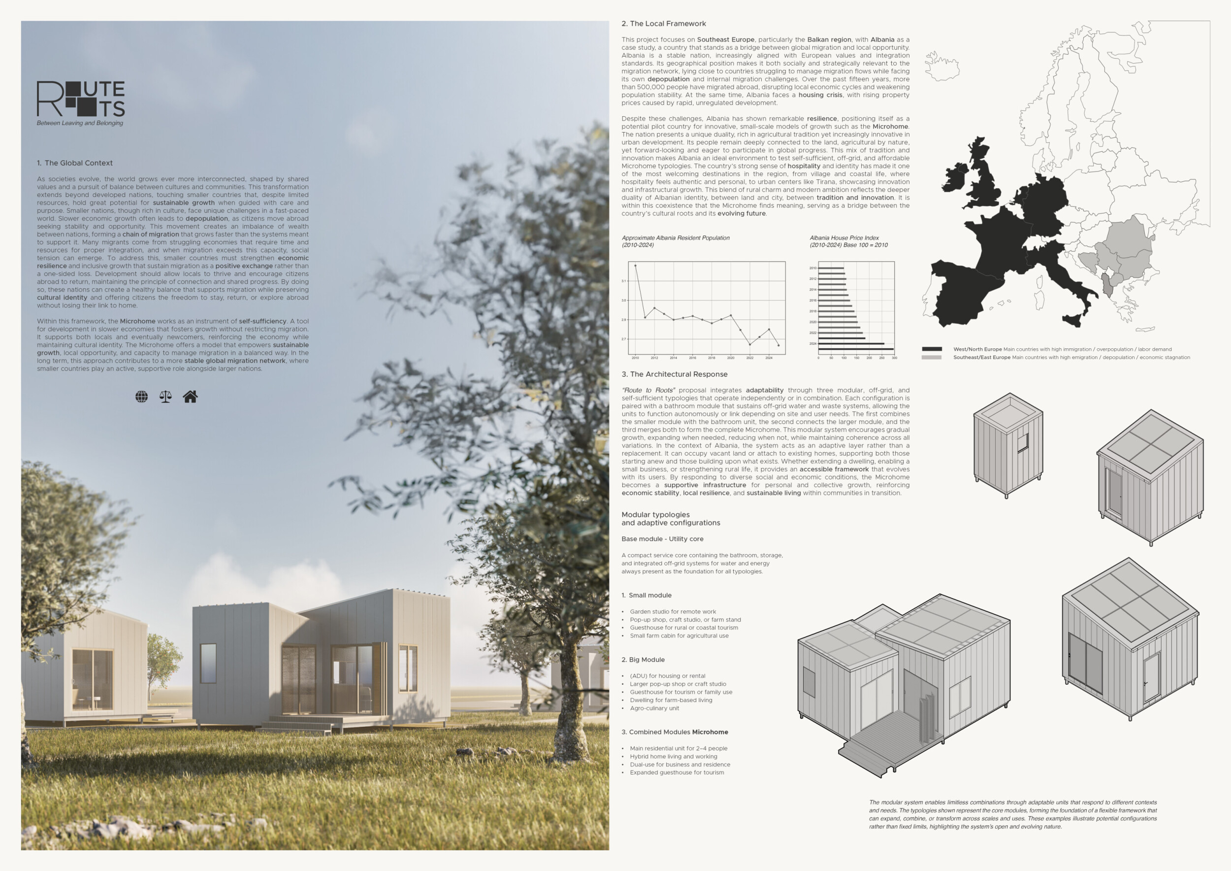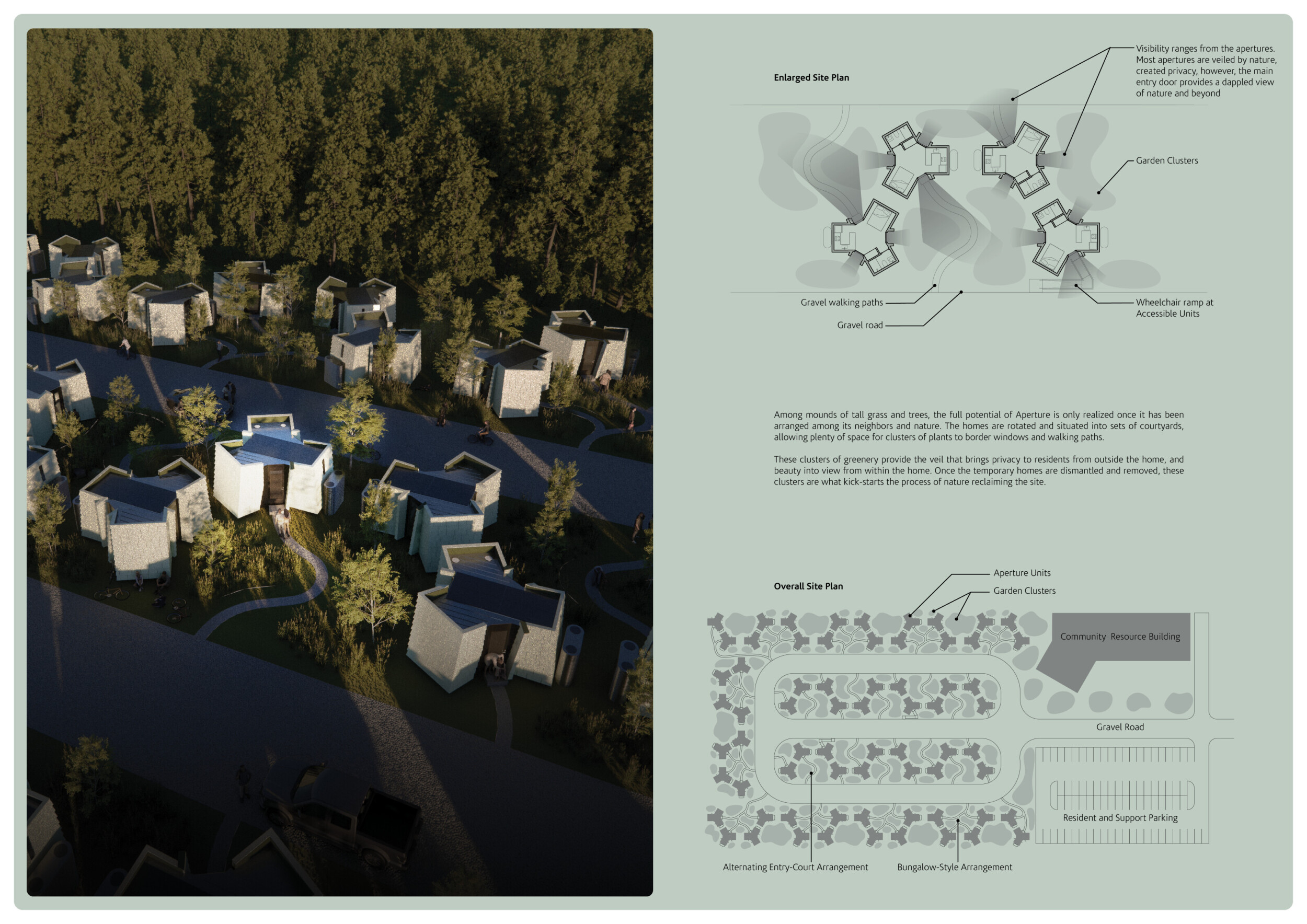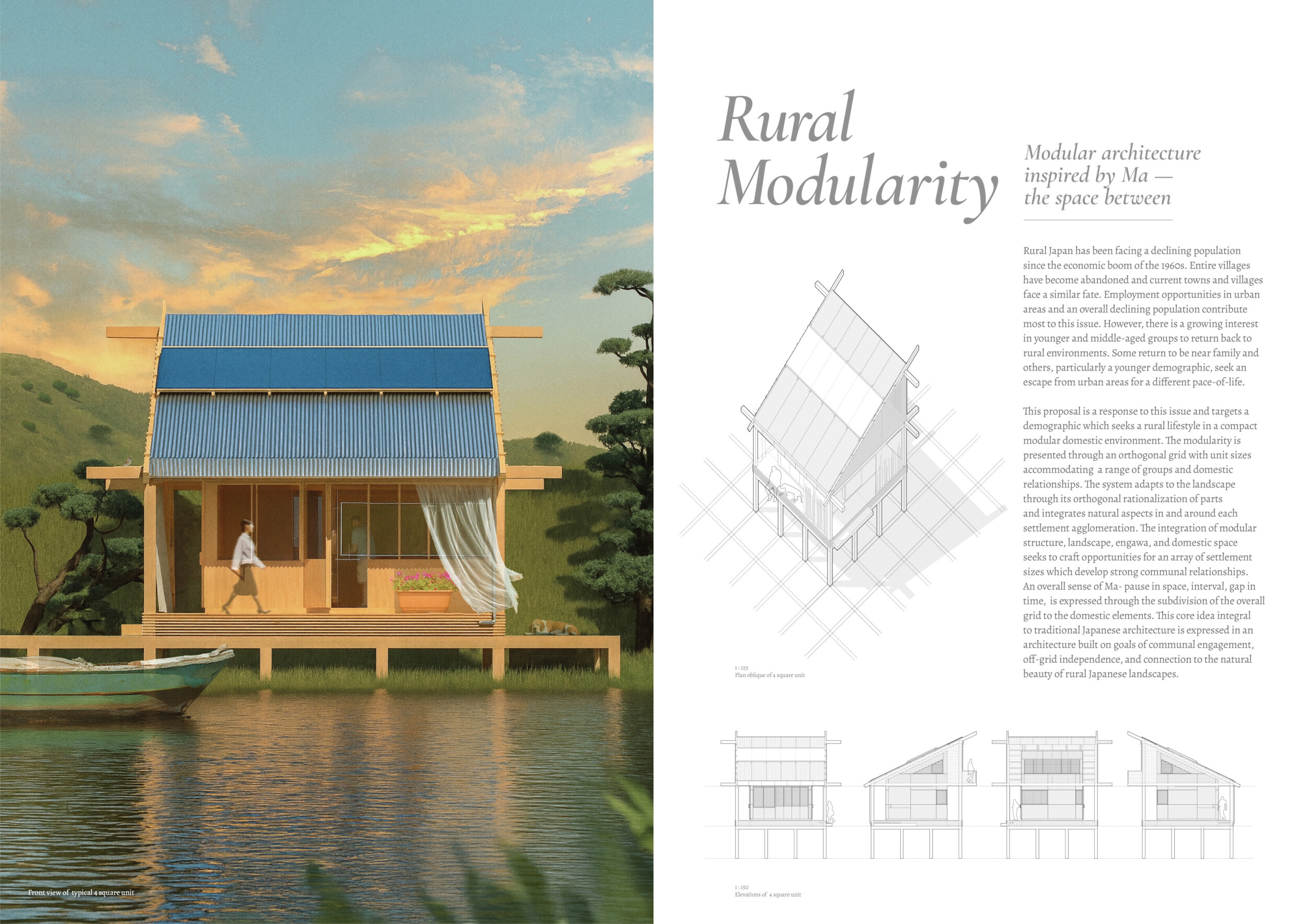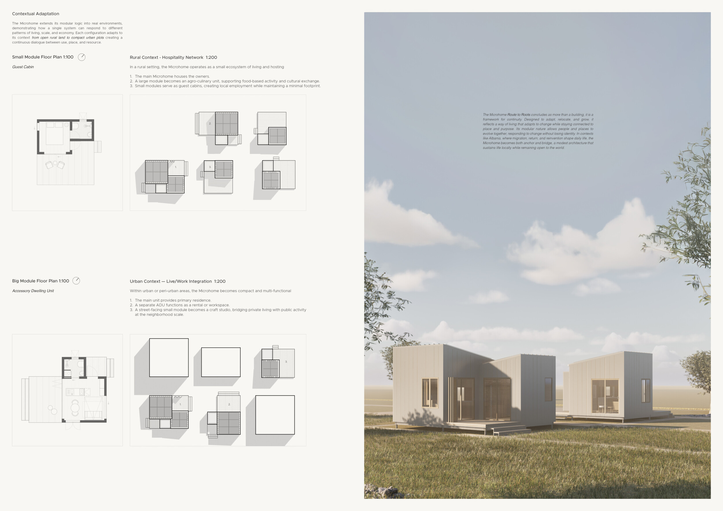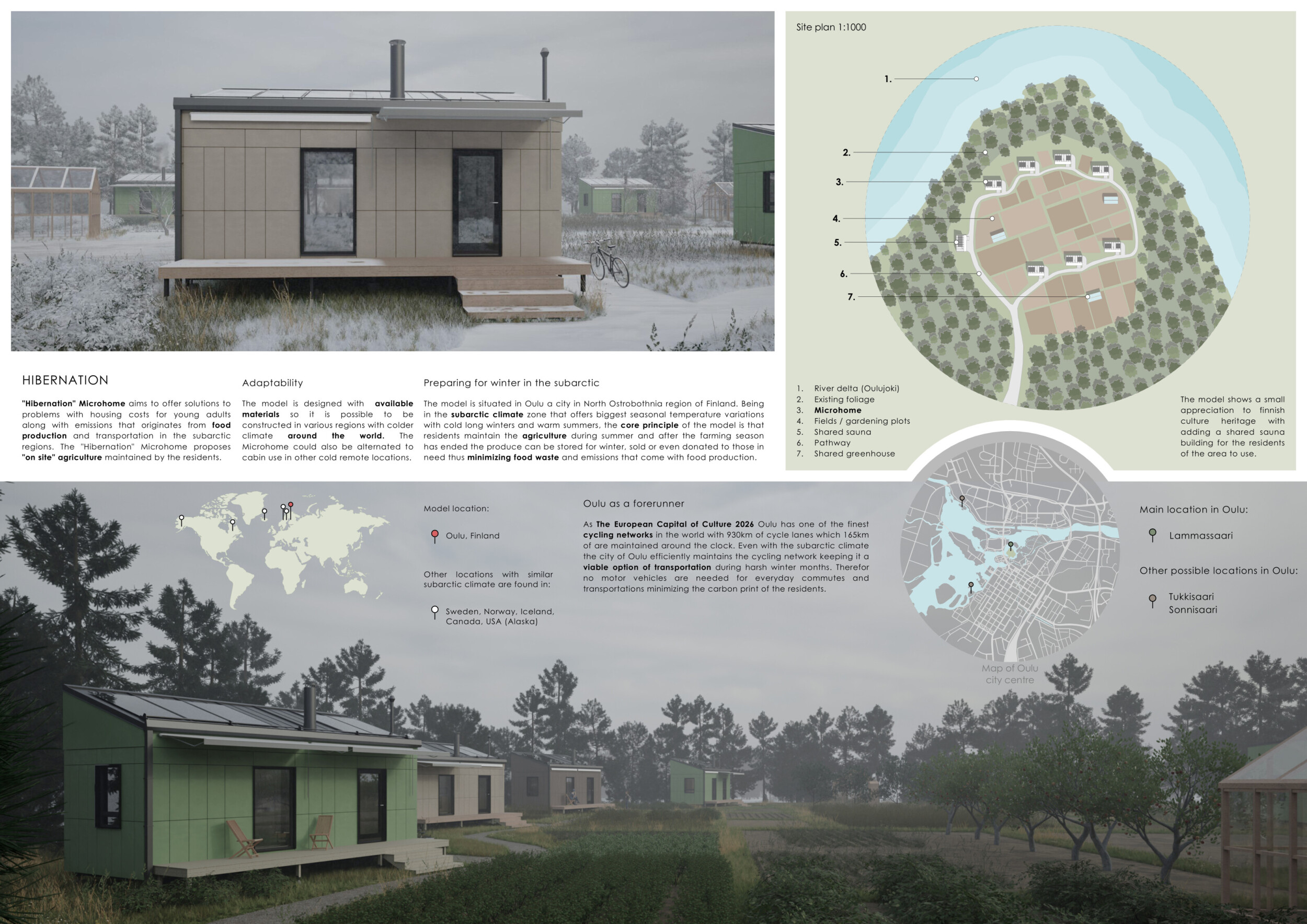Northern Domino proposes a modular, context-sensitive microhome system designed for Indigenous communities across rural Canada. The project responds to severe housing deficits by creating a flexible family-oriented model that adapts to varied climates and social structures while respecting traditional land relationships. Its unit is built from a clear kit of nine modules that combine into multiple configurations, allowing families to expand or reconfigure their homes as needs evolve.