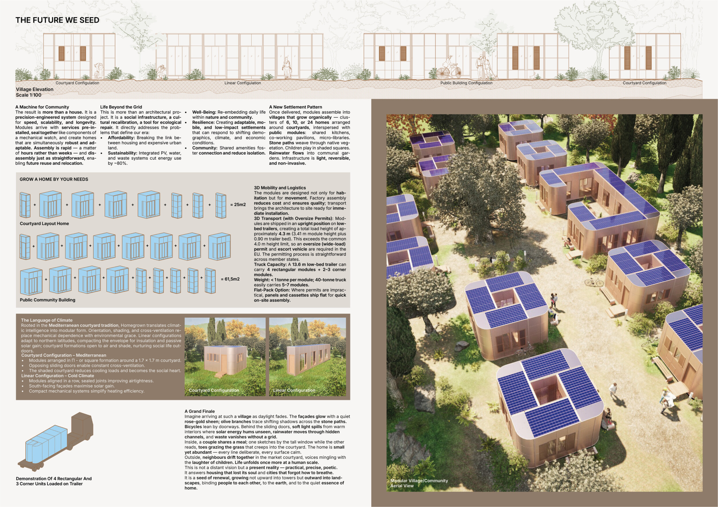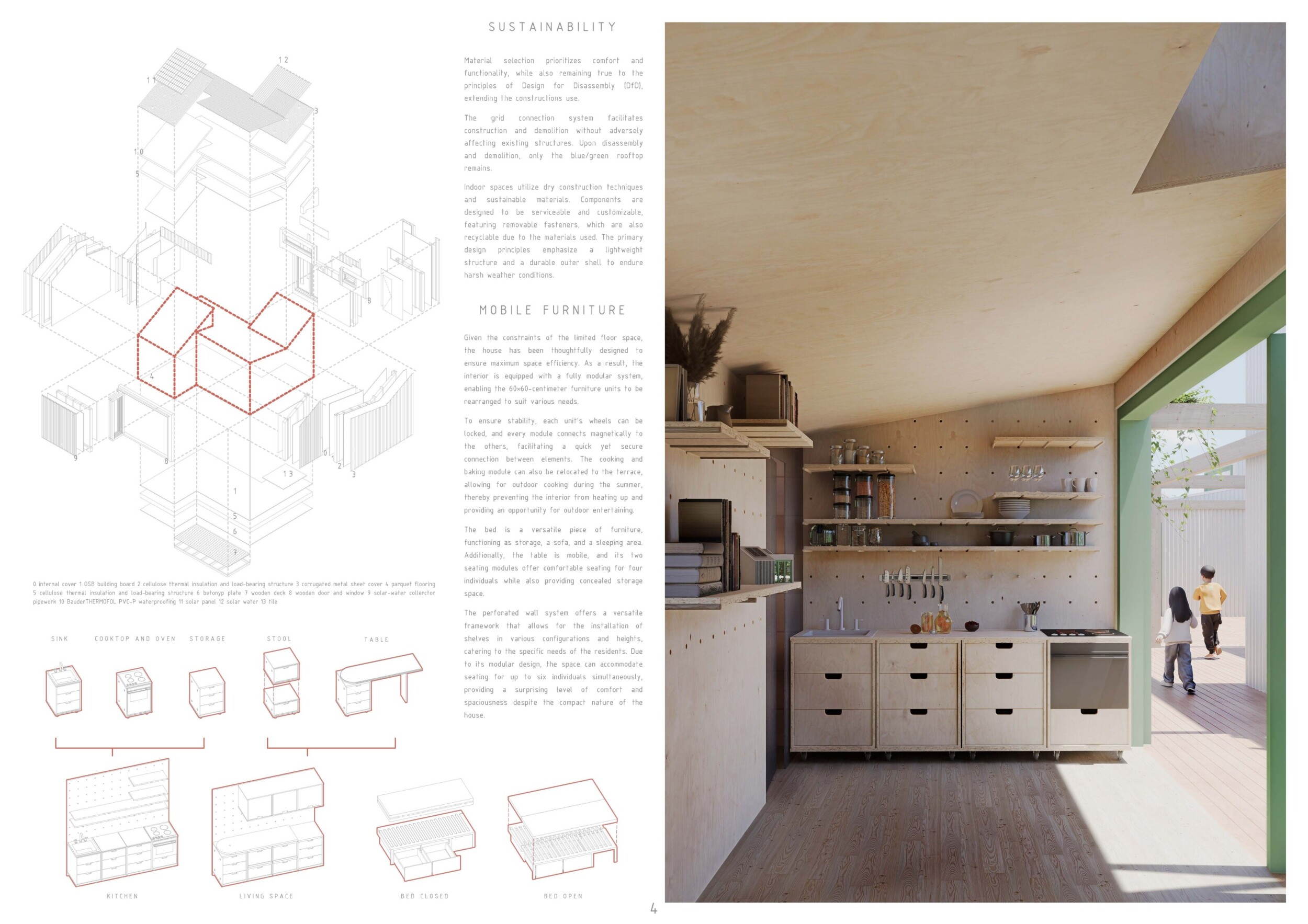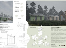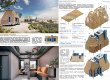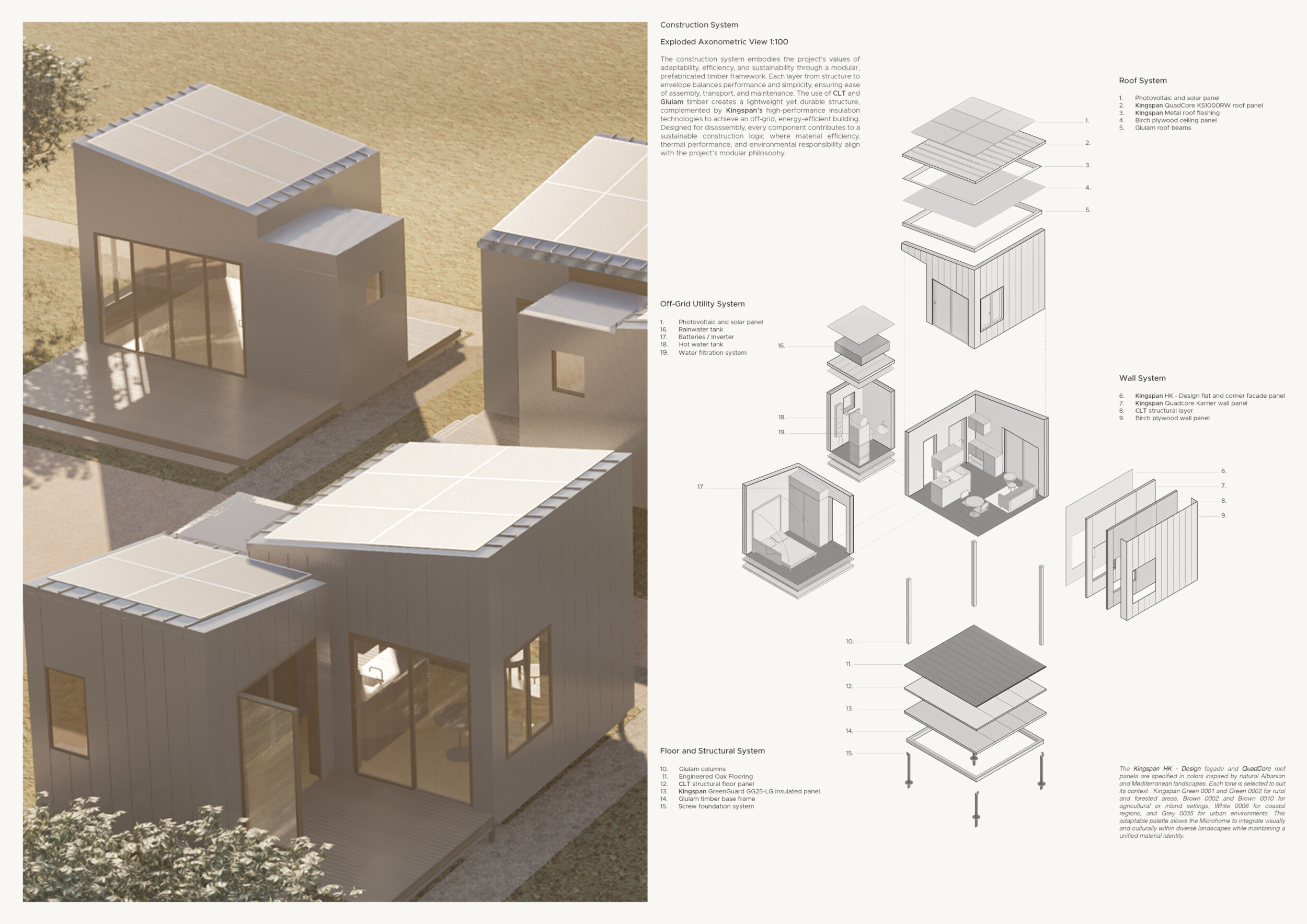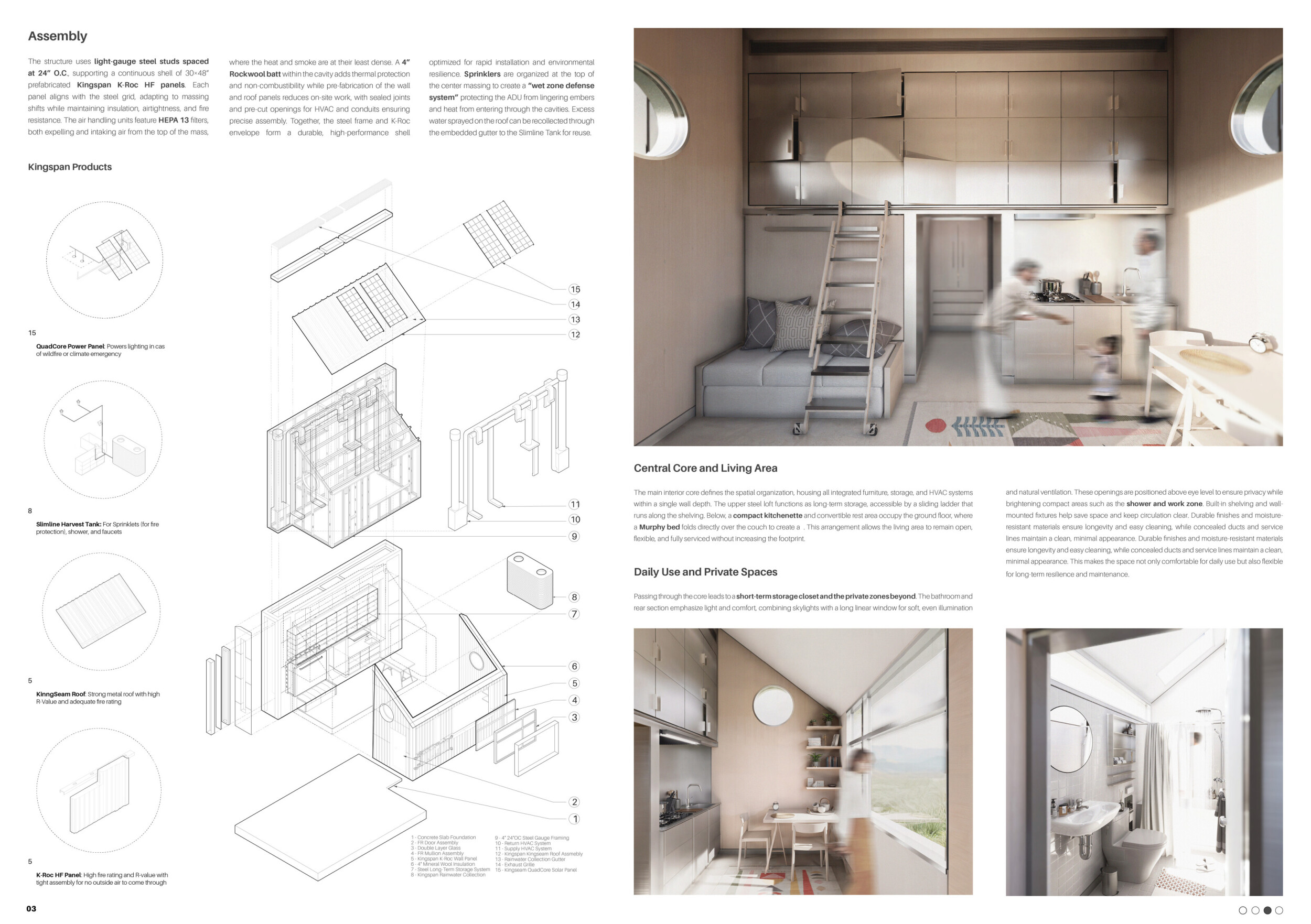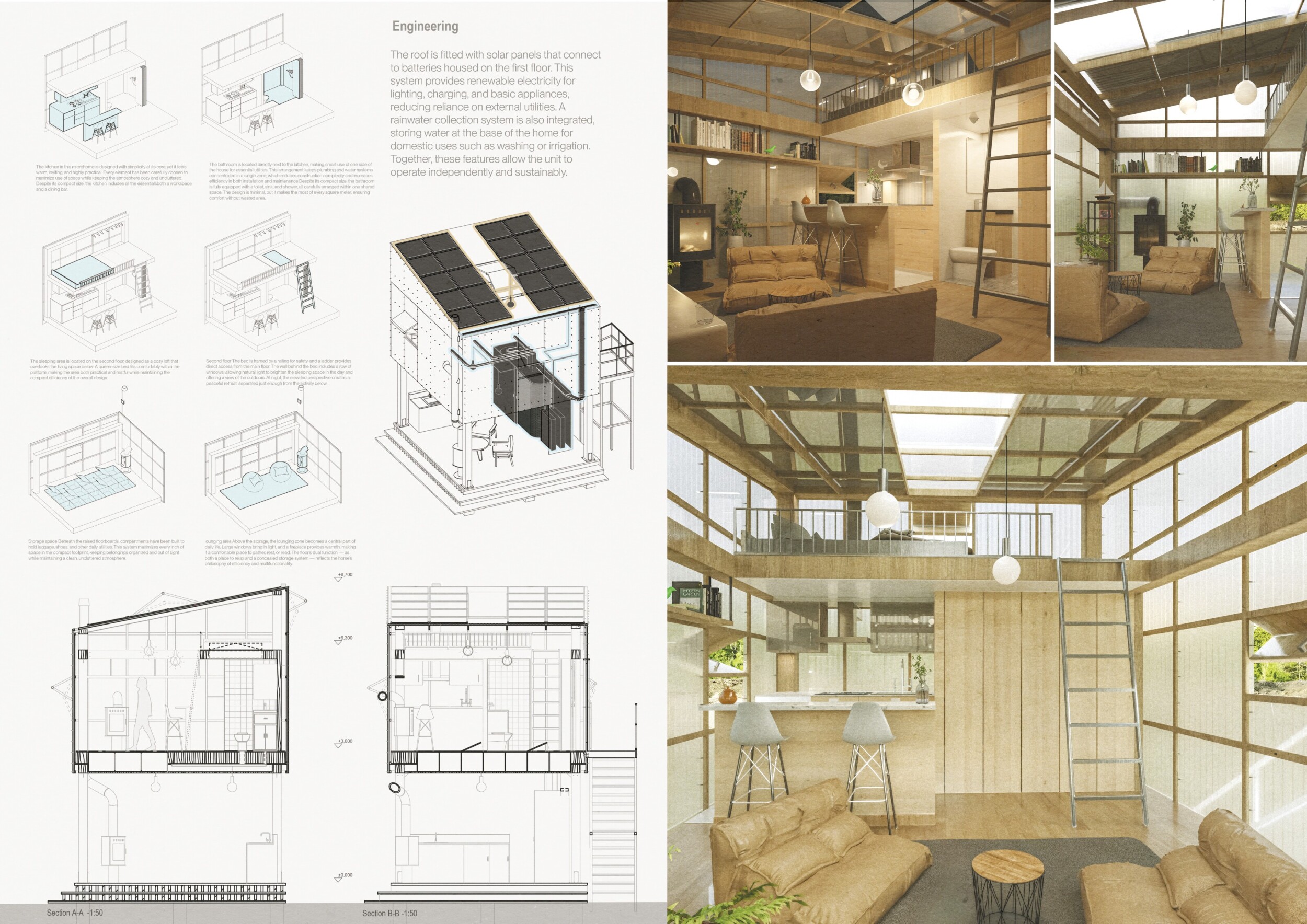 The presentation communicates a clear system that links rapid deployment with long term growth and it uses diagrams well to explain the construction sequence and the staged expansion model. The drawings are clean and precise and the exploded axonometric clarifies how the CLT shell, steel frame, and panels come together. Renderings support the narrative of resilient living although some could better highlight interior spatial quality.