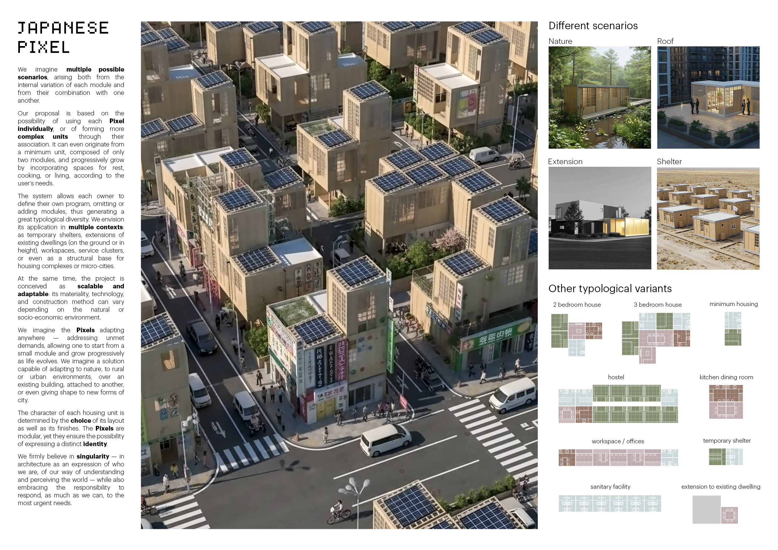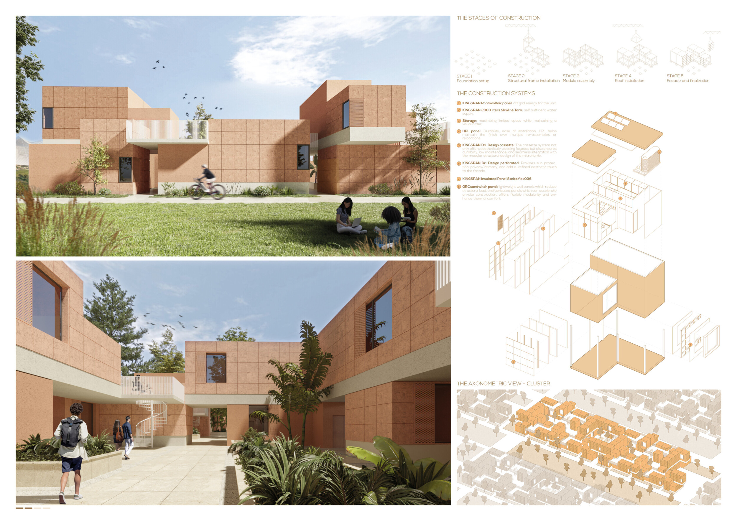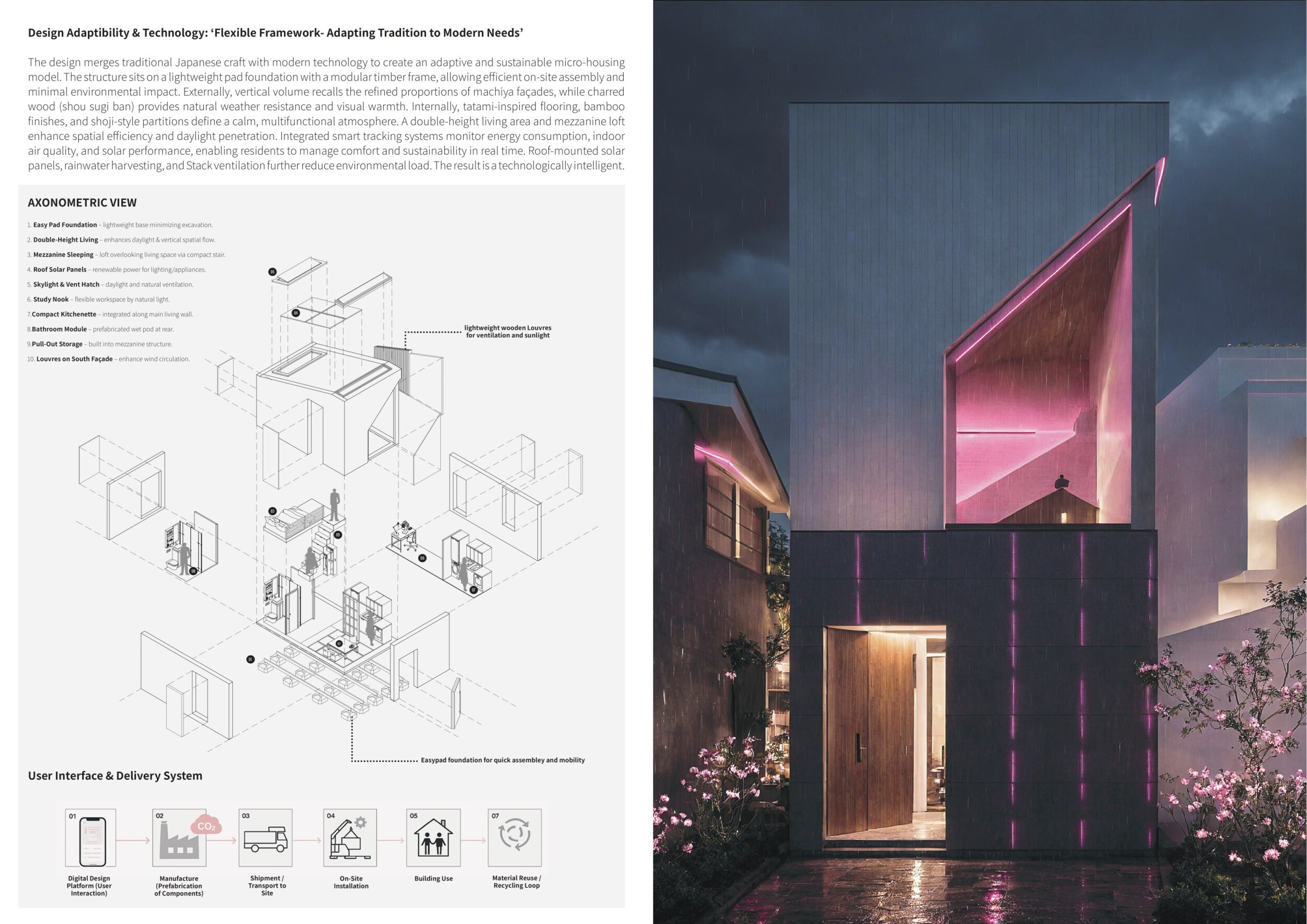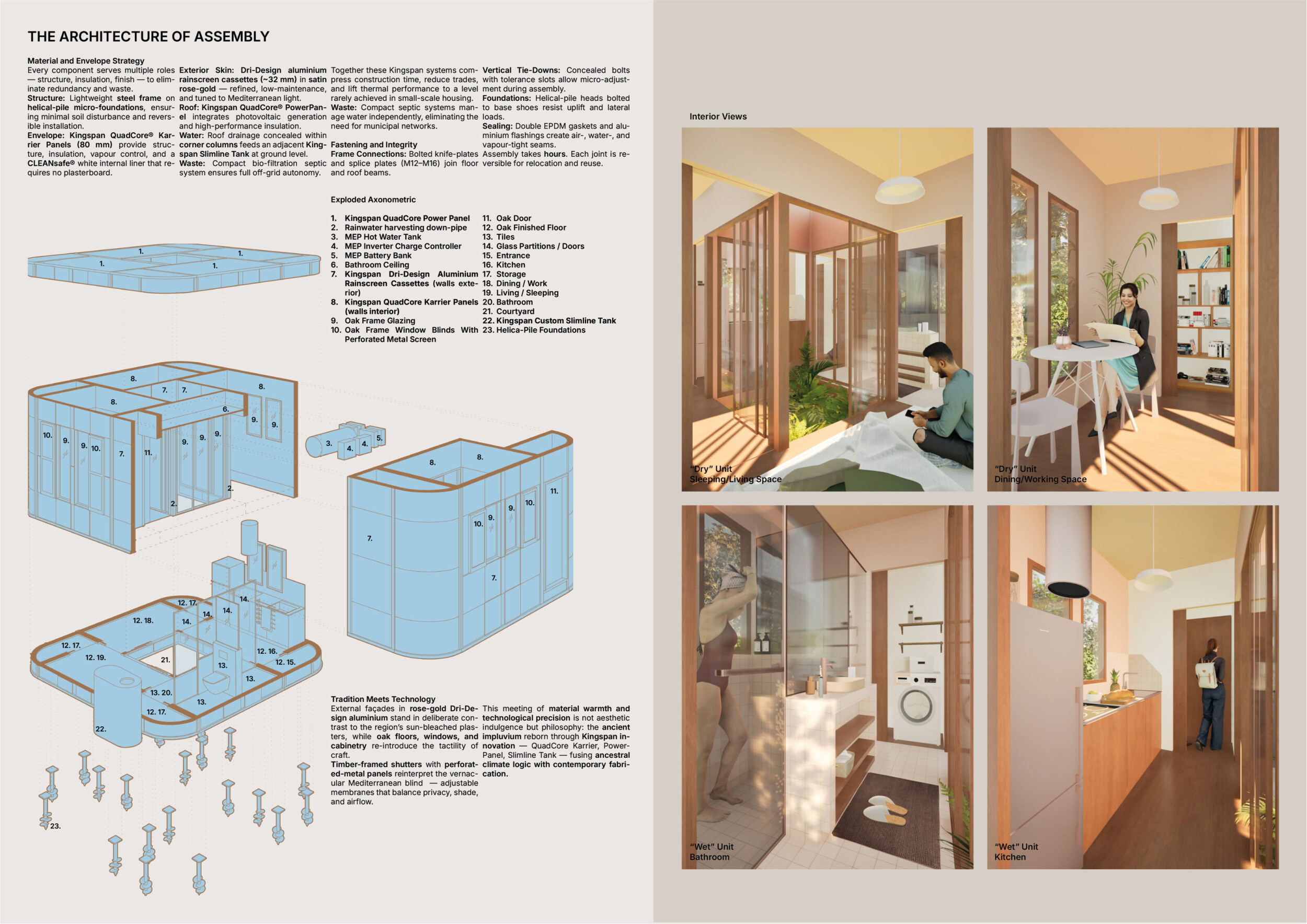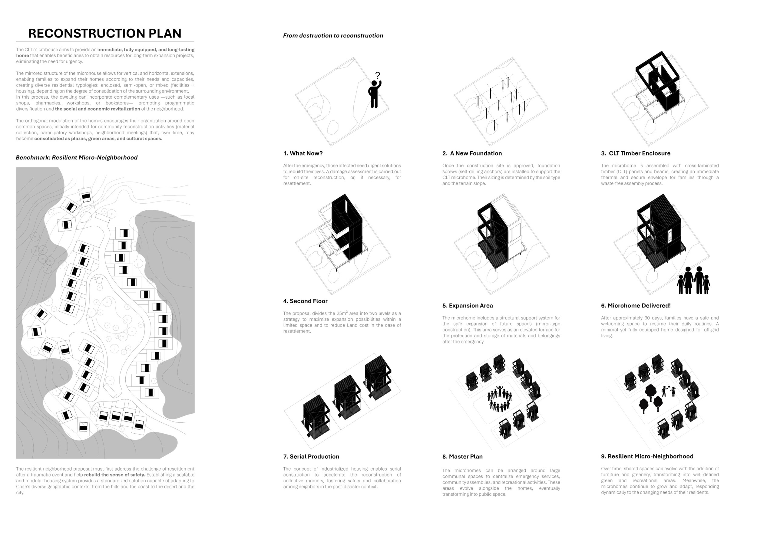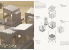 The presentation communicates a clear system that links rapid deployment with long term growth and it uses diagrams well to explain the construction sequence and the staged expansion model. The drawings are clean and precise and the exploded axonometric clarifies how the CLT shell, steel frame, and panels come together. Renderings support the narrative of resilient living although some could better highlight interior spatial quality.