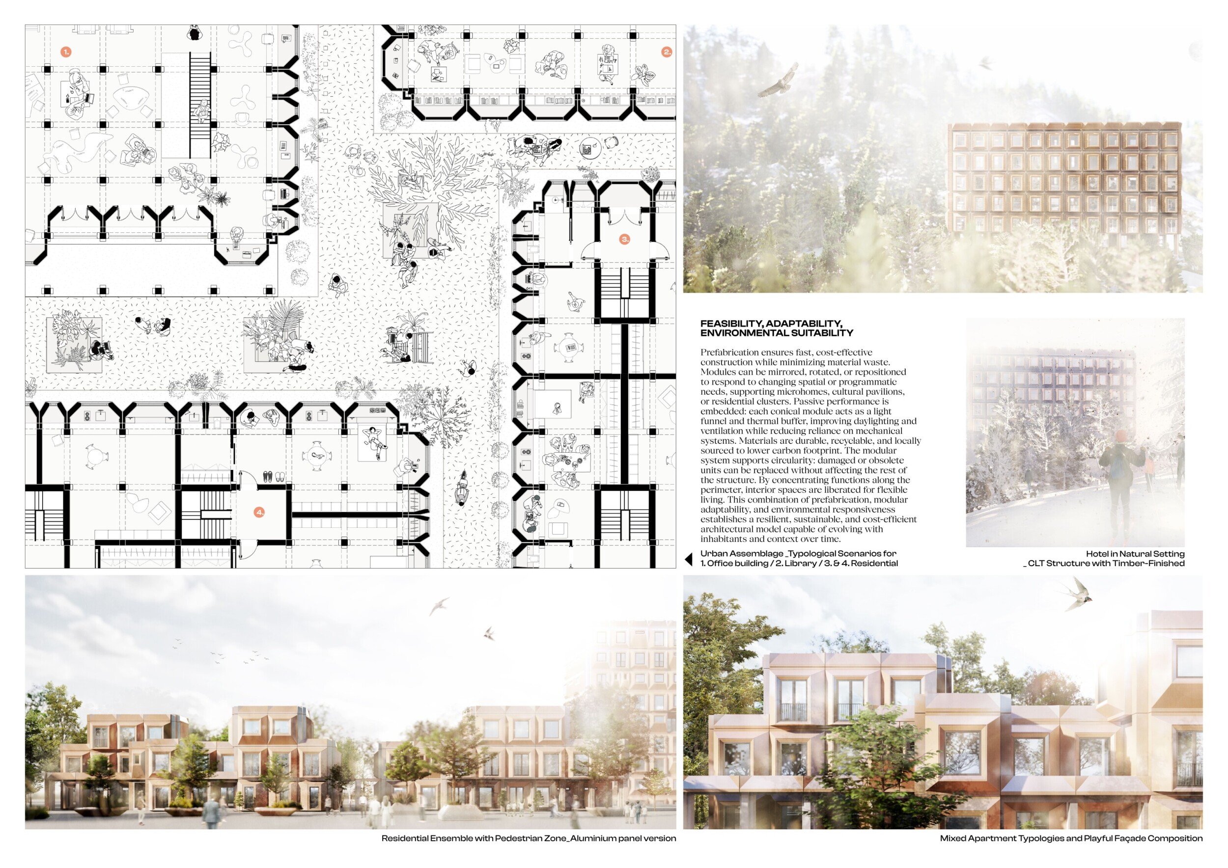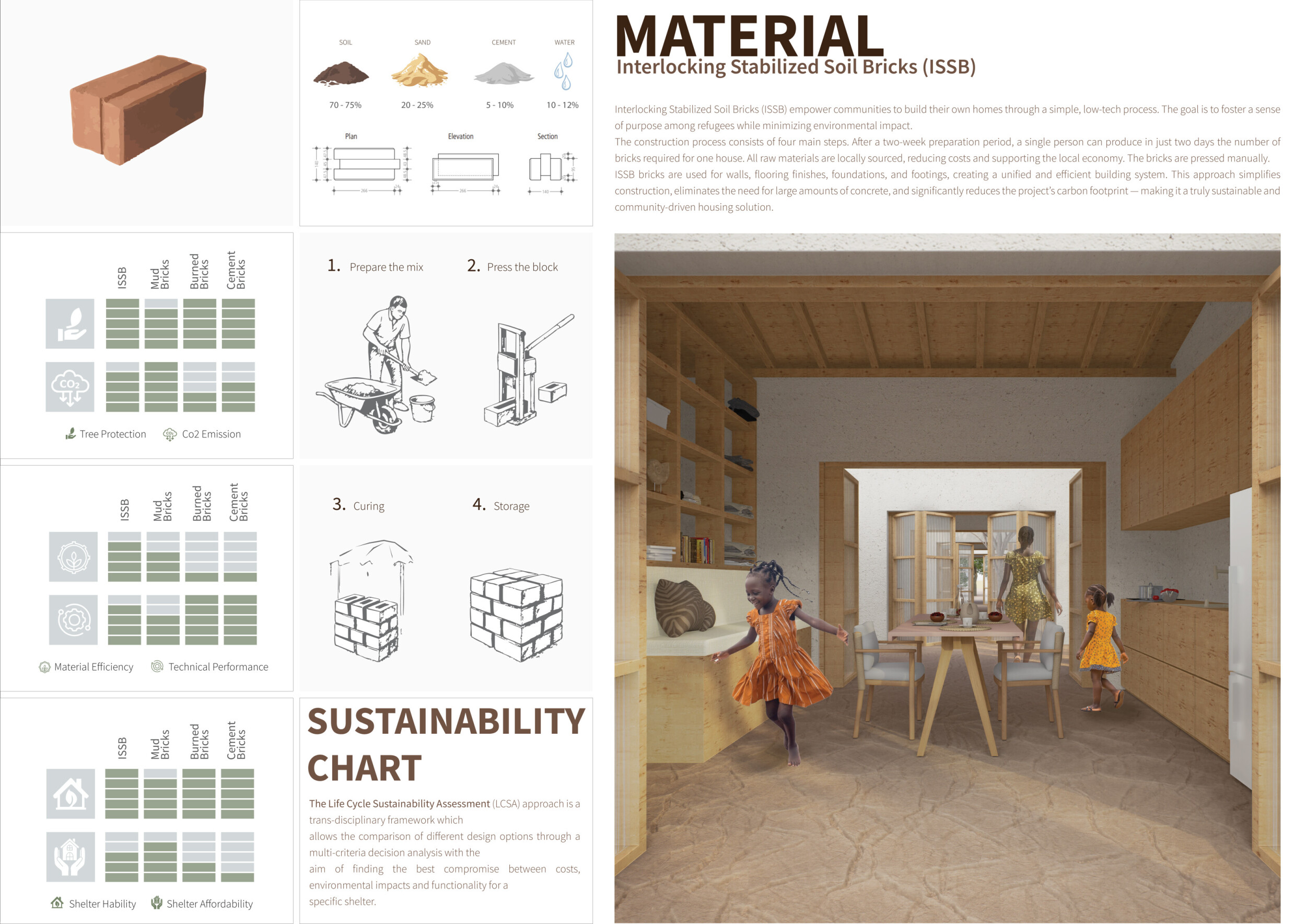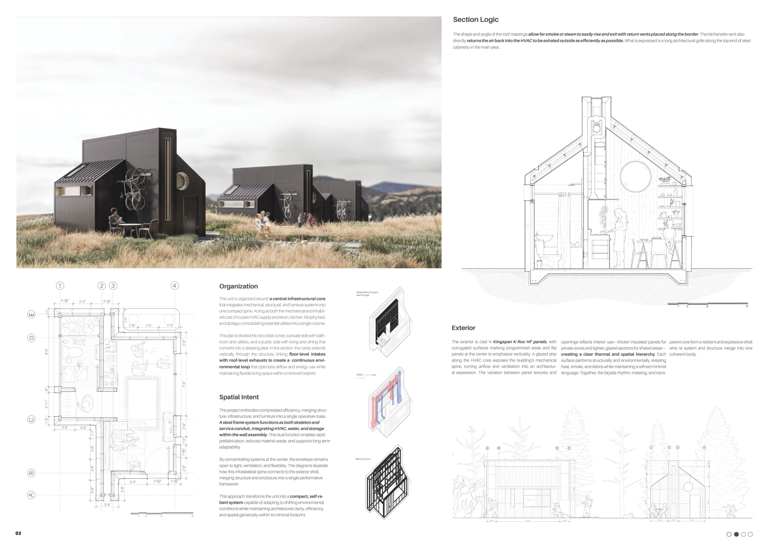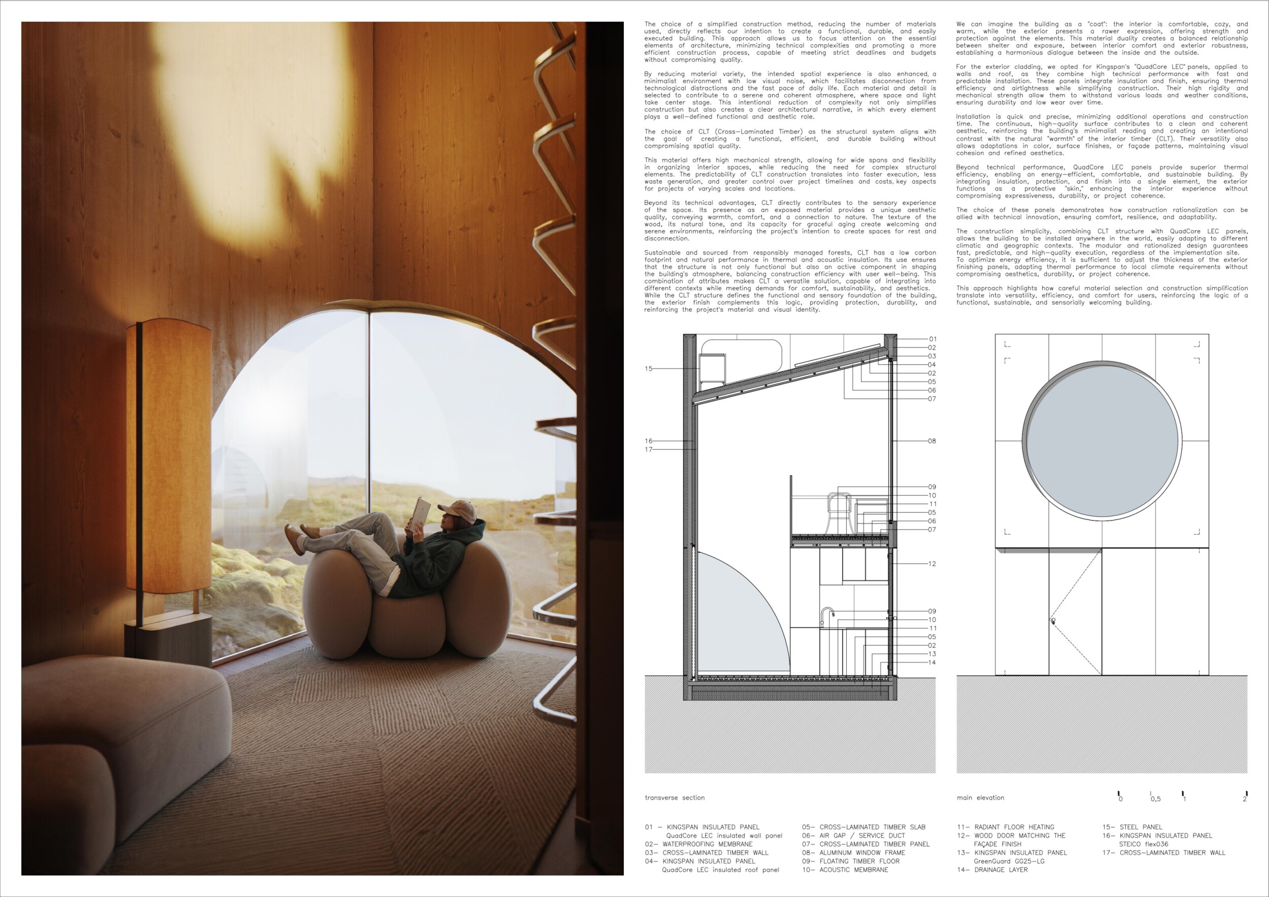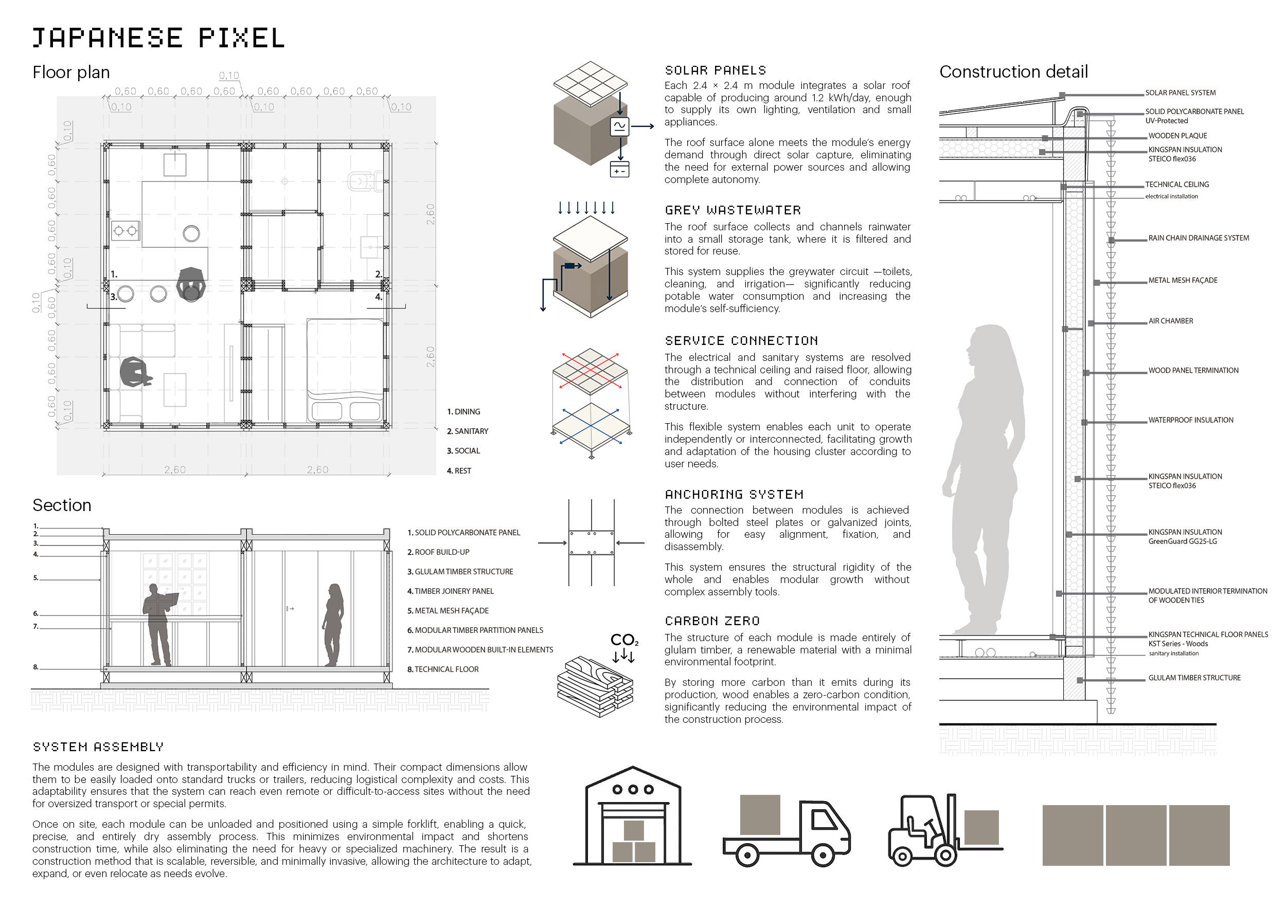 The presentation communicates a clear system that links rapid deployment with long term growth and it uses diagrams well to explain the construction sequence and the staged expansion model. The drawings are clean and precise and the exploded axonometric clarifies how the CLT shell, steel frame, and panels come together. Renderings support the narrative of resilient living although some could better highlight interior spatial quality.