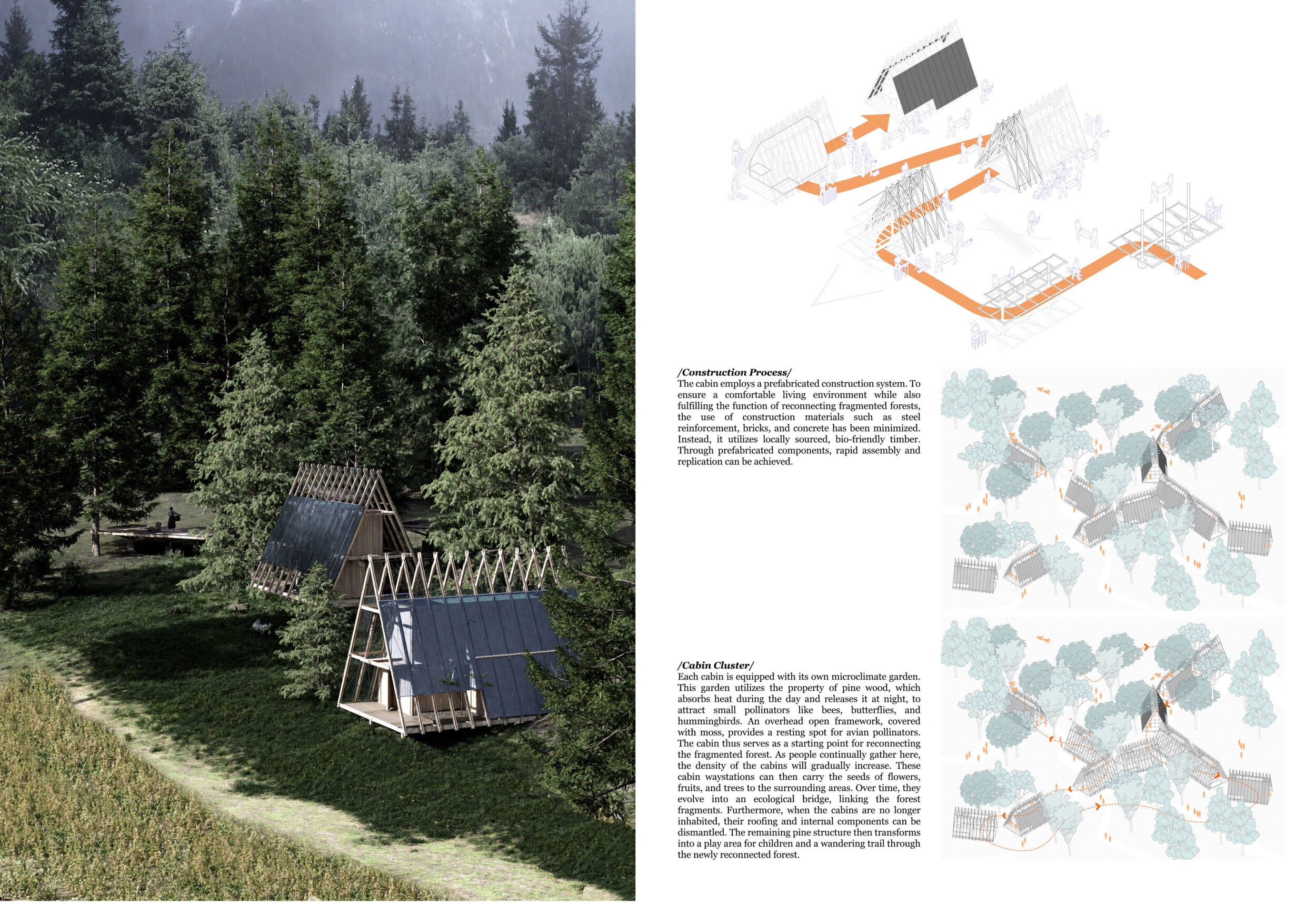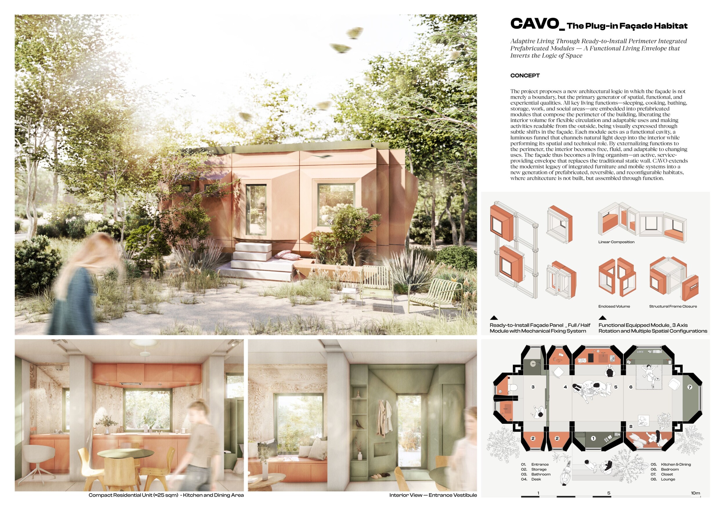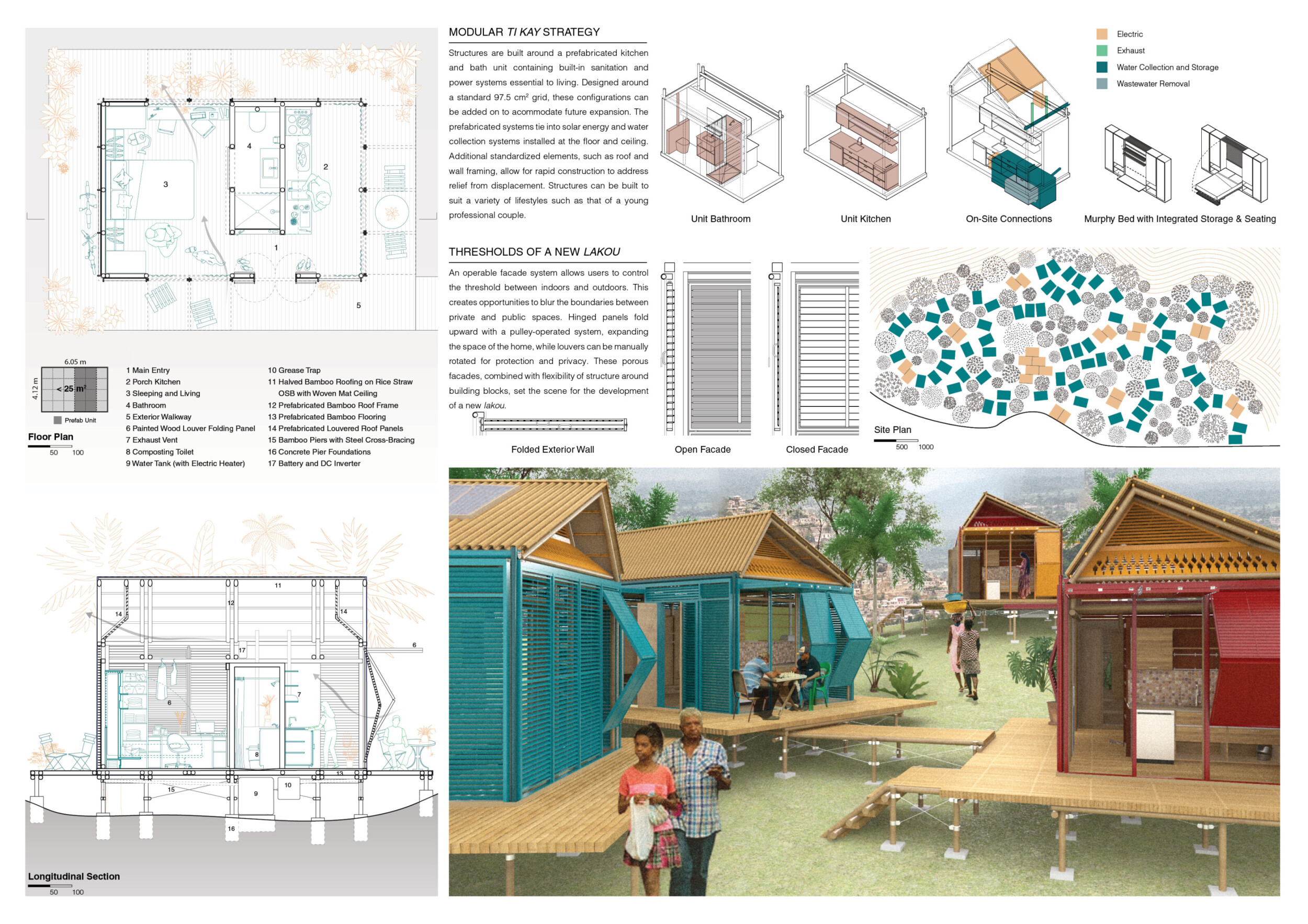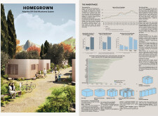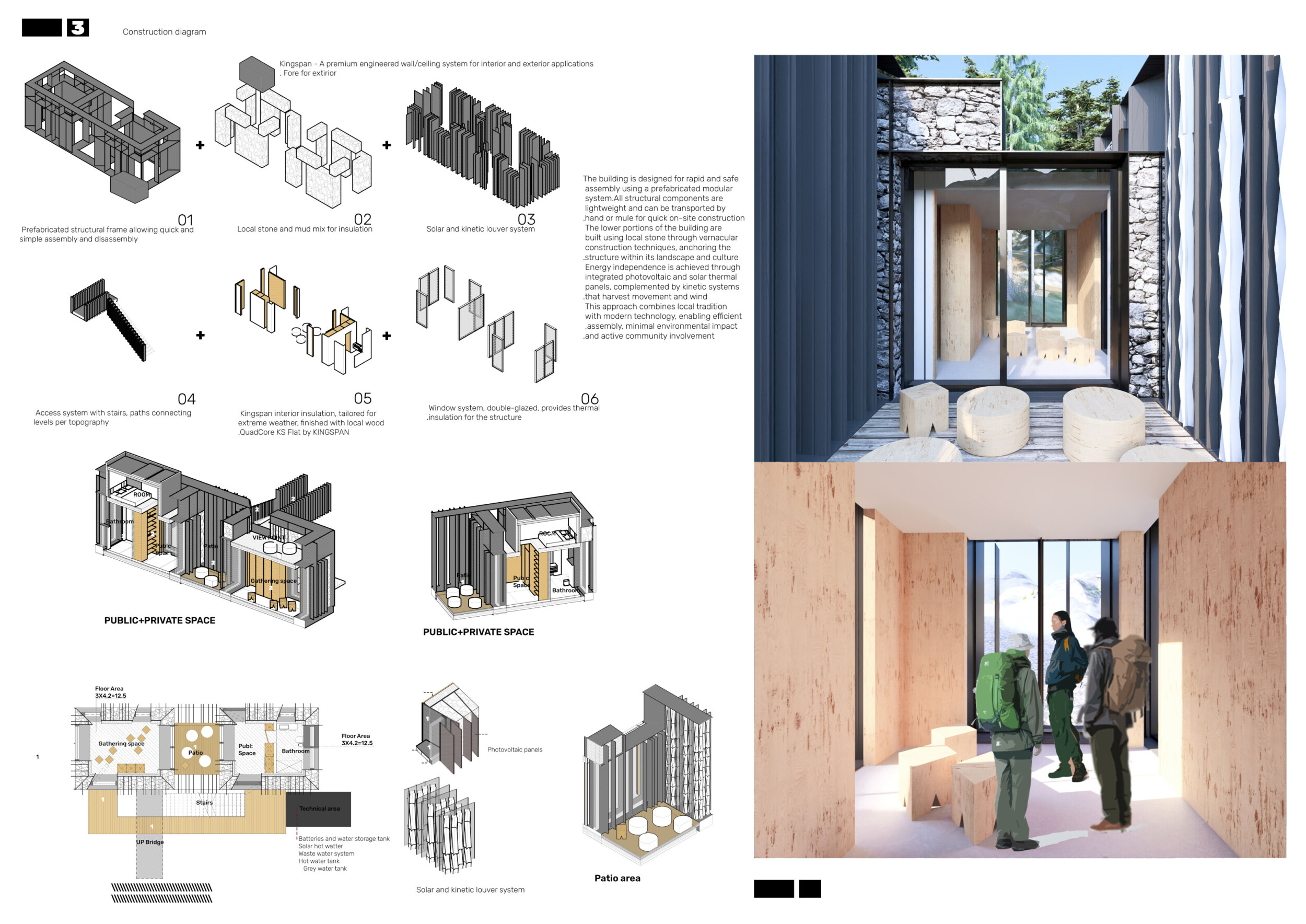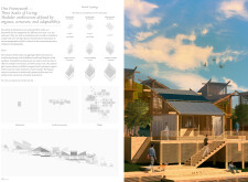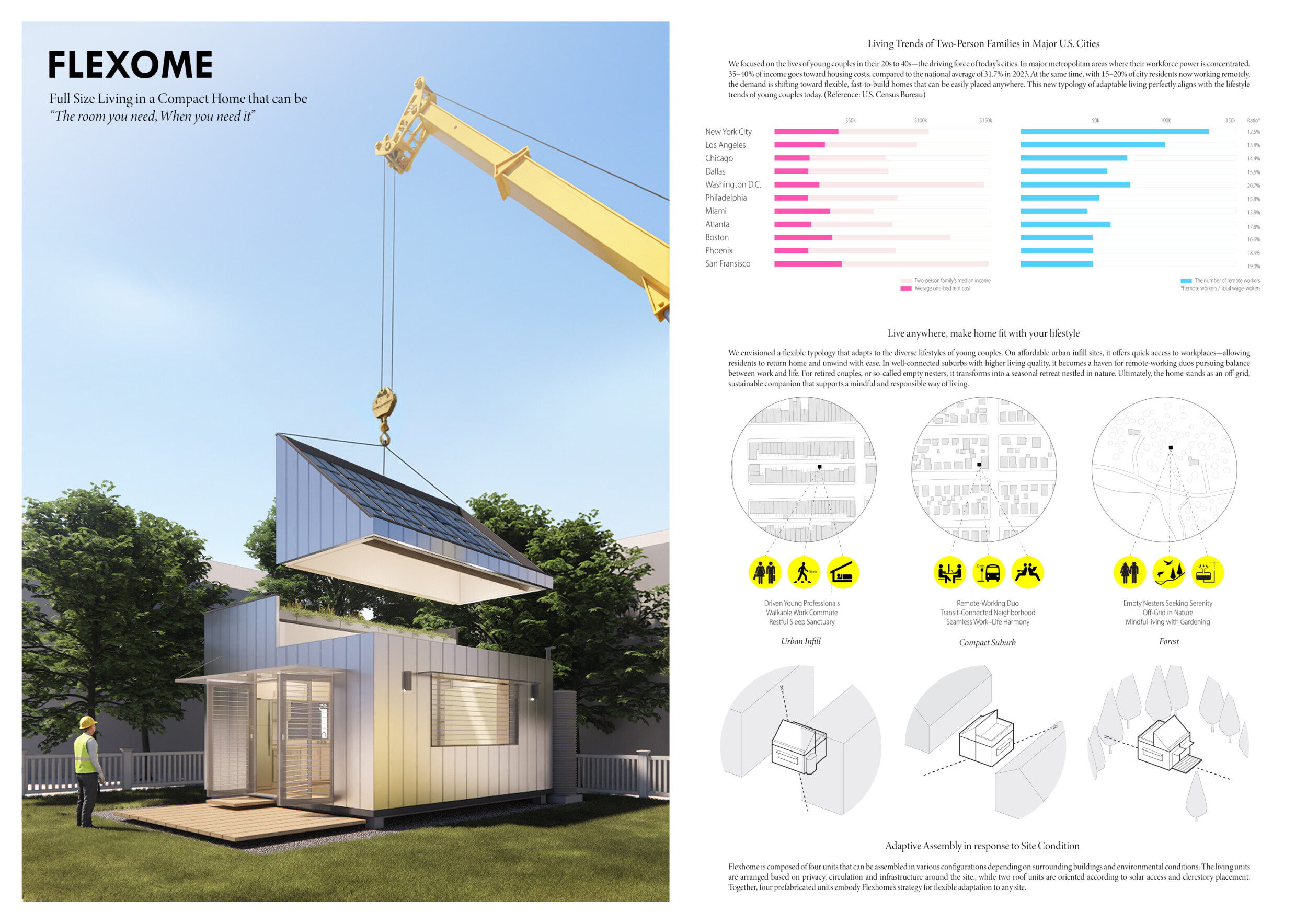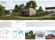 The presentation communicates a clear system that links rapid deployment with long term growth and it uses diagrams well to explain the construction sequence and the staged expansion model. The drawings are clean and precise and the exploded axonometric clarifies how the CLT shell, steel frame, and panels come together. Renderings support the narrative of resilient living although some could better highlight interior spatial quality.