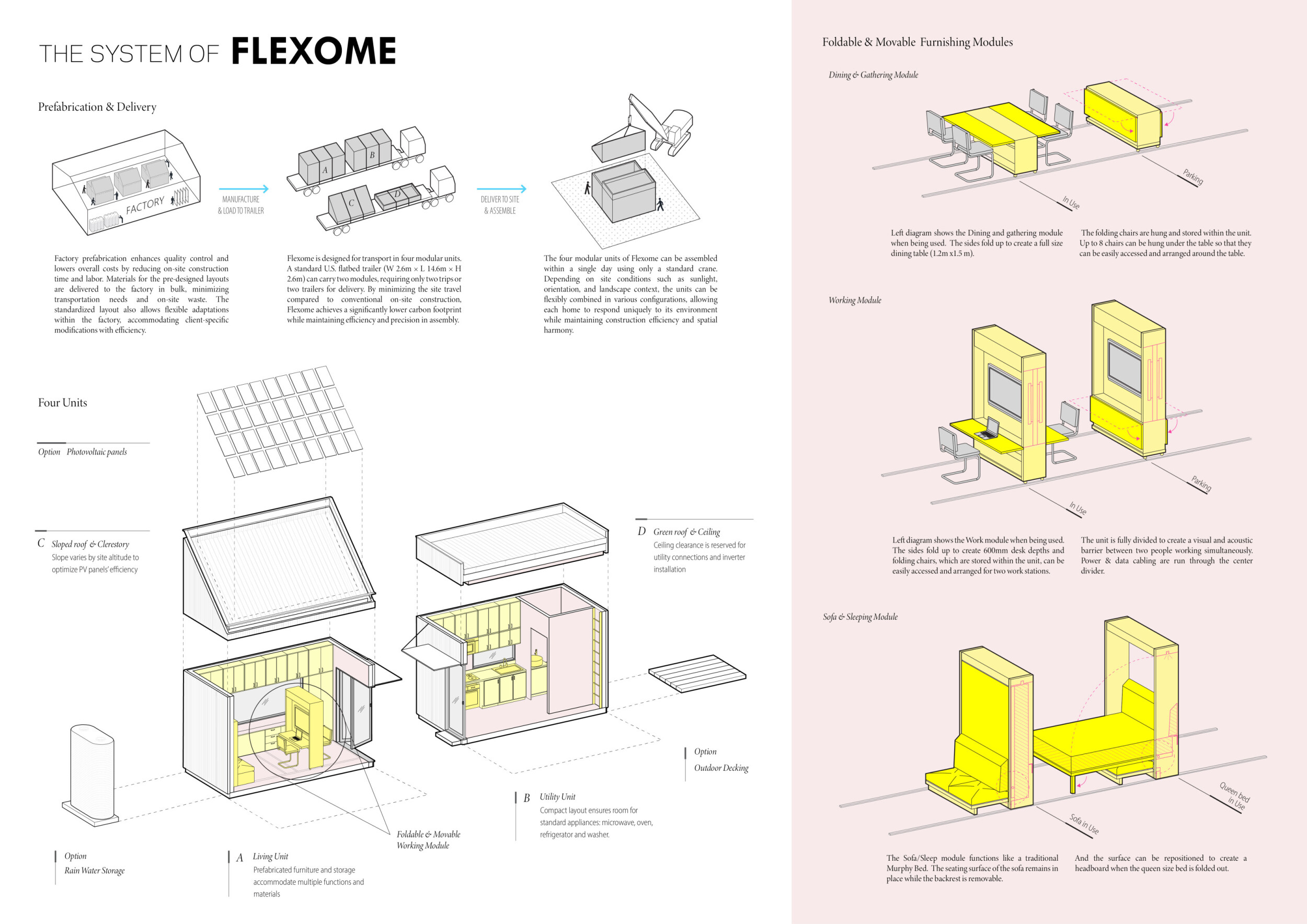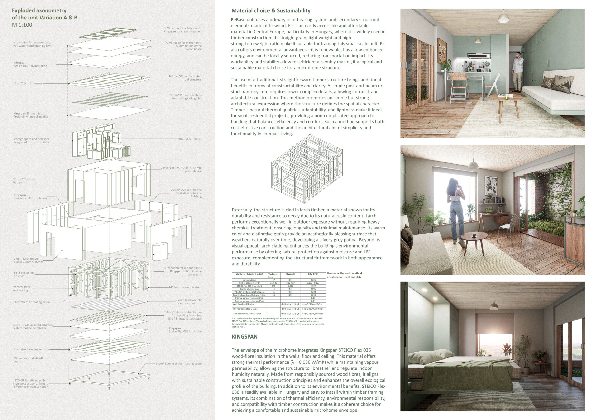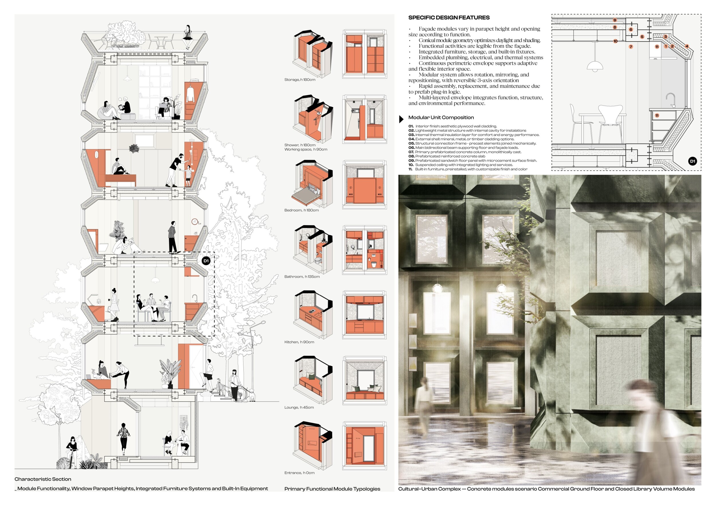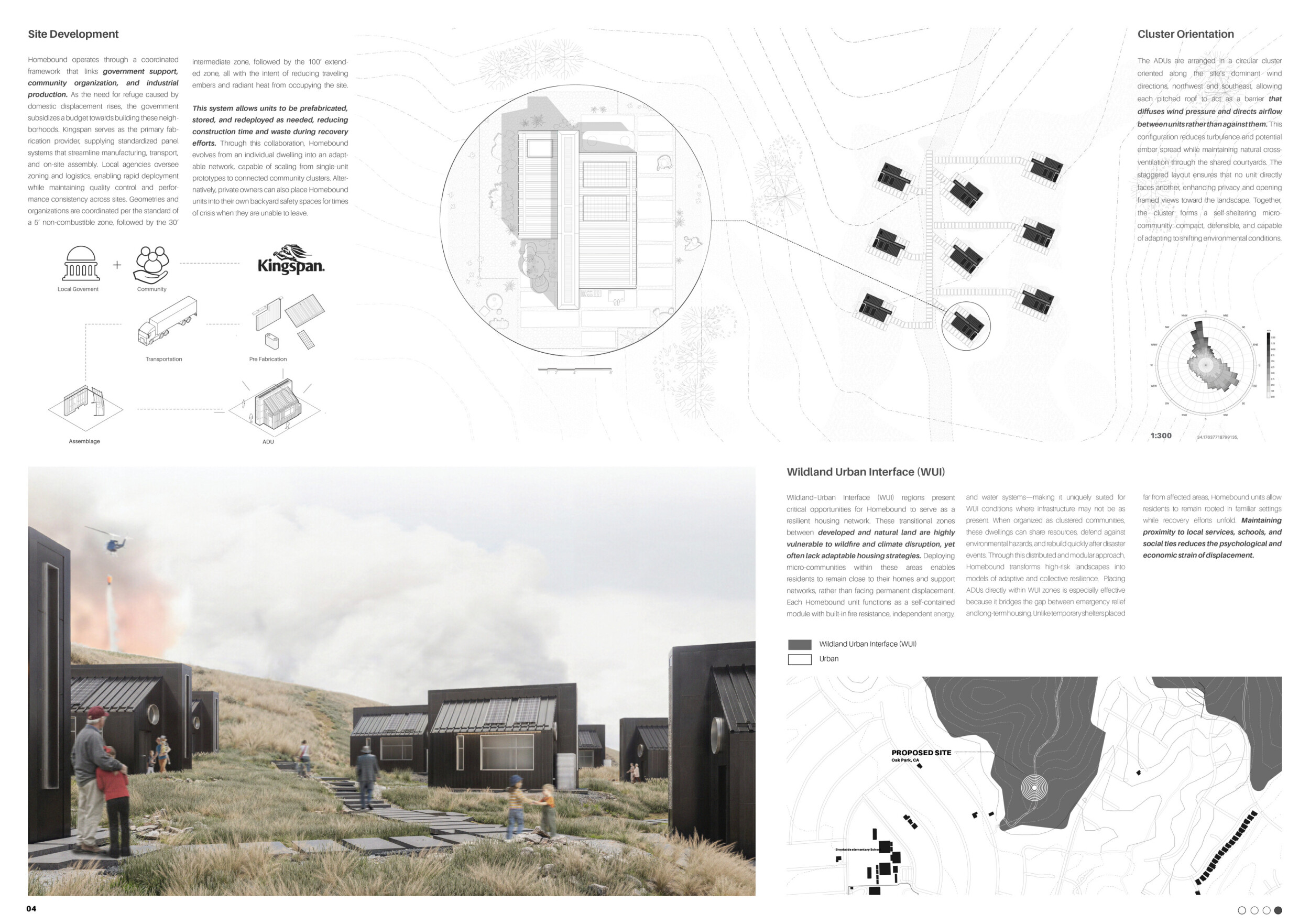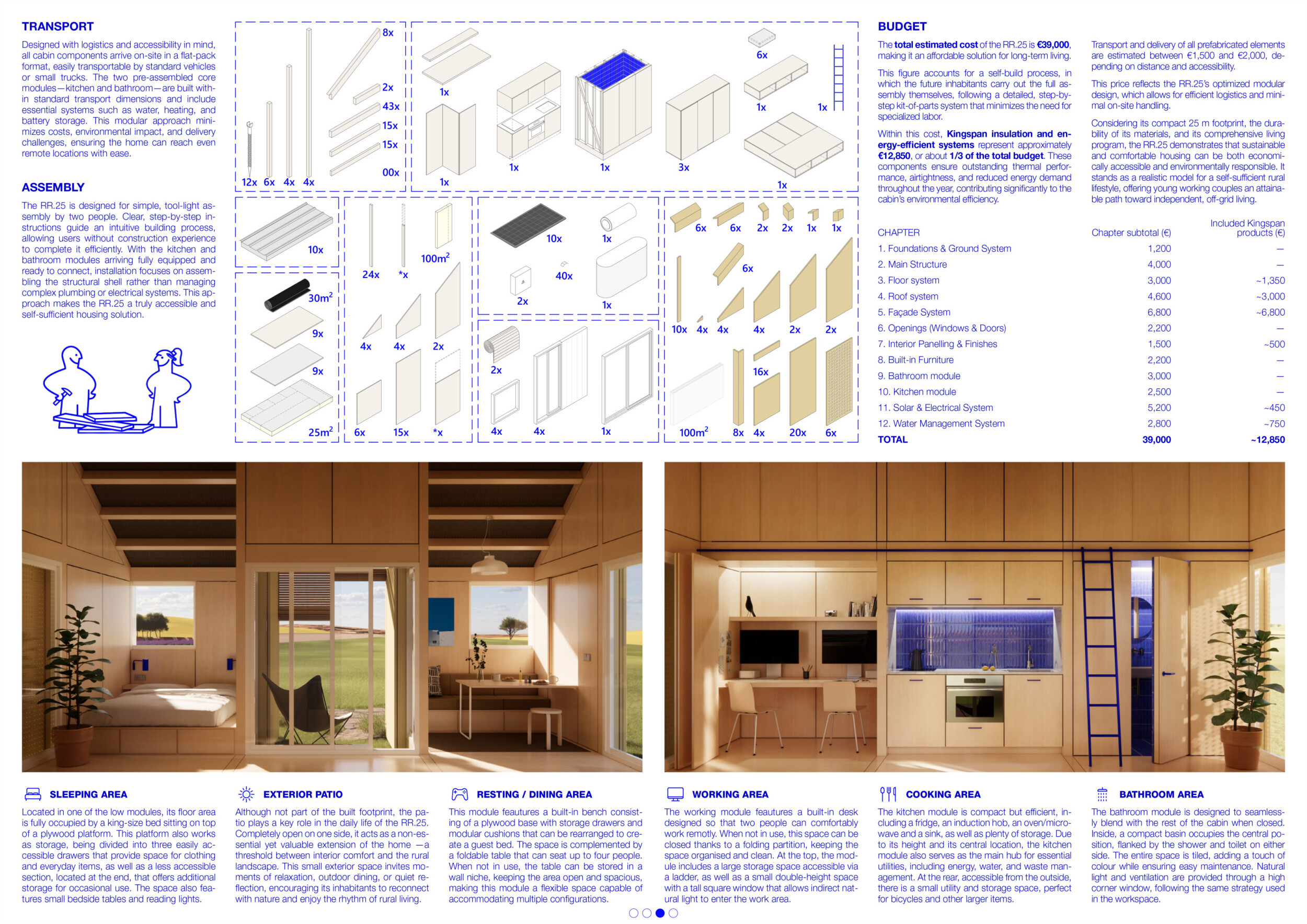 The presentation communicates a clear system that links rapid deployment with long term growth and it uses diagrams well to explain the construction sequence and the staged expansion model. The drawings are clean and precise and the exploded axonometric clarifies how the CLT shell, steel frame, and panels come together. Renderings support the narrative of resilient living although some could better highlight interior spatial quality.