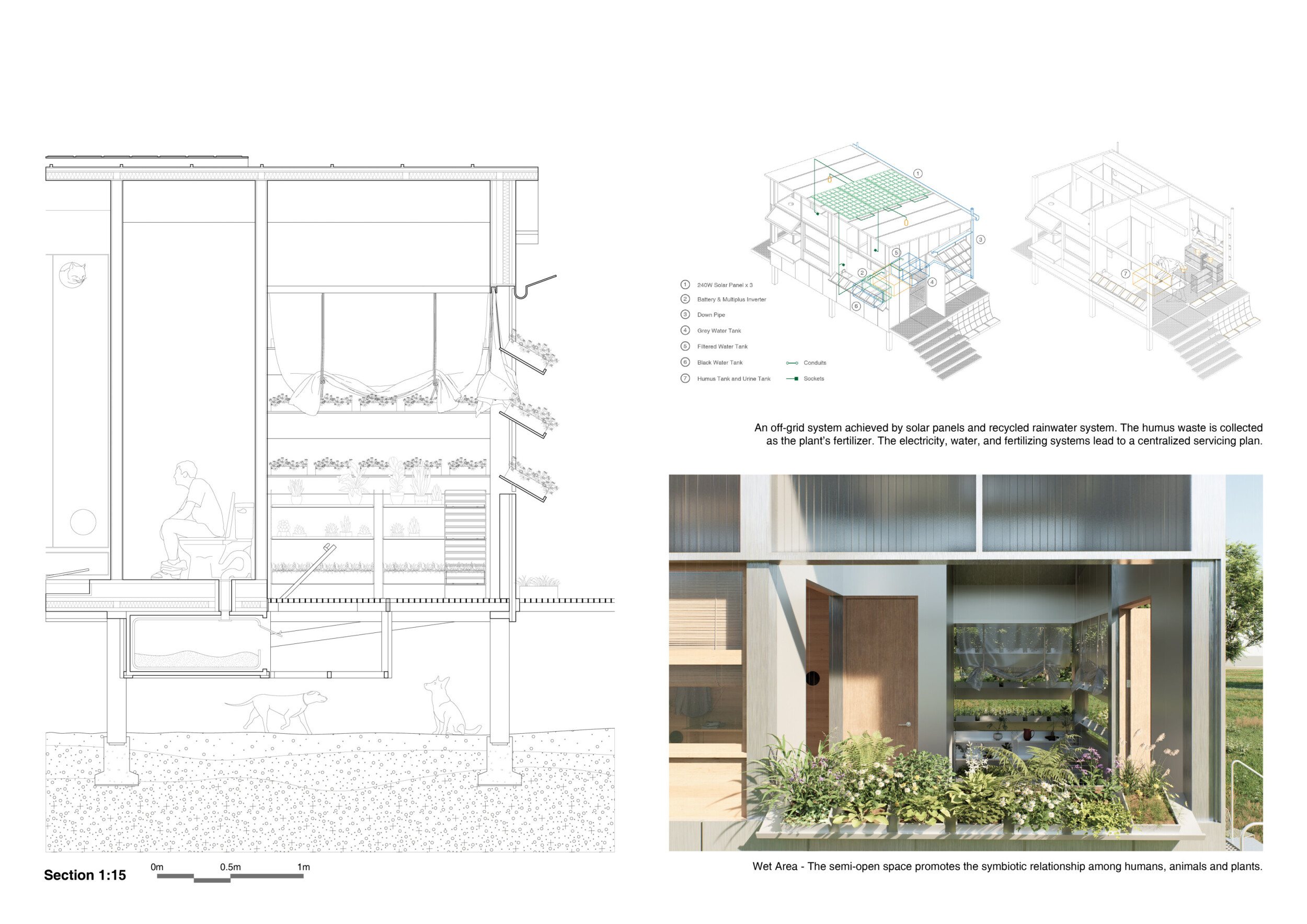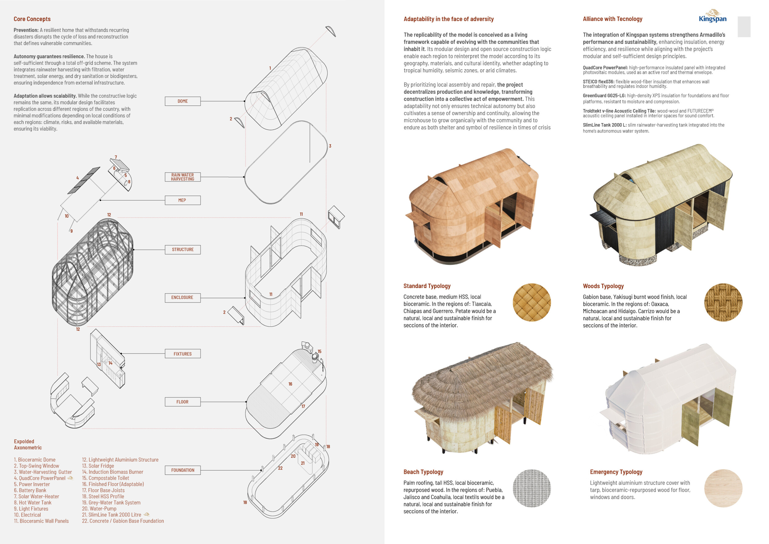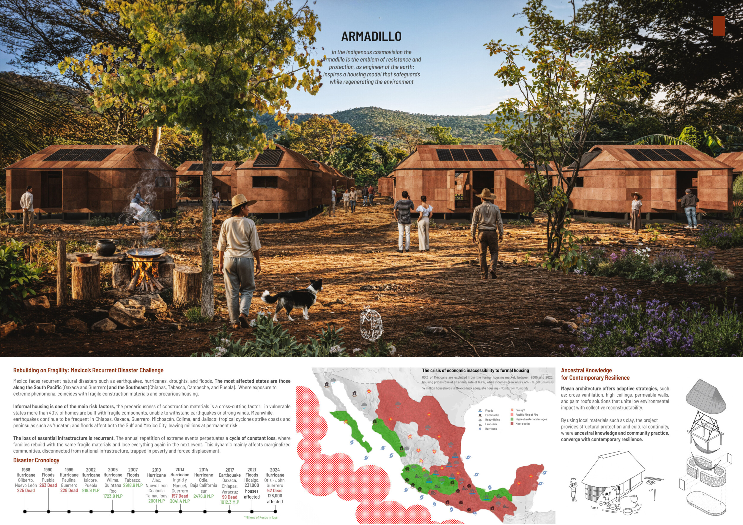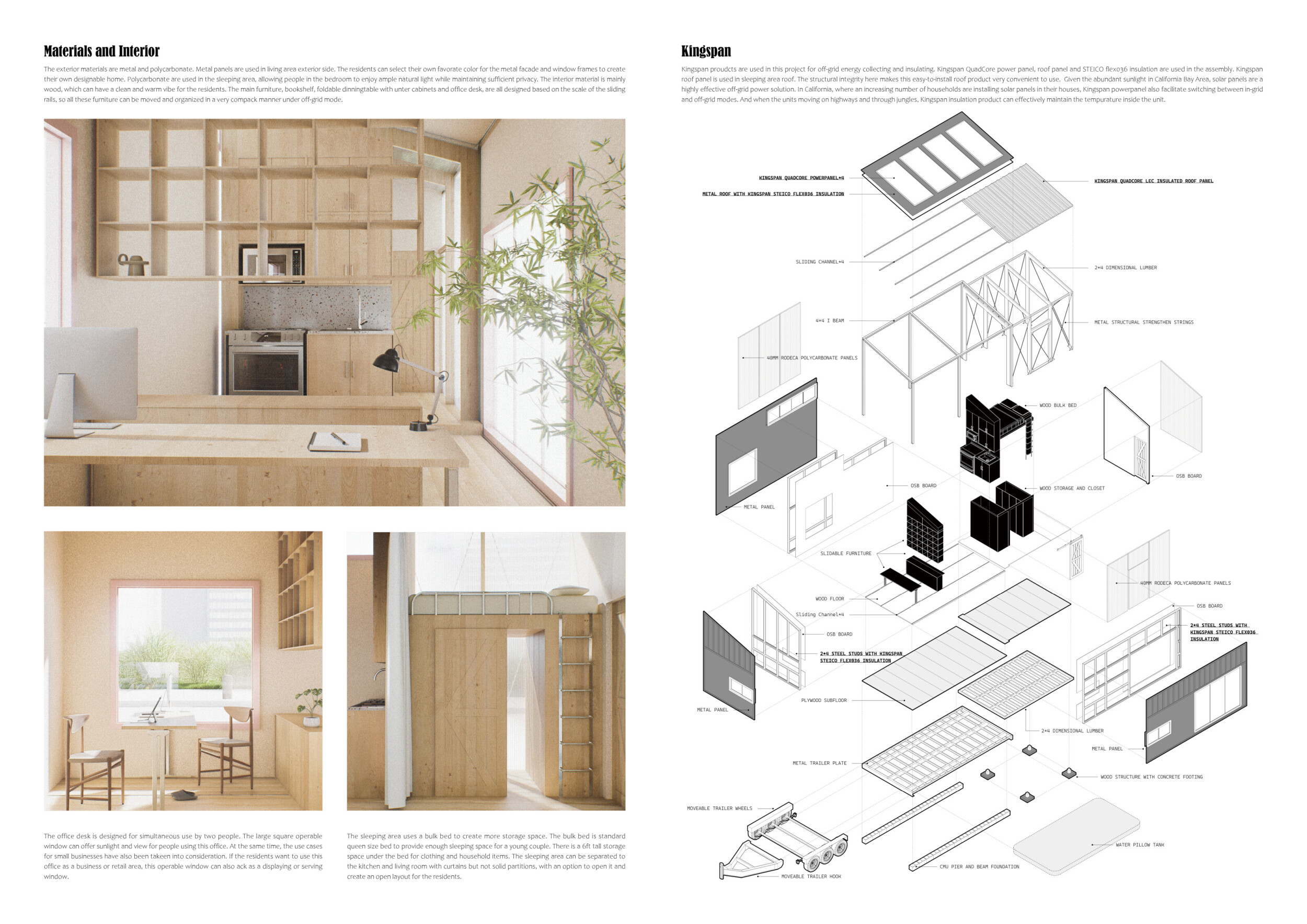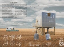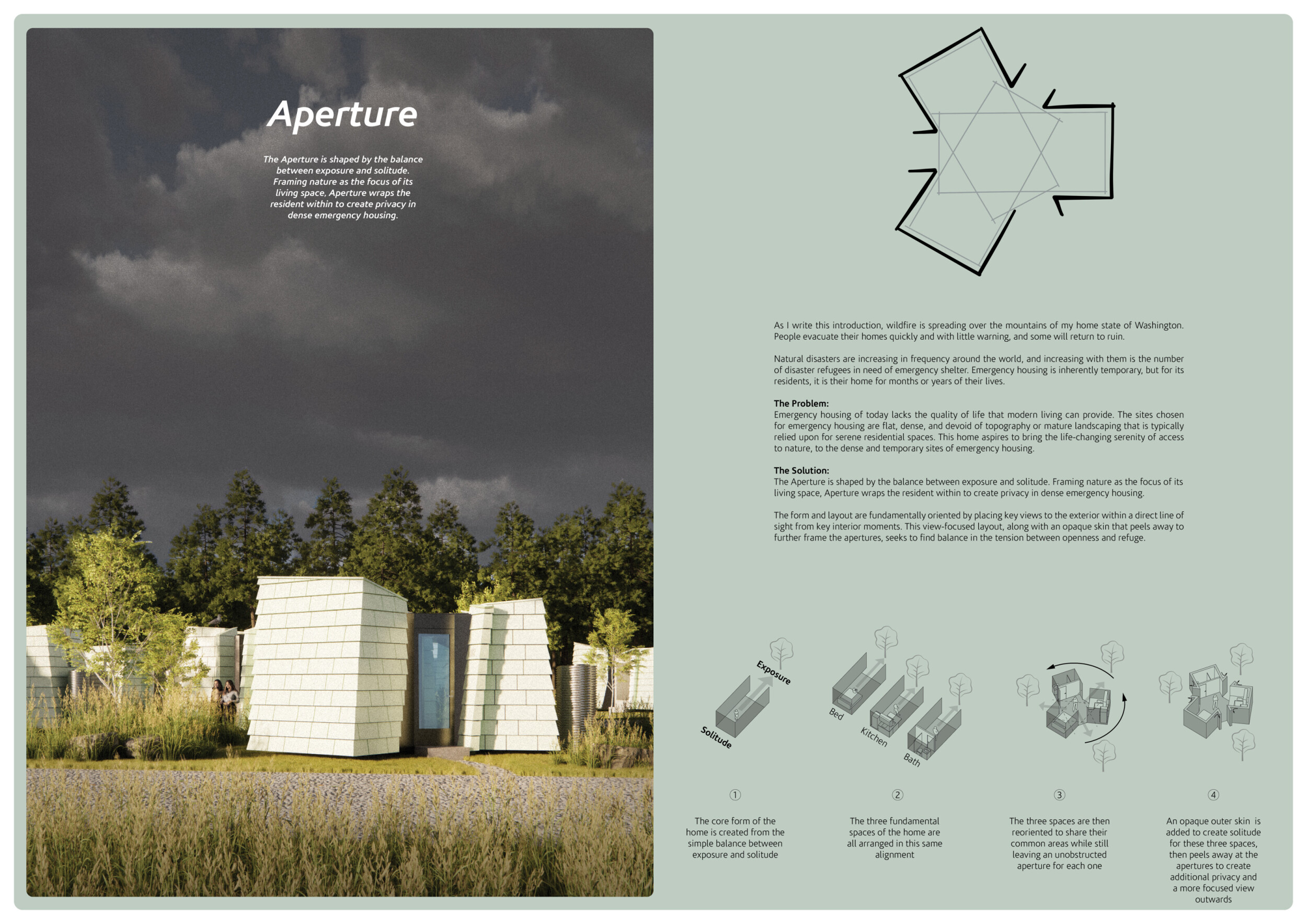 The presentation communicates a clear system that links rapid deployment with long term growth and it uses diagrams well to explain the construction sequence and the staged expansion model. The drawings are clean and precise and the exploded axonometric clarifies how the CLT shell, steel frame, and panels come together. Renderings support the narrative of resilient living although some could better highlight interior spatial quality.