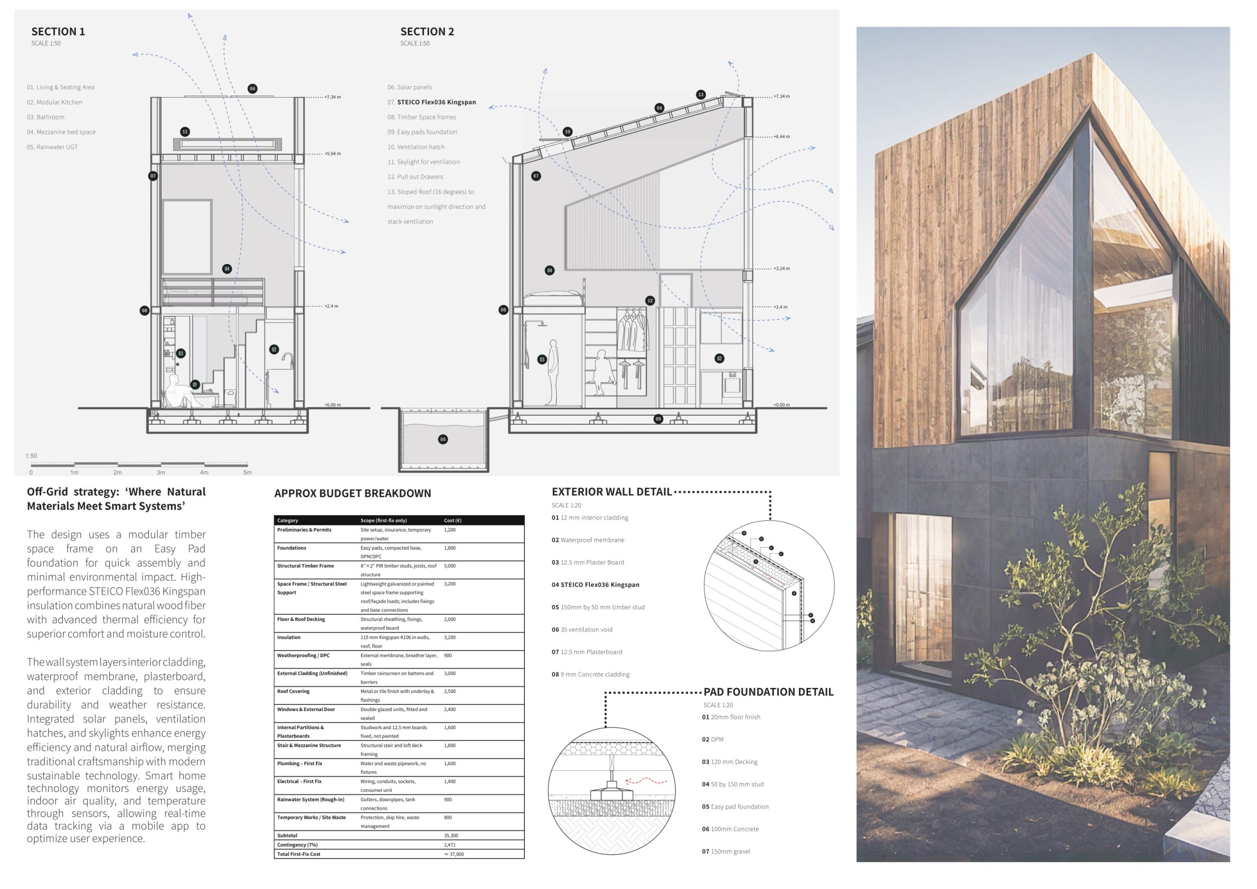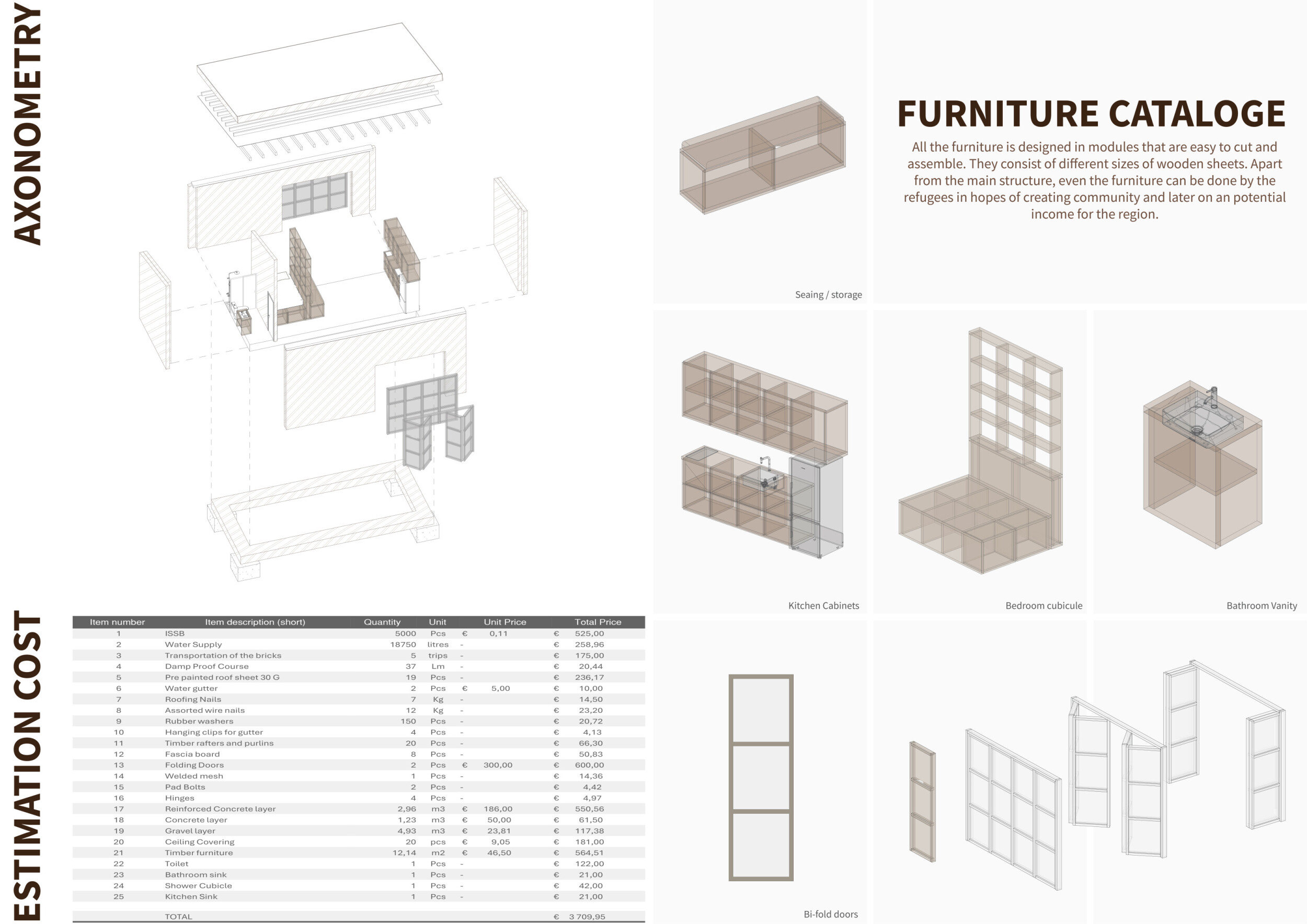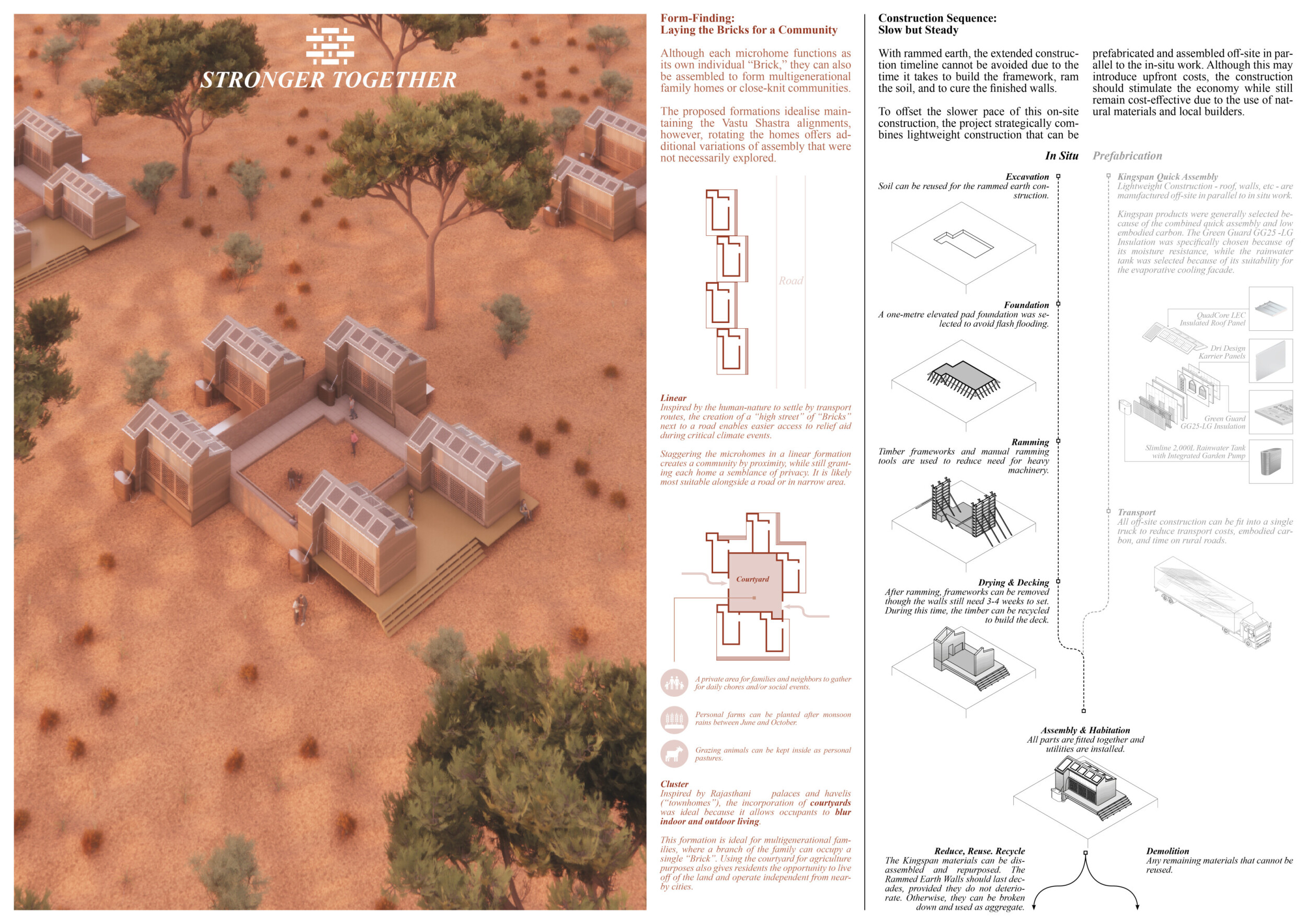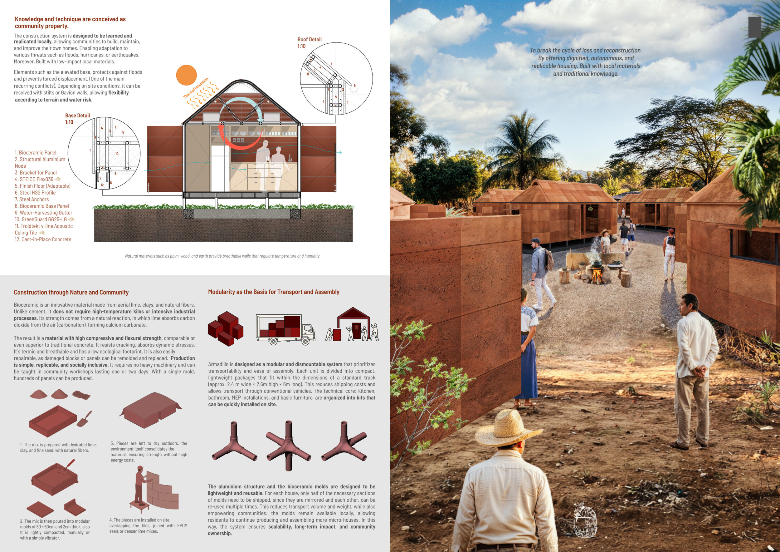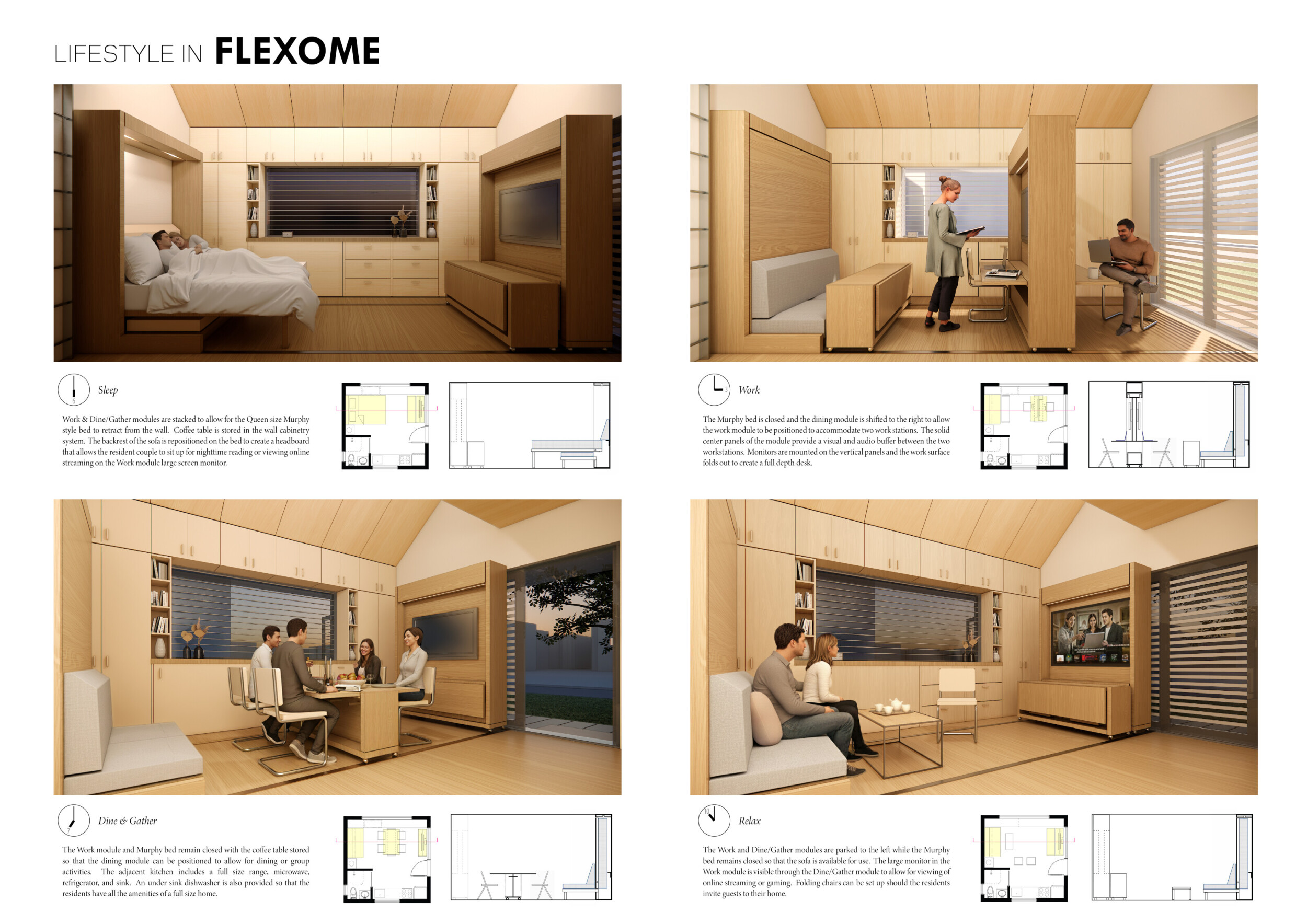 The presentation communicates a clear system that links rapid deployment with long term growth and it uses diagrams well to explain the construction sequence and the staged expansion model. The drawings are clean and precise and the exploded axonometric clarifies how the CLT shell, steel frame, and panels come together. Renderings support the narrative of resilient living although some could better highlight interior spatial quality.