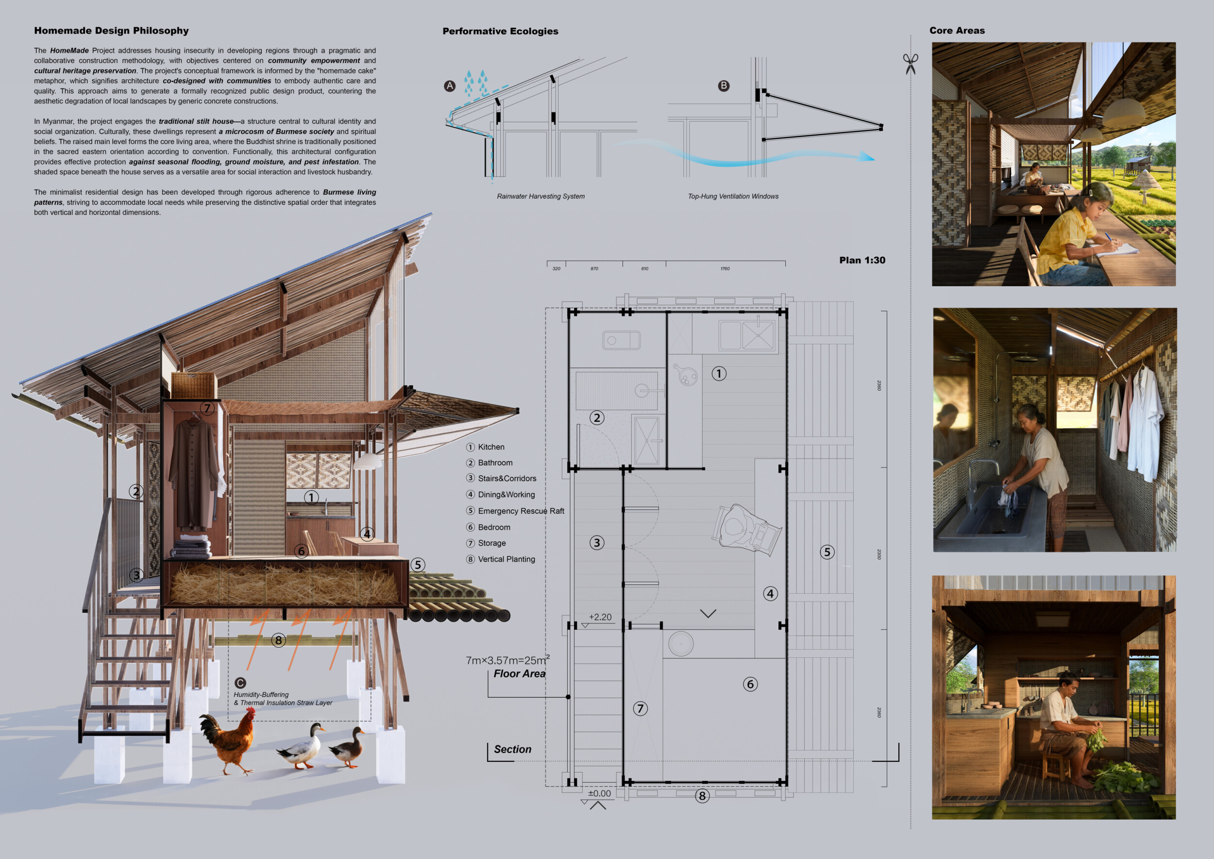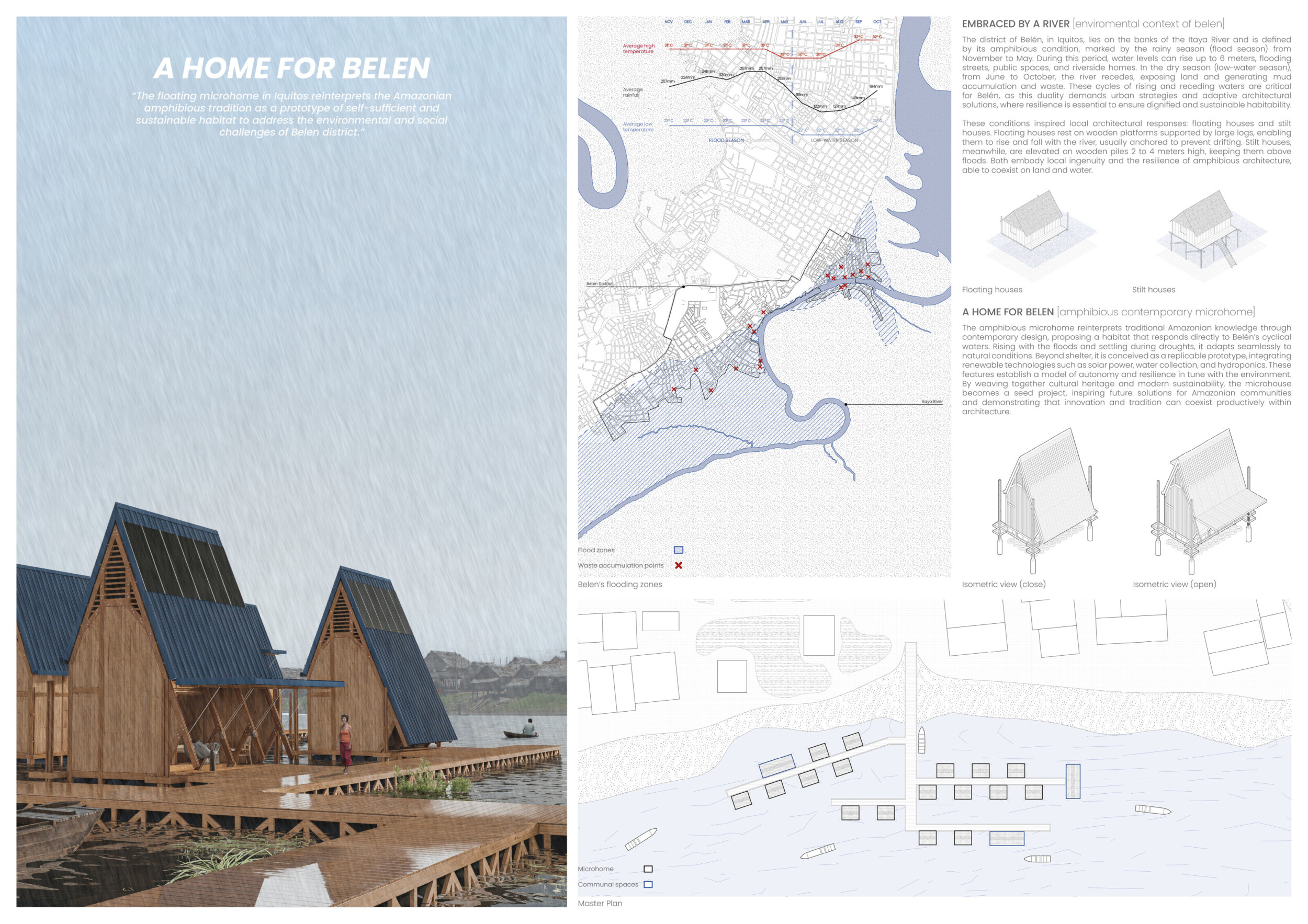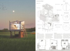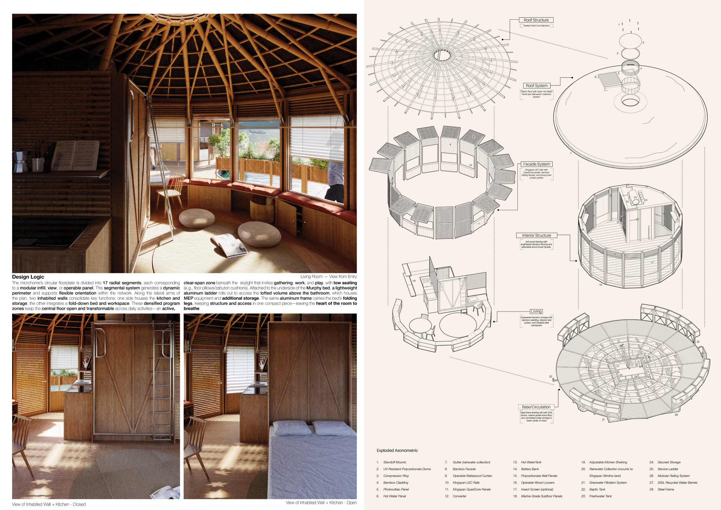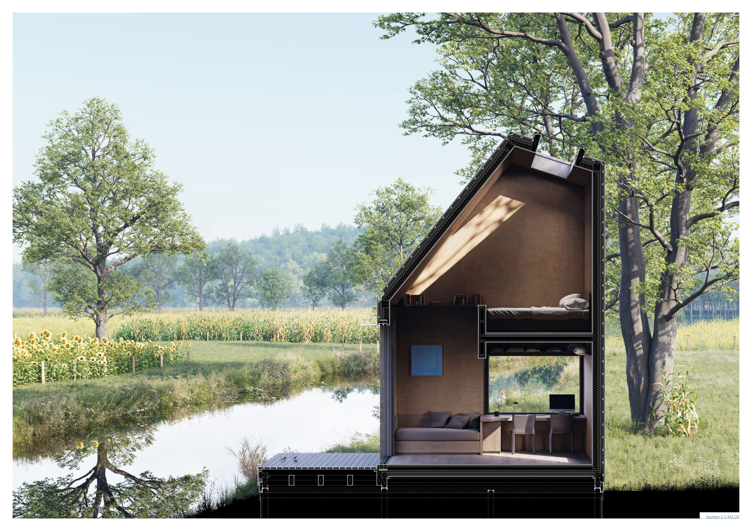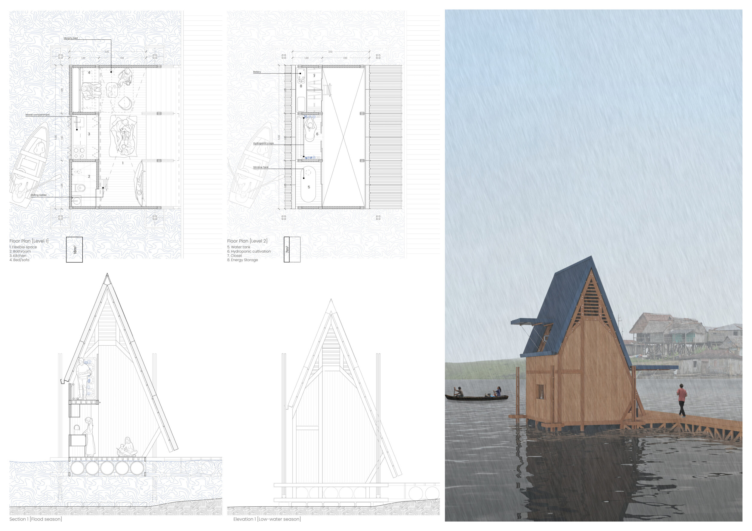 This amphibious microhome prototype proposes a circular, modular dwelling designed for communities along the Mekong Basin where seasonal flooding shapes daily life. The unit floats during high water and stabilizes on a simple frame at low water, creating a resilient habitat that adapts to shifting conditions without relying on heavy infrastructure.