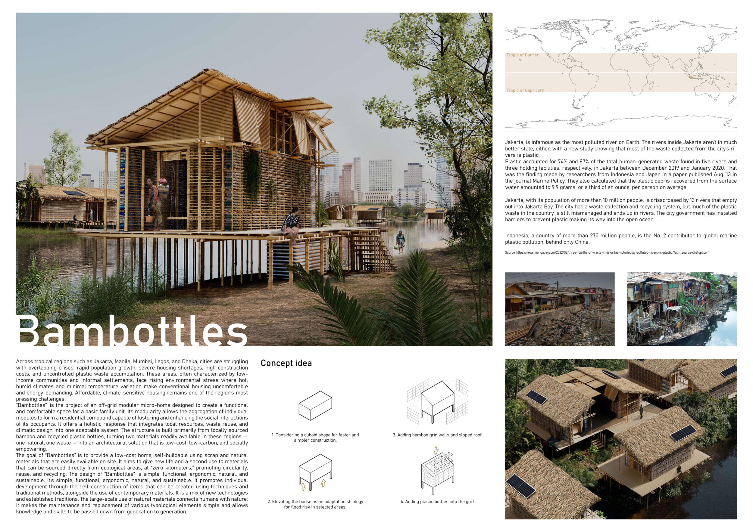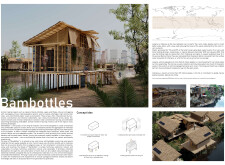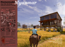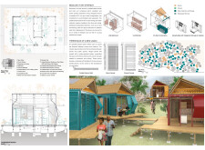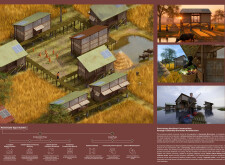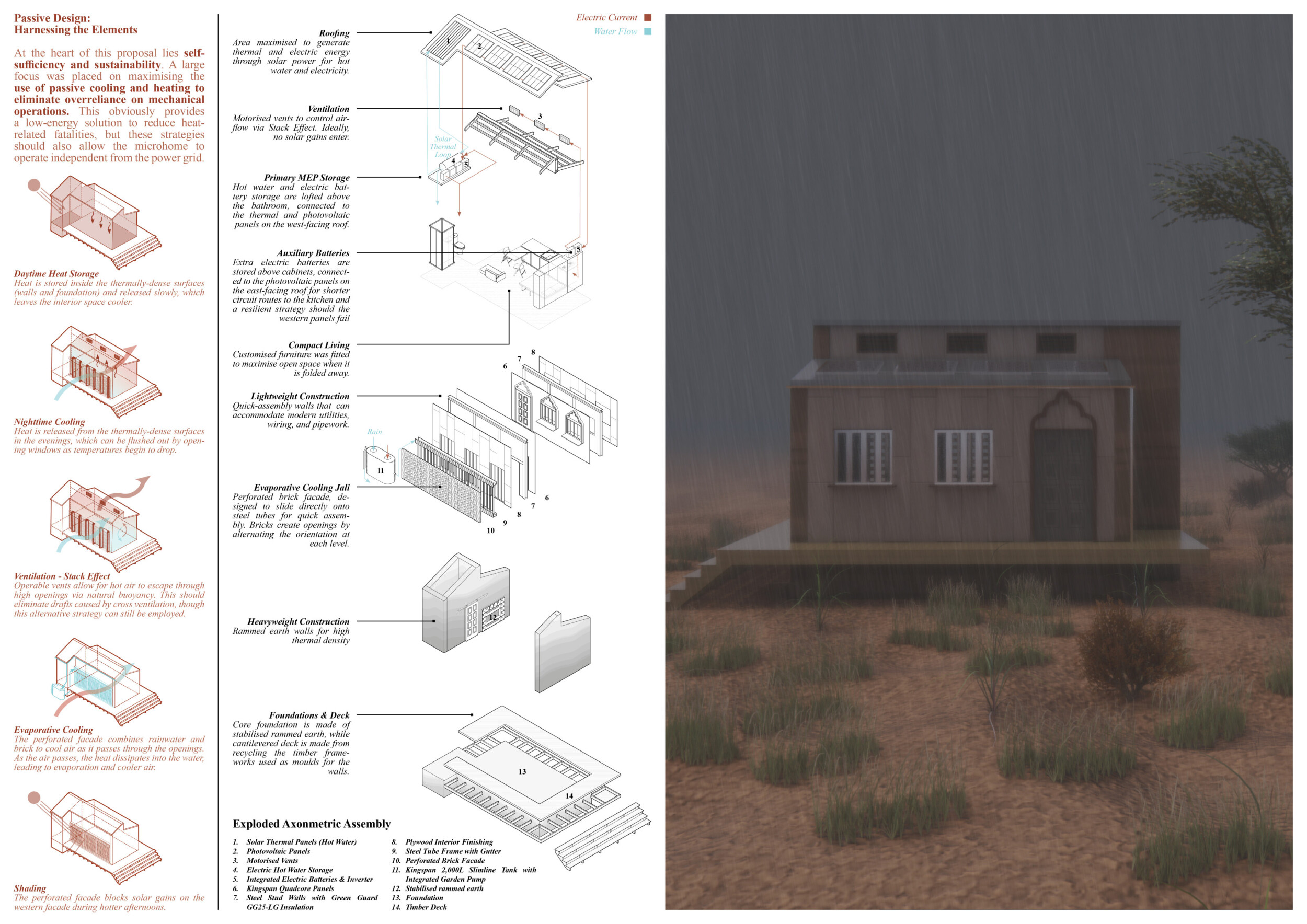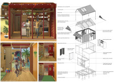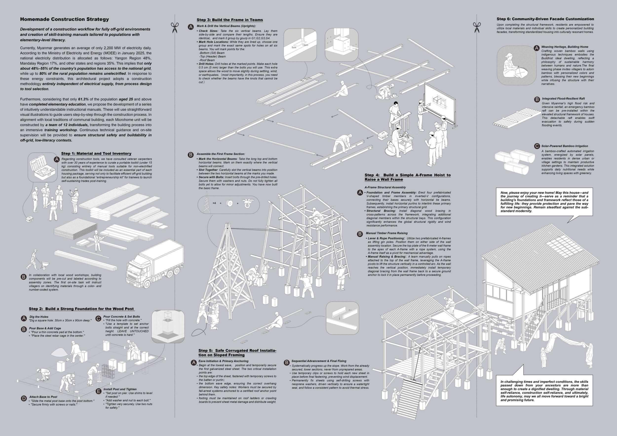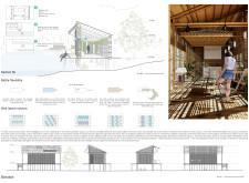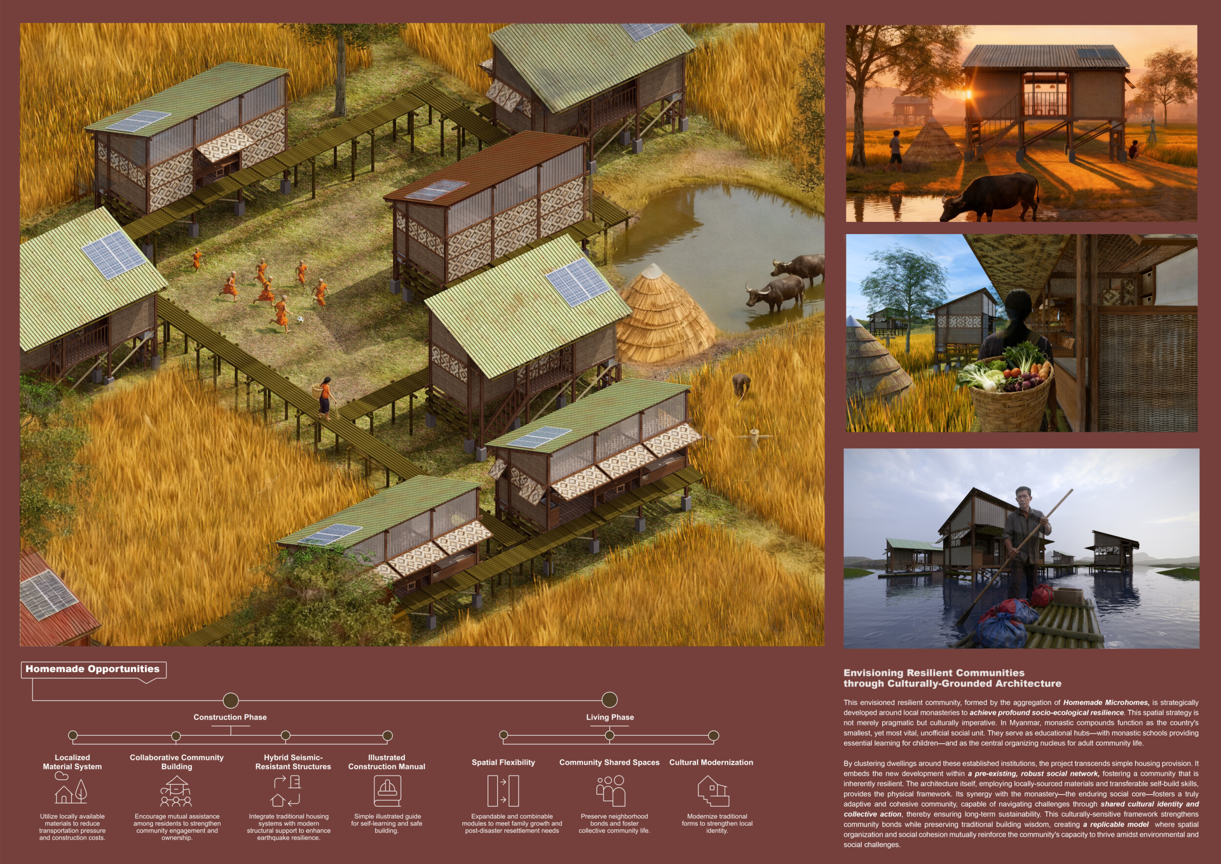 This amphibious microhome prototype proposes a circular, modular dwelling designed for communities along the Mekong Basin where seasonal flooding shapes daily life. The unit floats during high water and stabilizes on a simple frame at low water, creating a resilient habitat that adapts to shifting conditions without relying on heavy infrastructure.