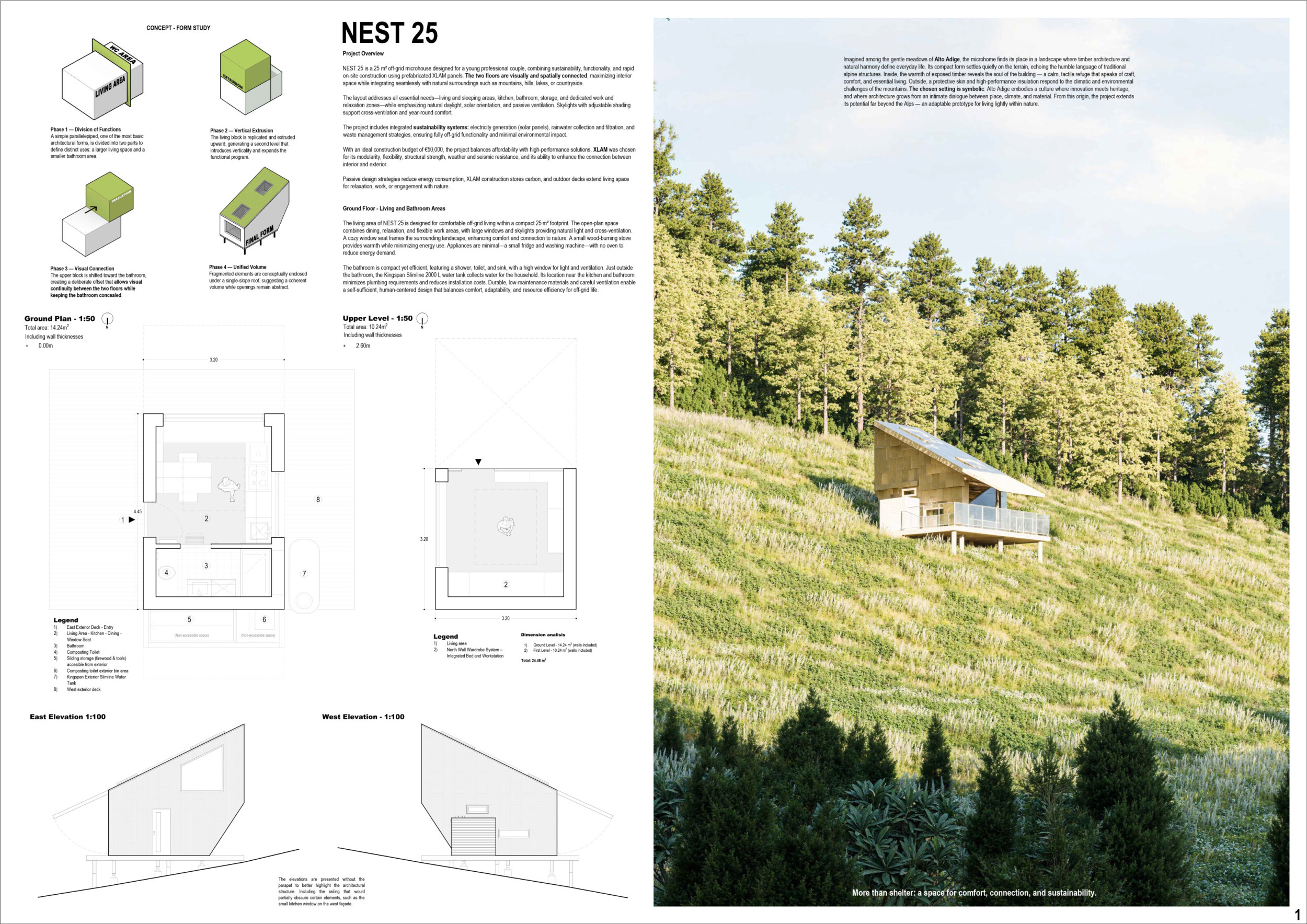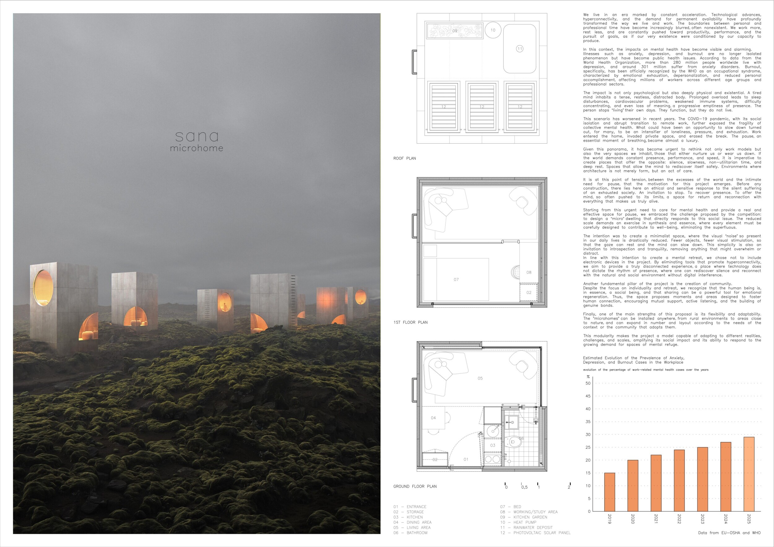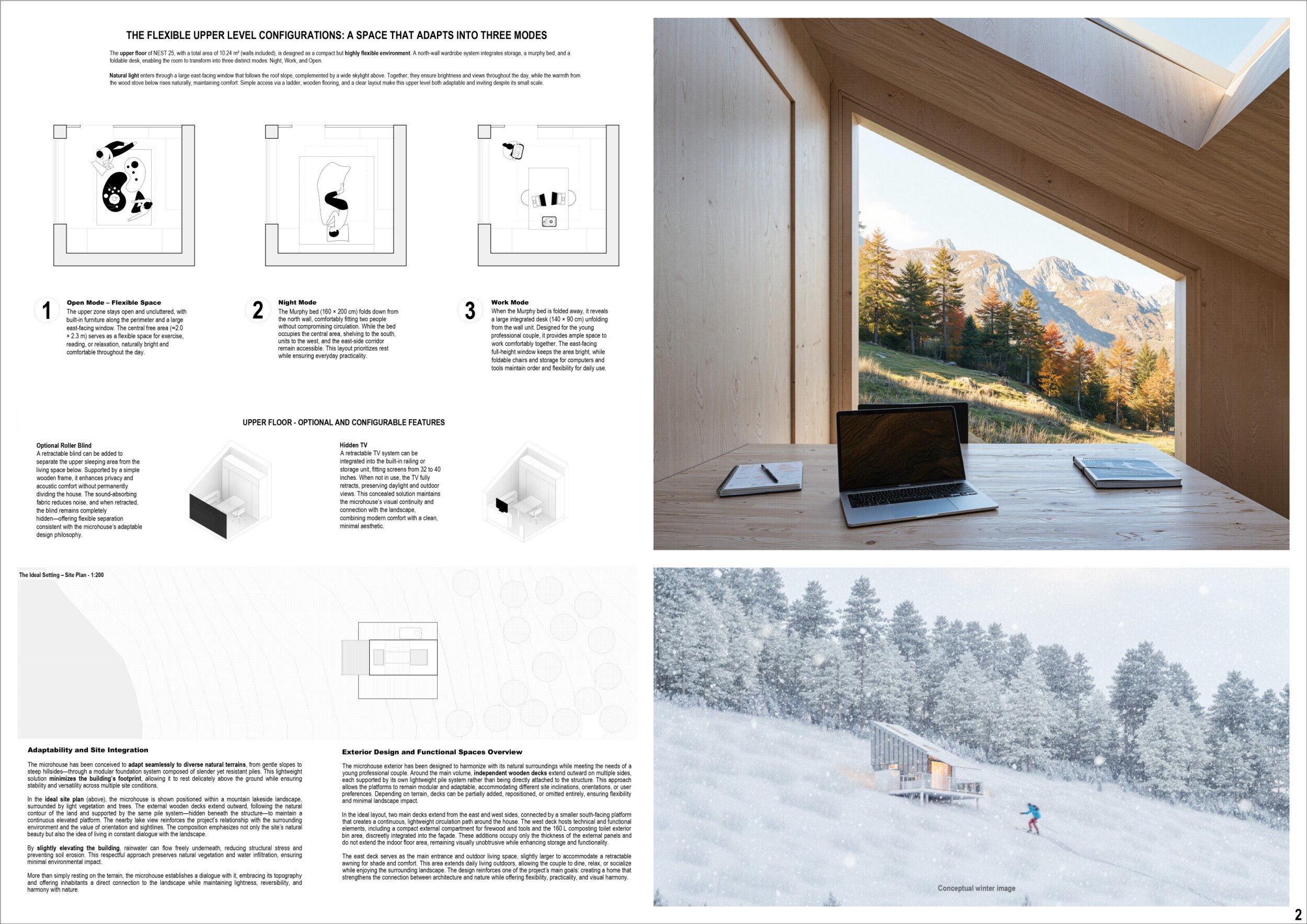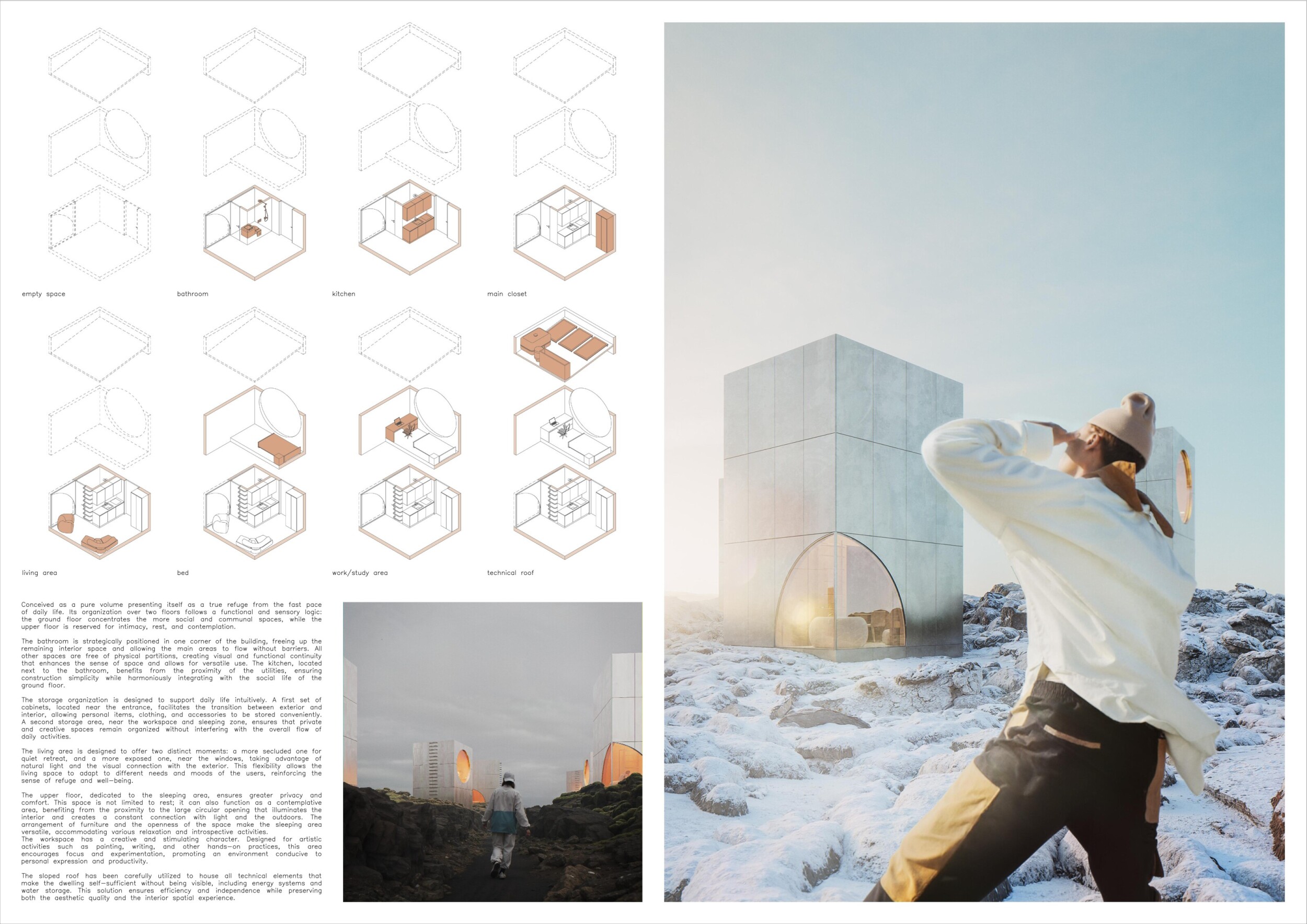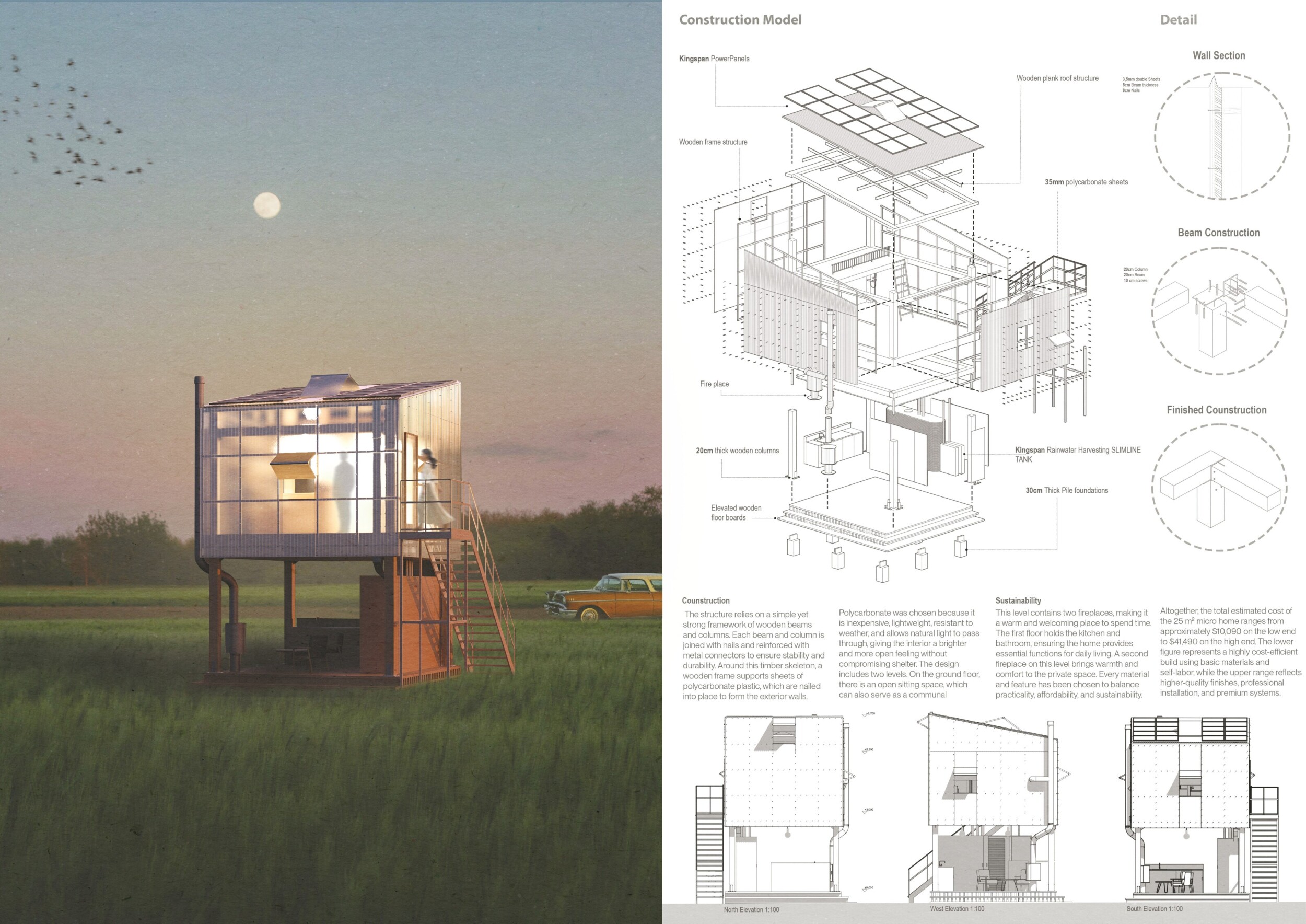 The brief challenged participants to design an off-grid modular dwelling of no more than 25 m² for a hypothetical young professional couple. Entrants were encouraged to treat the microhome as a prototype—compact yet dignified, efficient yet expressive, technologically advanced yet economically viable. No geographical constraints were imposed; participants were free to situate their proposals in any climate or cultural setting, provided the design responded rigorously to environmental, social, and technical conditions.