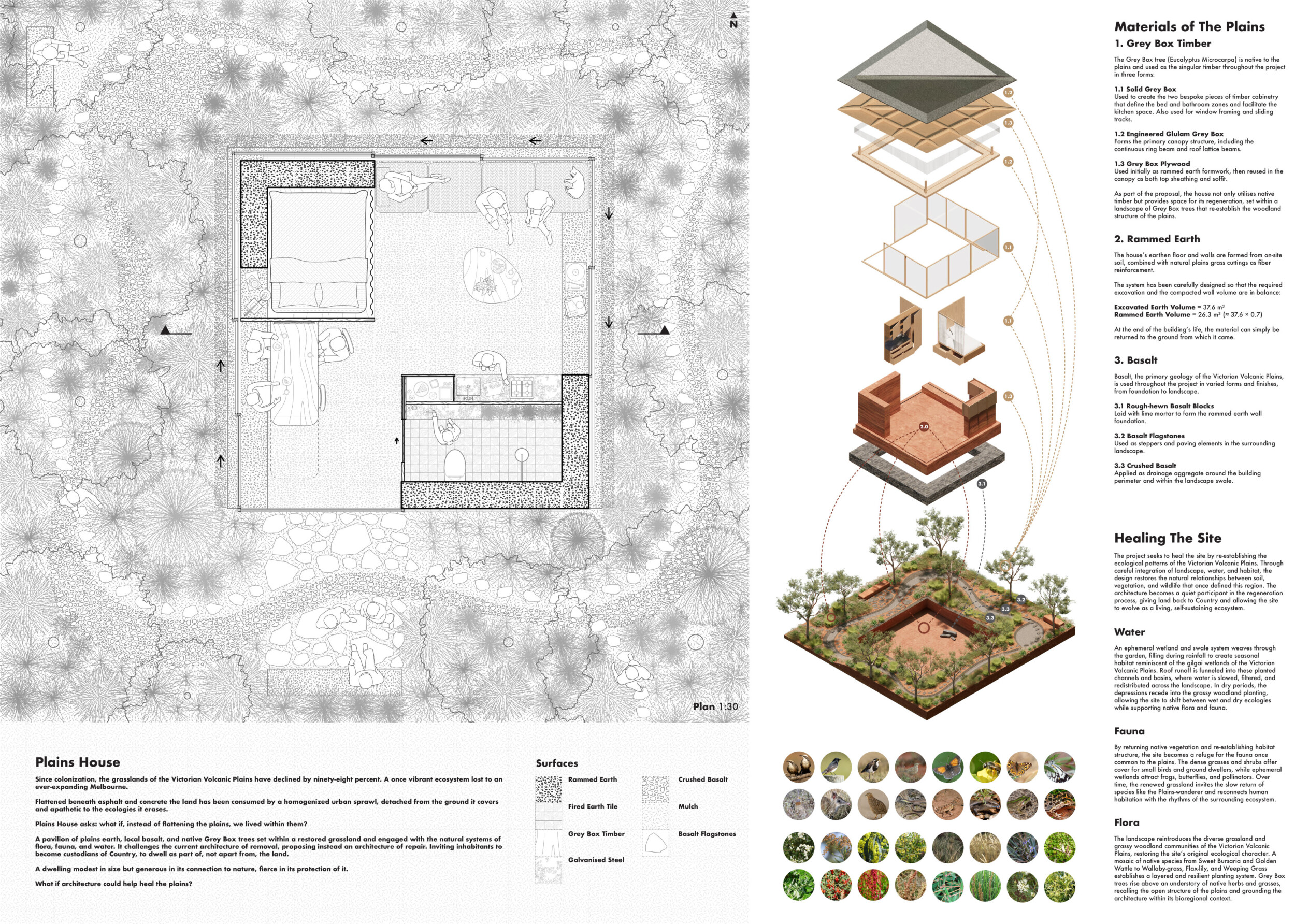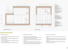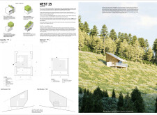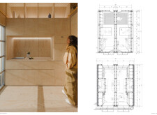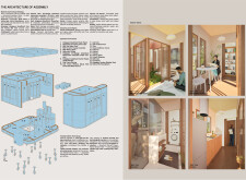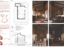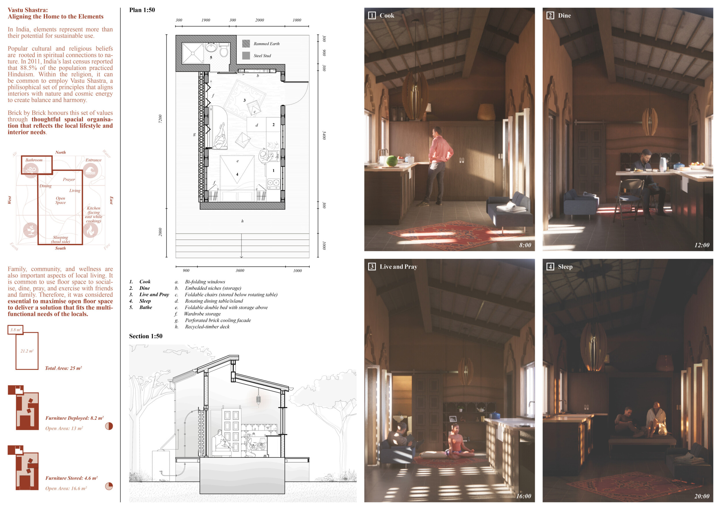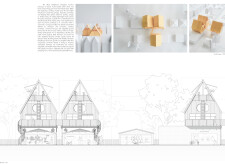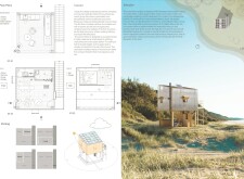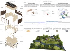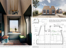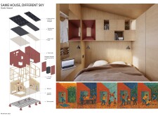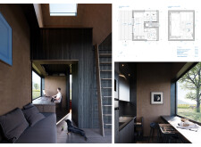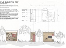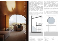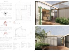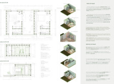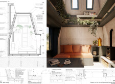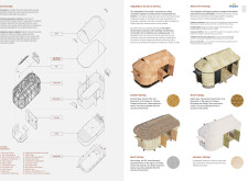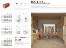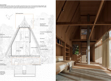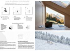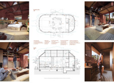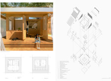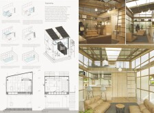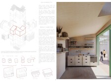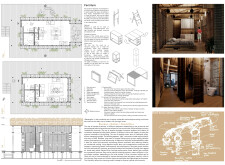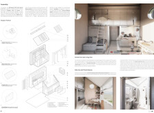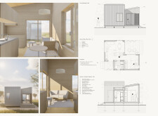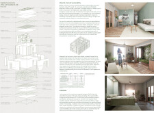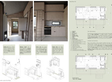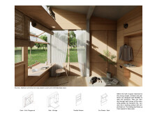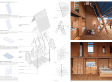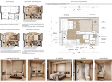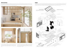 The presentation is strong and carefully composed, with clean linework and well-lit interior renderings that communicate warmth and inhabitation. The layout is coherent, yet some panels carry dense paragraph blocks whose visual weight competes with the drawings. Hierarchy could be sharpened by reducing text size or spacing to allow diagrams—particularly the multifunction joinery sequences—to register more immediately. Read more The axonometrics are clear but lightly rendered, and a slightly bolder line hierarchy would strengthen legibility at small scale. Colour balance is soft and consistent, though the uniformly warm palette of the renderings compresses tonal variety across the boards. Overall, the submission effectively communicates the architectural intent and spatial logic, with room for refinement in visual hierarchy and diagram clarity.