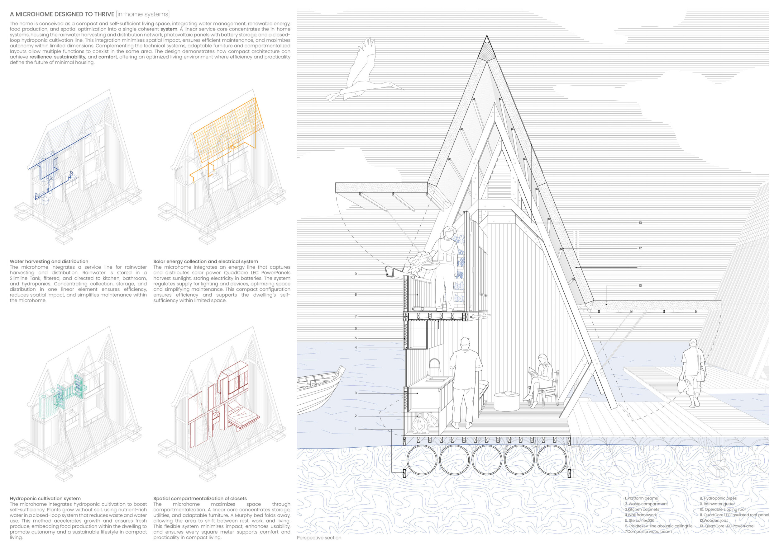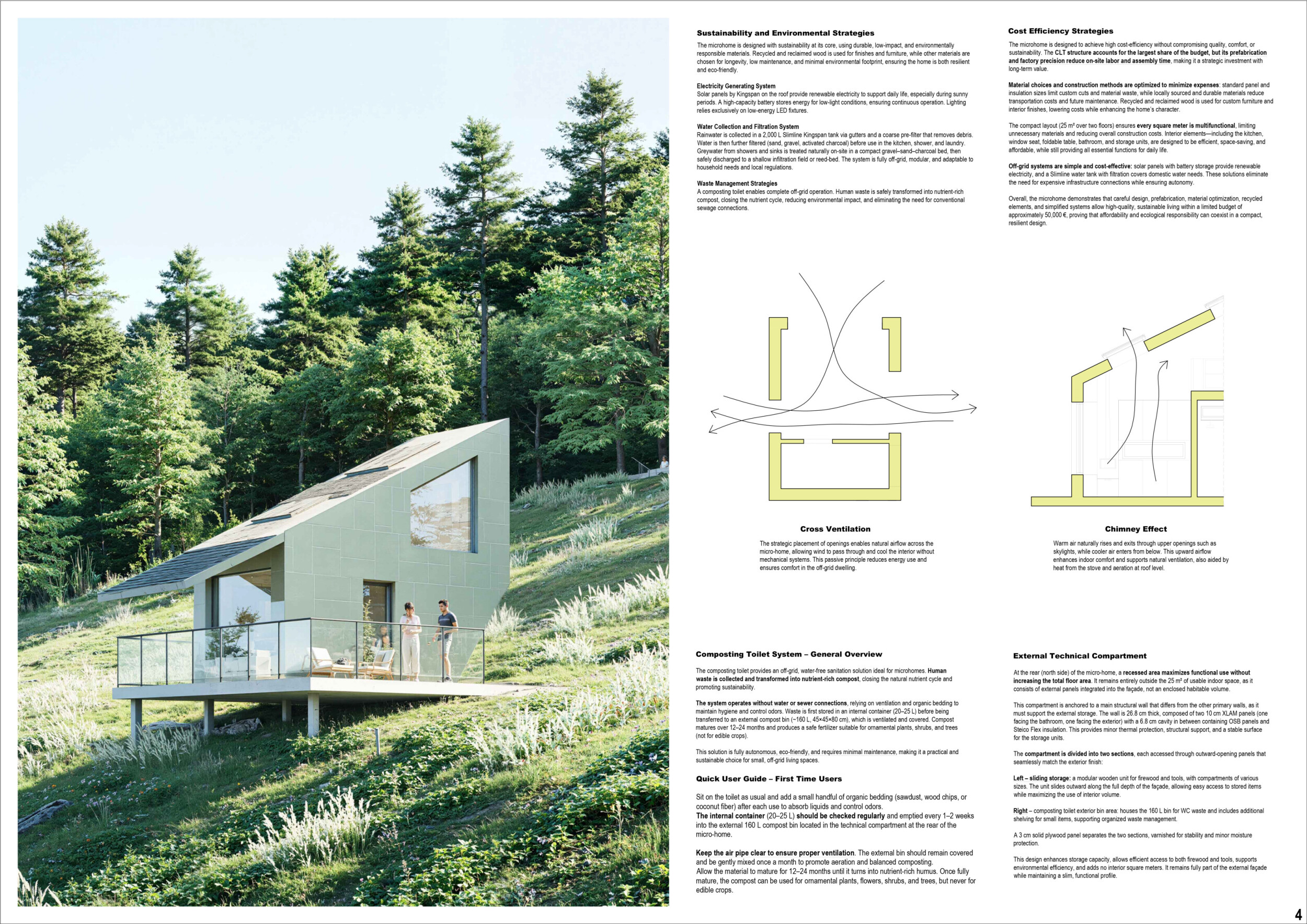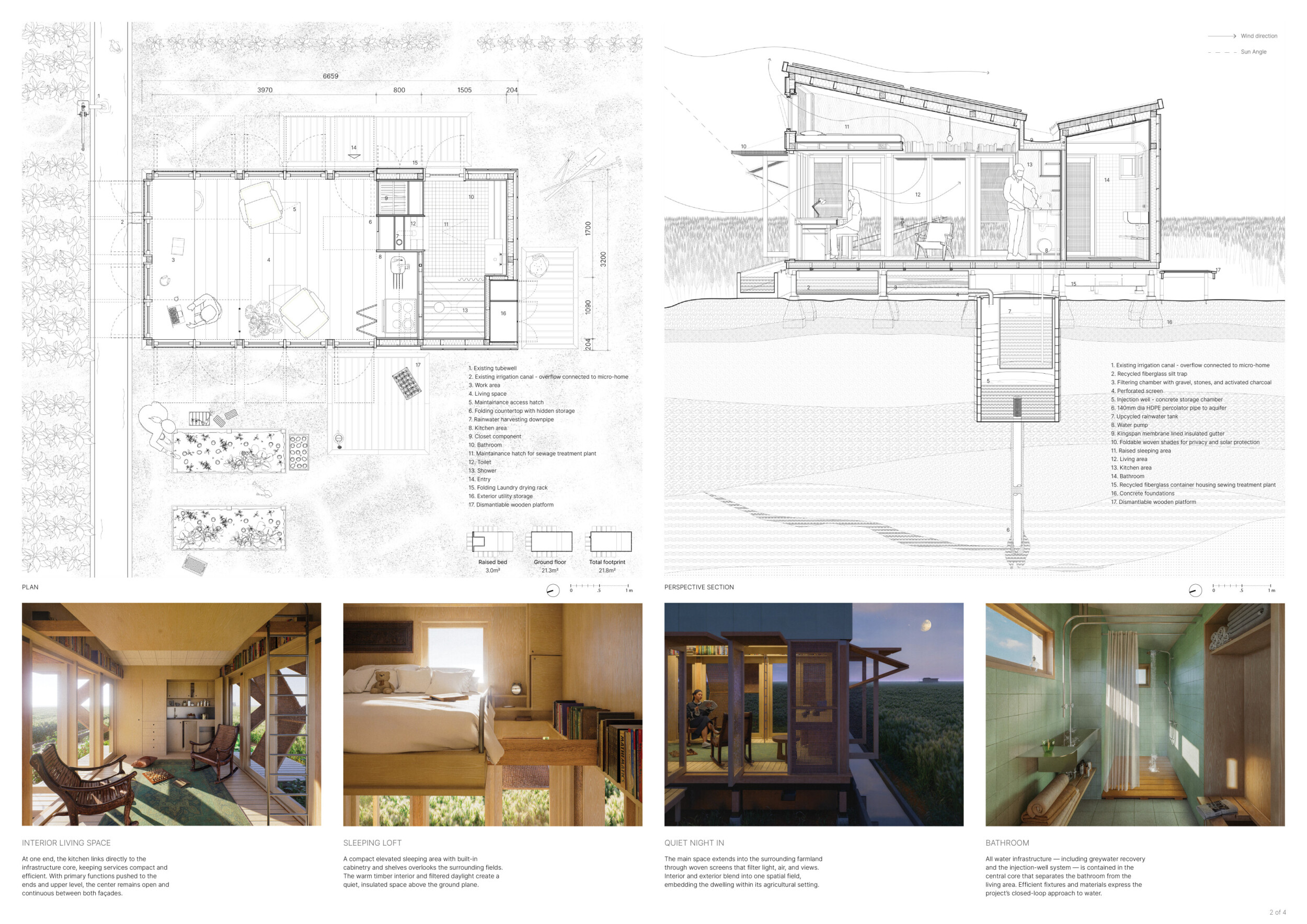 The board communicates a technically sophisticated project through a clear set of drawings, combining precise architectural detailing with an accessible explanation of hydrological performance. The sectional perspective and axonometric assemblies are particularly effective, articulating how the microhome integrates rainwater capture, filtration, and aquifer recharge within a compact structural frame.