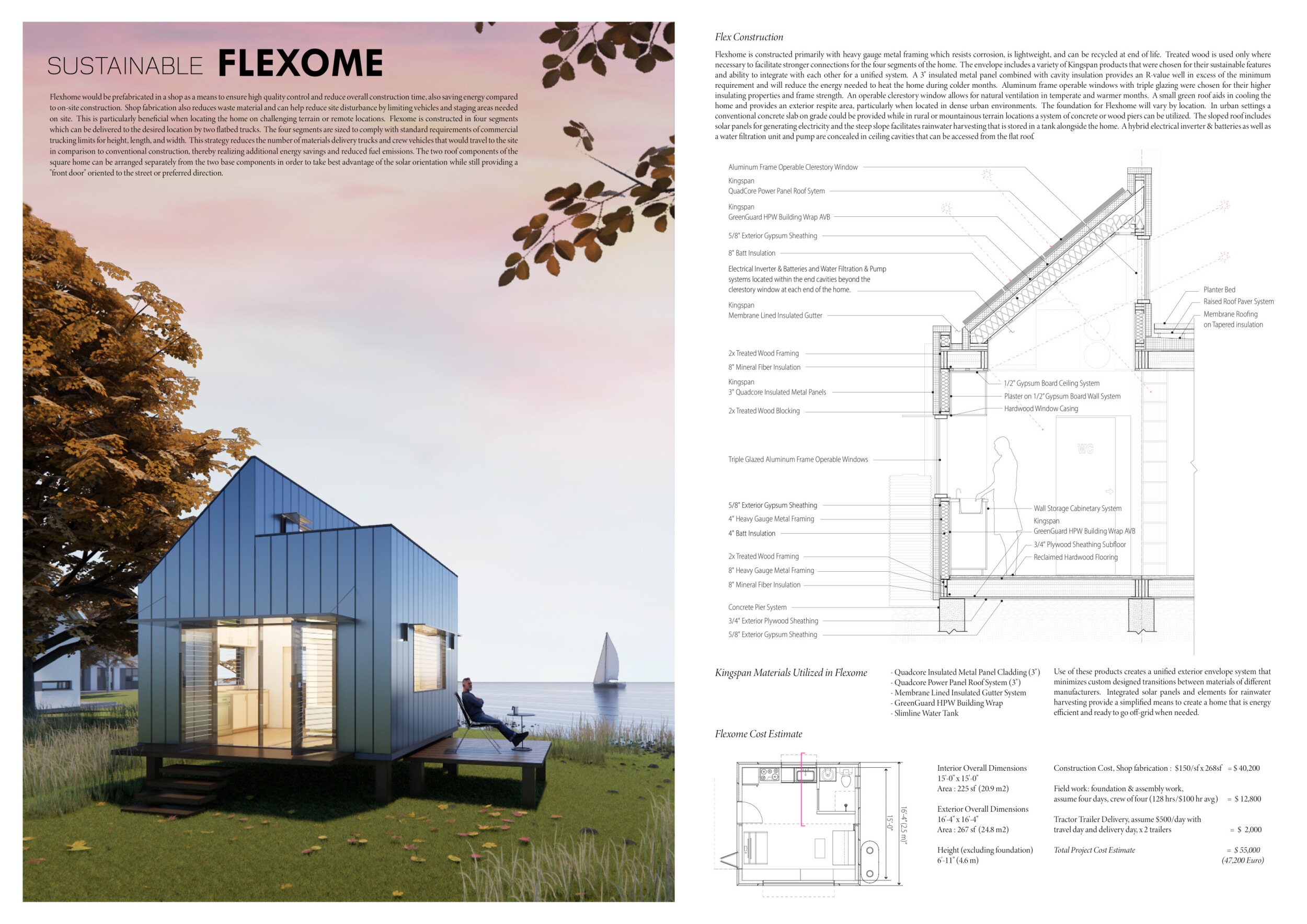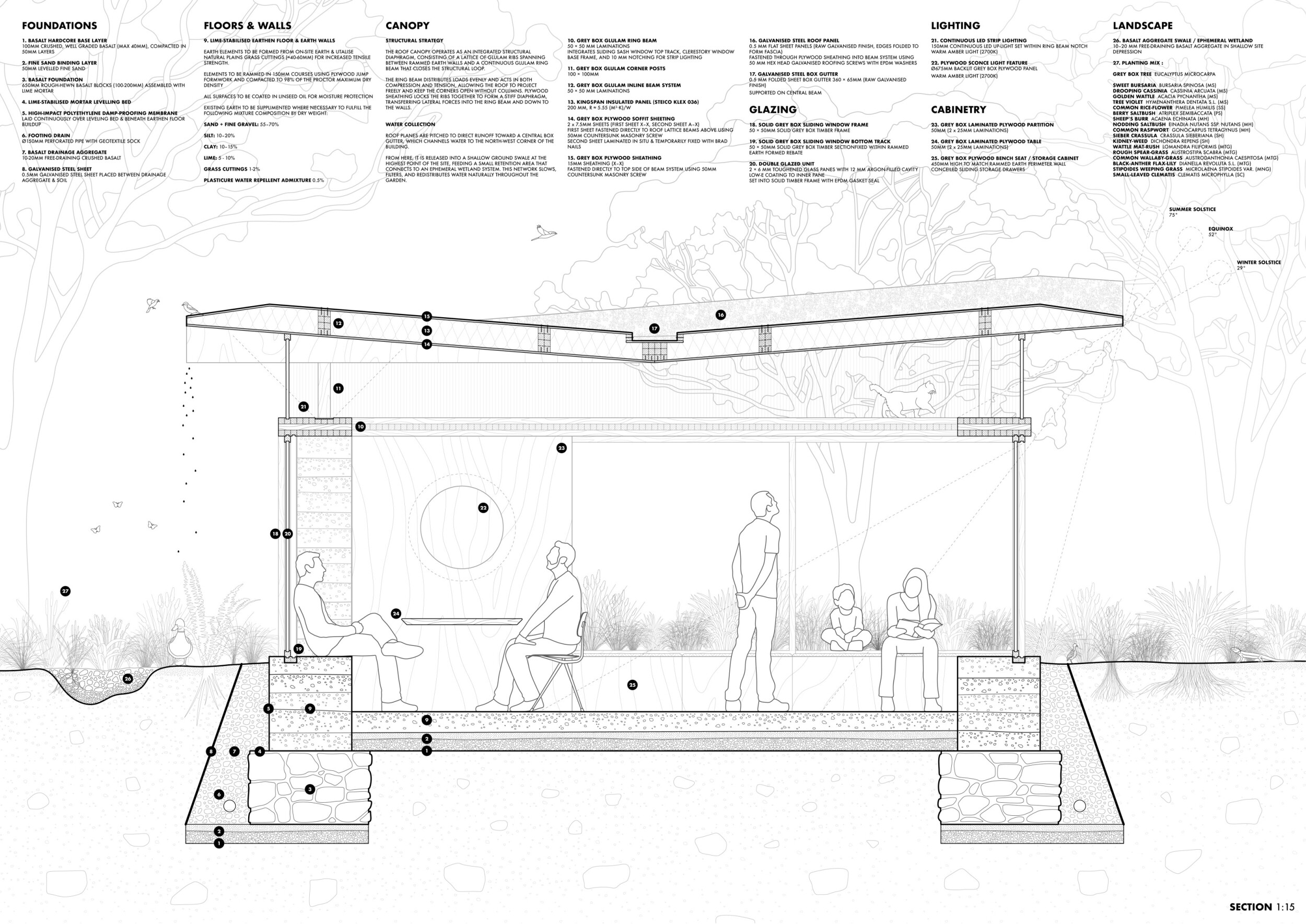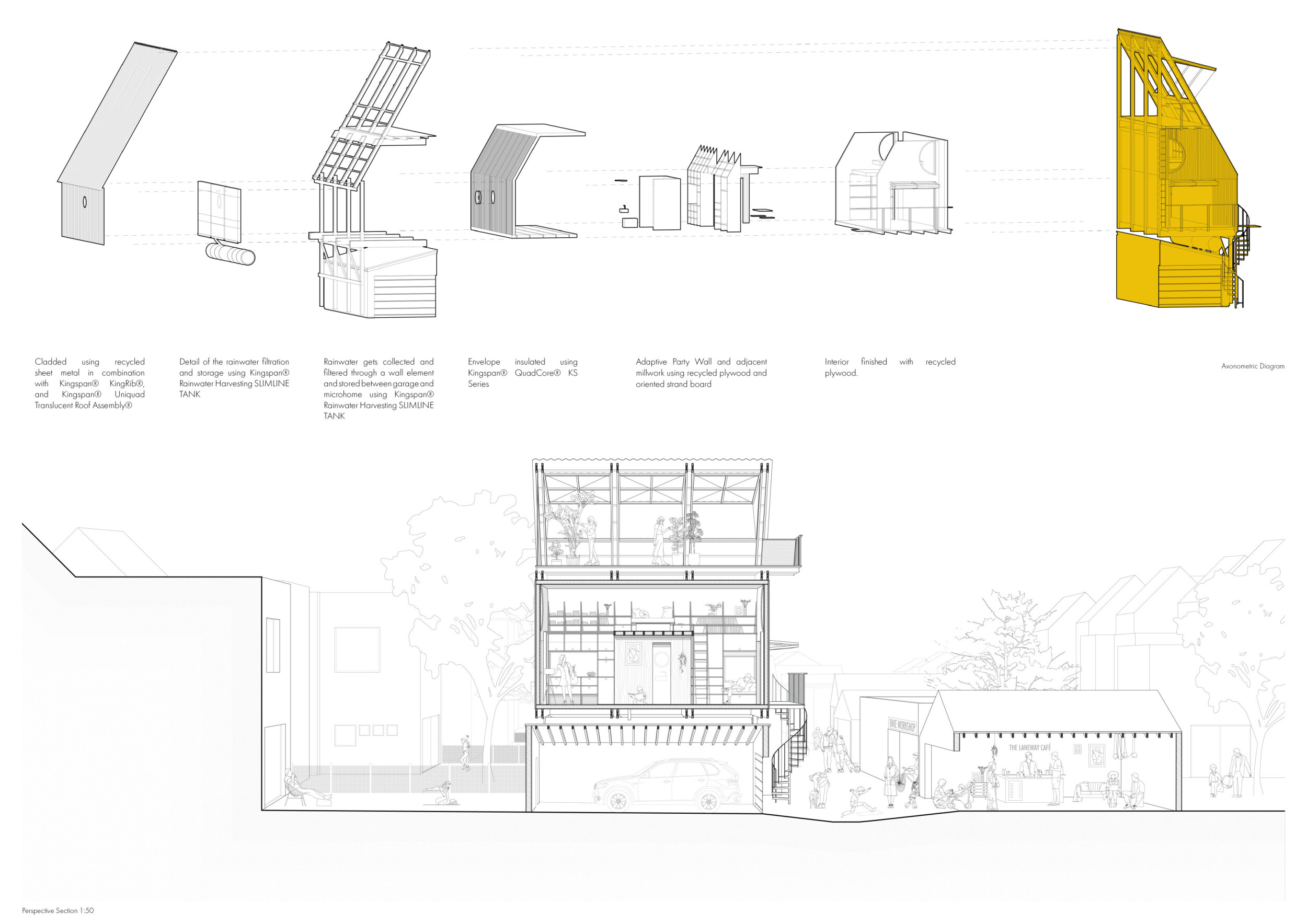 The board communicates a technically sophisticated project through a clear set of drawings, combining precise architectural detailing with an accessible explanation of hydrological performance. The sectional perspective and axonometric assemblies are particularly effective, articulating how the microhome integrates rainwater capture, filtration, and aquifer recharge within a compact structural frame.