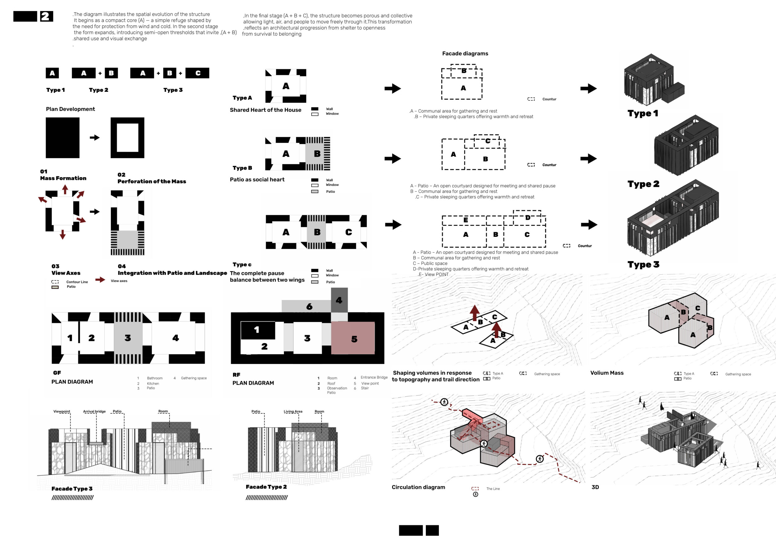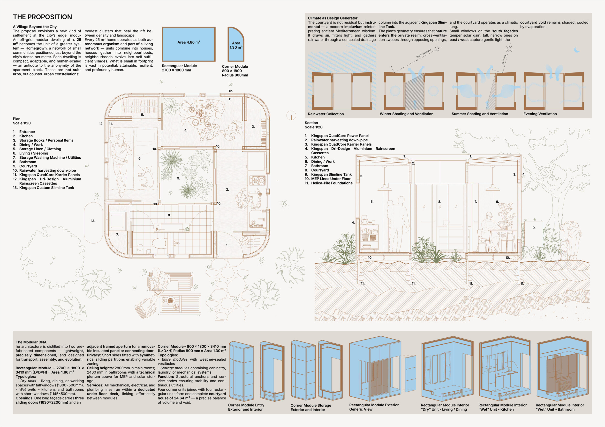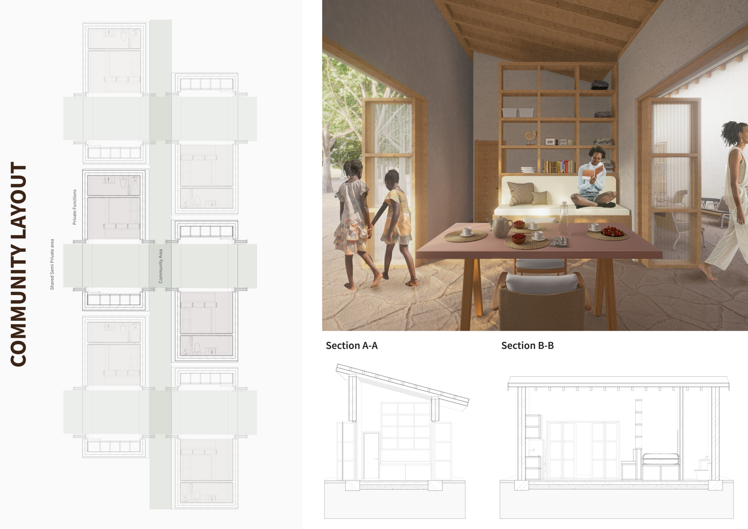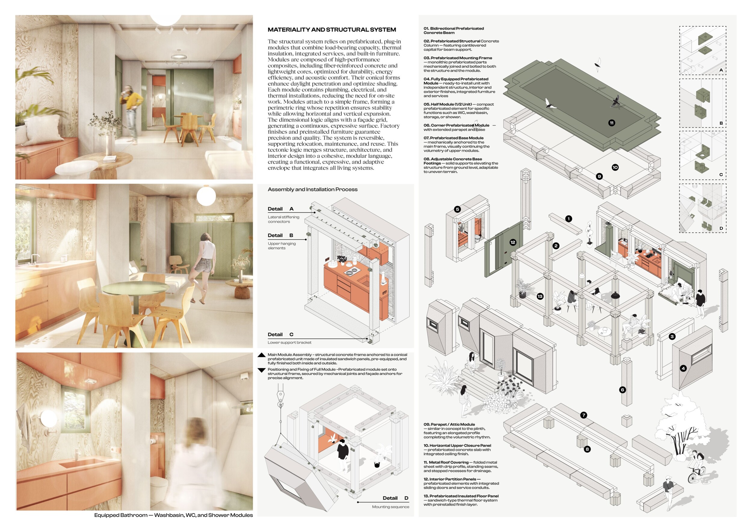 This edition saw an increased focus on modularity not only as a method of construction but as a spatial and social framework. Several winning projects proposed expandable families of units, allowing households to evolve in size and function. Others explored kit-of-parts assemblies that prioritised local materials, rapid deployment, and low-impact manufacturing.