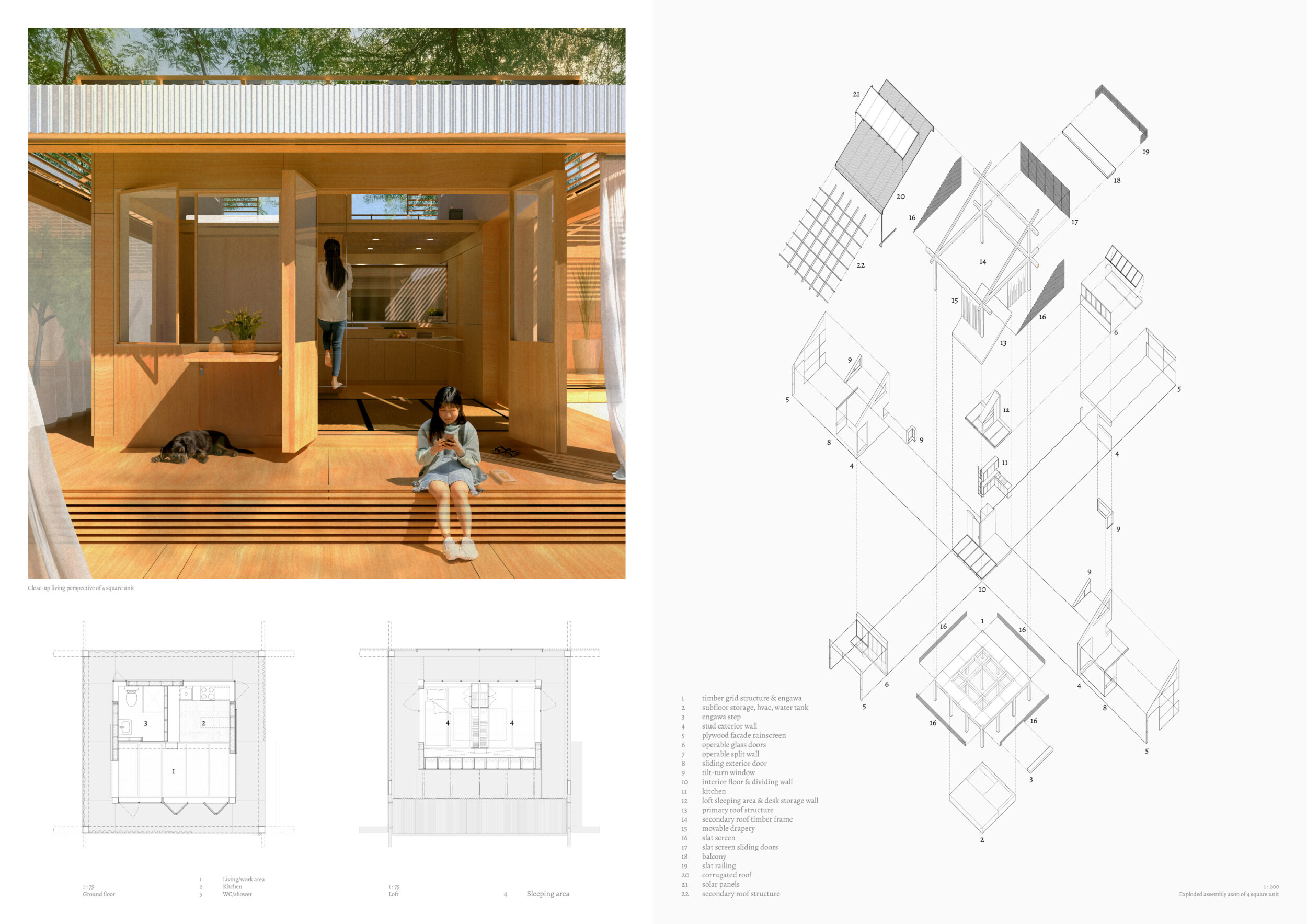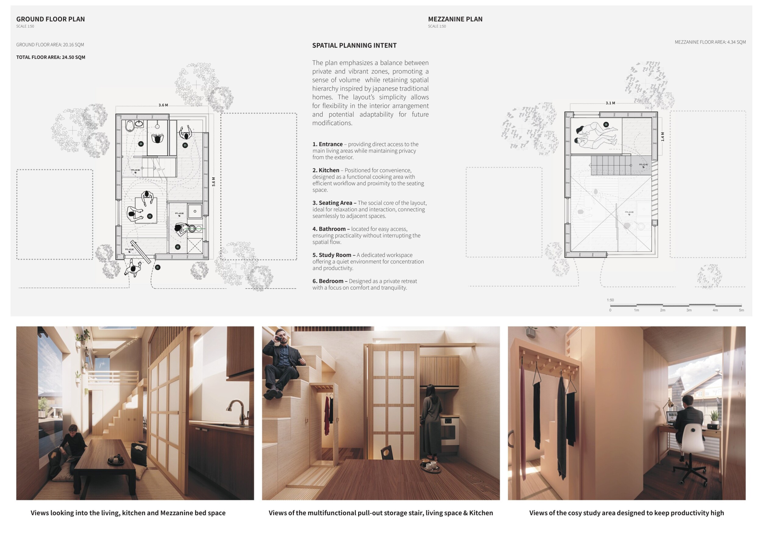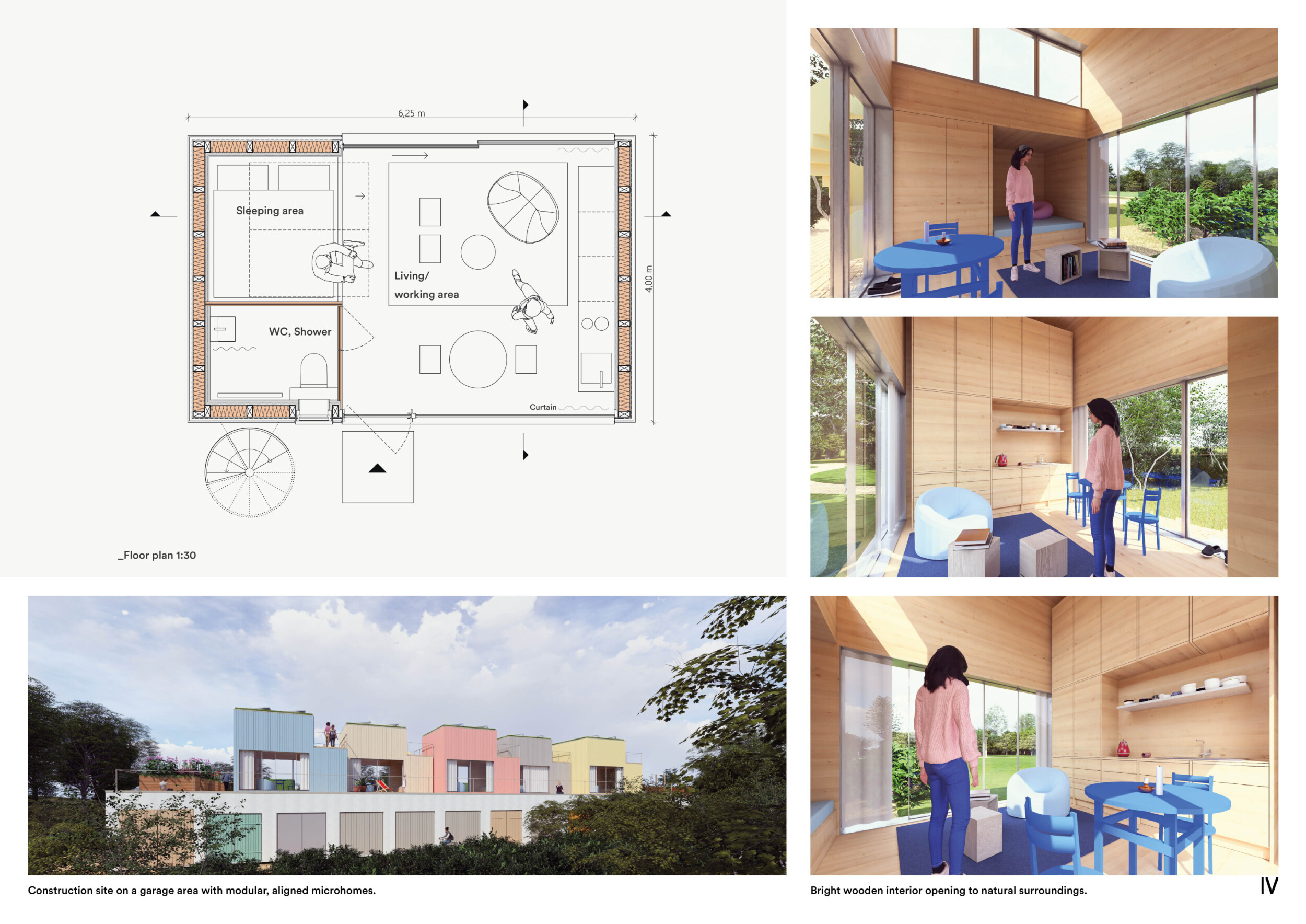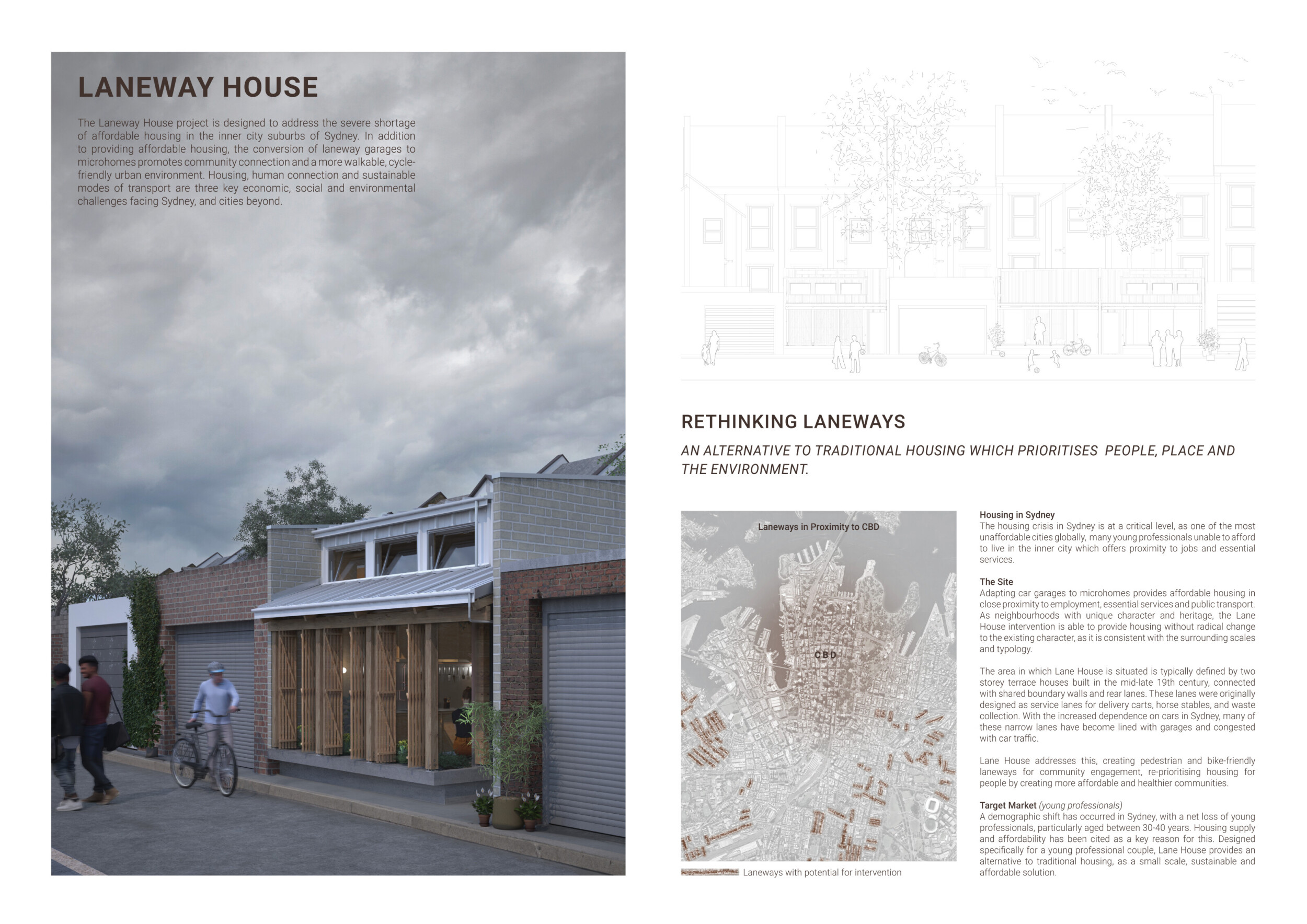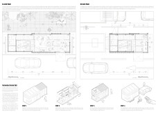 This proposal reimagines Sydney’s laneway garages as compact, socially responsive microhomes that maximise a constrained footprint through flexible interiors, material simplicity, and a clear urban narrative. The plan separates the 22 m² unit into two functional zones: a front living-and-cooking area opening directly to the laneway, and a rear zone dedicated to sleeping, bathing, and work, moderated by a curtain partition for adjustable privacy.