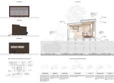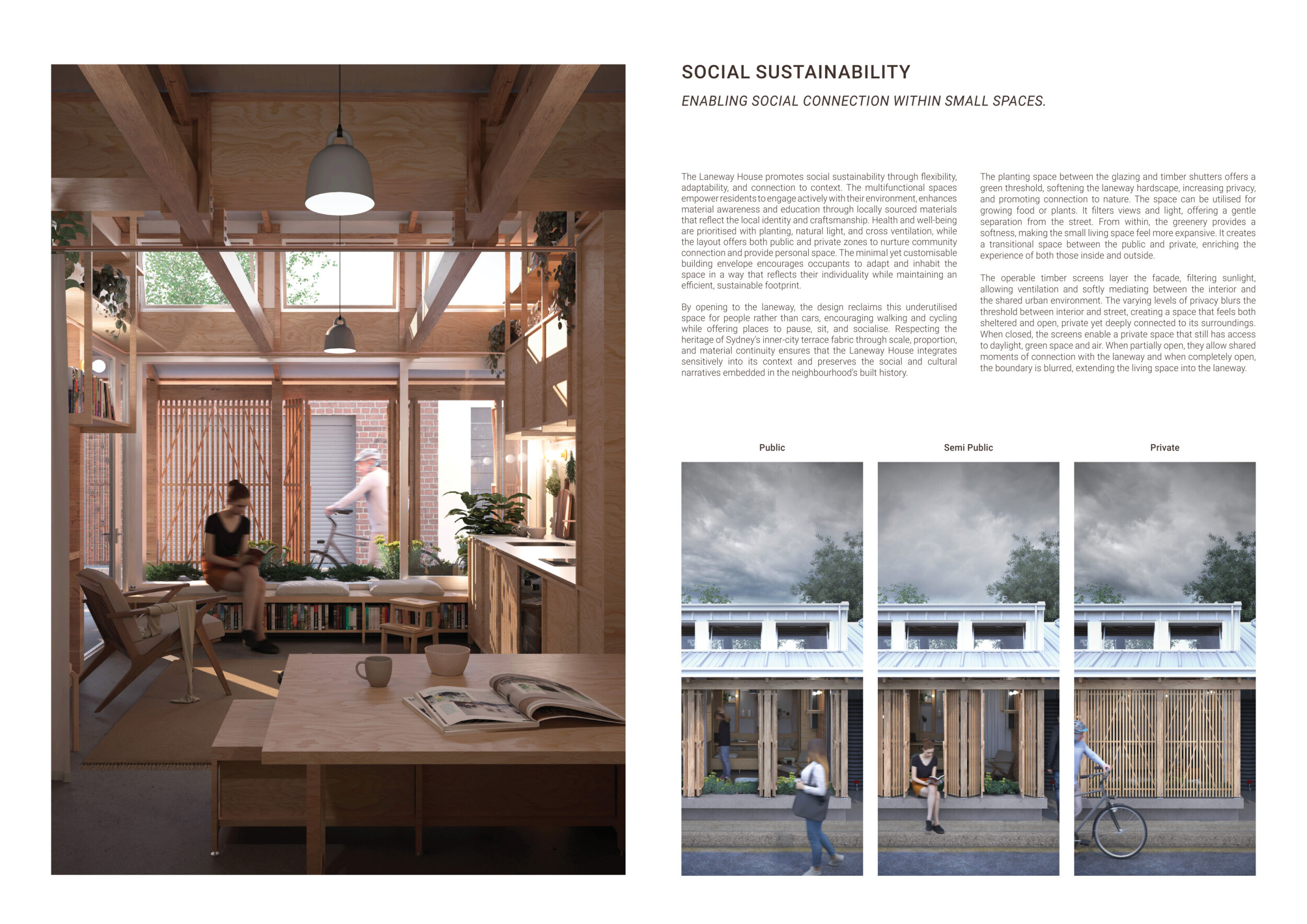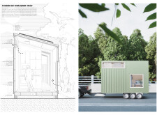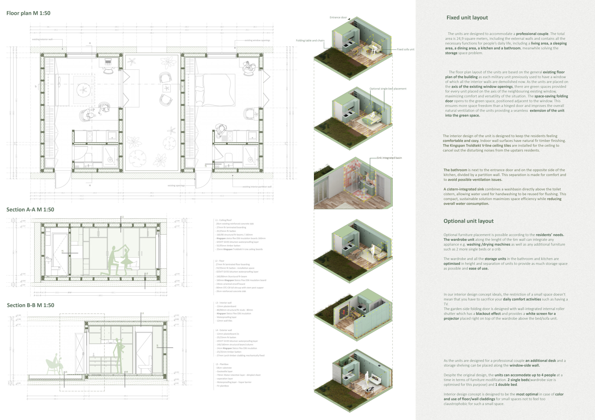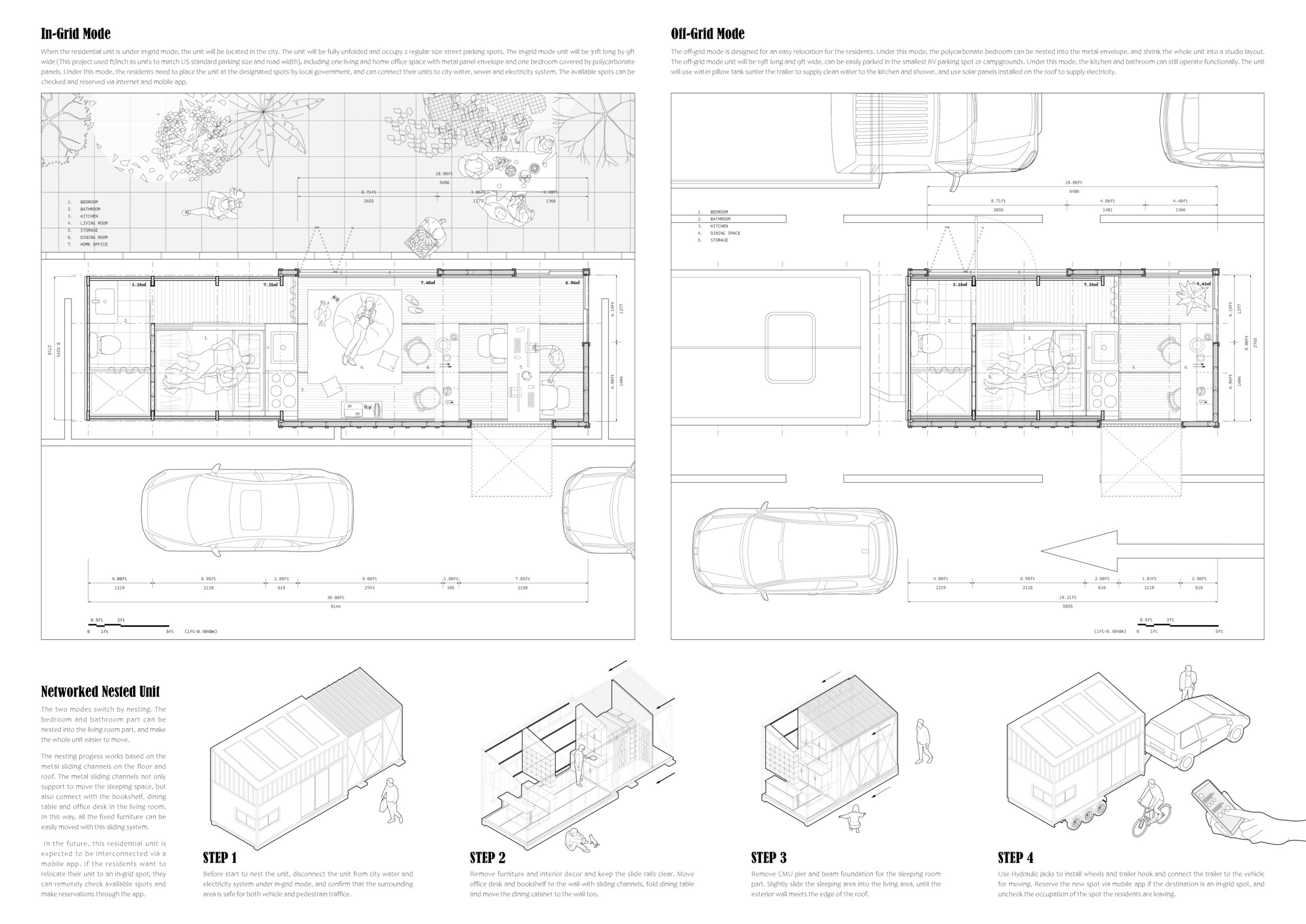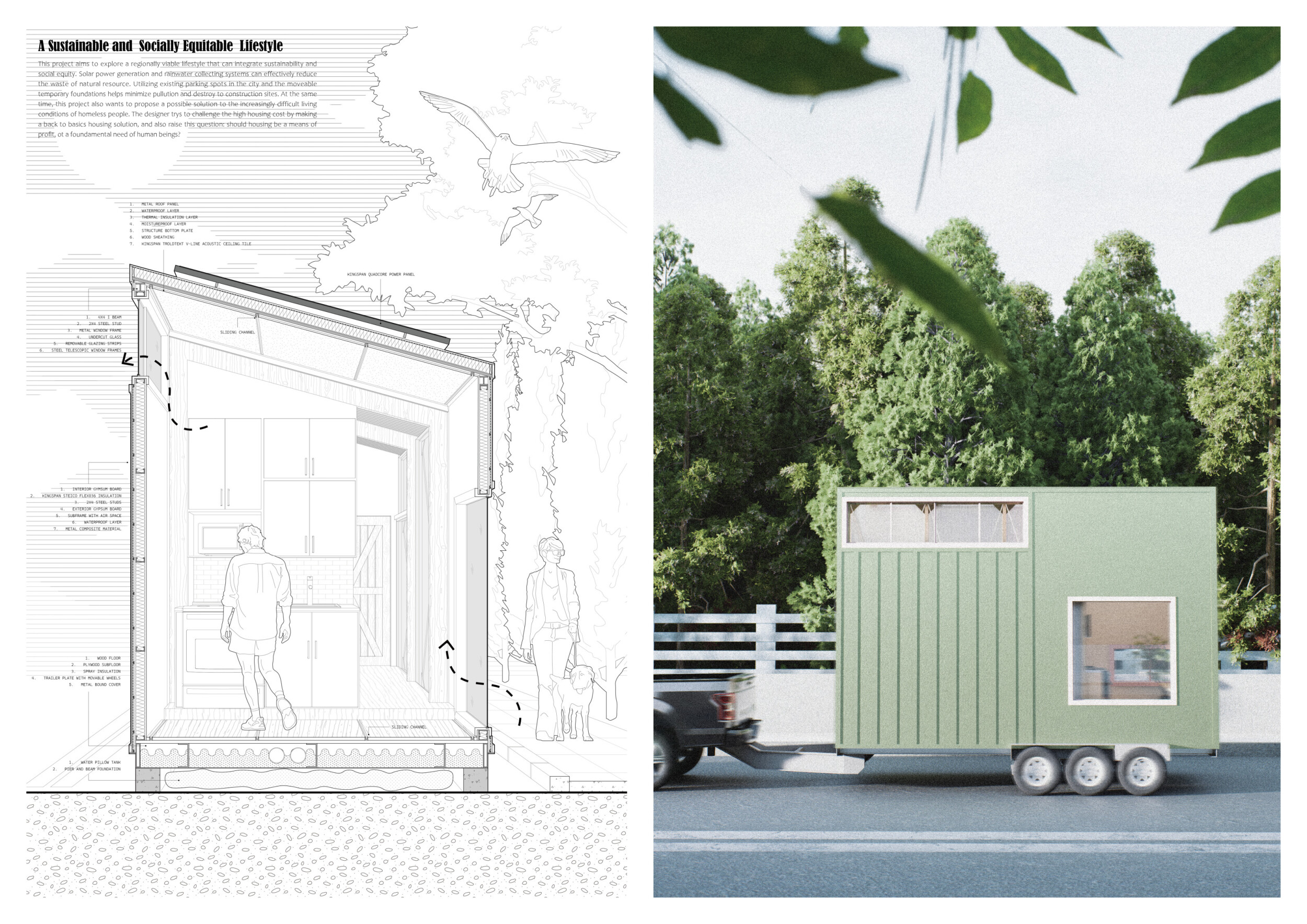 This proposal reimagines Sydney’s laneway garages as compact, socially responsive microhomes that maximise a constrained footprint through flexible interiors, material simplicity, and a clear urban narrative. The plan separates the 22 m² unit into two functional zones: a front living-and-cooking area opening directly to the laneway, and a rear zone dedicated to sleeping, bathing, and work, moderated by a curtain partition for adjustable privacy.
