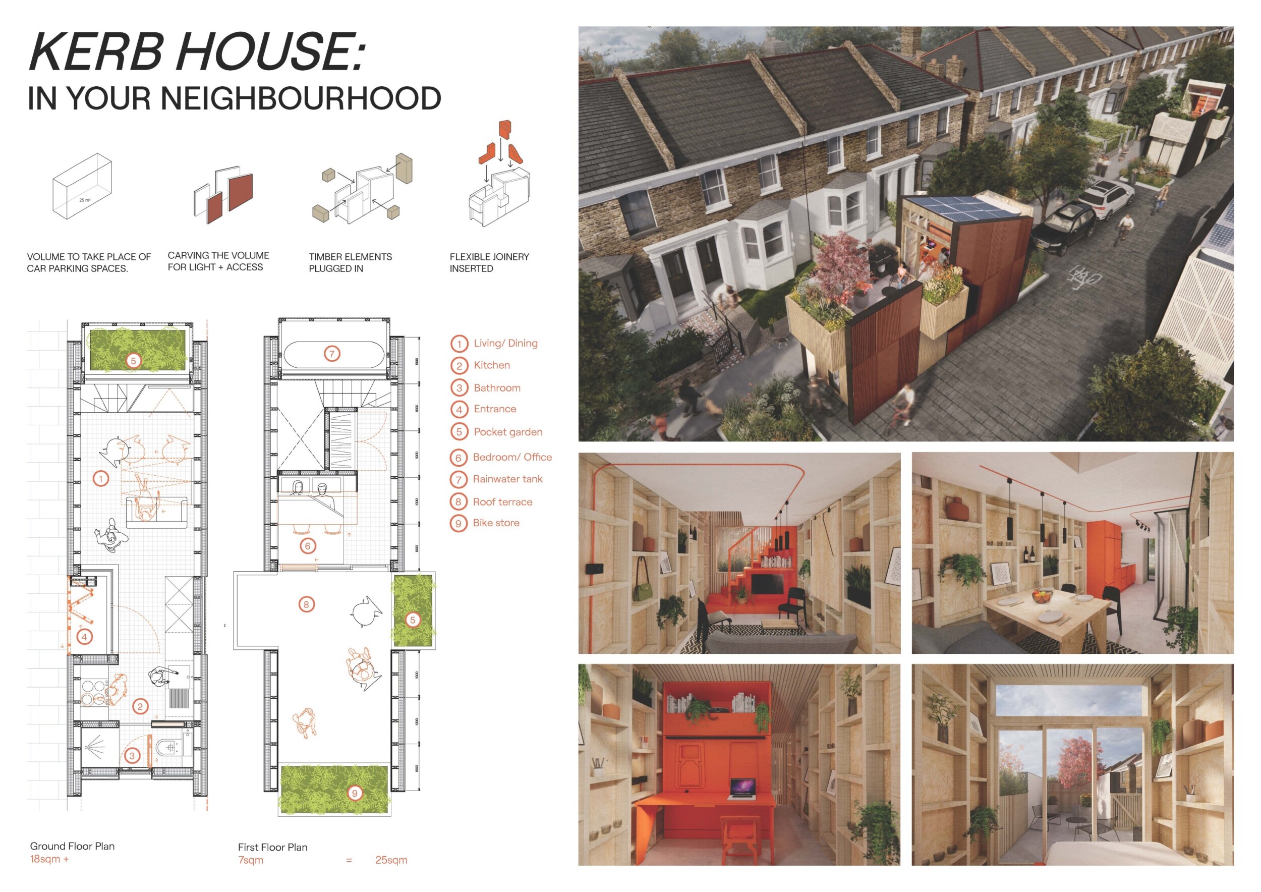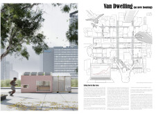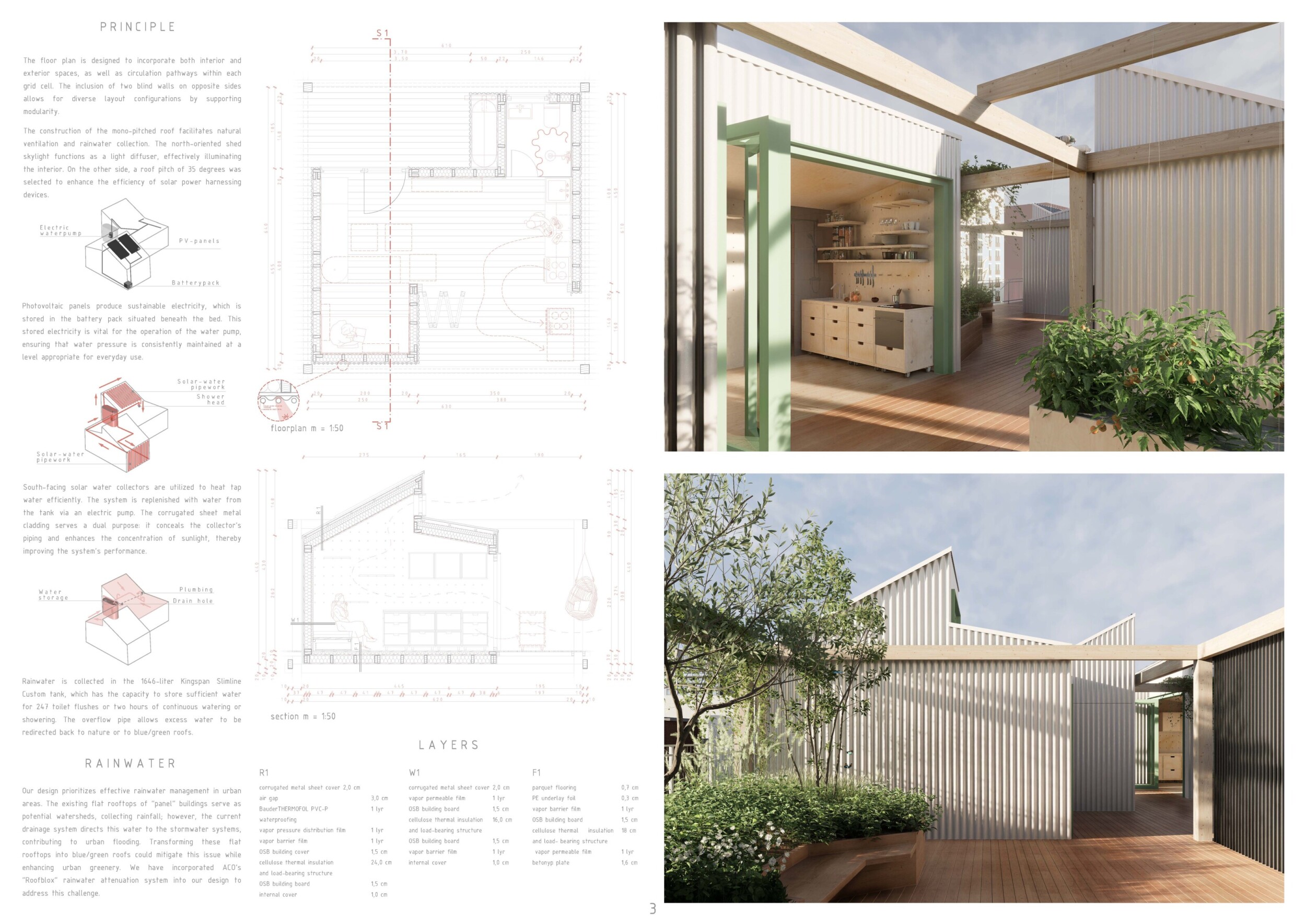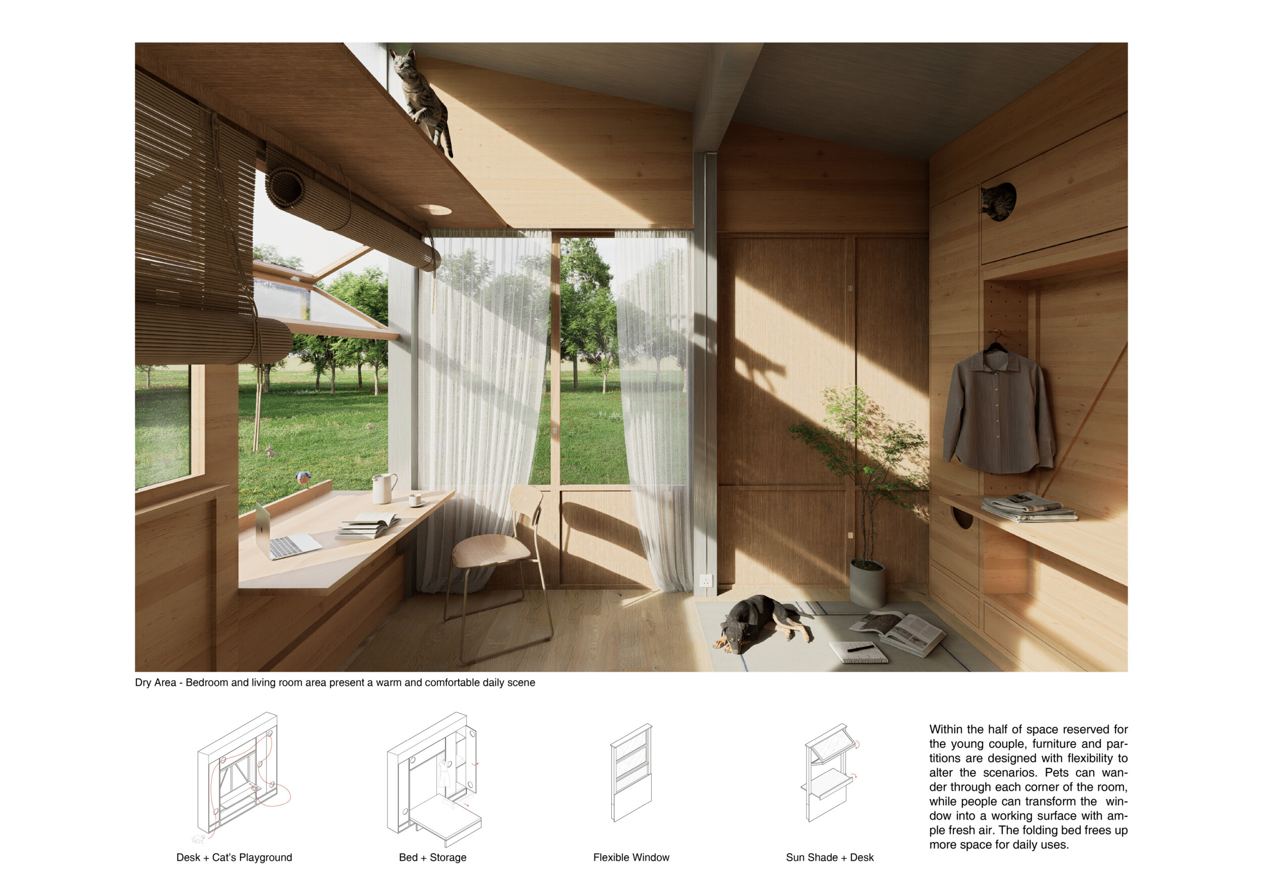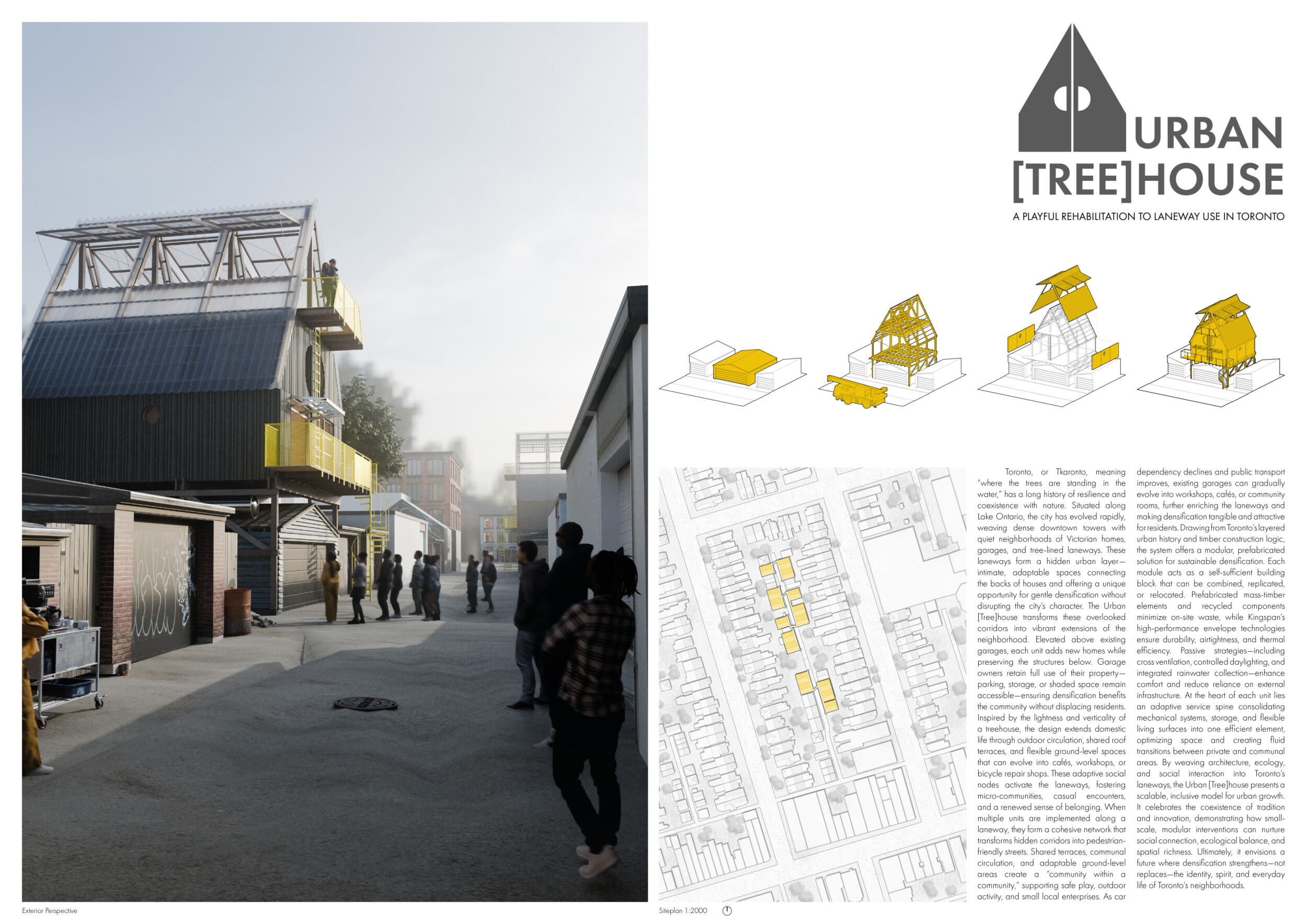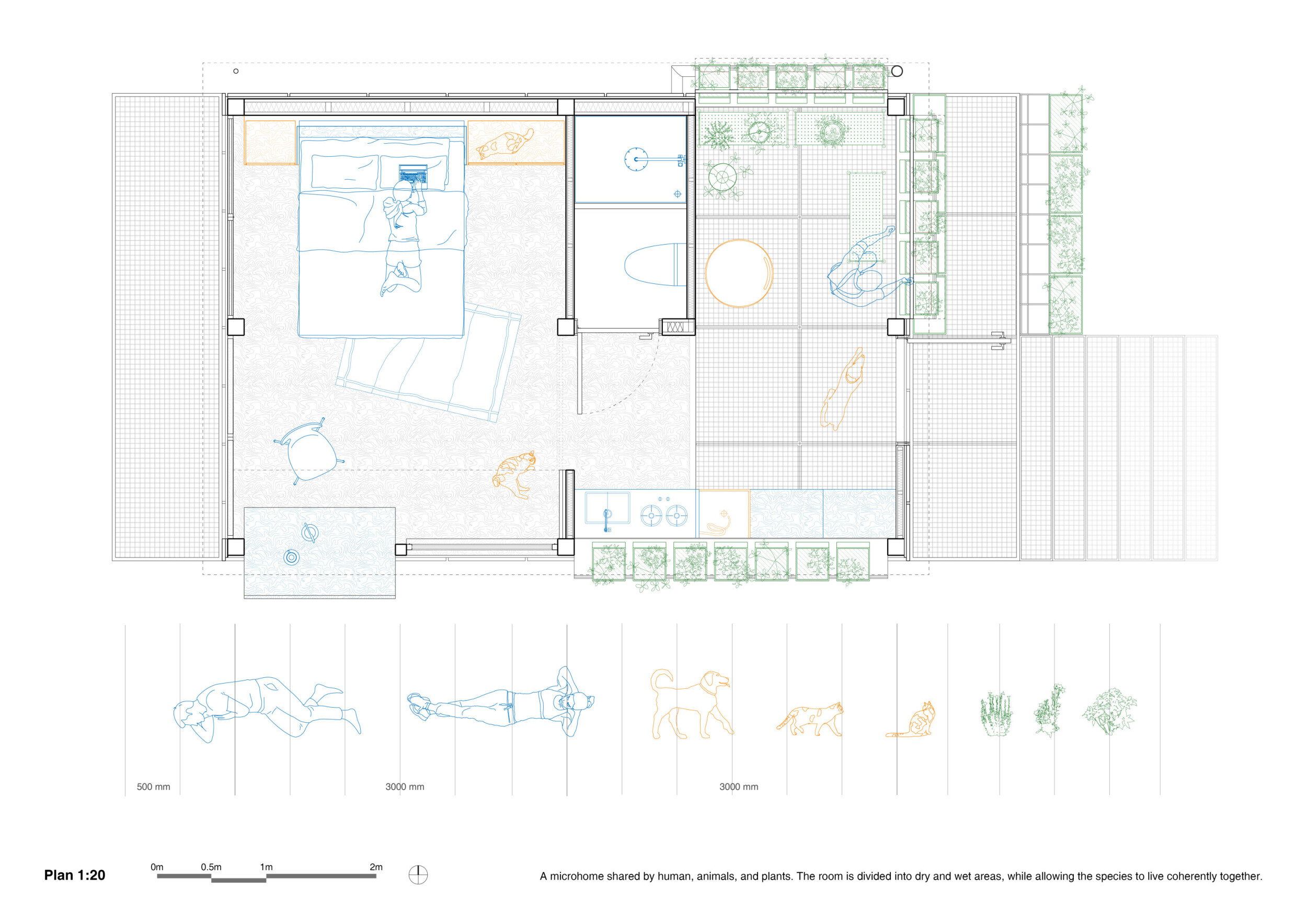 This proposal reimagines Sydney’s laneway garages as compact, socially responsive microhomes that maximise a constrained footprint through flexible interiors, material simplicity, and a clear urban narrative. The plan separates the 22 m² unit into two functional zones: a front living-and-cooking area opening directly to the laneway, and a rear zone dedicated to sleeping, bathing, and work, moderated by a curtain partition for adjustable privacy.