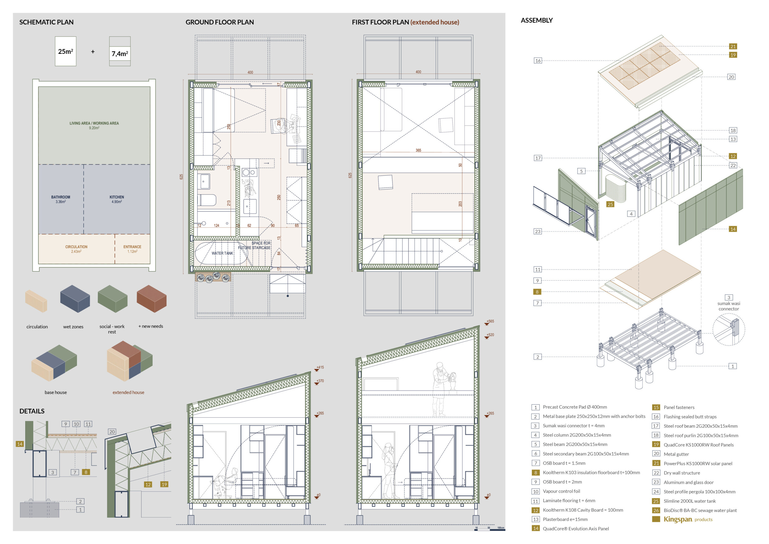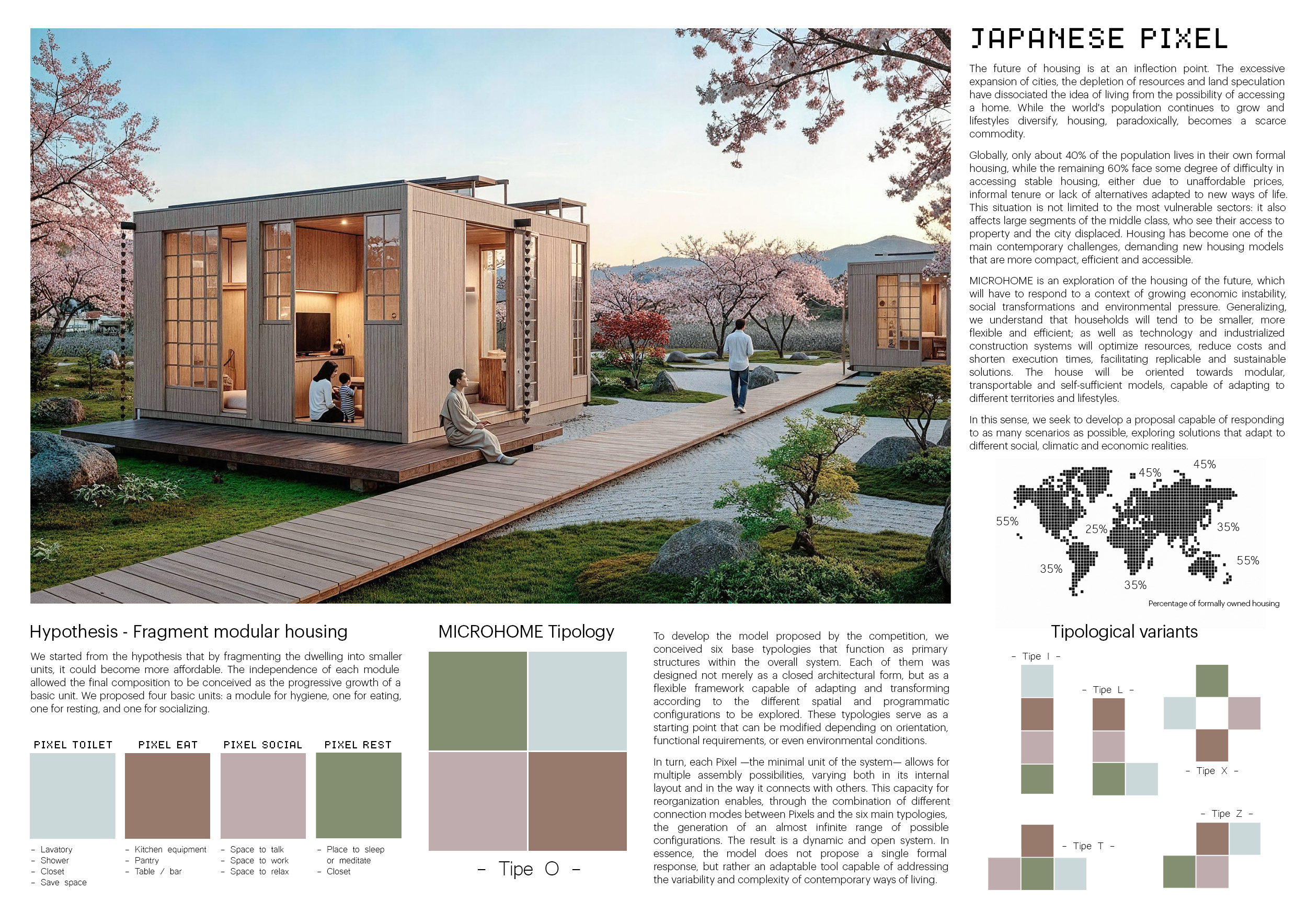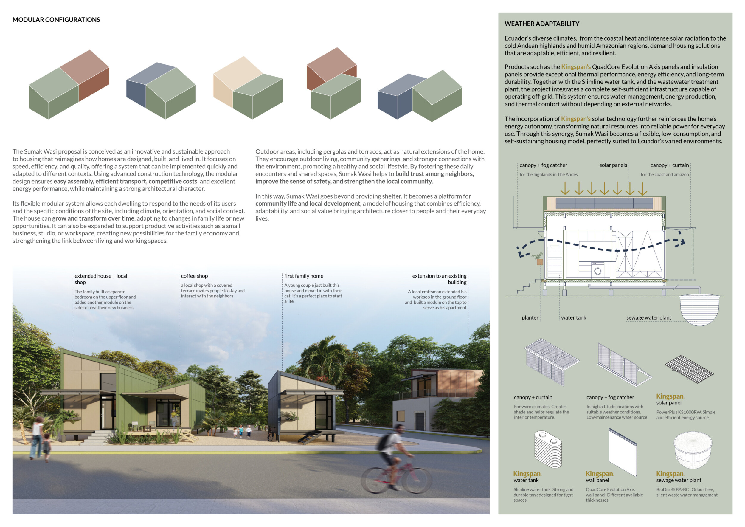 SumakWasi proposes a modular microhome system designed to meet Ecuador’s diverse climates and social conditions through a single adaptable housing model. The project responds to urgent housing deficits by offering a compact 25 m² base unit enhanced by a 7.4 m² extension that supports long term growth. The design uses a simple structural grid, efficient panelized construction, and clear zoning to create flexible interiors that adjust to changing family needs.
