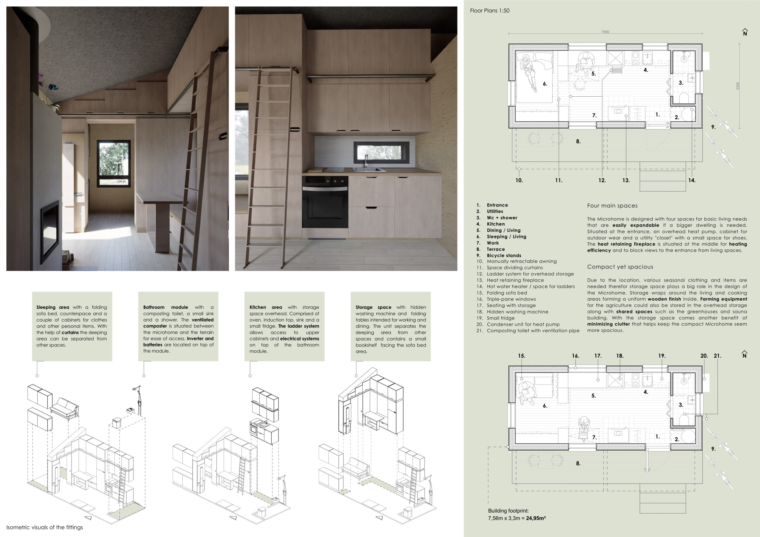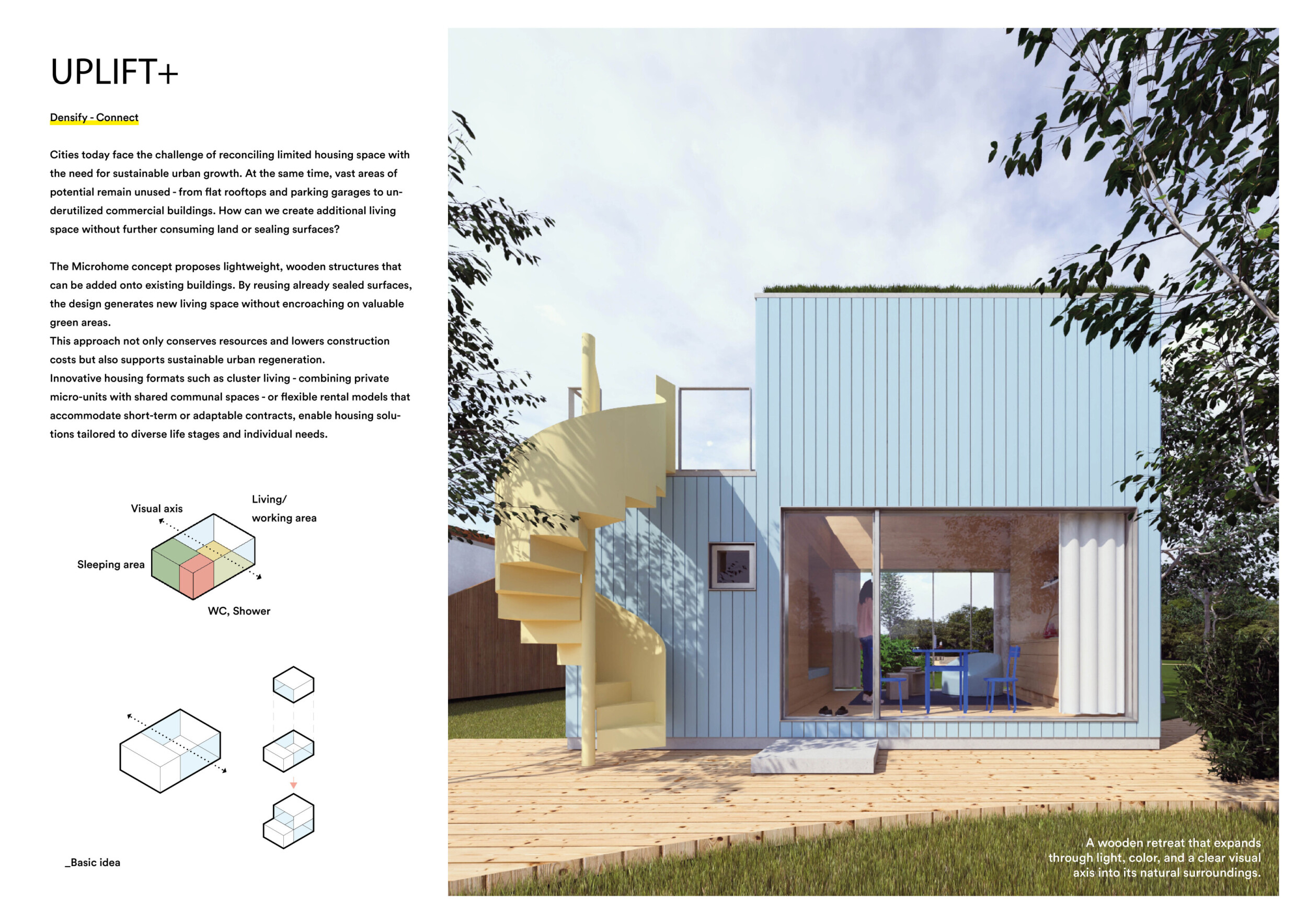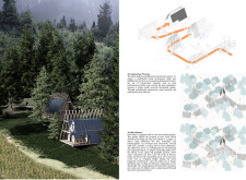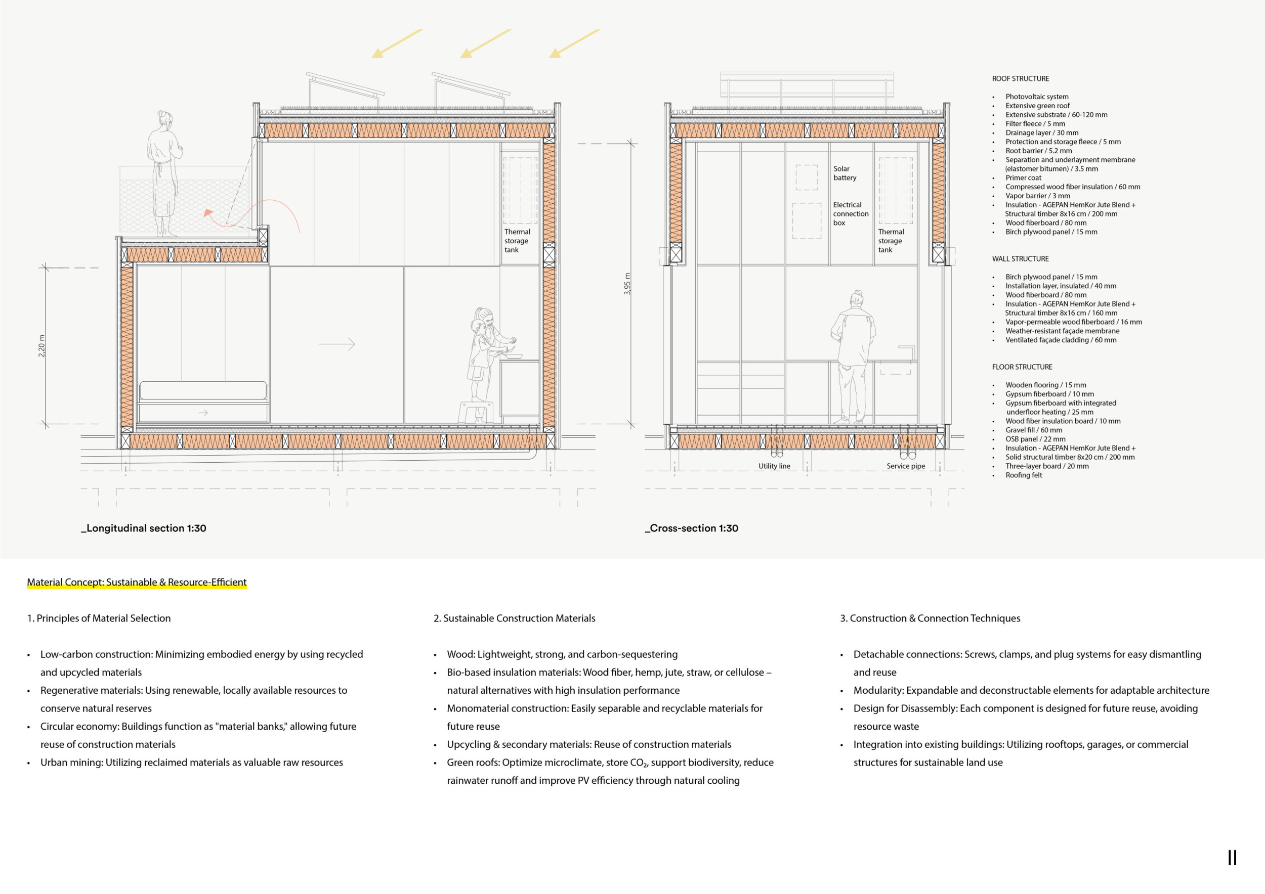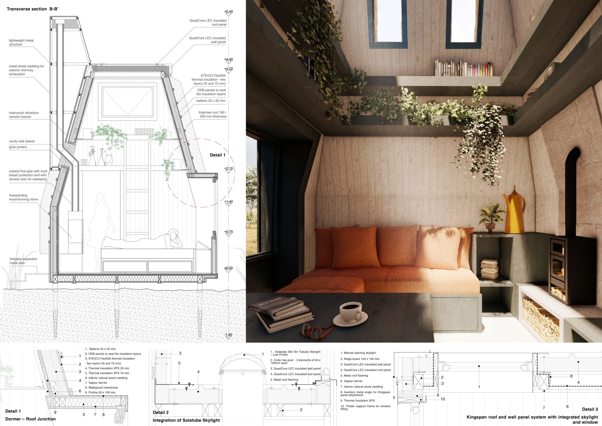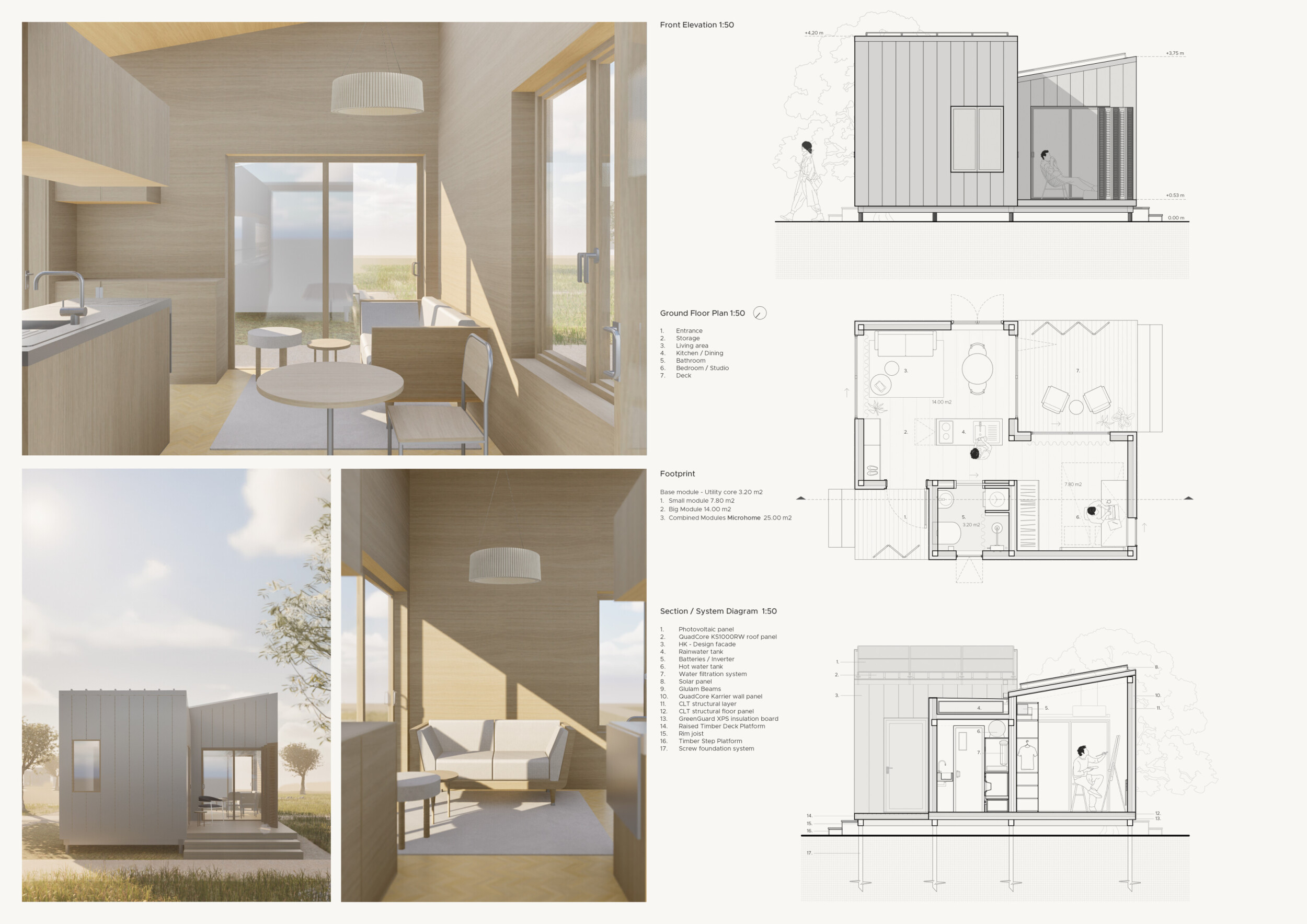The CLT Microhome proposes a compact timber dwelling that combines fast assembly with long-term adaptability. The design uses a simple structural grid and modular CLT panels to create a robust envelope that can be erected quickly in post-disaster or low-resource settings. A clear vertical separation places communal living and service spaces on the ground floor and private rooms above.