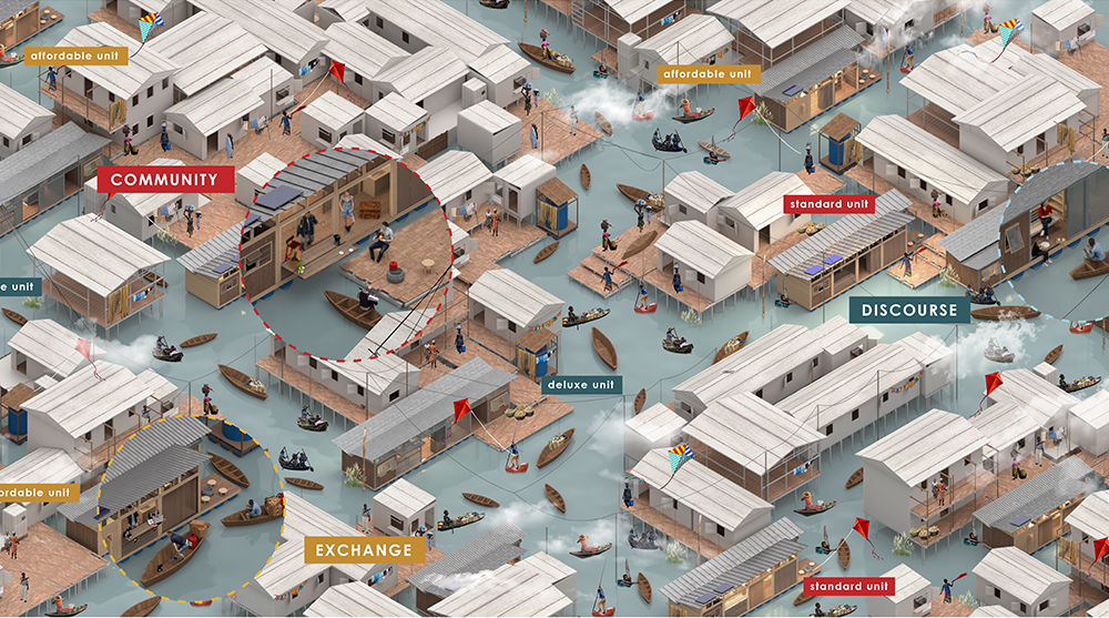The second prize and student prize were awarded to Jessica Anand, Tiffany Chen, and Angelina Yihan Zhang from Syracuse University in the USA. Their ‘Re-Imagining Makoko’ project involved a modular floating home designed for Lagos, Nigeria self-sustained mobile pods that remain undamaged by rising sea levels while also providing desperately needed access to clean water and sewage systems. Third prize went to Yonghao Zhang and Tory Tan from Carnegie Mellon University in Canada whose proposal involved a house divided into a base module and four flexible sliding rooms that expand from both sides of the structure.
