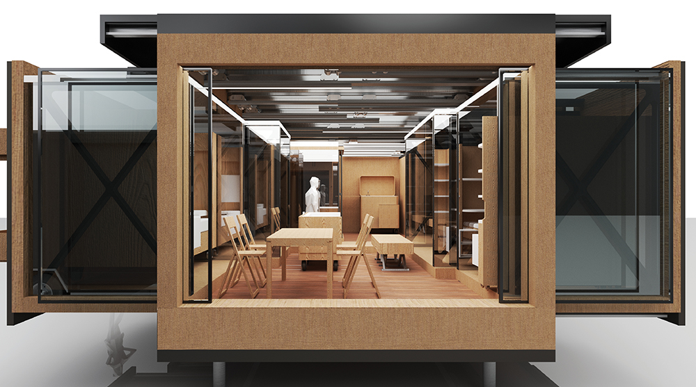 First prize was awarded to Gabriel Chivu, Laura Mazâlu, Stefan Mircea, and Thomas Herrera from Romania. Their ‘Do It Yourself Pop Up House’ proposed a 12.2 x 2.4 x 3.15m container carrying the 35 prefabricated components that could be assembled to create the home of your choice. An adaptable and versatile solution to the brief, even the container itself is used as part of the assembled structure’s envelope, to reduce throw-away parts after transportation.