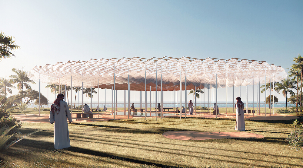 On the Tharwa Sea Front in Al-Khobar, the top honor went to Timothy M. Williams, Yahia Atef Saleh Mohamed, and Landon J. Healy from the United States for Coalesce, a pavilion inspired by traditional palm weaving that creates a shaded communal space of unity and reflection. Second prize was awarded to Jordanian designers Ala Munther Tawfiq Ammari and Afaf Zayed Hamed Al Odetalla for Chromatic Echoes Pavilion, a colorful light-responsive structure inspired by Al-Sadu weaving. Two third prizes were also recognized: Many Pearls by French architect Matthieu Boustany and The Light of History by Polish designers *Magdalena Anna Marasik and Bartosz Paweł Haduch.