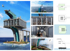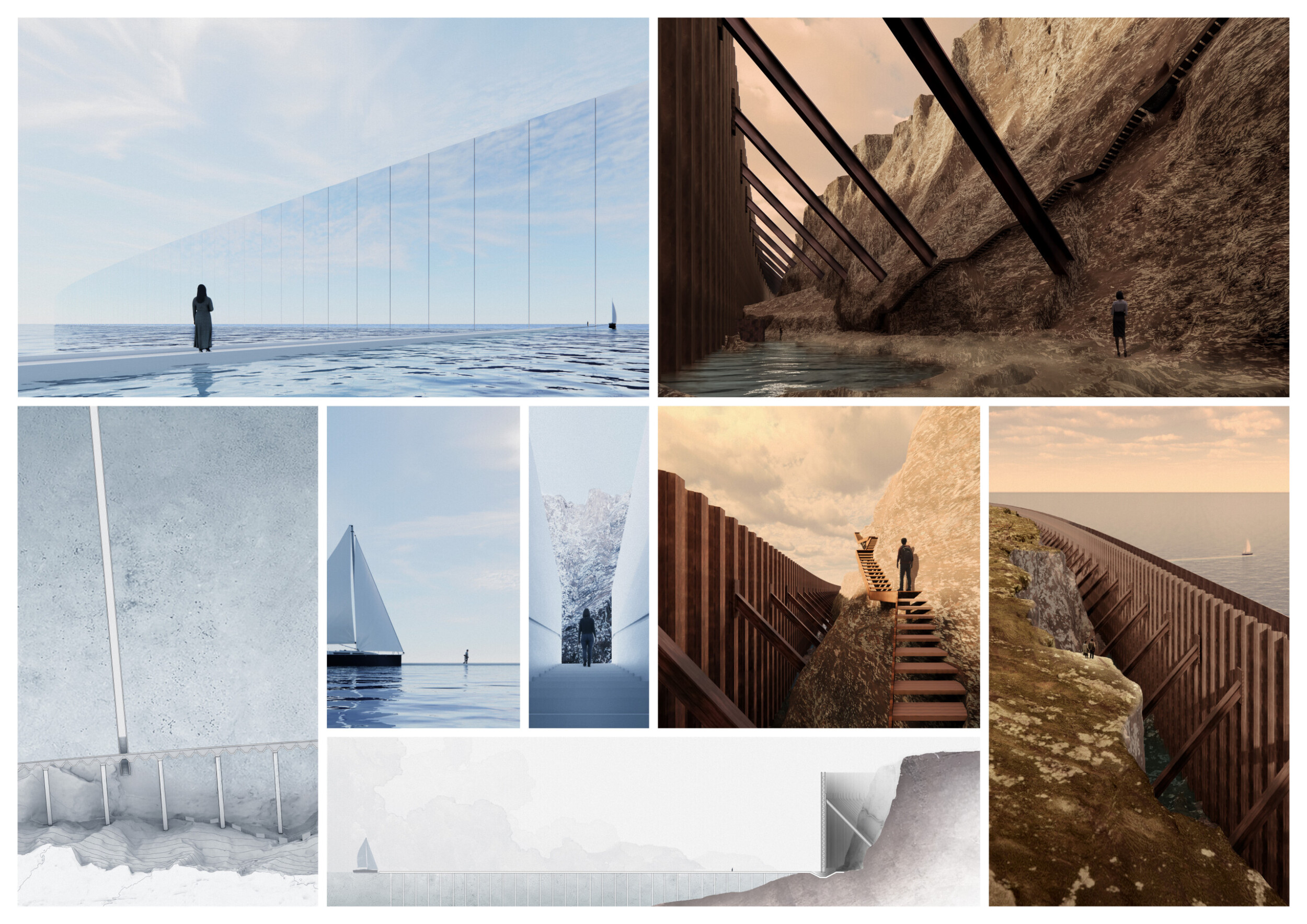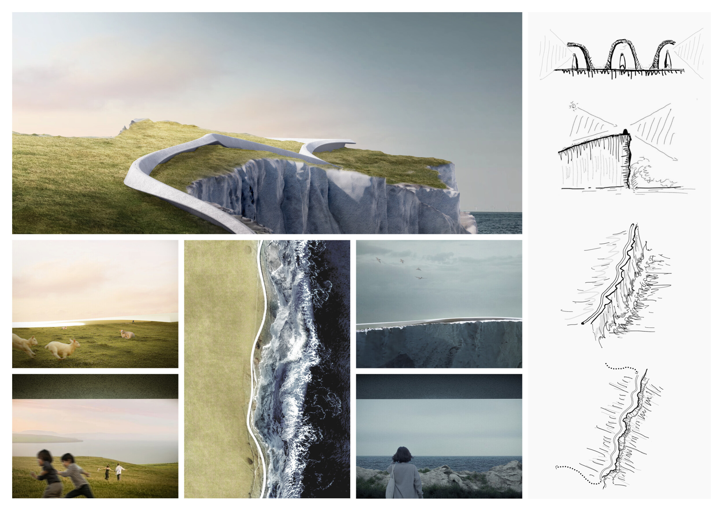 This project uses a curvilinear form to create a strong connection between the landscape and the shoreline, guiding visitors along a path that evokes a progression of emotional and spatial experiences. The wavy design gestures both soften and emphasize the dramatic boundary of the cliff, directing views alternately towards the land and the sea. This careful integration respects the natural context while offering a protected space for reflection and play. Read more The design captures the duality of its site—the joy of a verdant landscape alongside the stark edge of the shoreline—offering a thoughtful exploration of topography and human interaction with nature.