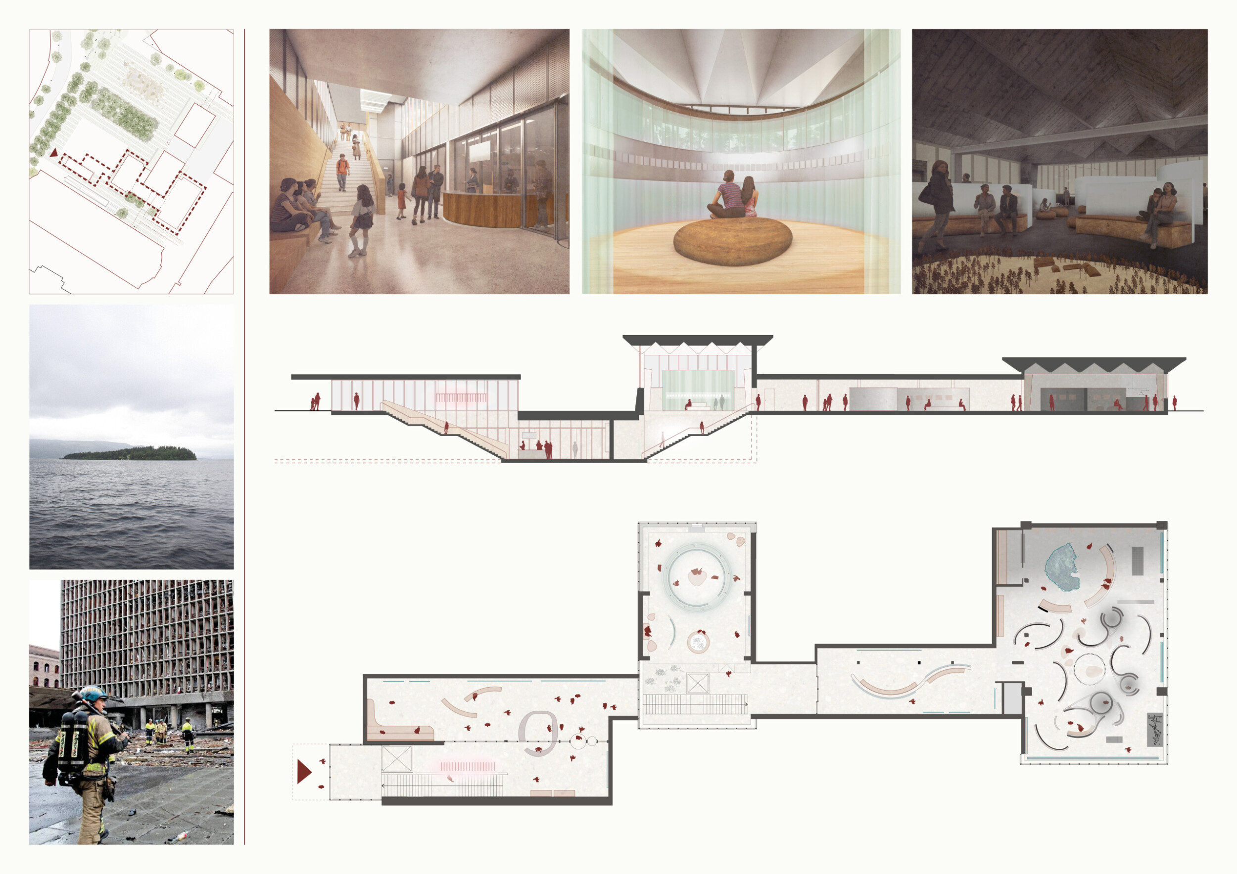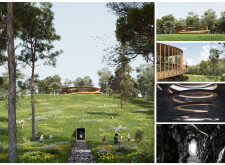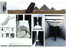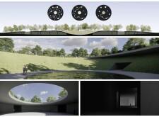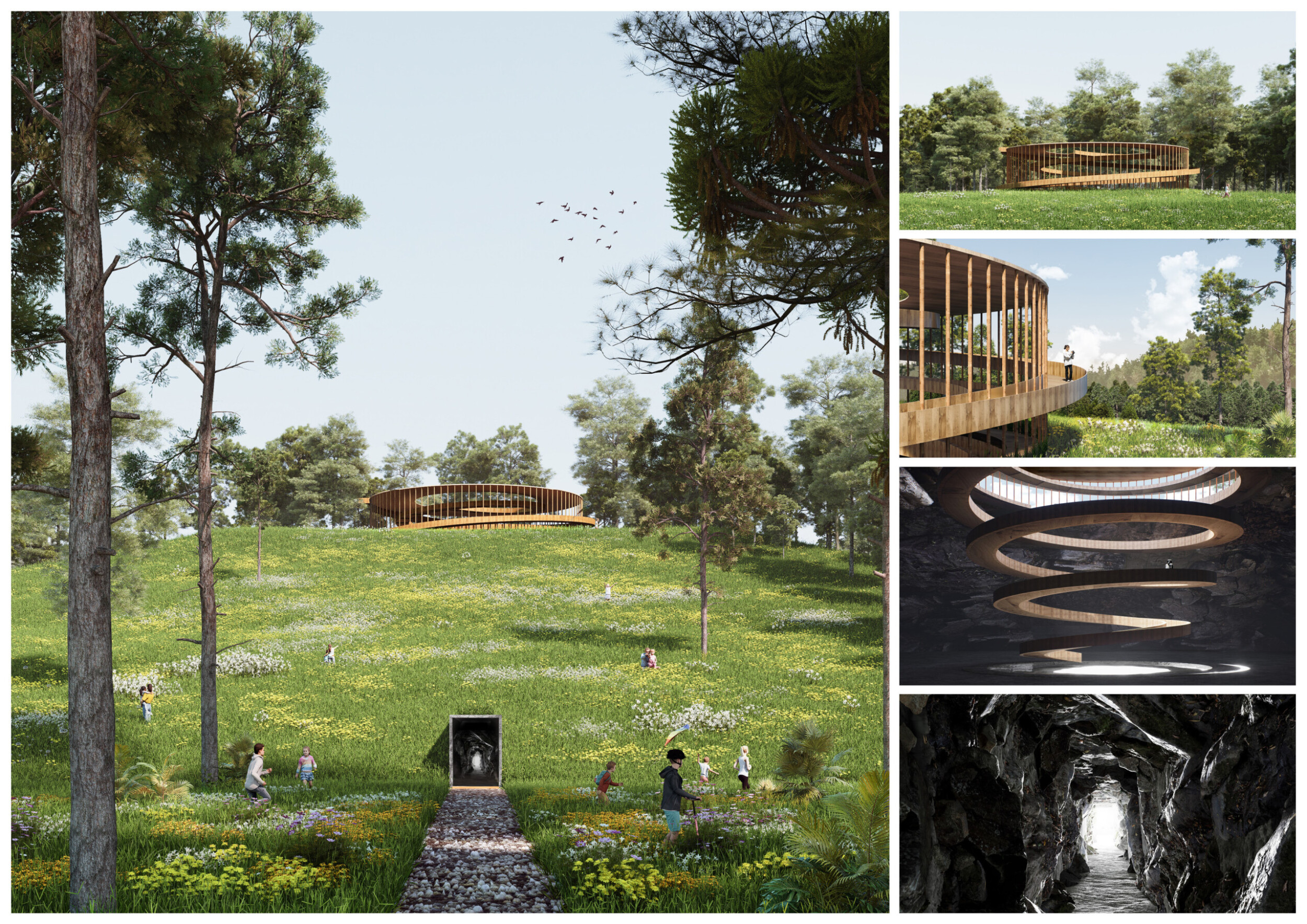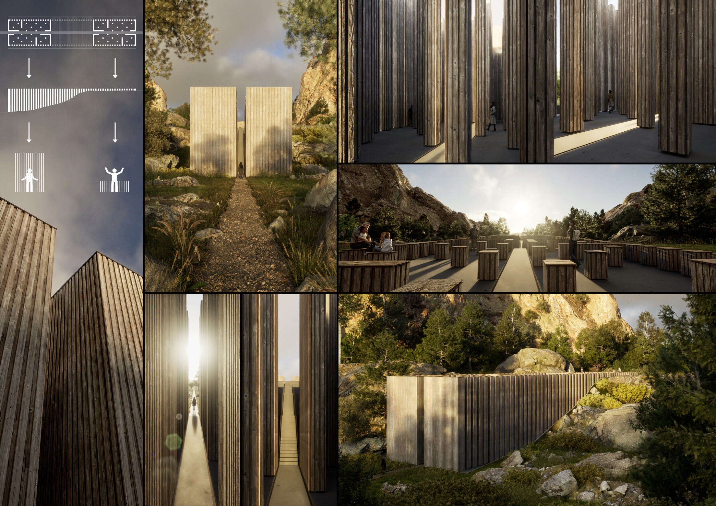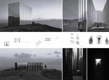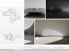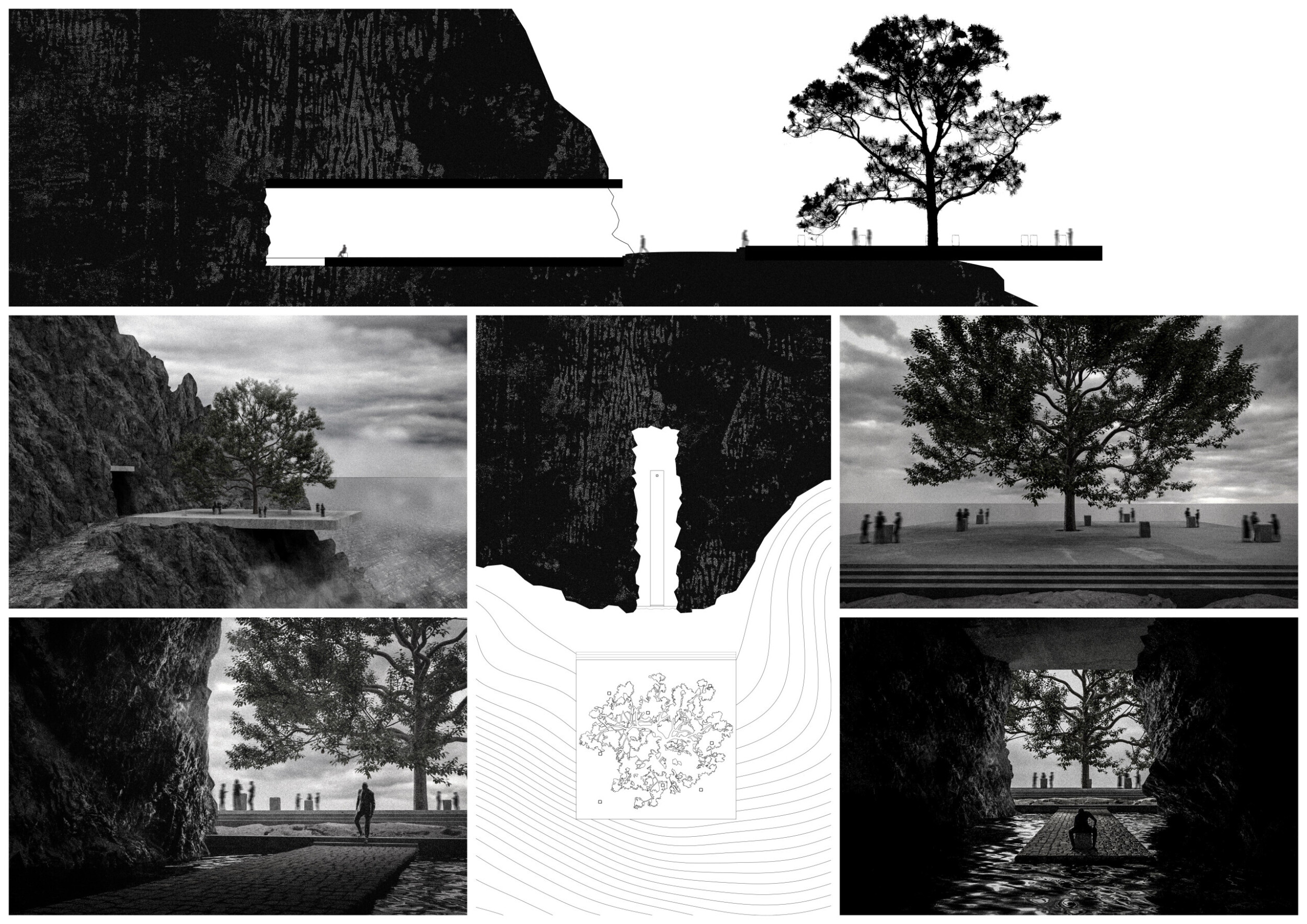 This is an original and creative design. The cave-like space and cantilevered platform function in both opposing and complementary ways, like two sides of the same coin. Overall, it addresses the competition brief in a complex manner, avoiding a simplistic division of emotions. The renders are clear and highlight important details, such as the different ground surfaces, the threshold/transition between inside and outside, and the pathway leading to the museum. While the black-and-white aesthetic may have been chosen to keep the site-specificity open (as specific colors could anchor it to a Mediterranean or Pacific Northwest context, for example), I believe the design could have benefited from color images.